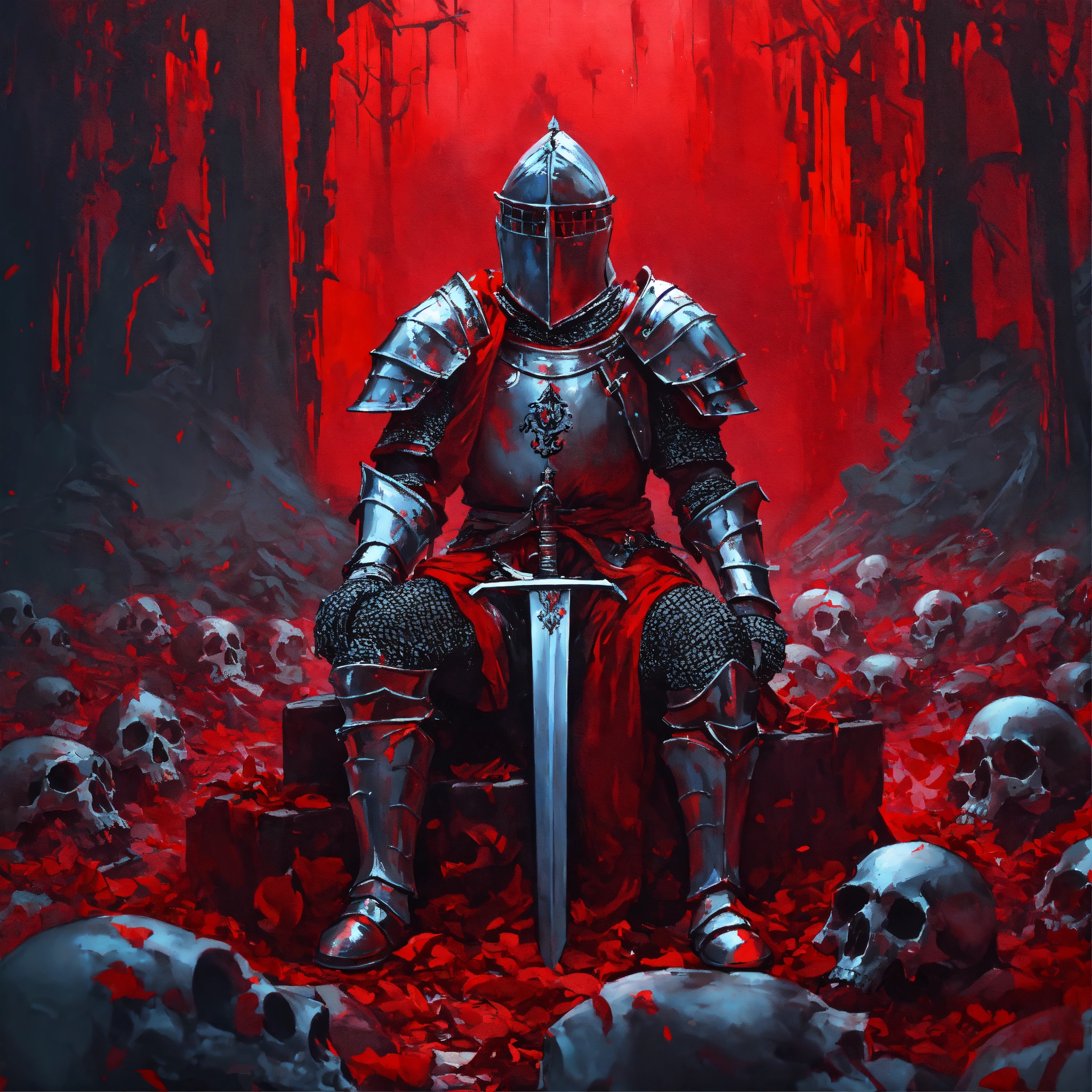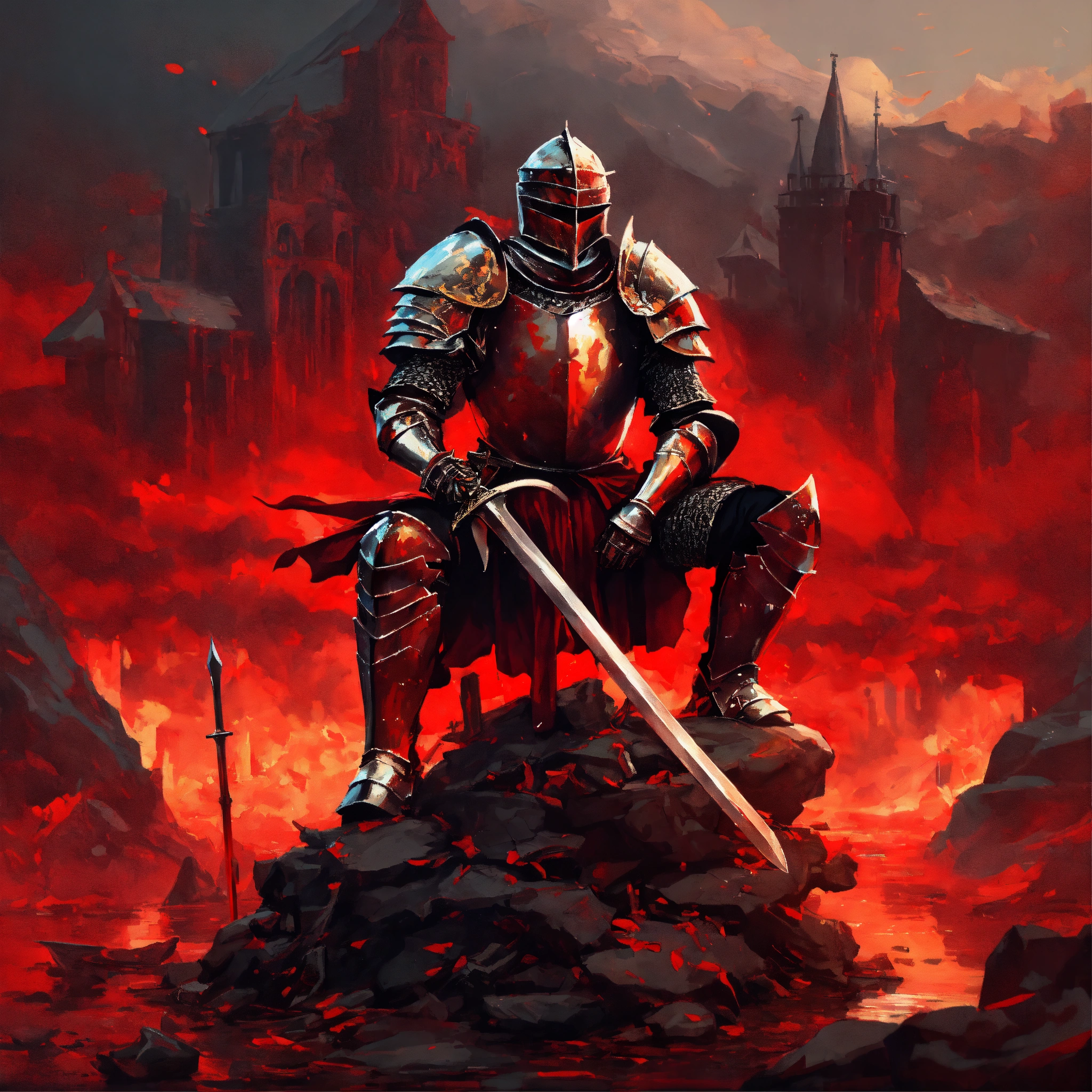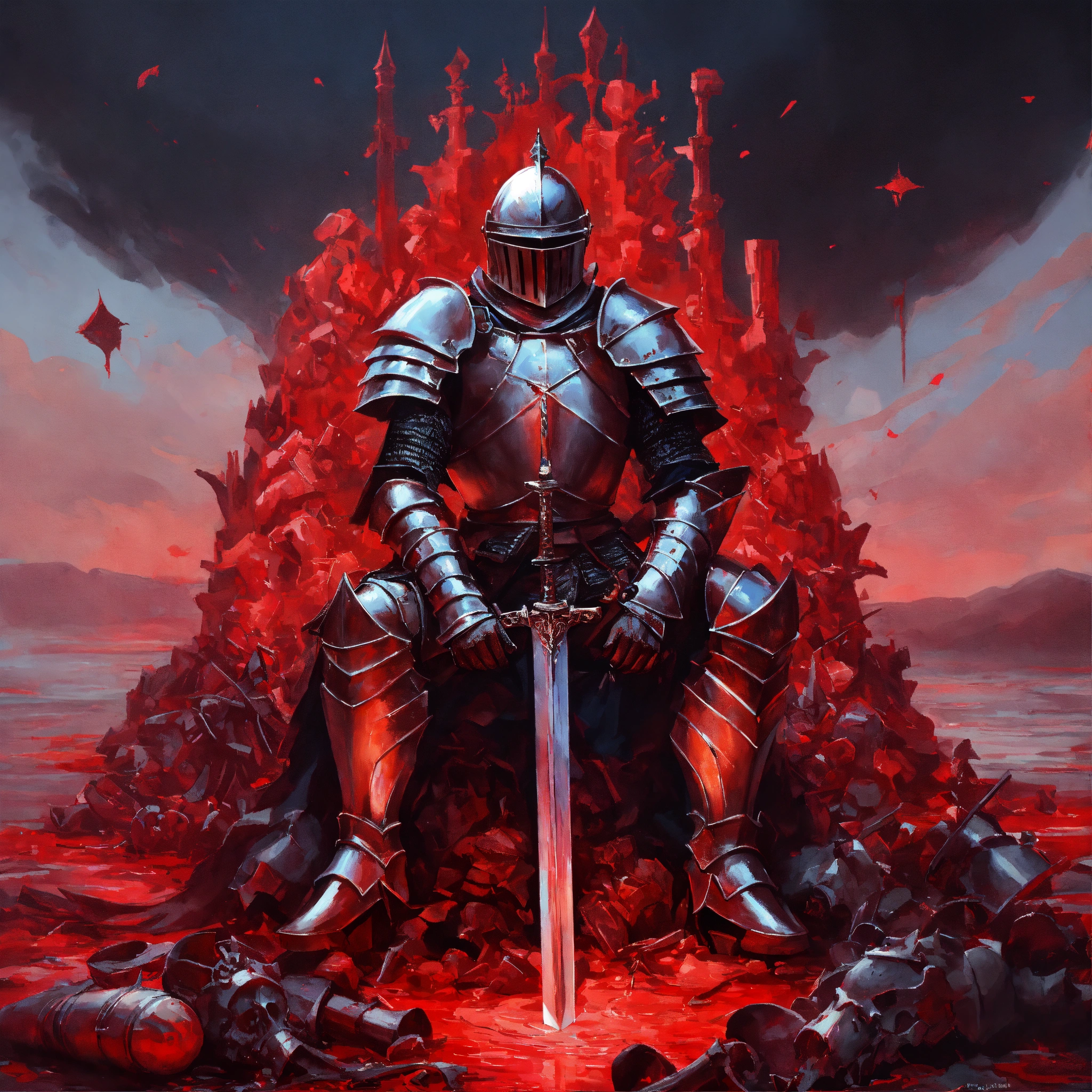 Genre abstract art, a knight dressed in plate armor sits on a pile of bones and clutches his sword in his hands, everything around him is covered with scarlet water