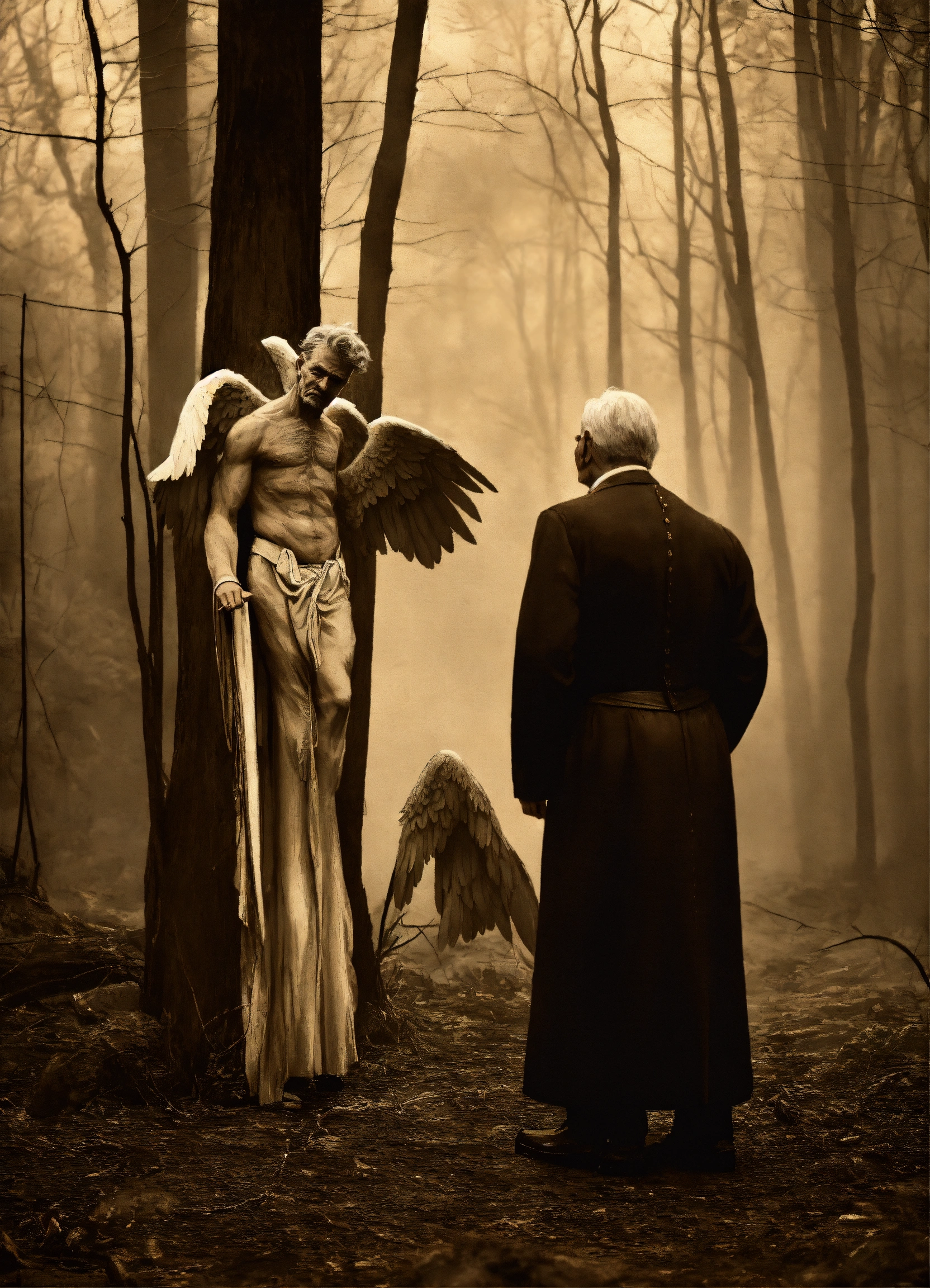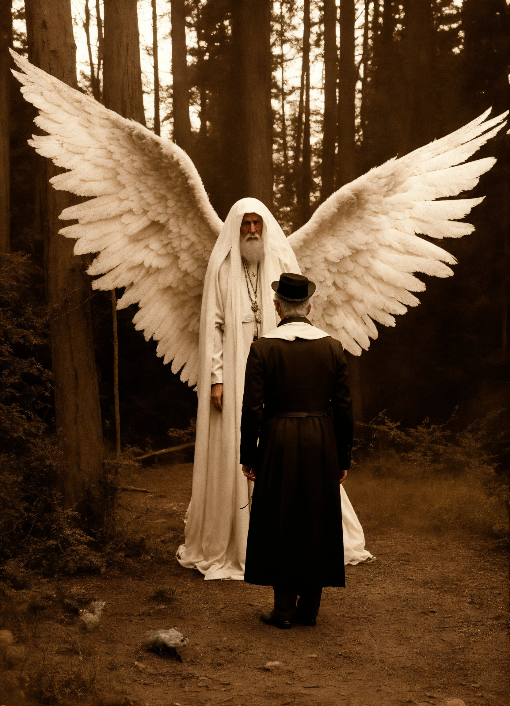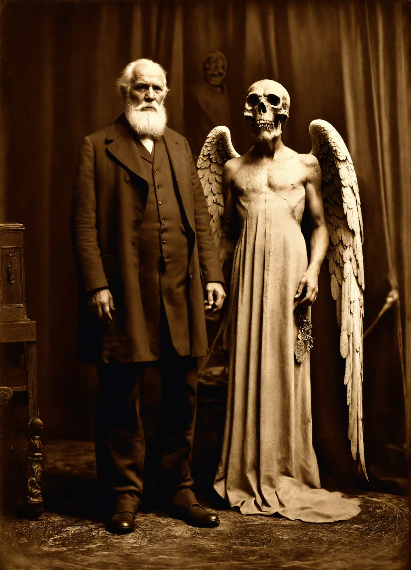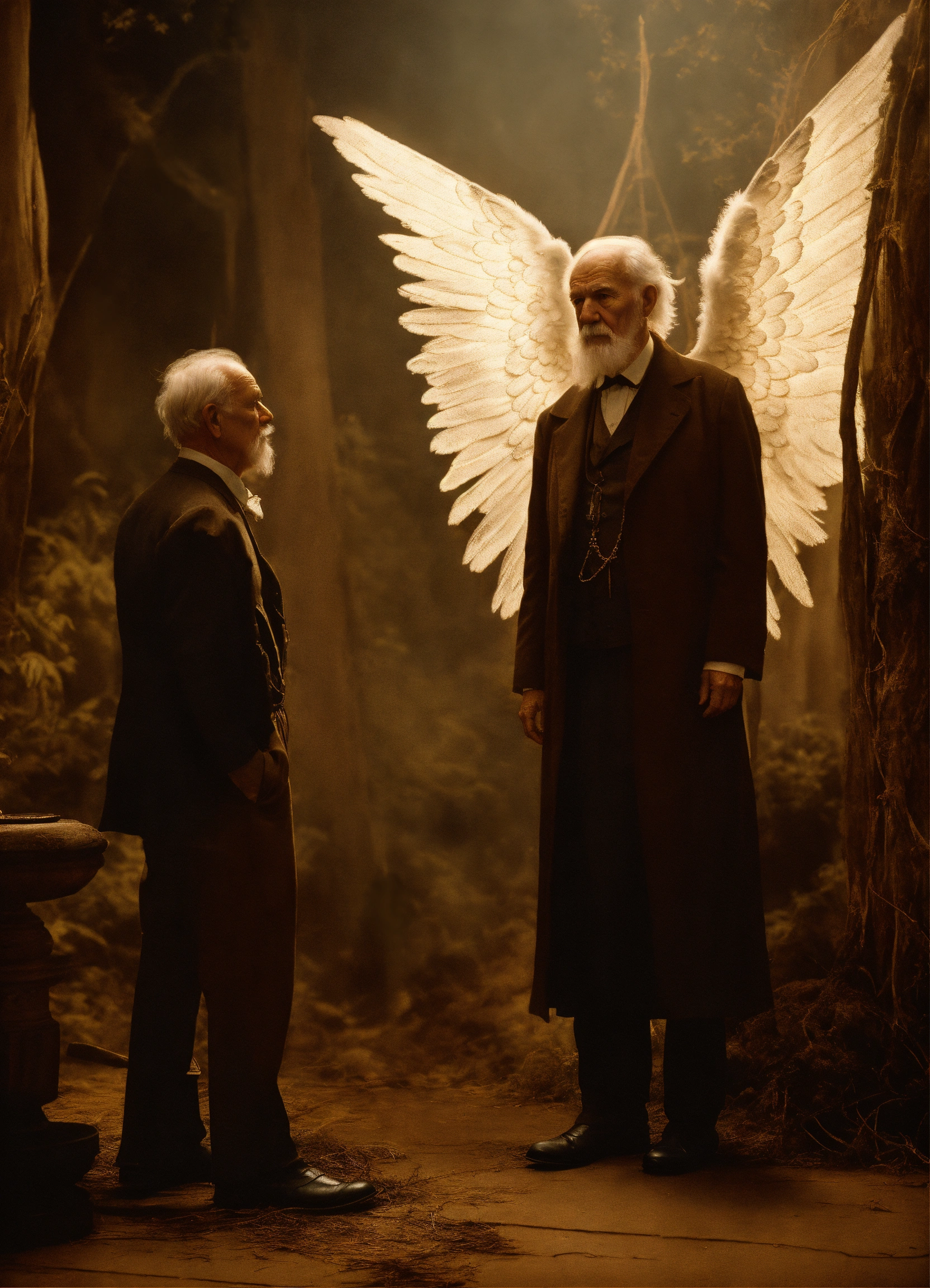 Old man standing next to a angel giant, in the style of contemporary vintage photography, necronomicon illustrations, tabletop photography, 1890, hyperrealistic animal portraits, ghostly presence, whirring contrivances