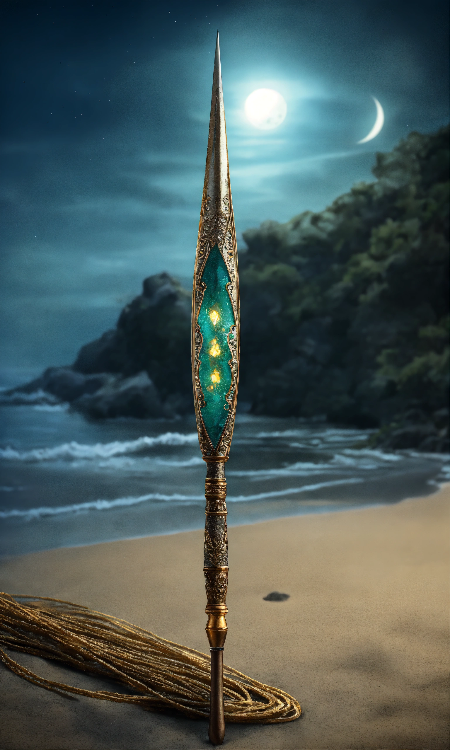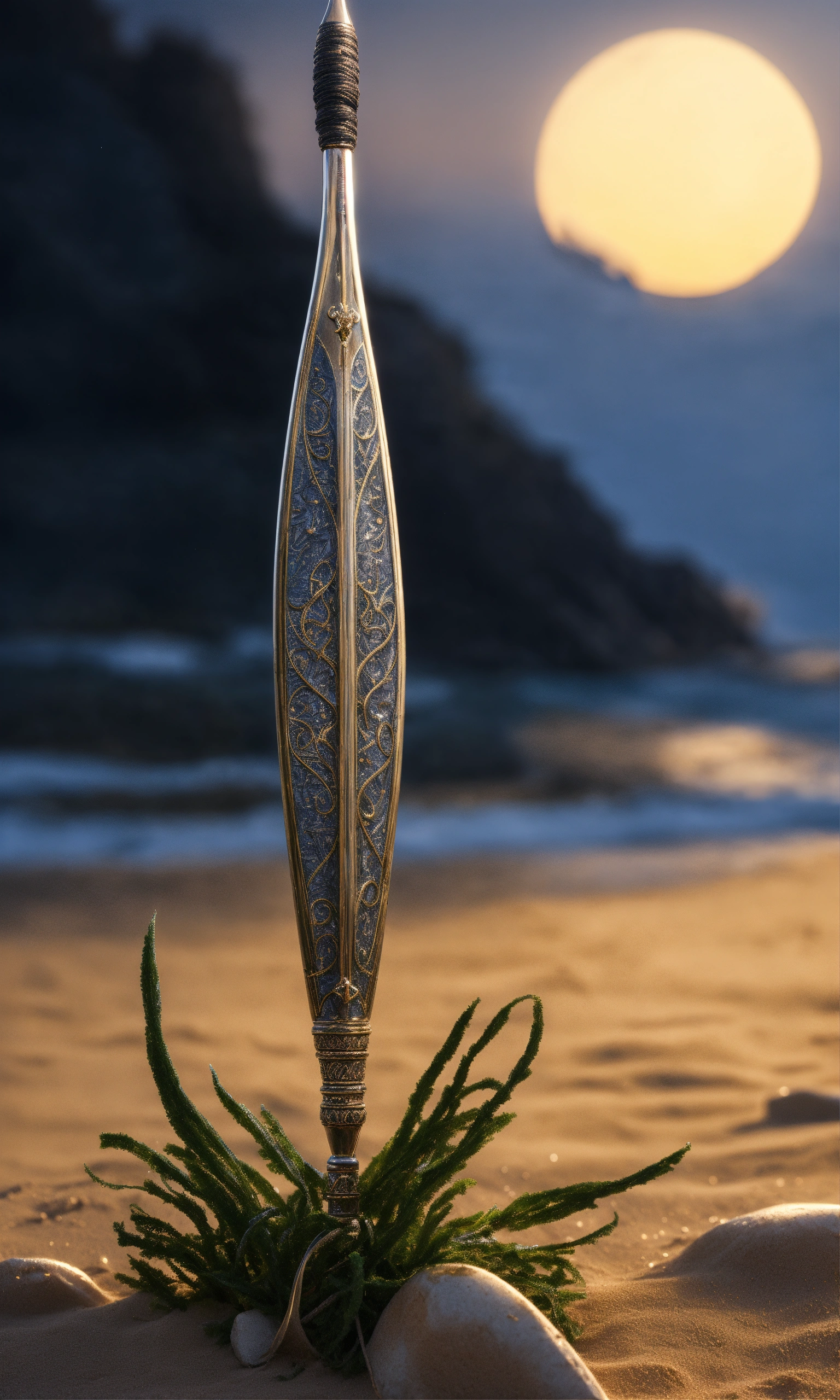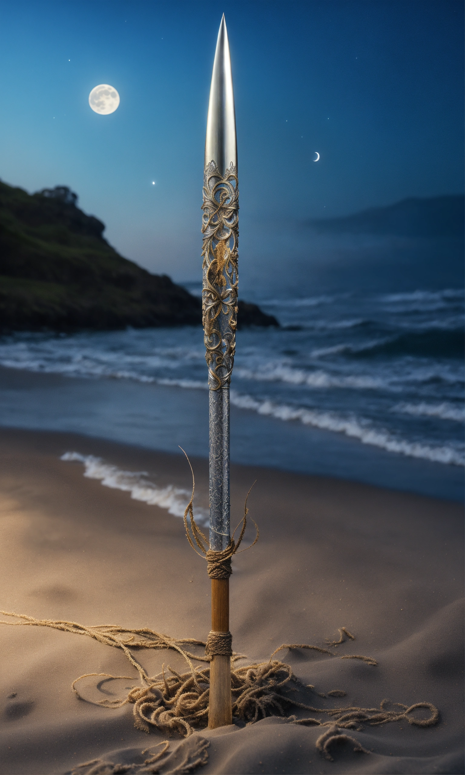 8k, picture of a narrow and delicate toothed fishing spear with barbs made of lunar-silver, highly ornamented, at the bottom there is an eyelet to which a twenty meter long tow line made of braided seaweed is attached, very detailed, ultra realistic, stuck with the bottom end deep in the sand on the beach in a lonely bay, moonlight, fantasy, medieval.