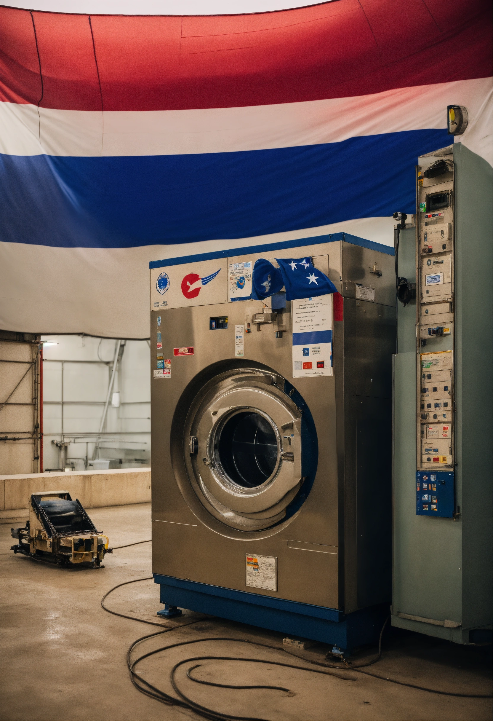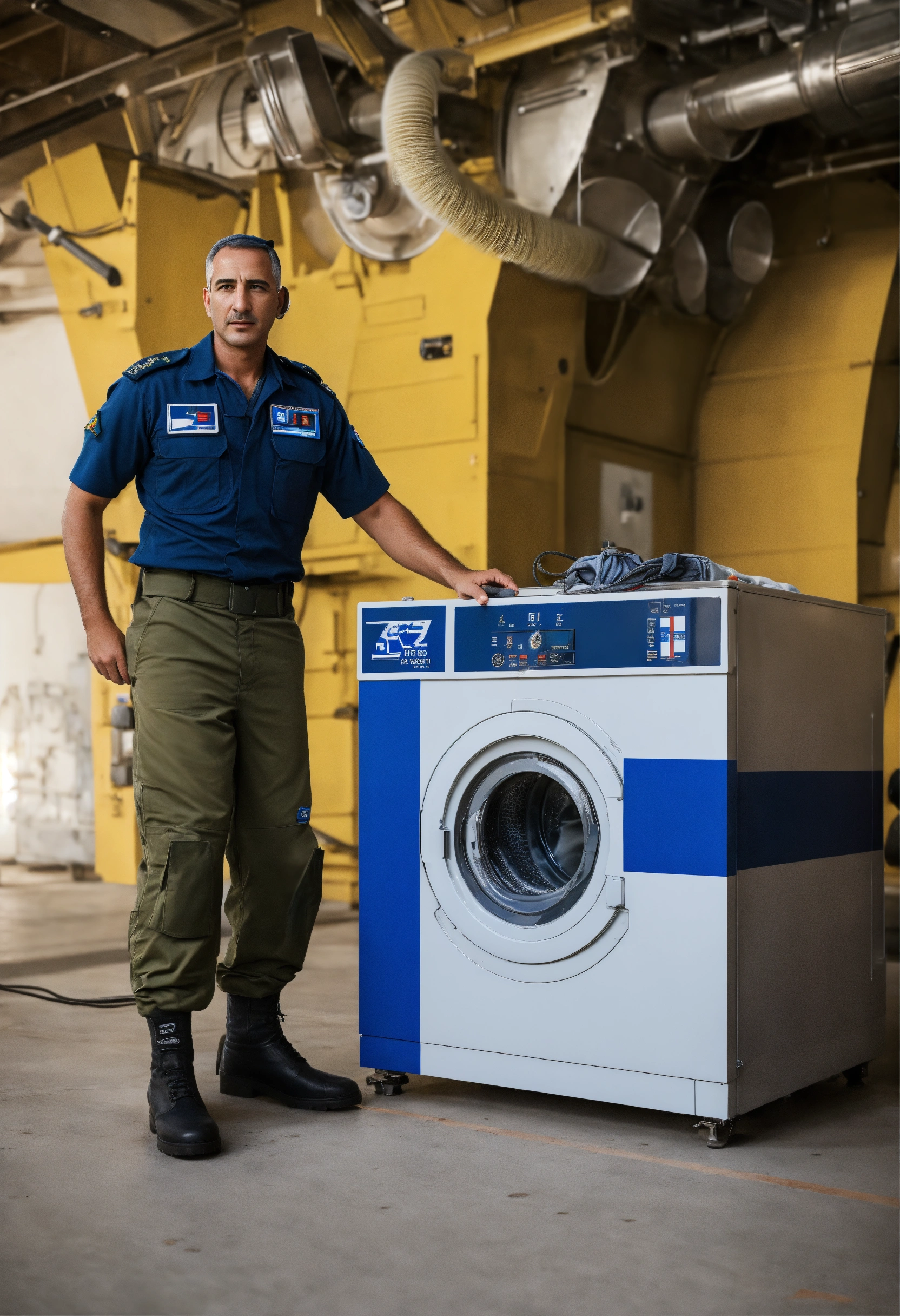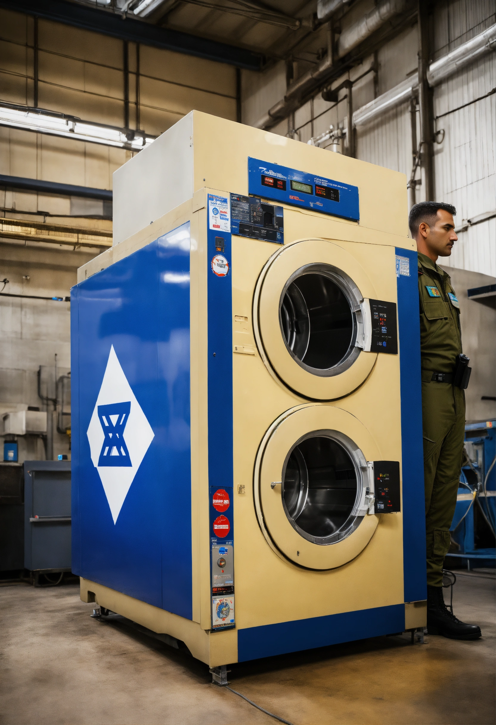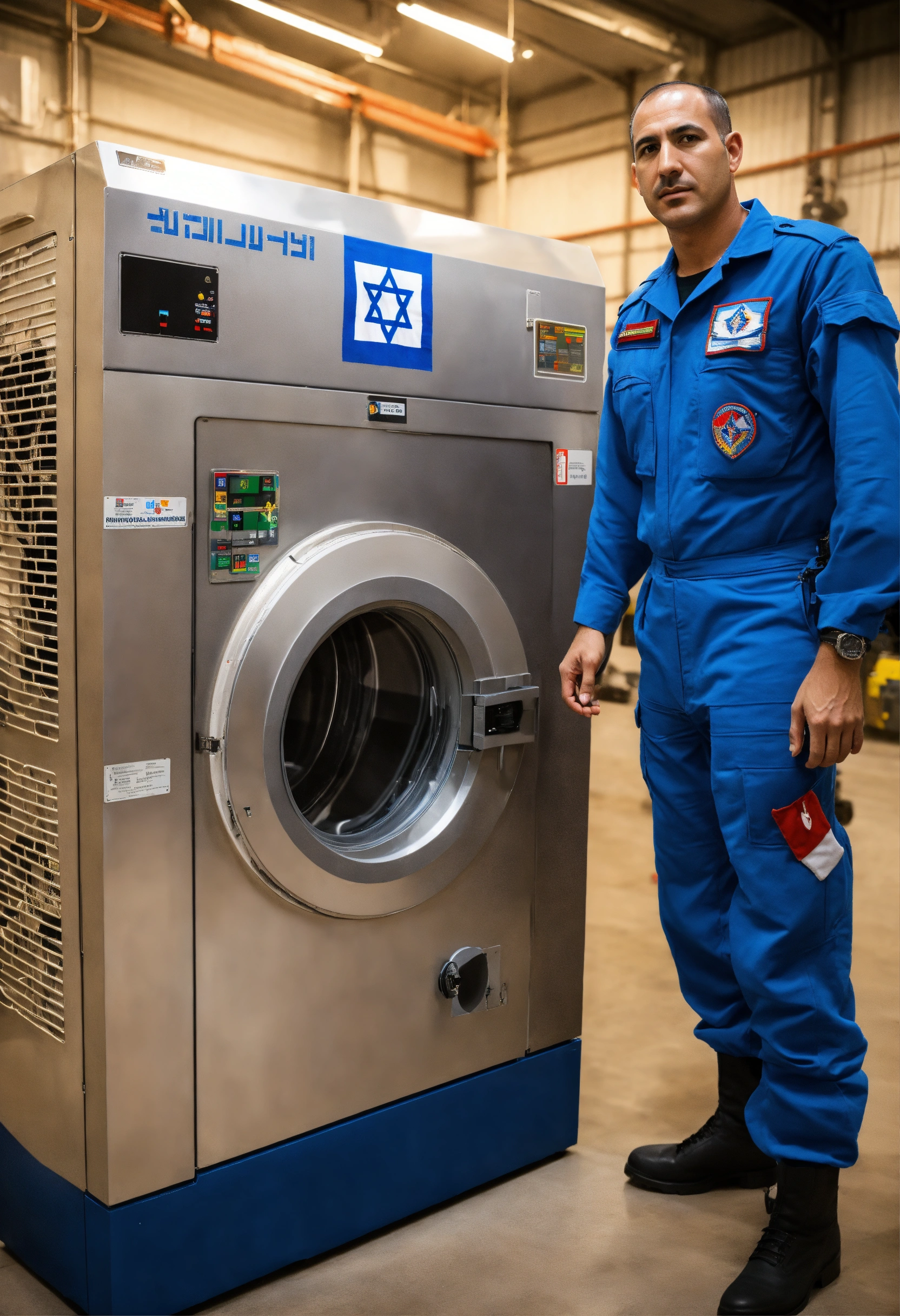 An industrial washing machine in the colors of the israeli flag, with an israeli air force pilot standing next to the machine