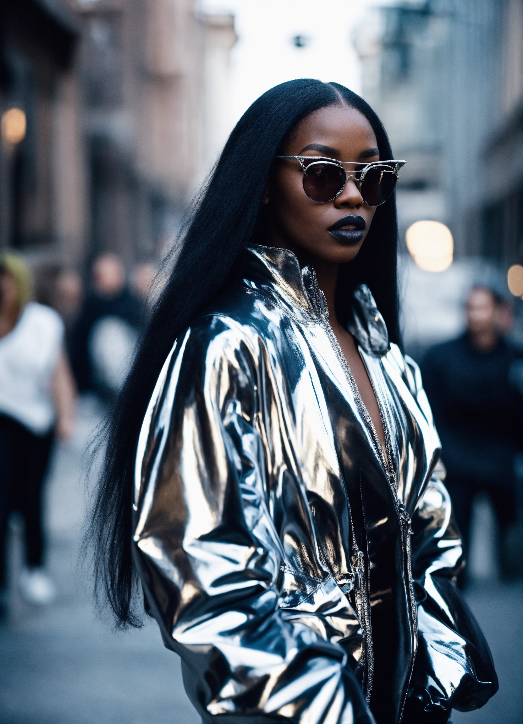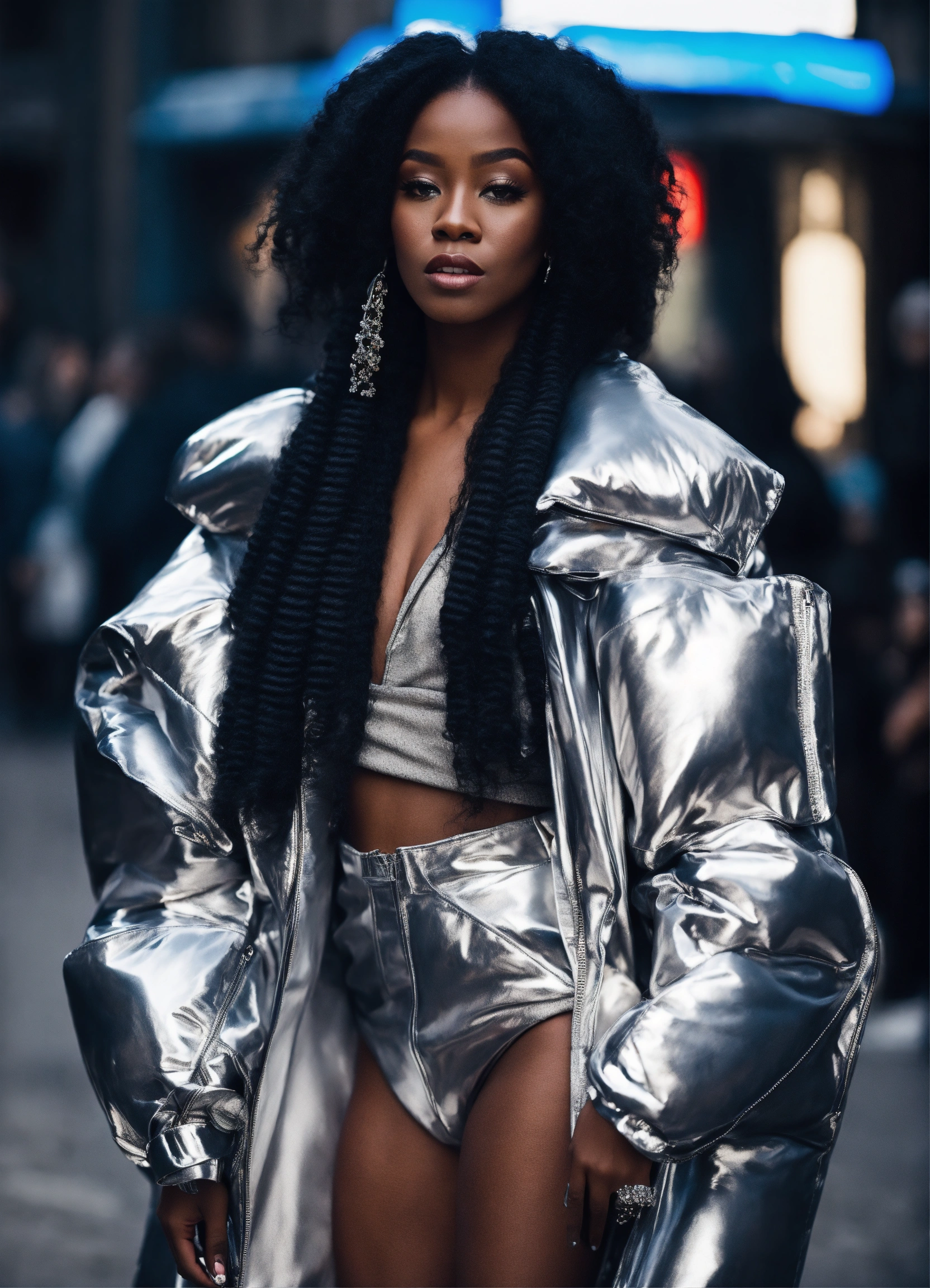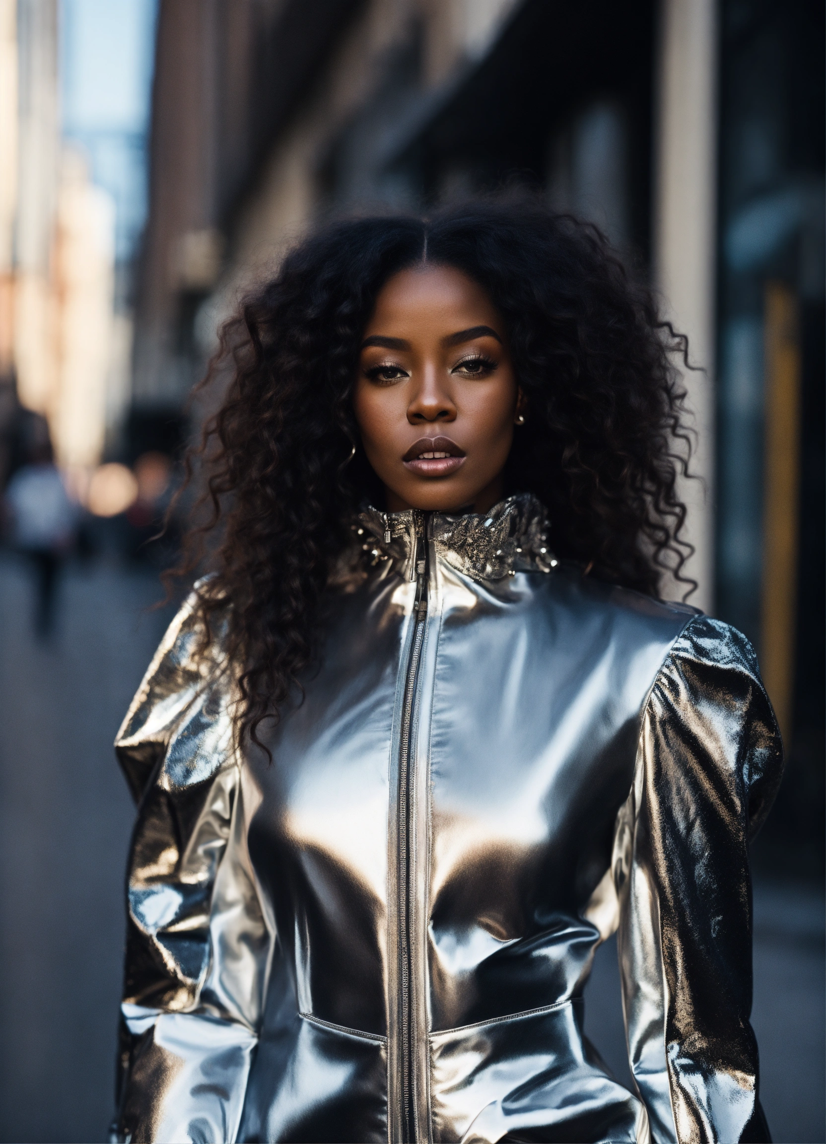 Black woman, in silver high fashion street wear with puffer sleeves, avant-garde, long flowing hair, edgy sleek styling, photography