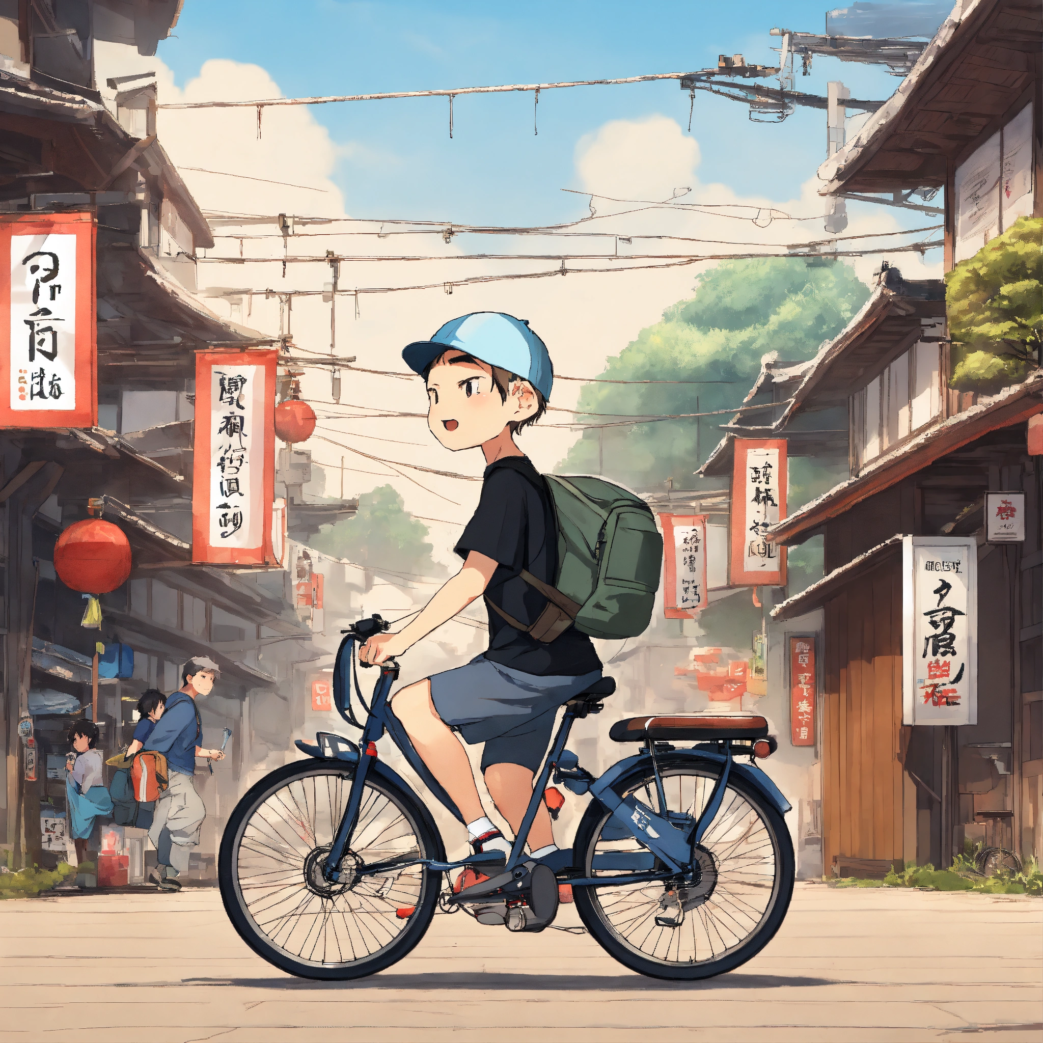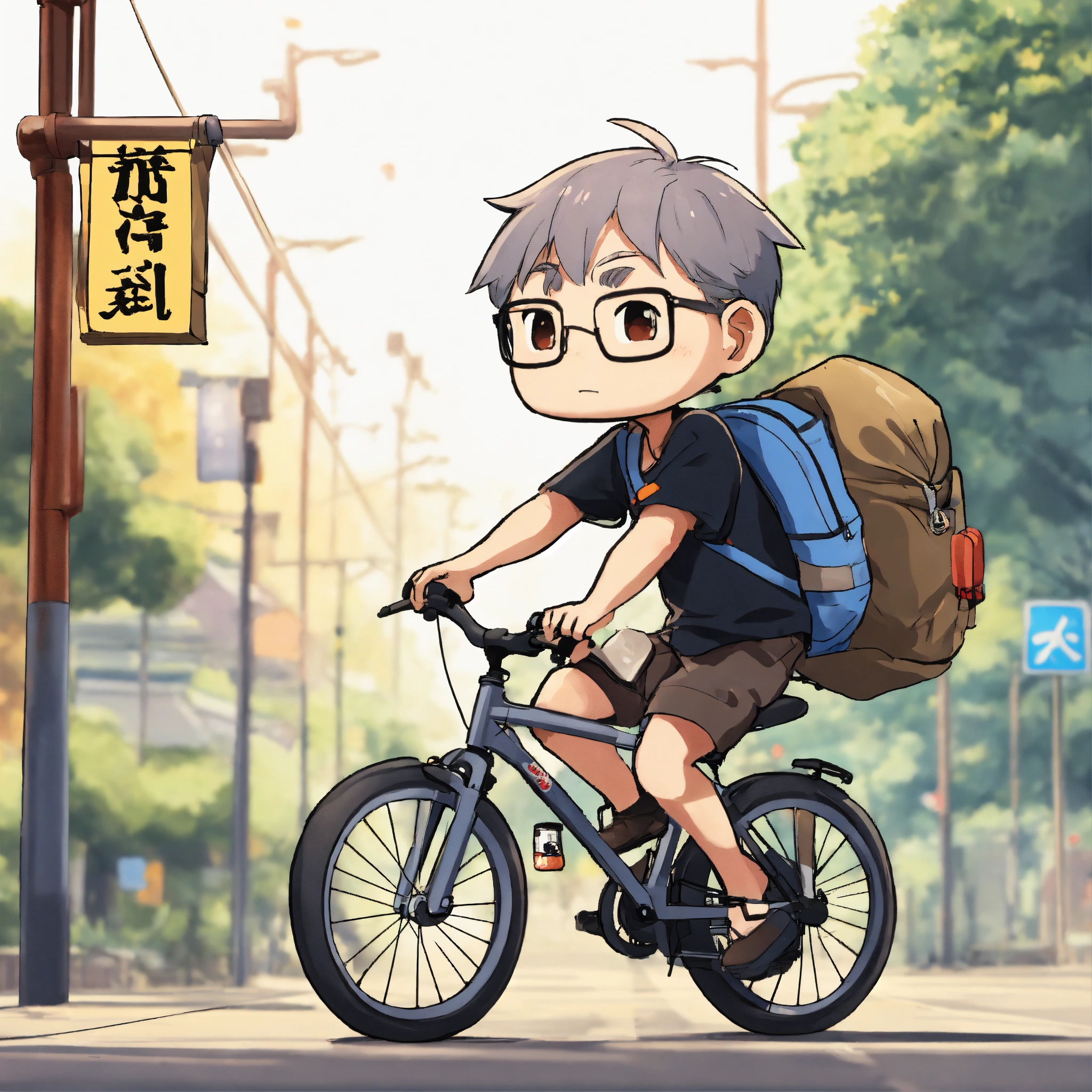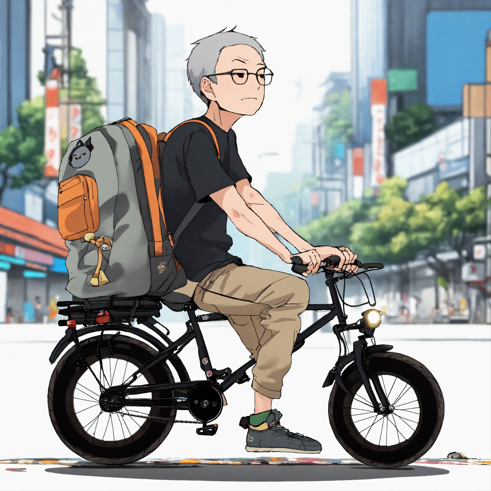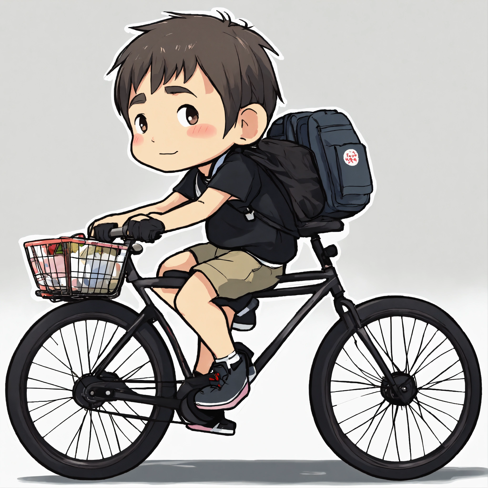 Poor japanese man, ride on the bicycle, black t-shirt, chibi character, anime style, 50 years old, short hair, no cap, white background, no backpack, a lot of stuff on the back of the bicycle