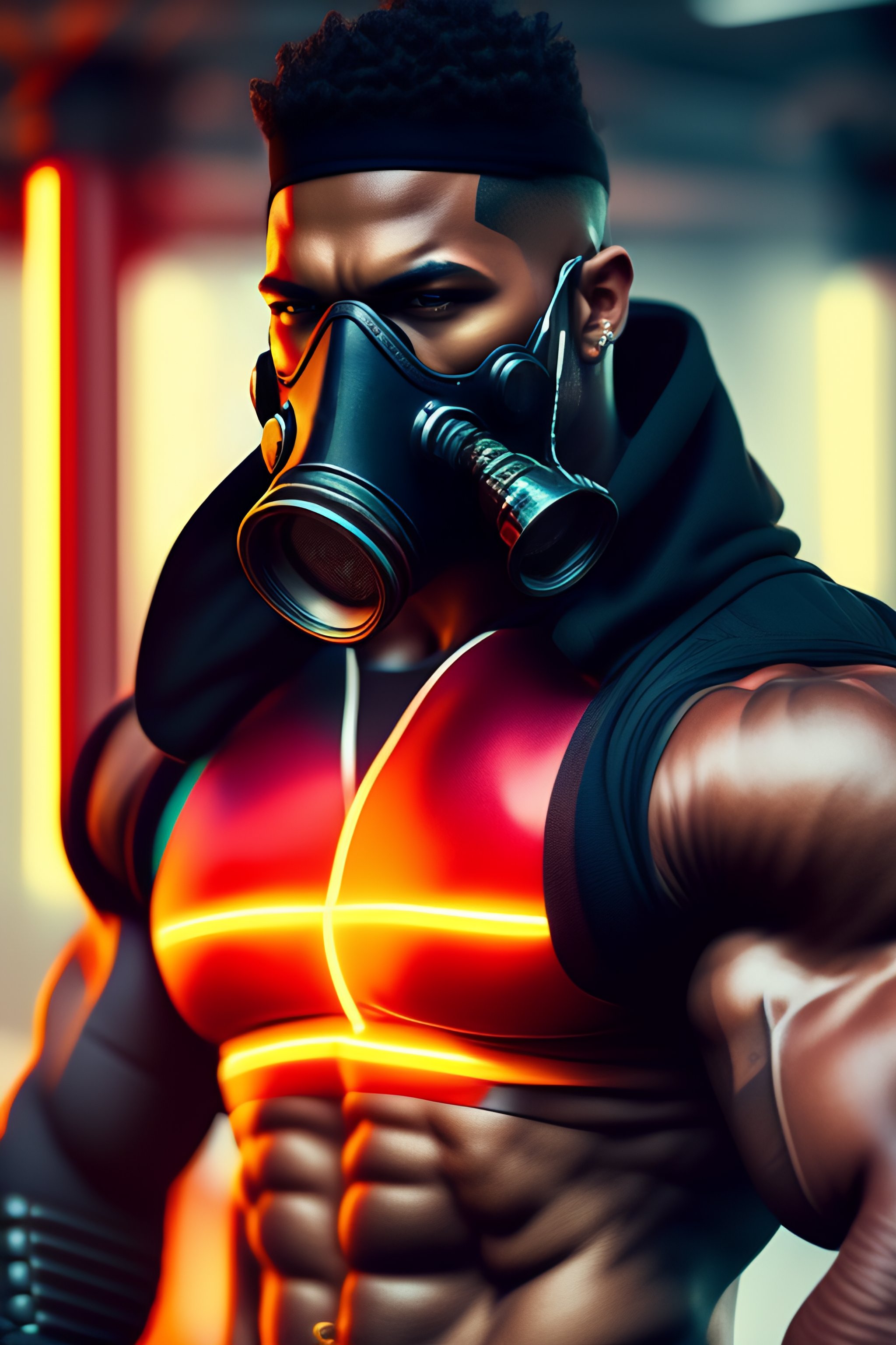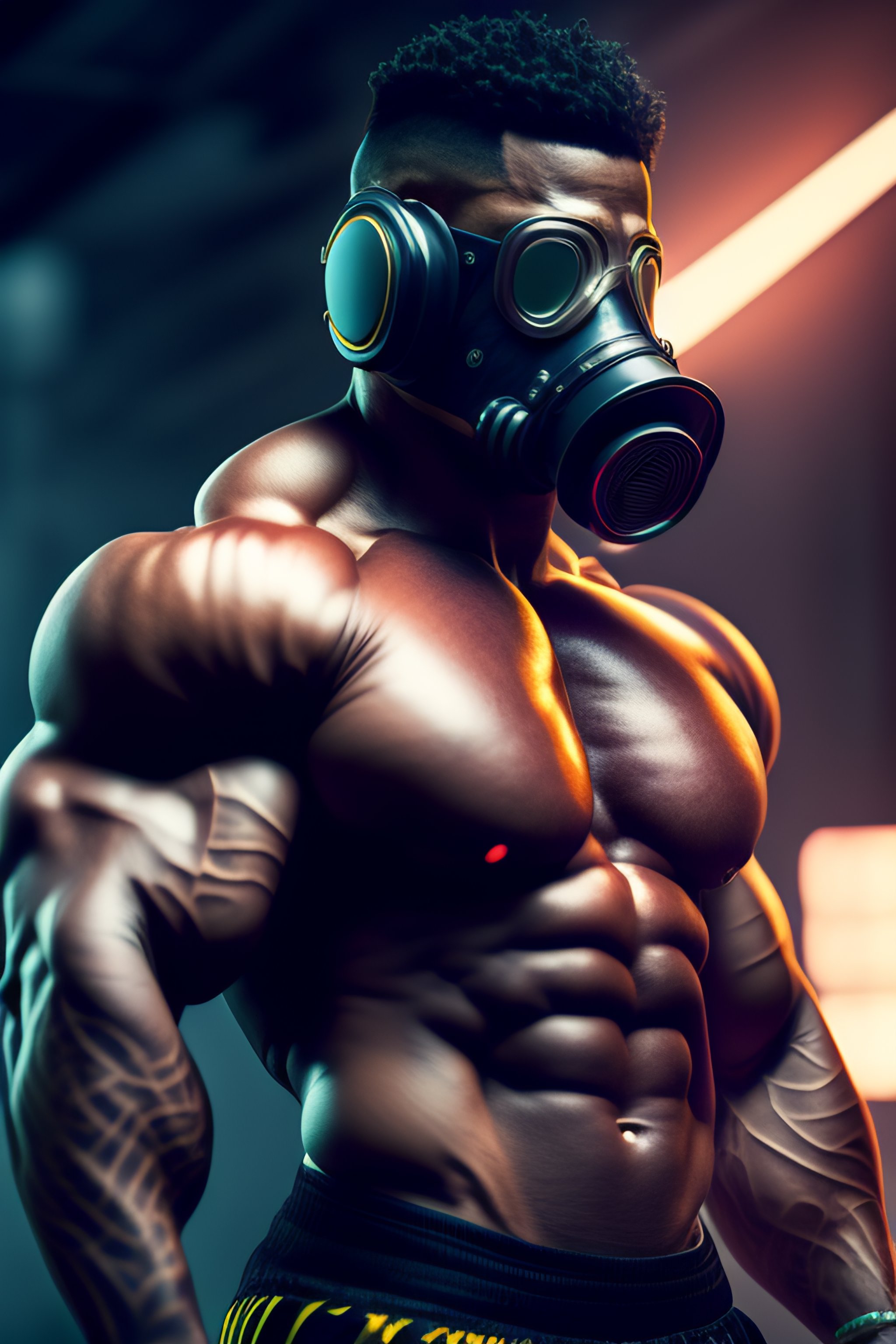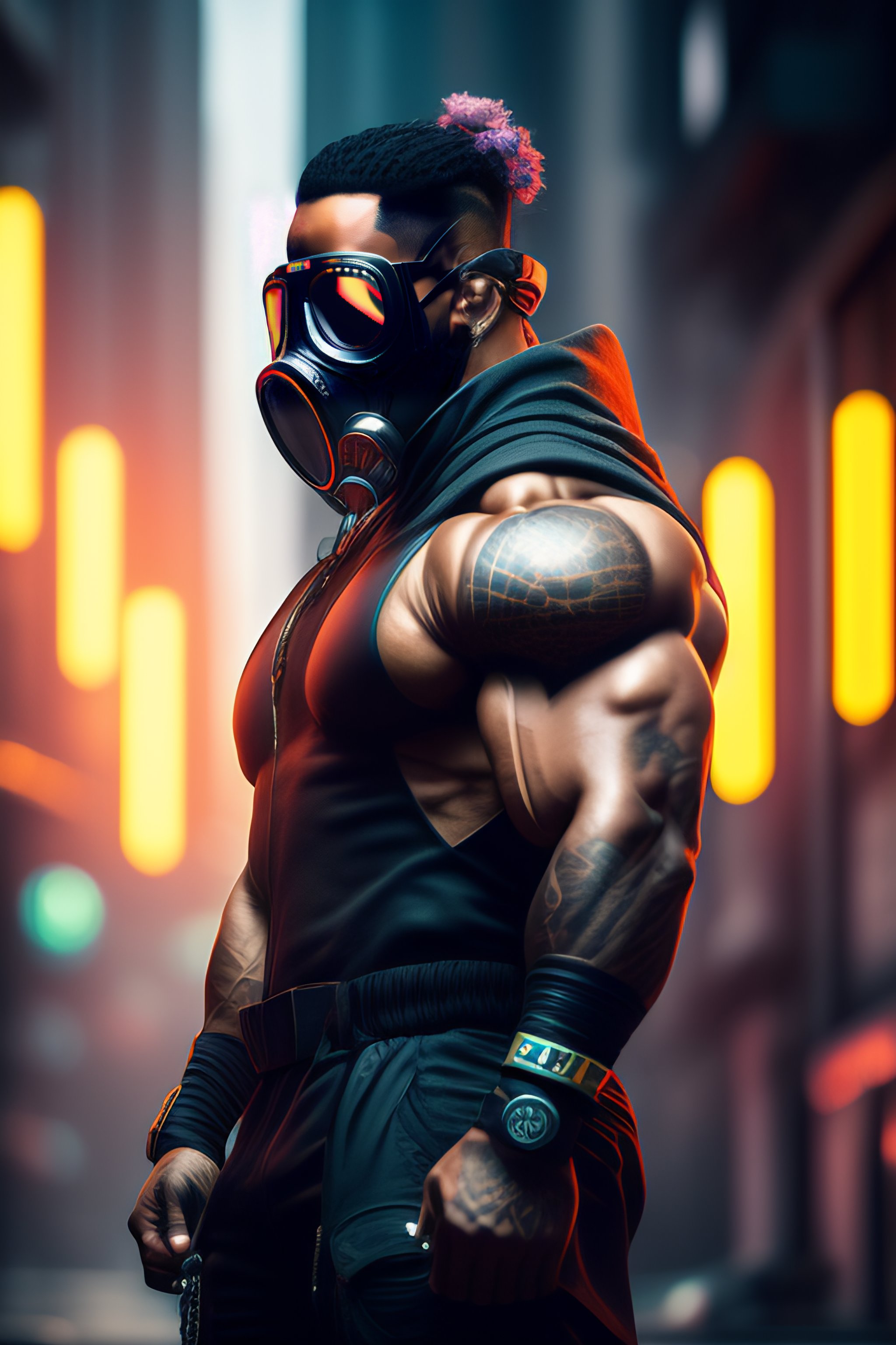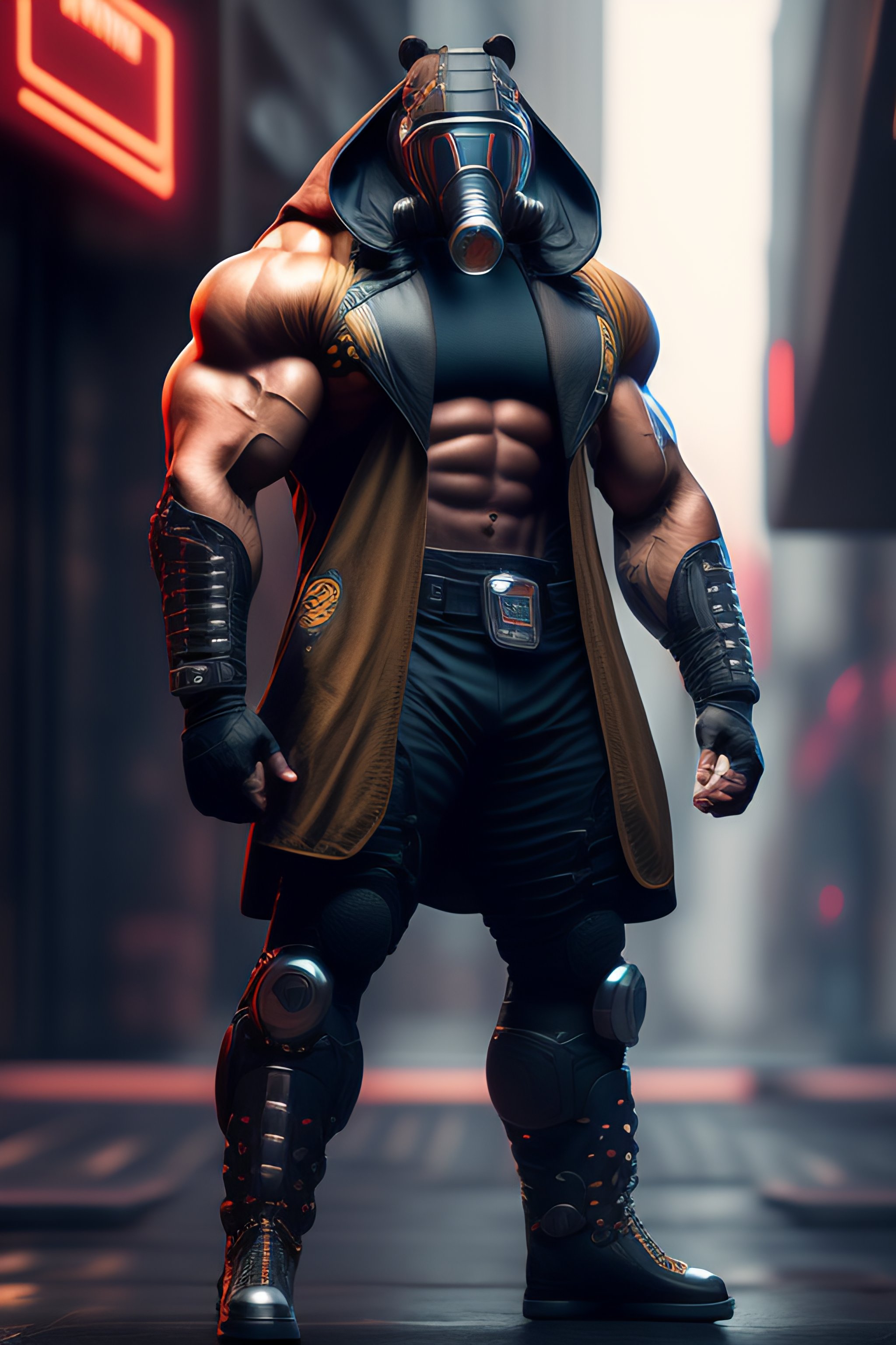 Cyberpunk, muscles, elephant-man, gas mask, four hands, parking, four axes, unreal engine, octane render, highly detailed, professional