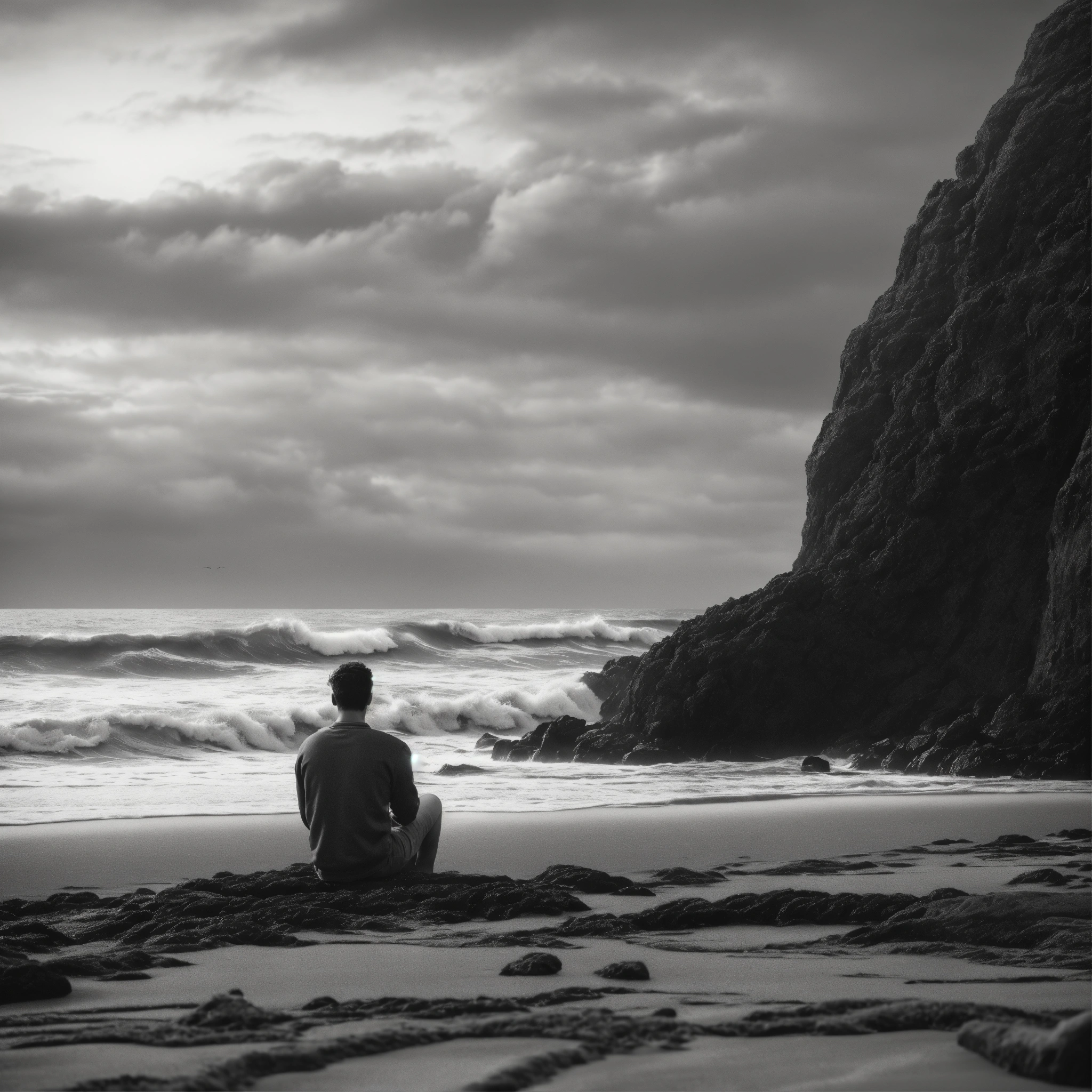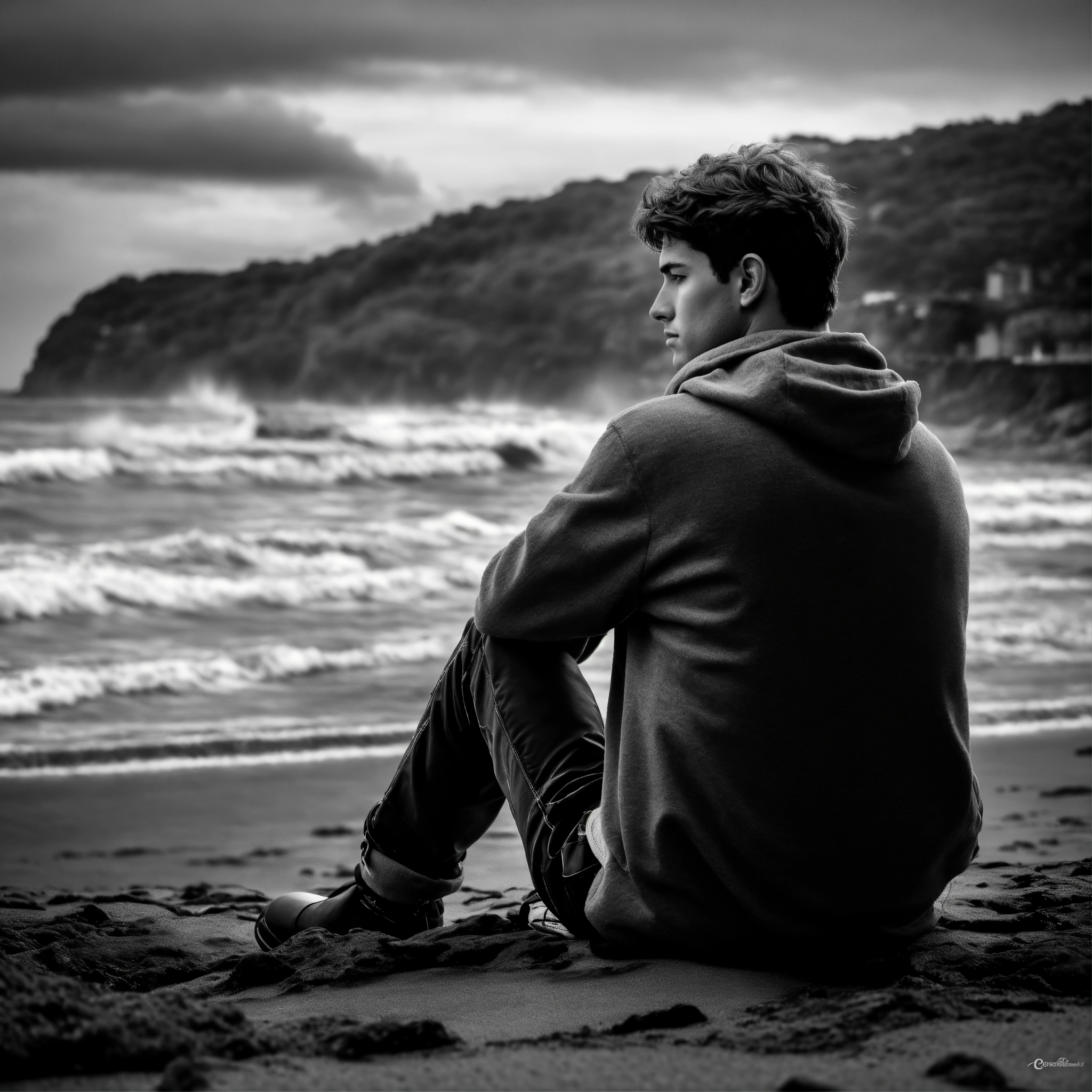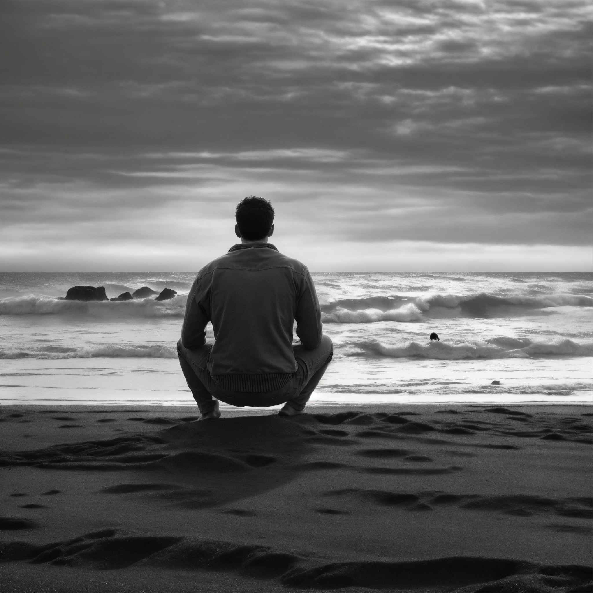 Photorealistic, b&w, grey shades, young man sitting on a beach, watching the waves, in thoughts, thinkful, sad, detailed, 8k, q2