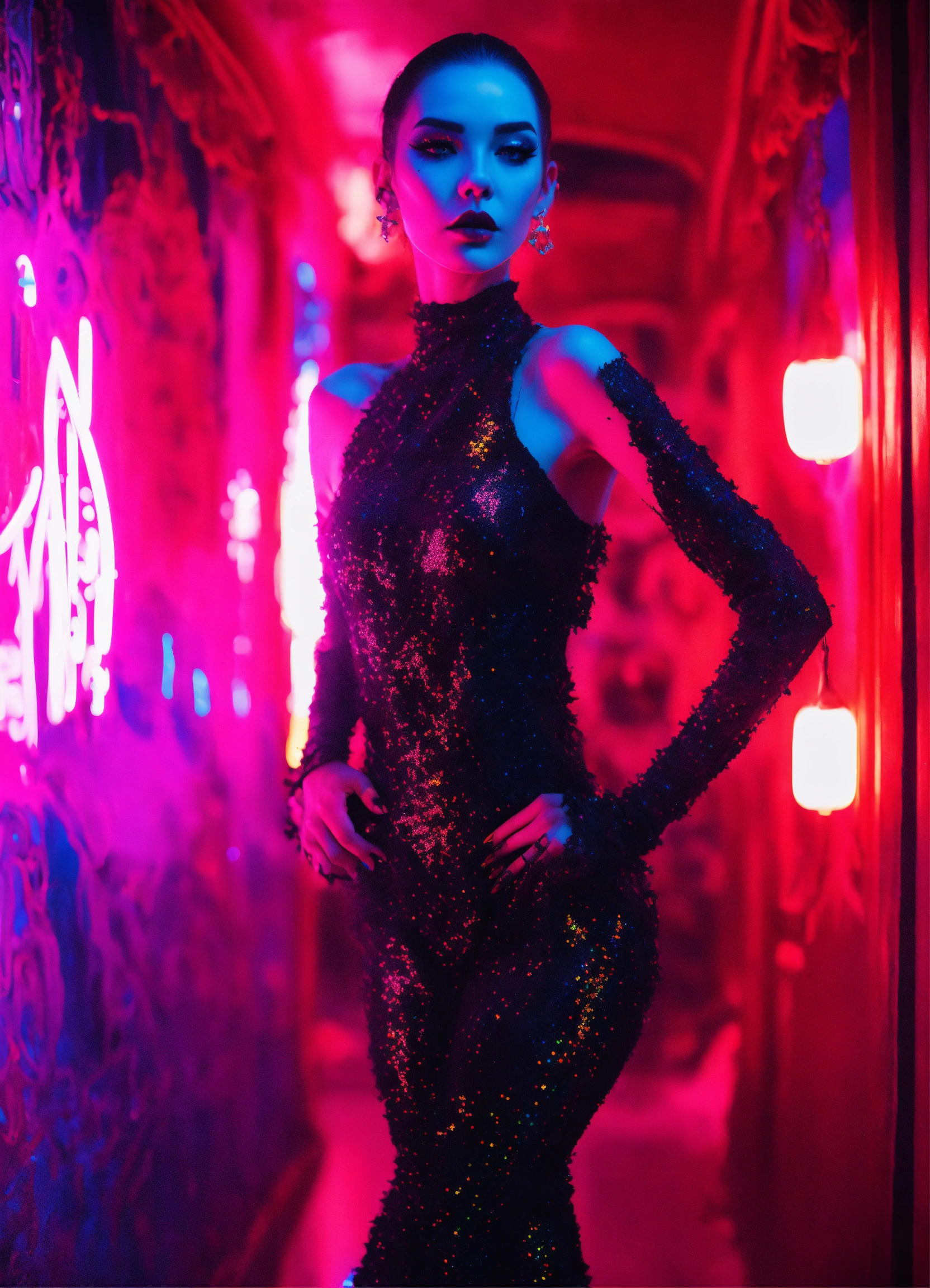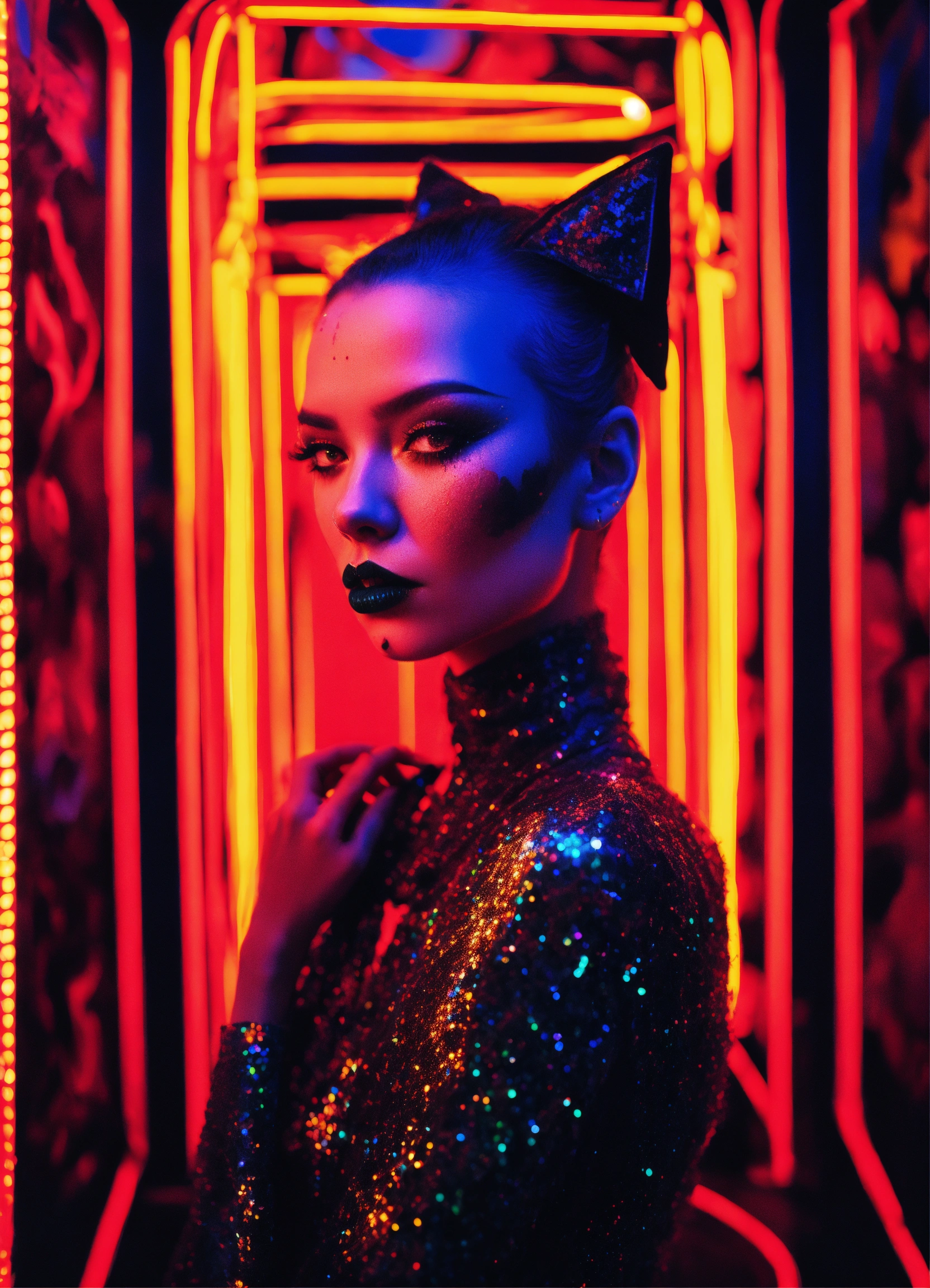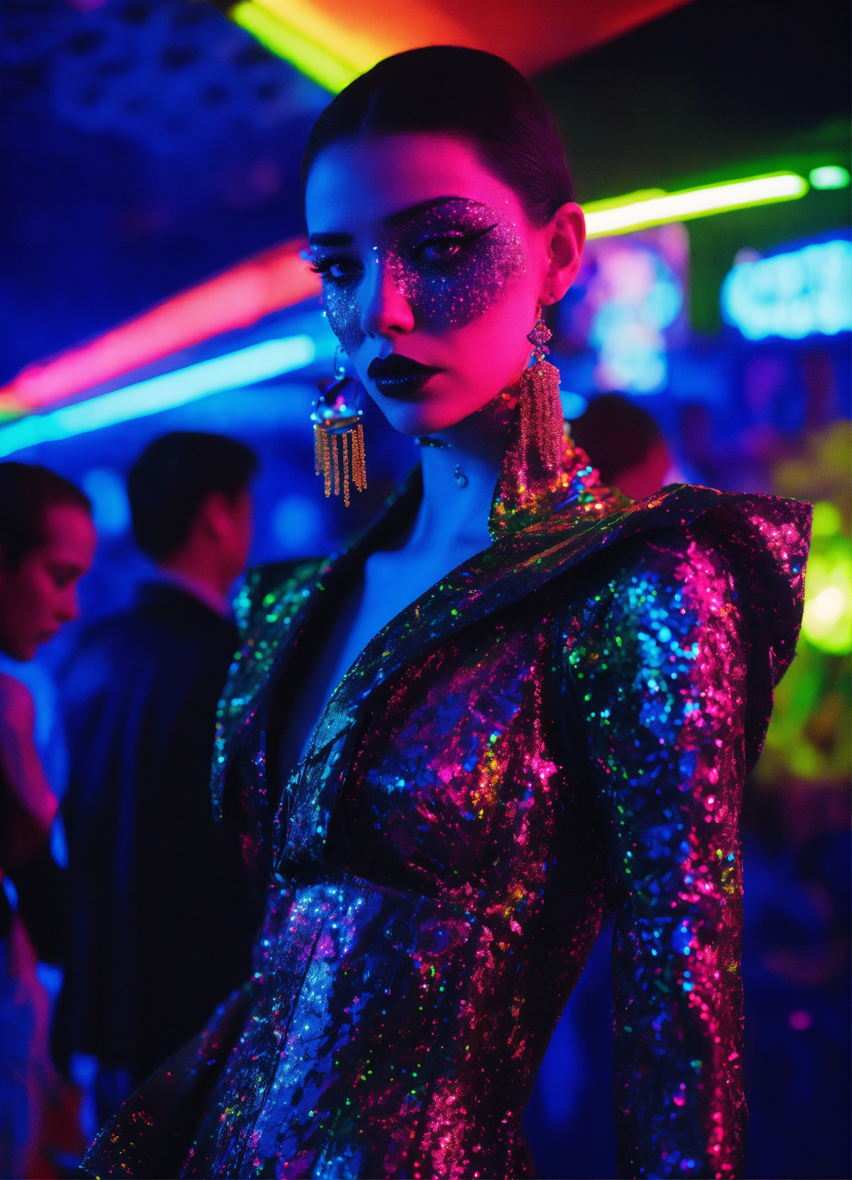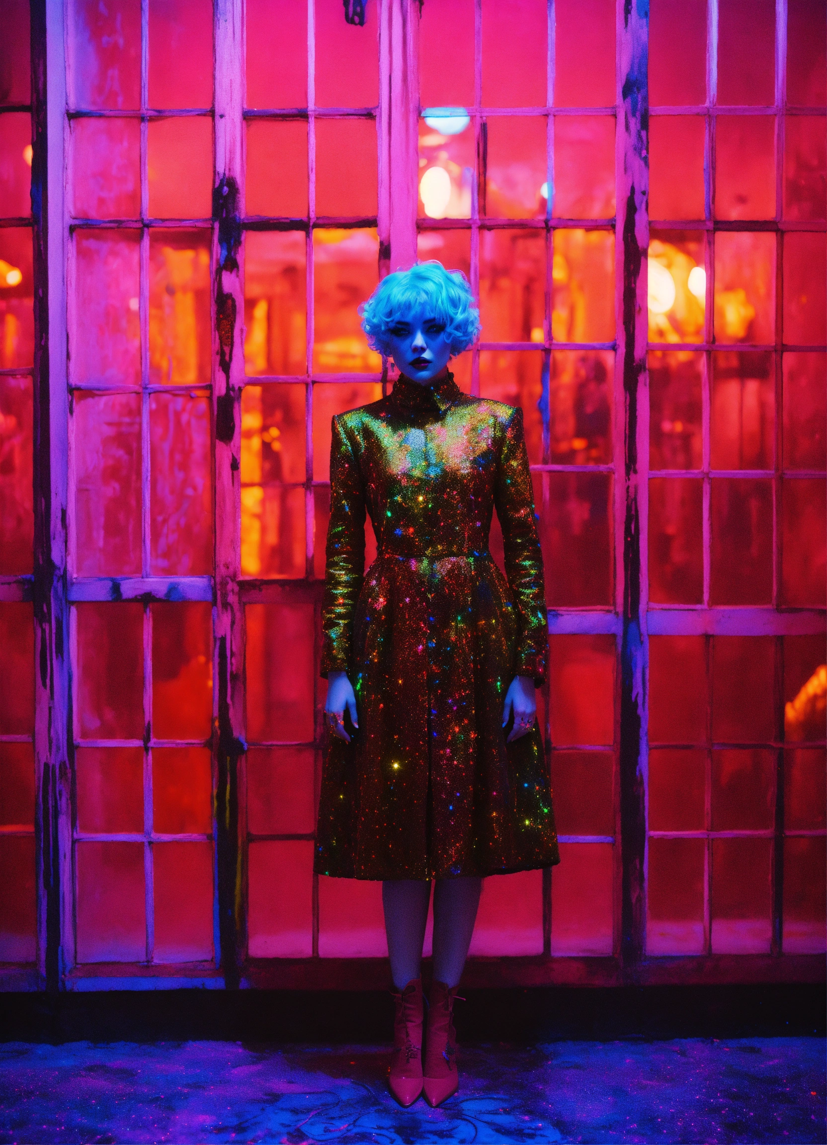 Full body portrait fashion, of pinhead dmt black light glitter neon grime rio de janeiro, 35mm film, art by sergio lopez, natalie shau, james jean and salvador dali