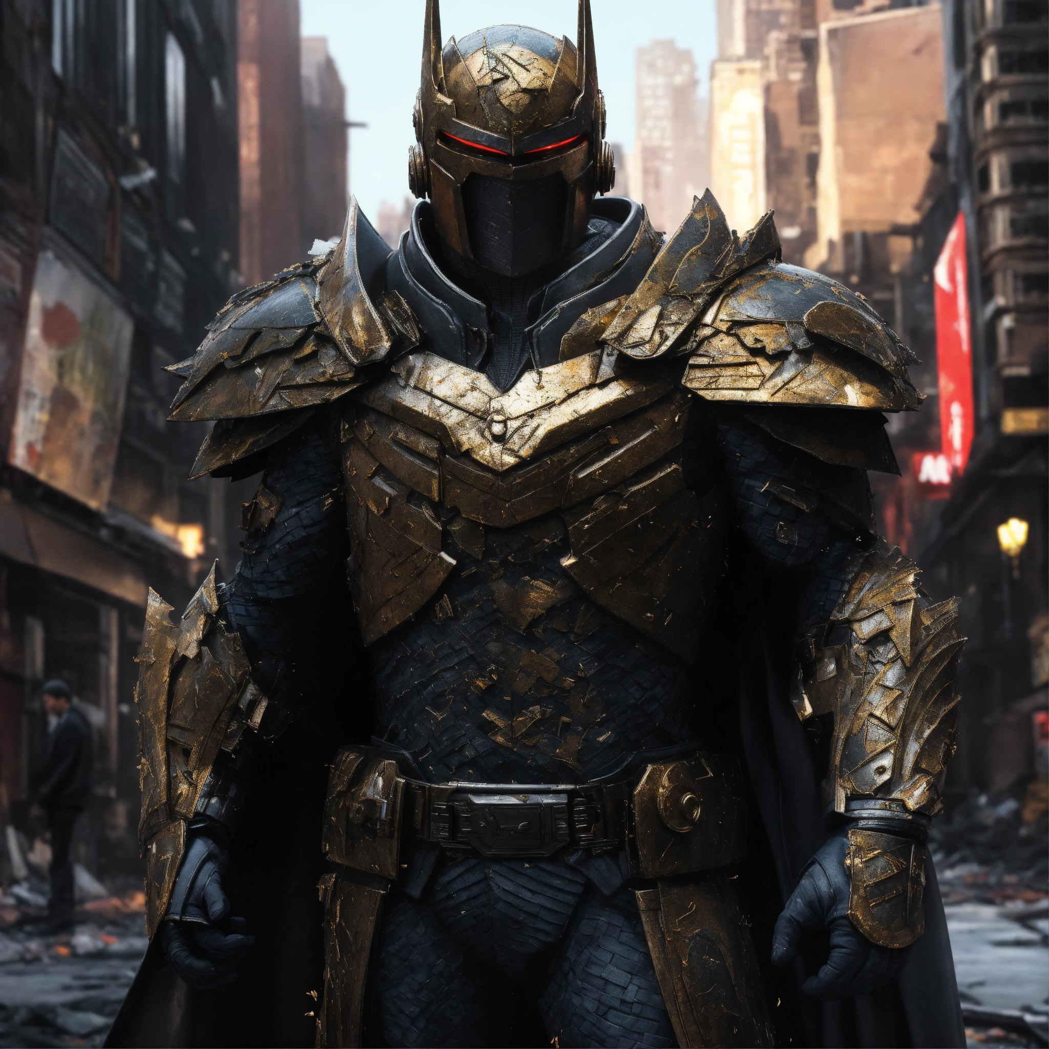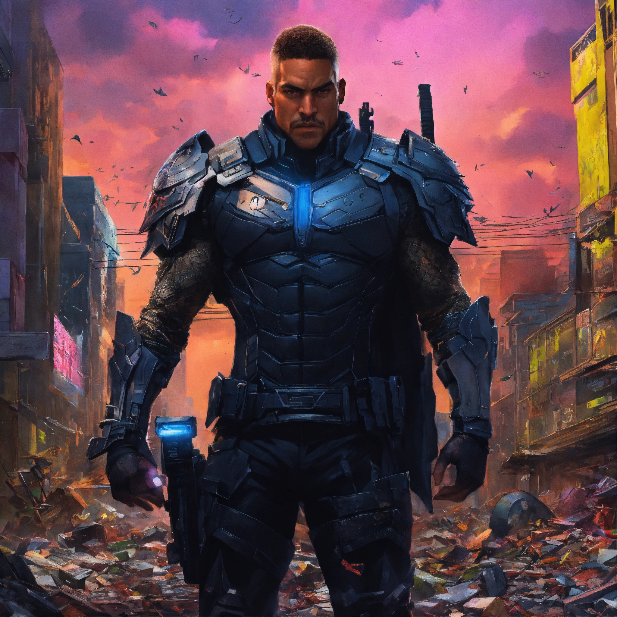 Imagine a villain drawn in frank quietly's hyper-realistic style. every muscle fiber, piece of armor, and surrounding environmental element is meticulously rendered. the villain stands amidst a chaotic urban setting, with every brick, shattered glass, and leaf depicted with intense detail. despite the chaos, the villain exudes a calm and focused demeanor, ready to further disrupt order. the precise linework and overwhelming attention to detail create a visually stunning, immersive scene that invites viewers to explore every inch of the image. super clean style