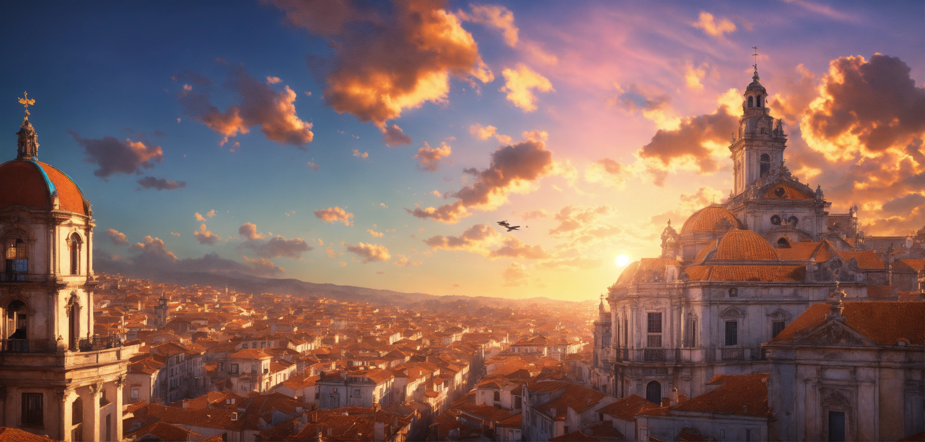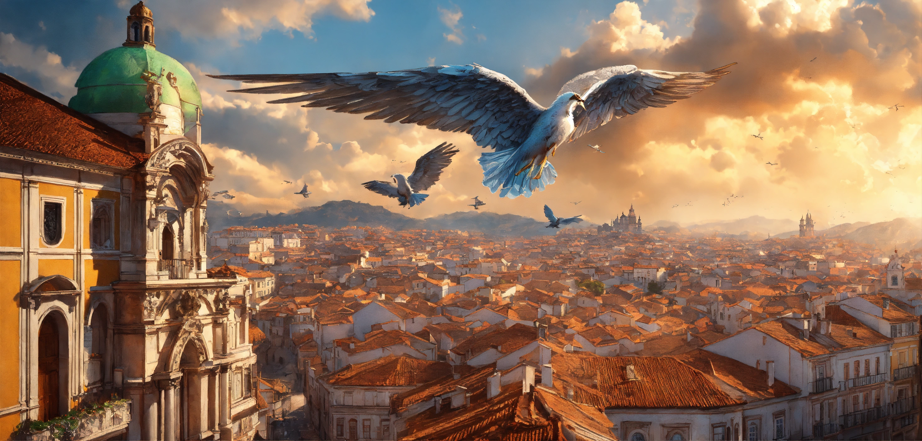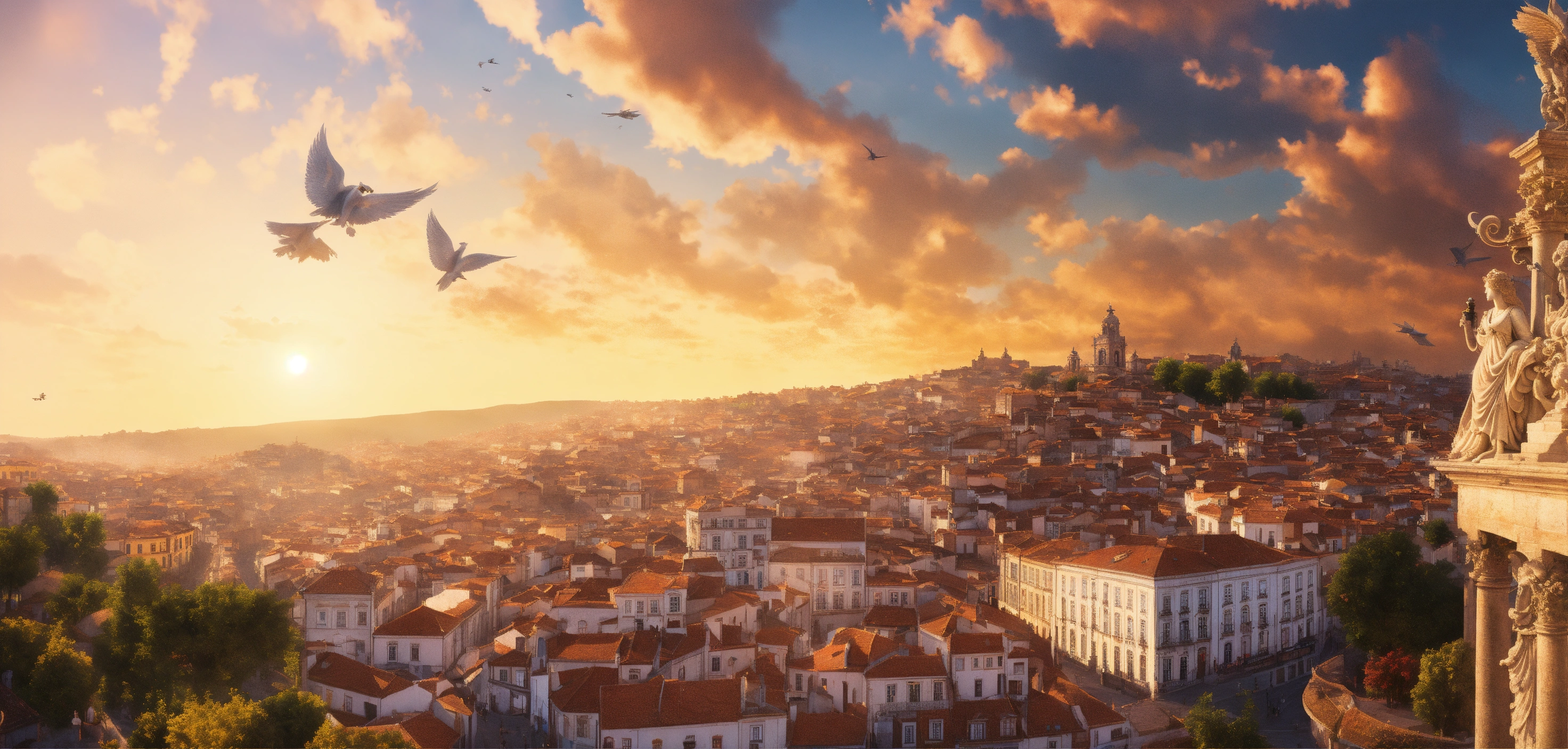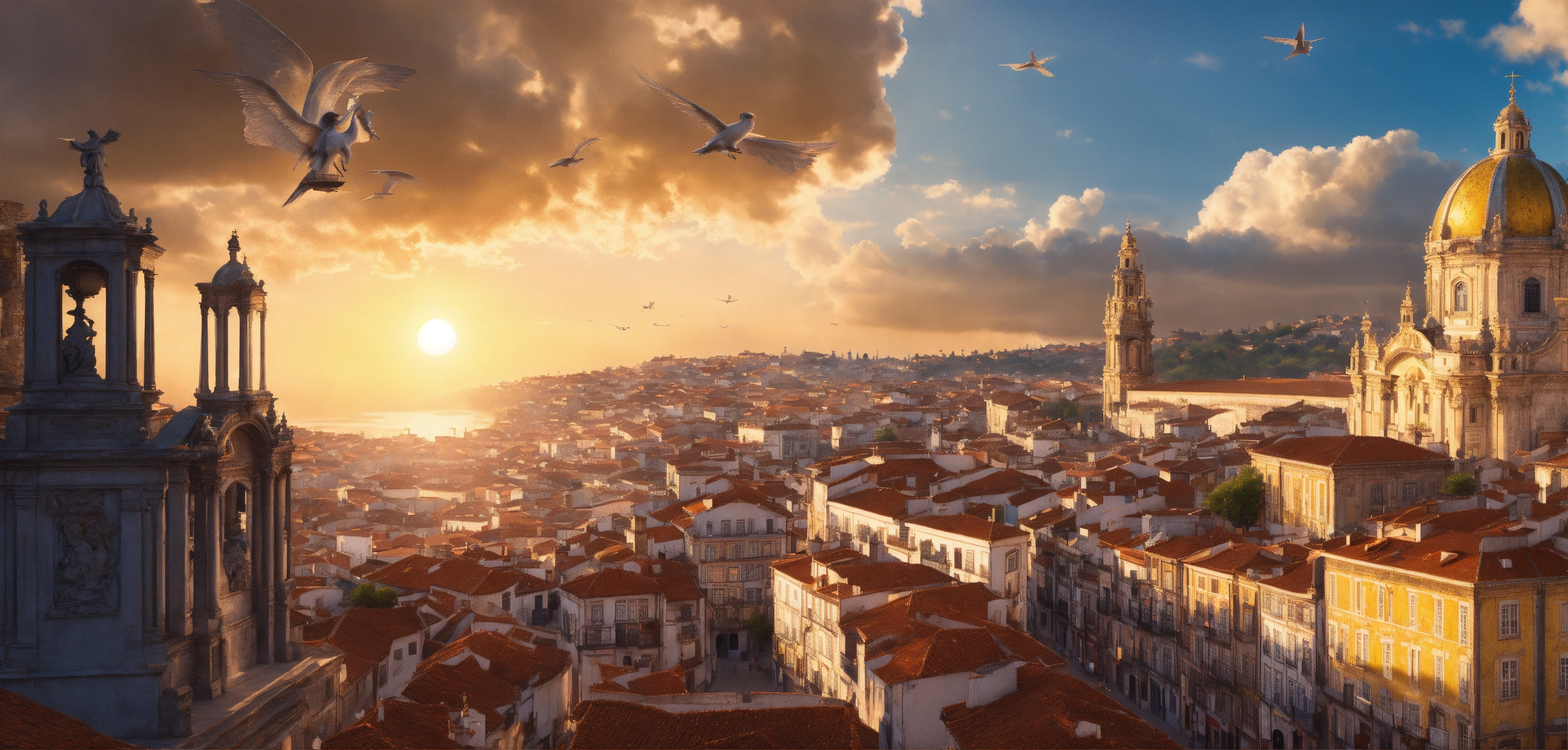 White colored angels and other black colored angels flying across the colorful sky. at the base of the image is a baroque style city in the city of portugal. daylight and a well-lit sun. european graphic book, ultra hd, realistic, vivid colors, highly detailed, uhd drawing, pen and ink, perfect composition, beautiful detailed intricate insanely detailed octane render trending on artstation, 8k artistic photography, photorealistic concept art, soft natural volumetric cinematic perfect light