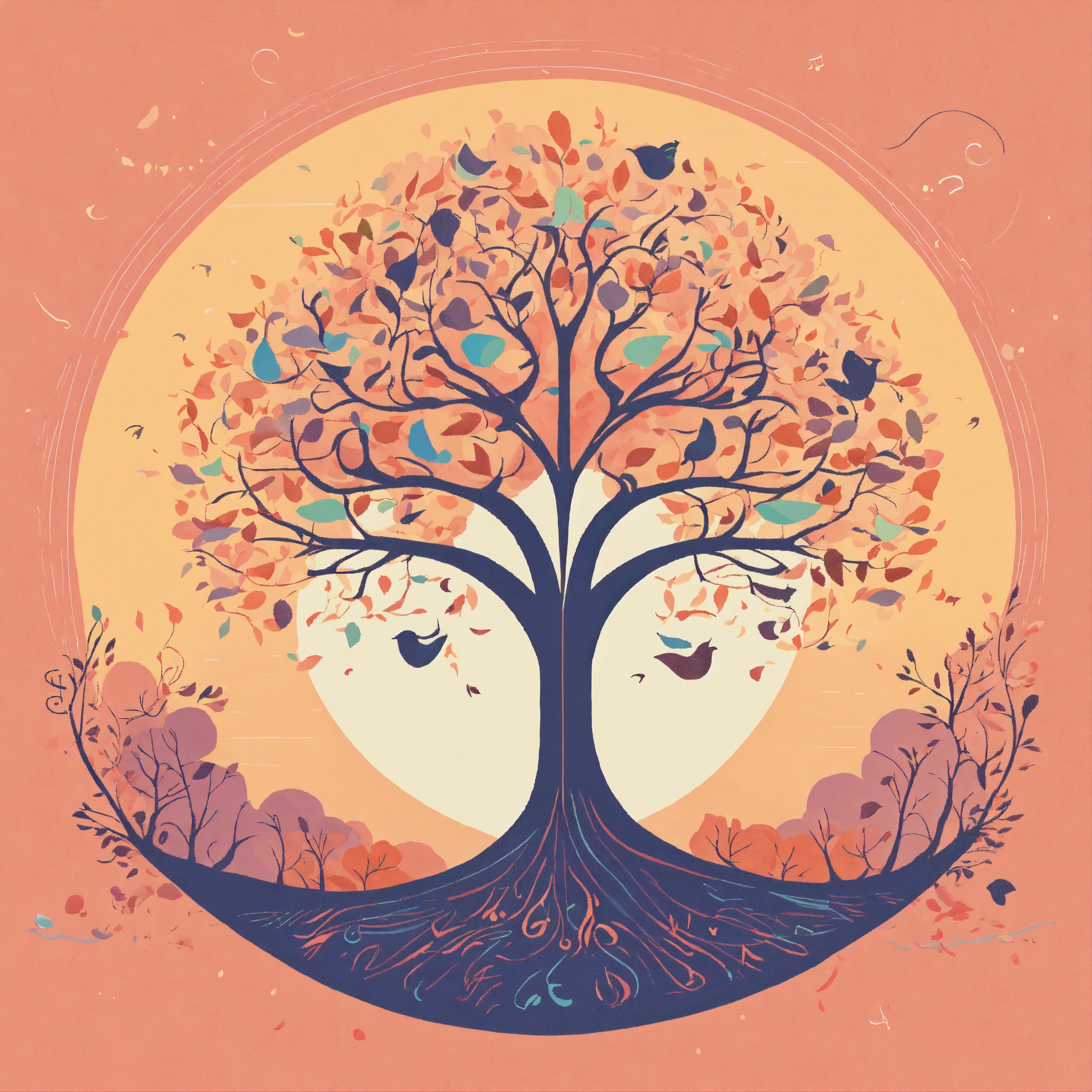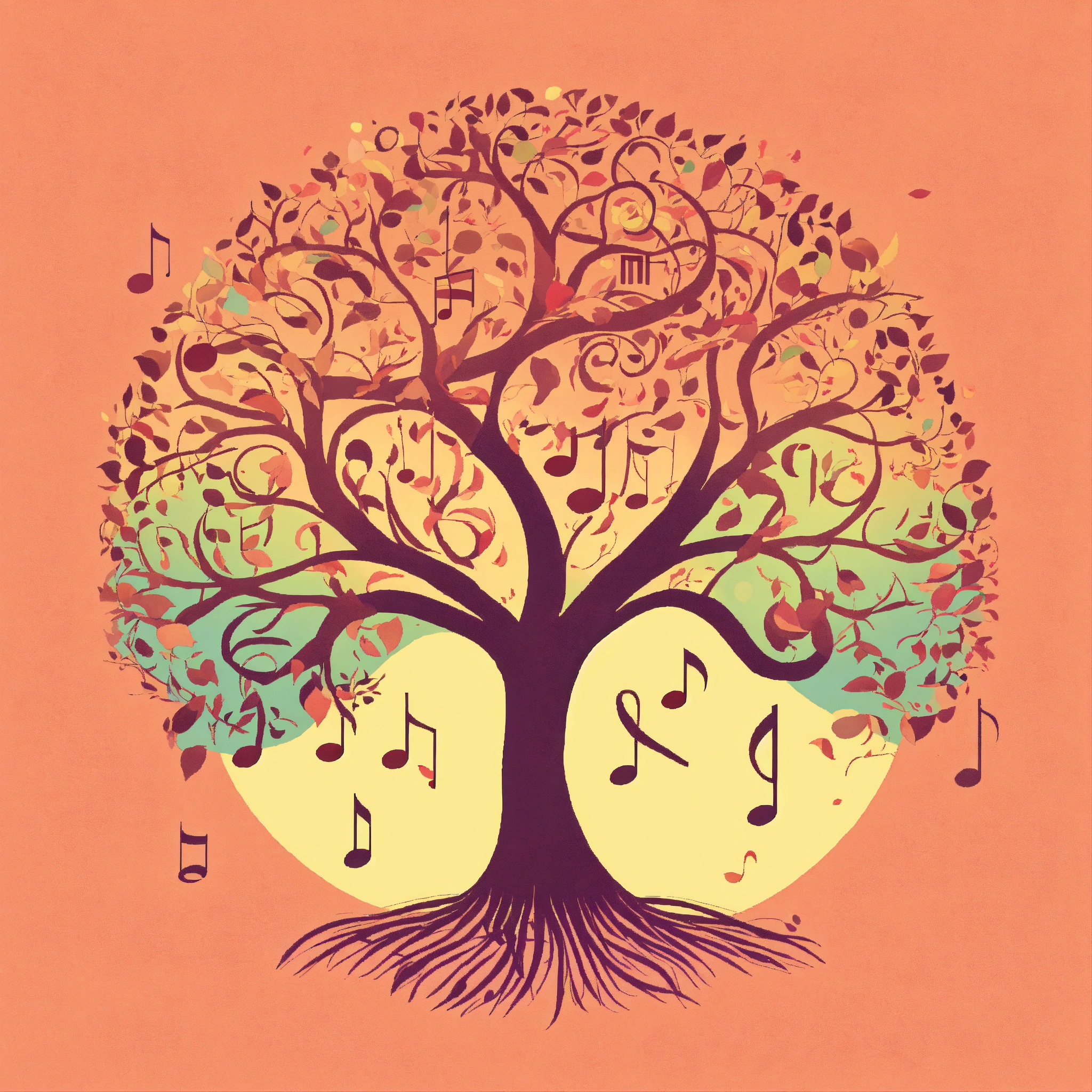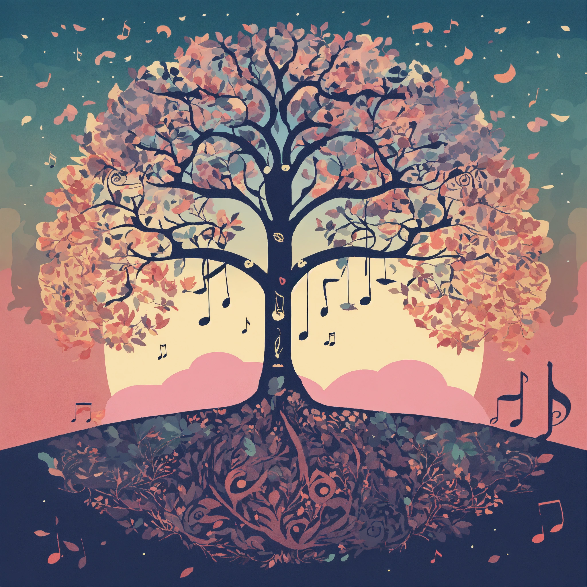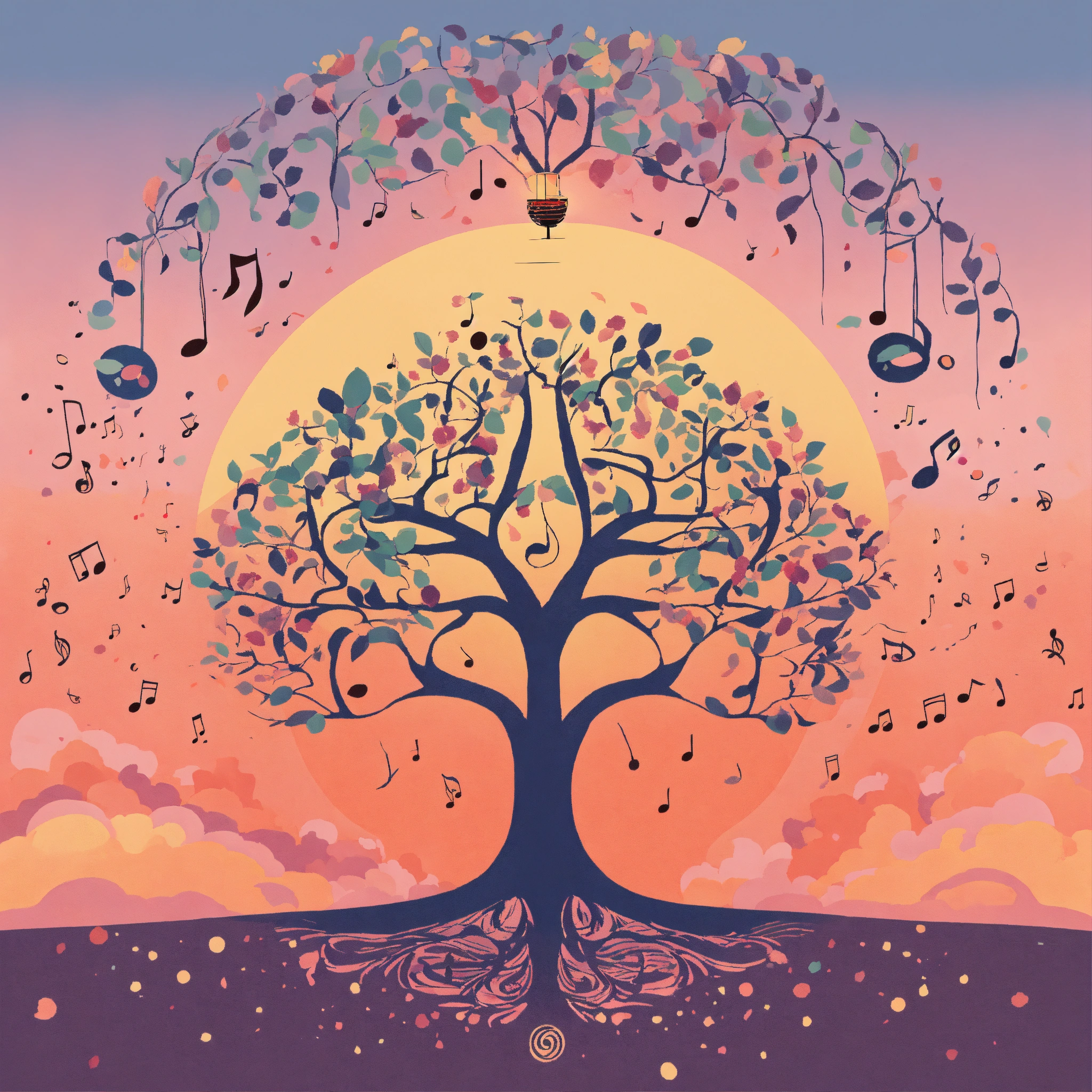 T-shirt vector illustration, centered design of a whimsical tree, with musical notes instead of leaves, set against a pastel dawn. a nod to nature's symphony. simplistic, centered vector illustration, solid background color.