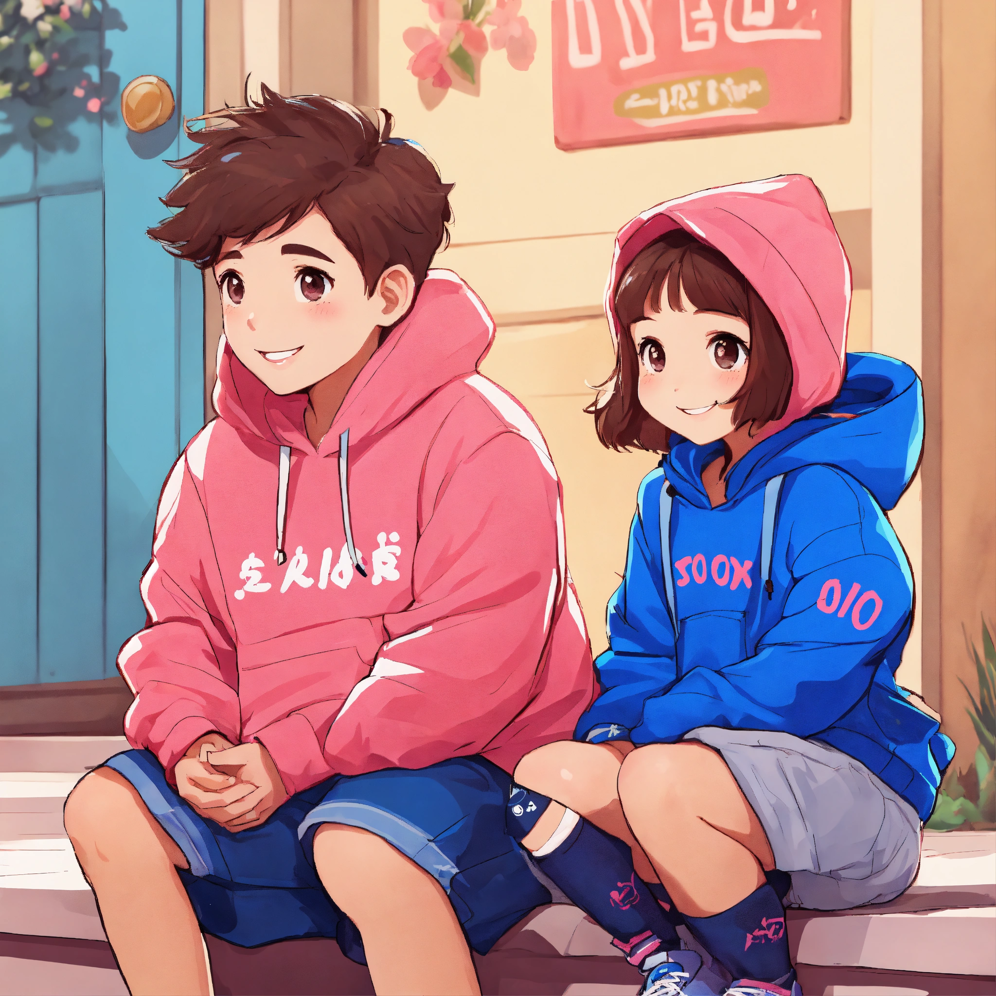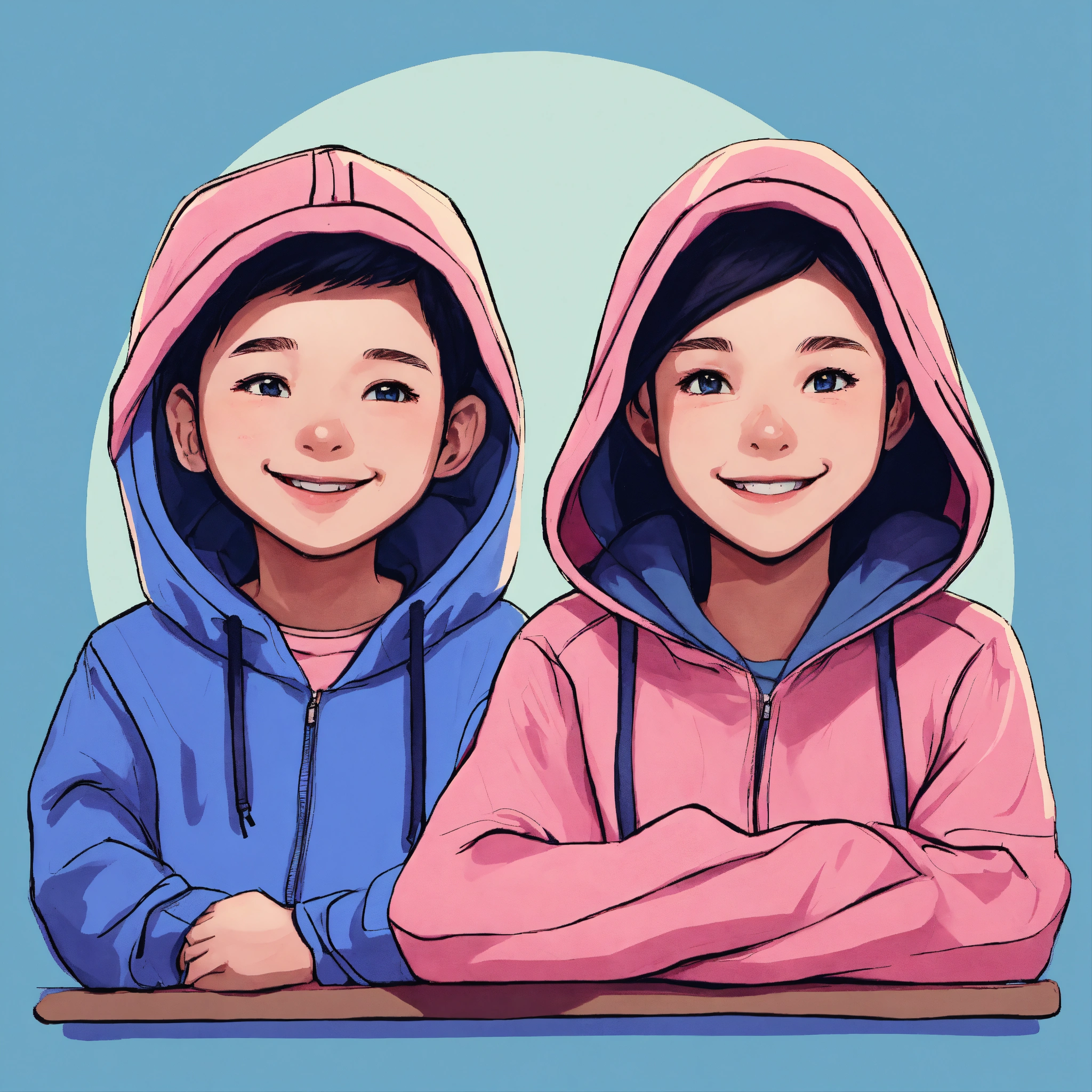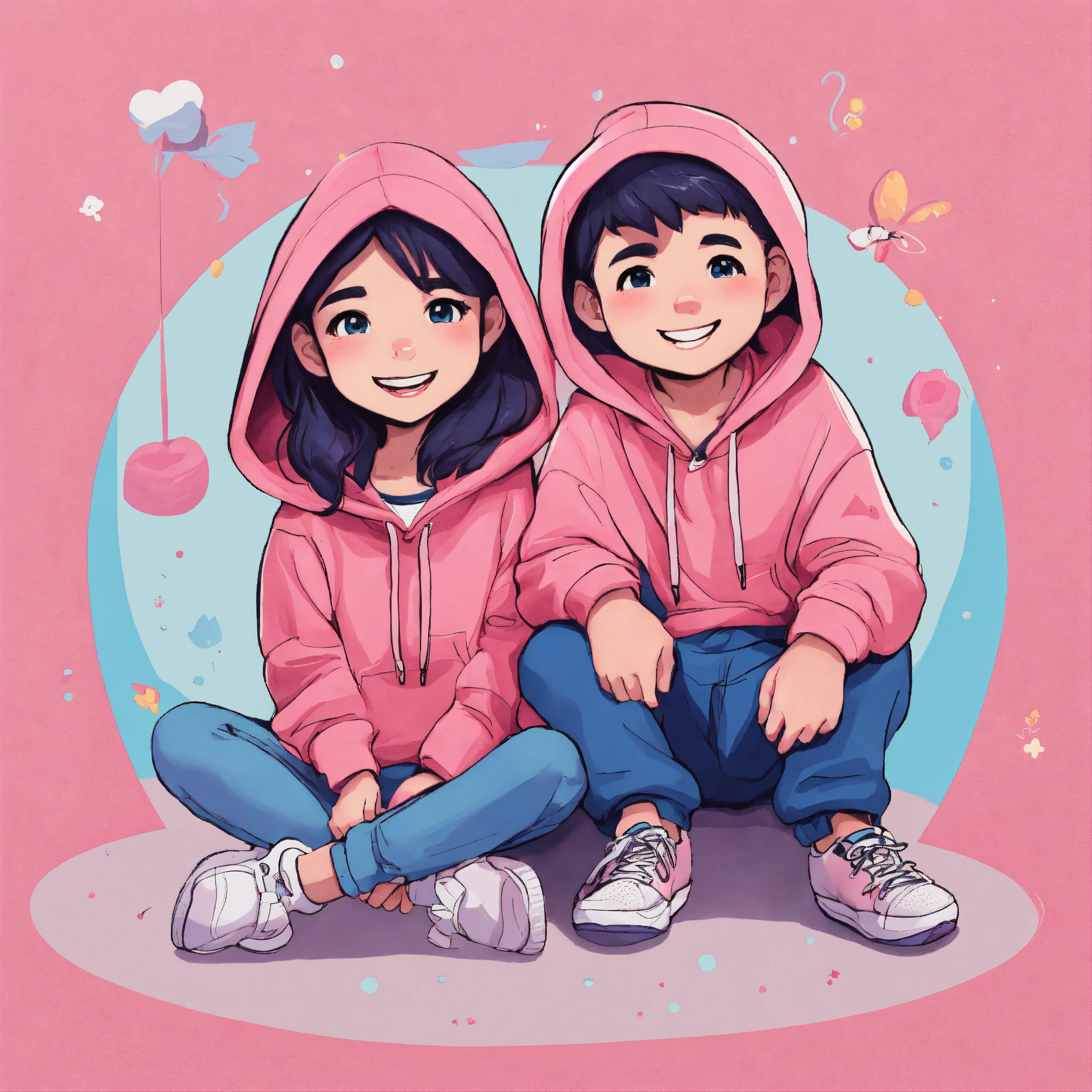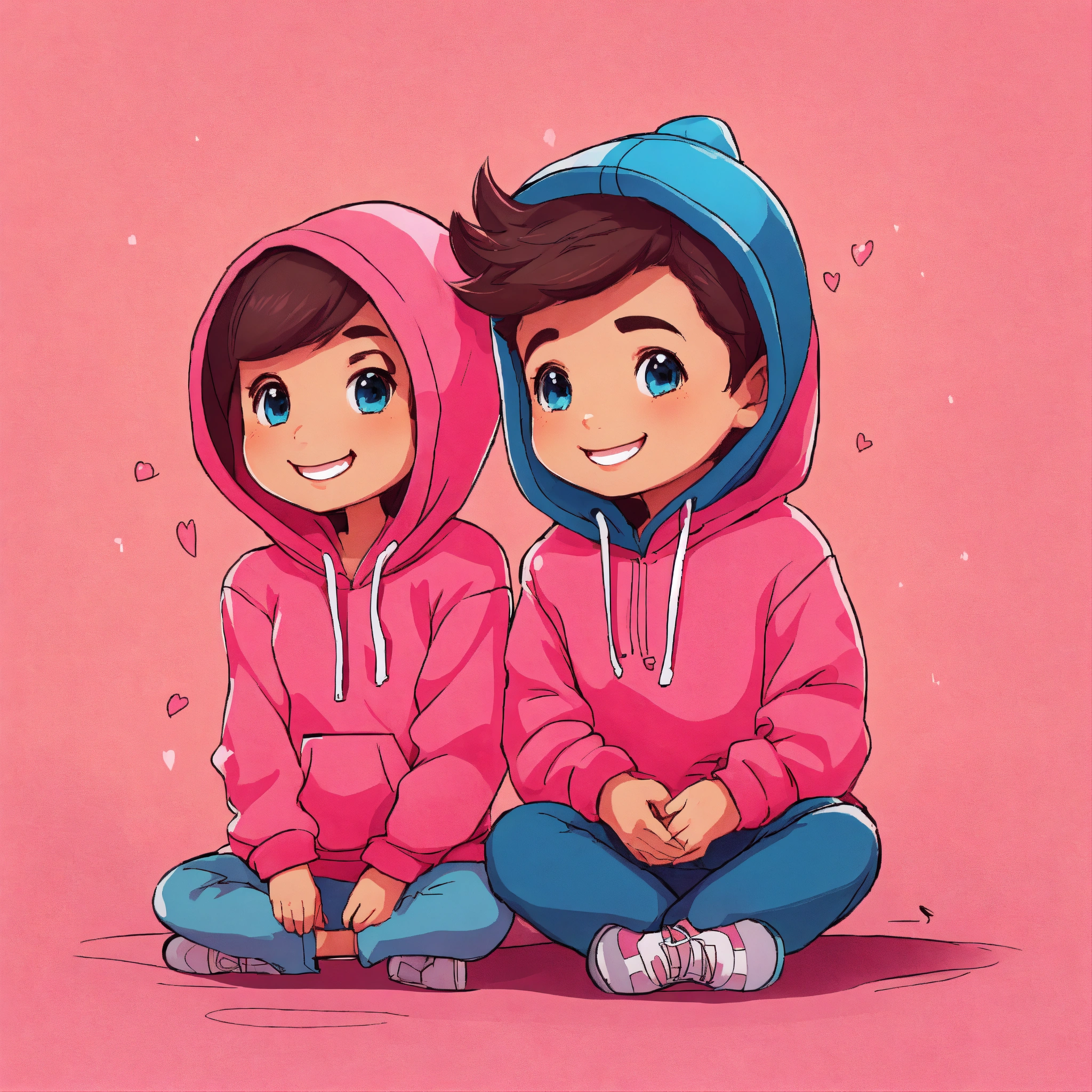 Cute cartoon style of a boy and girl with a smile on the front wearing a pink hoodie and a blue hoodie sitting