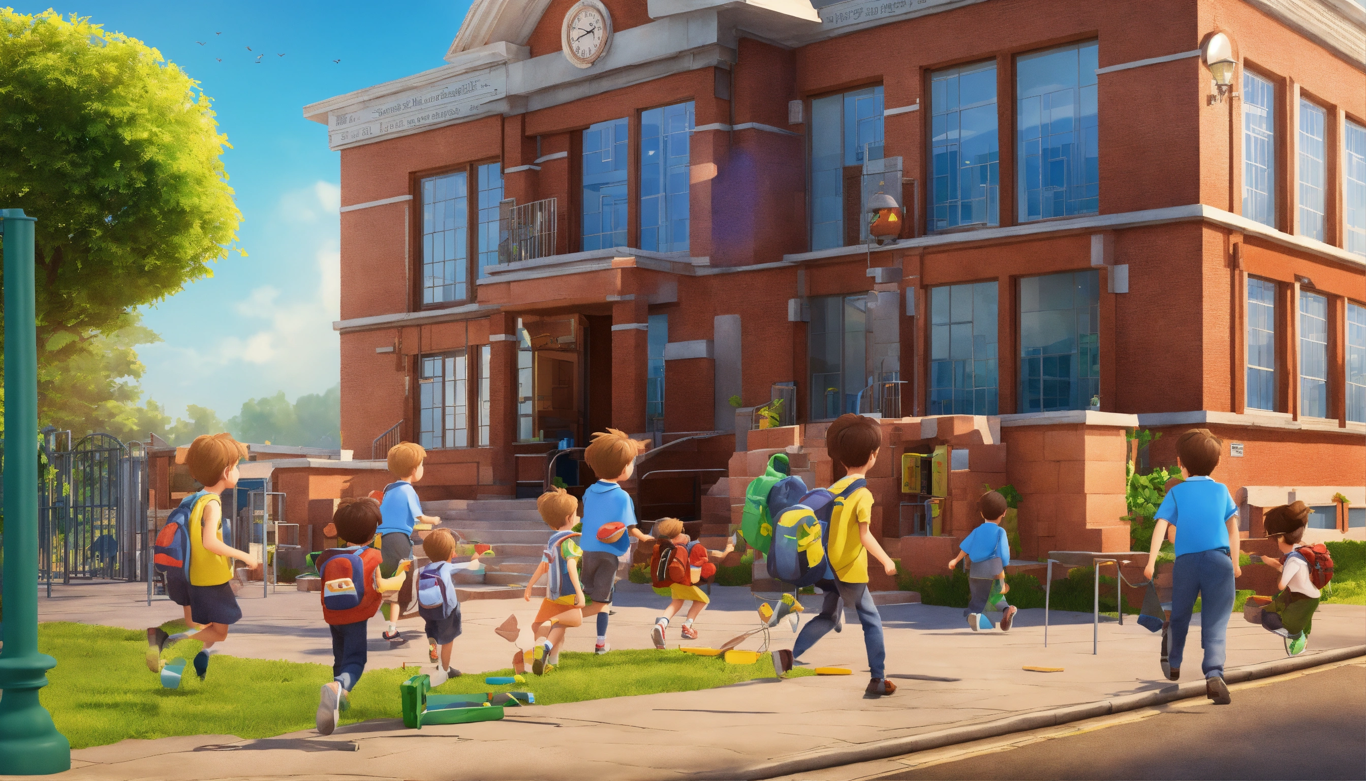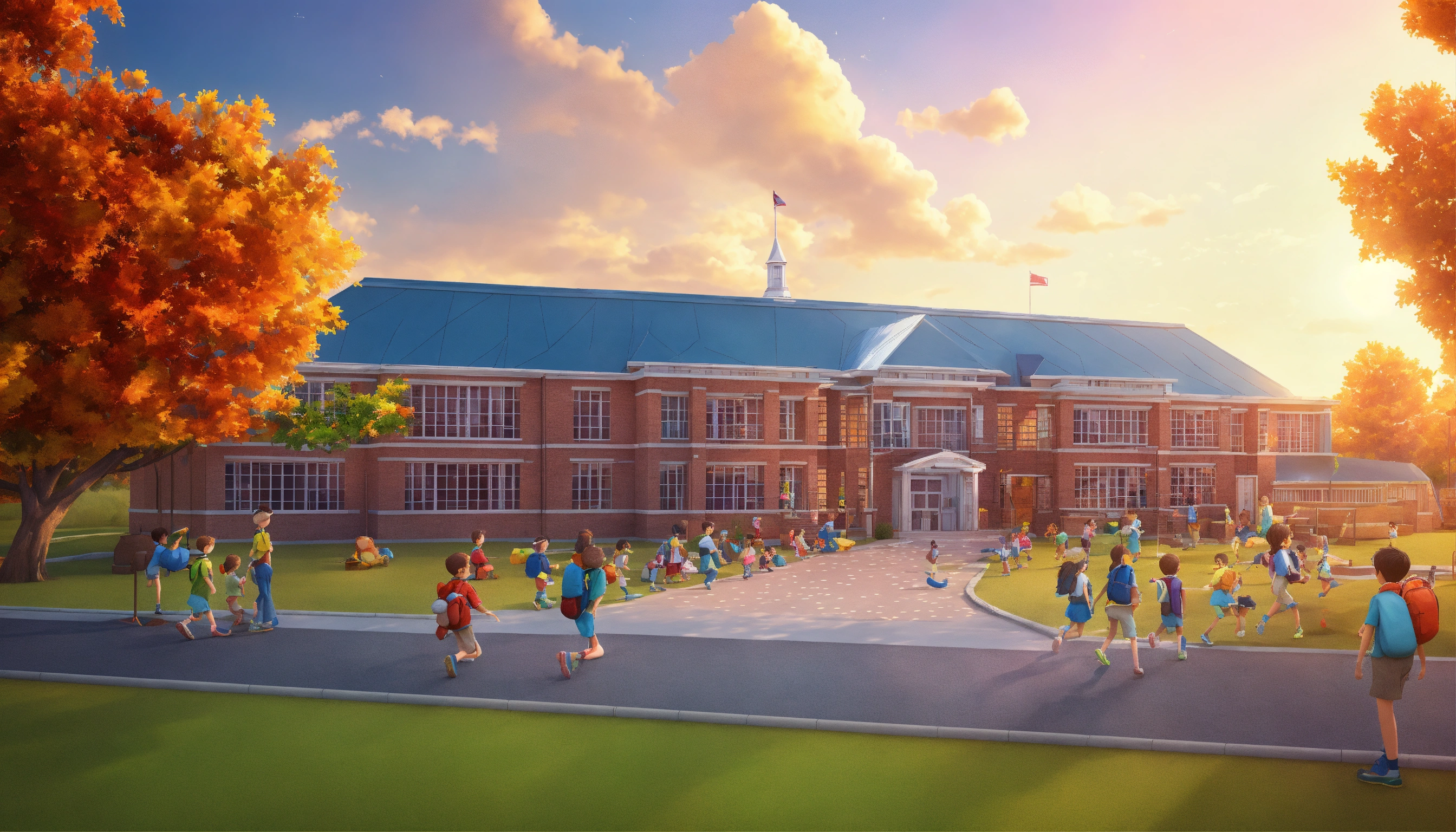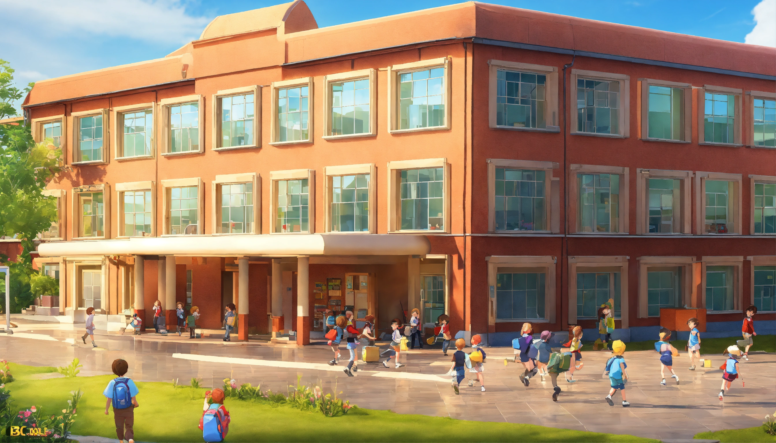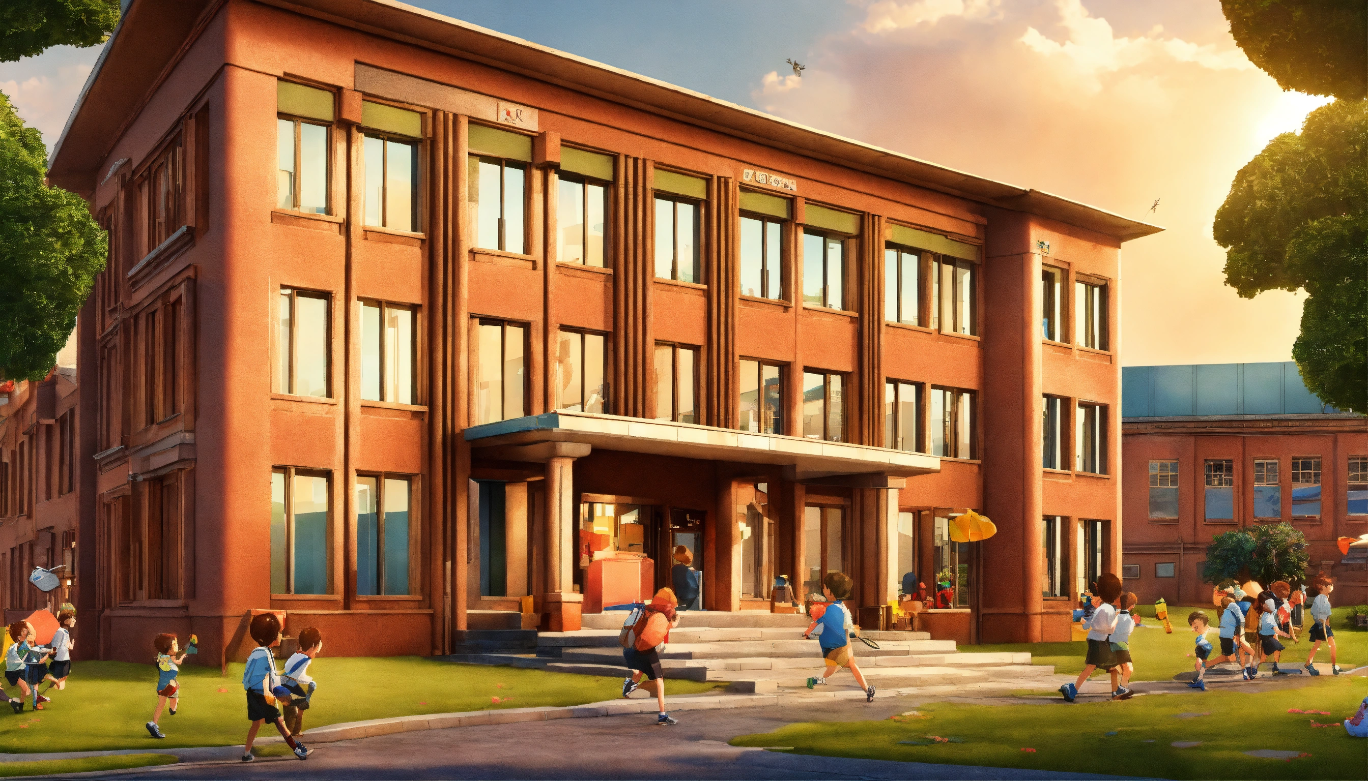 Generate an image of a school building with children getting out of it, 3d cartoon pictures, storybook illustration, digital art, professional, high quality, detailed.