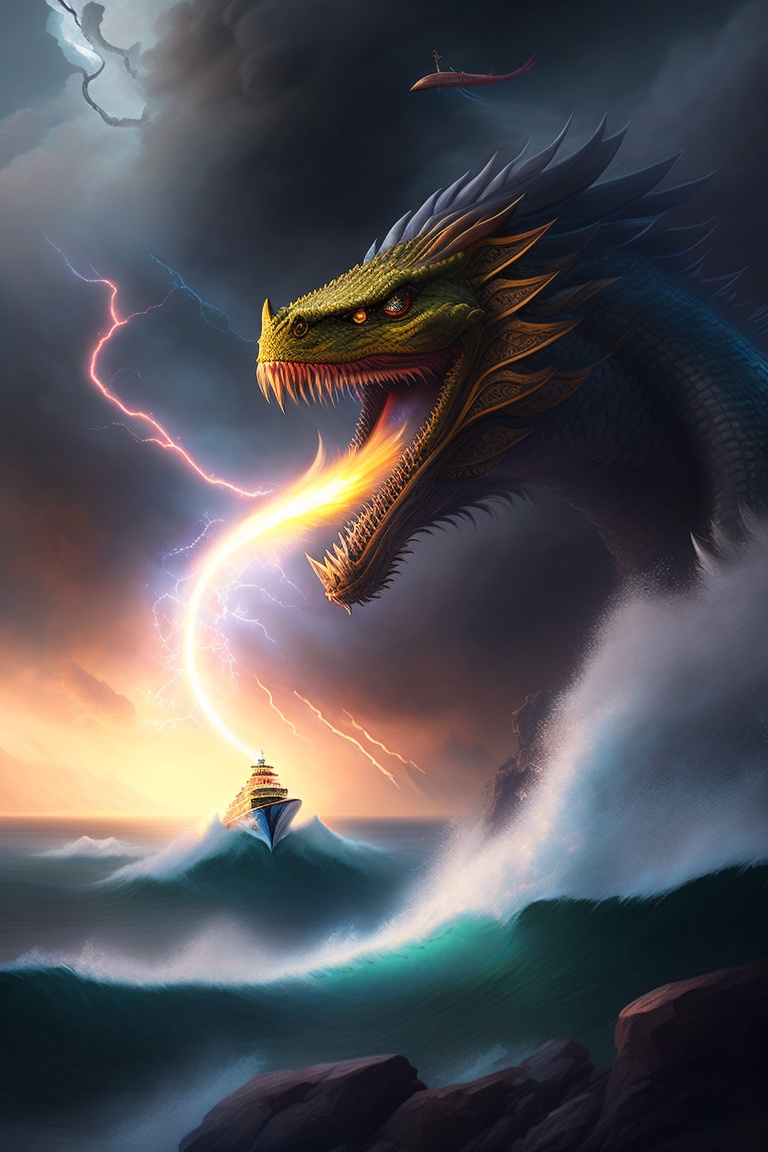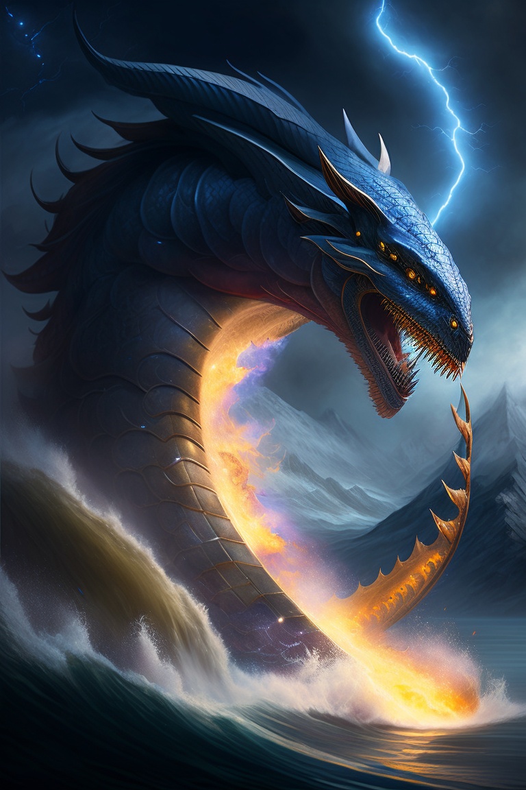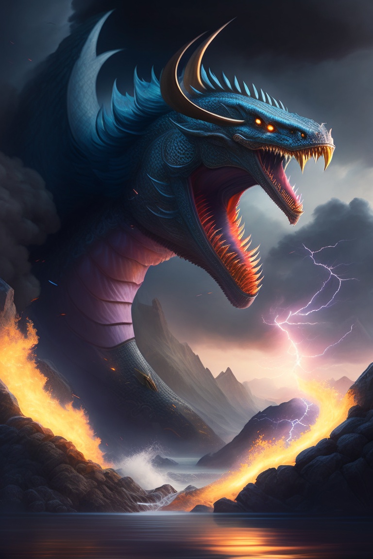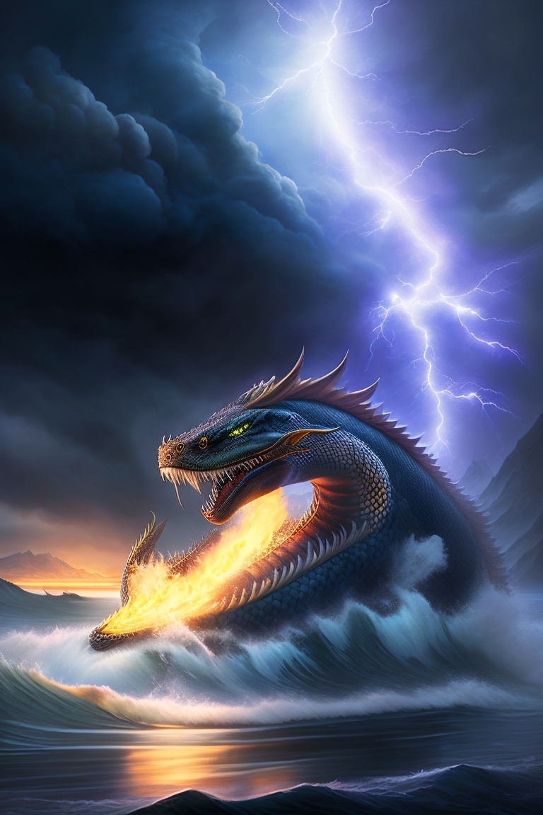 Photo-realistic image of the great serpent jormungandr battling the god thor, with epic clashes of lightning and destruction in a mythic norse landscape, representing the ragnarök prophecy