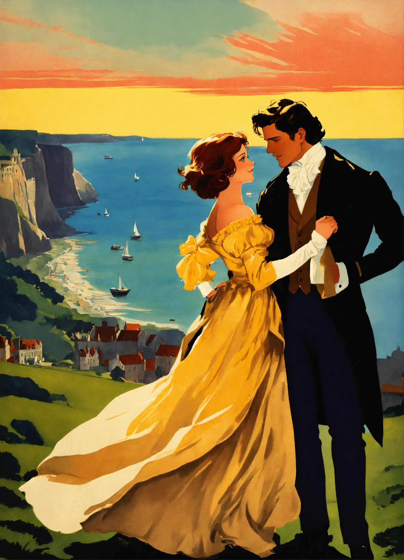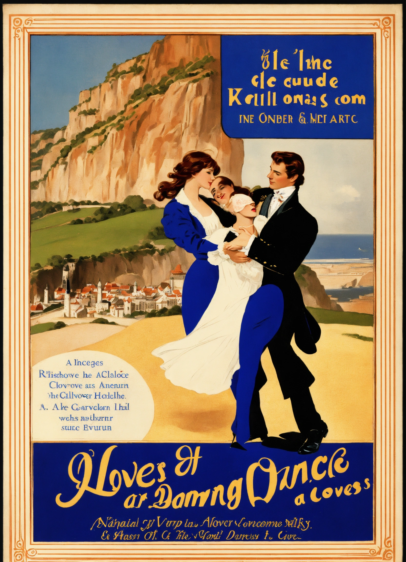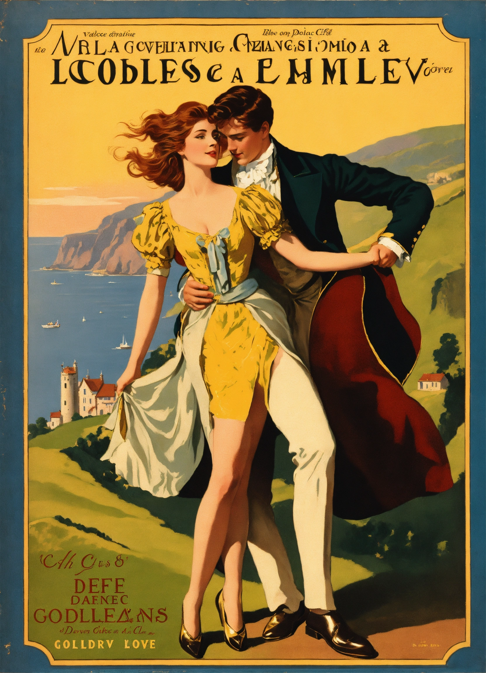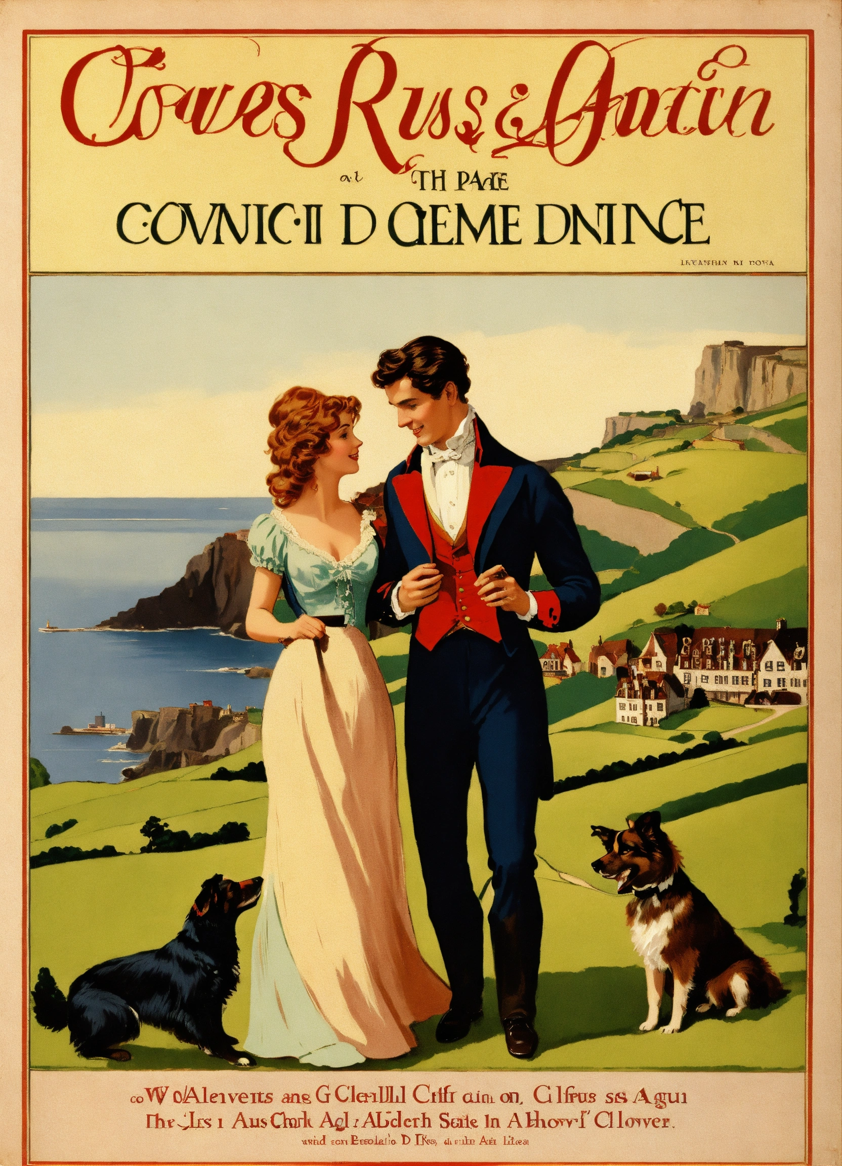 Create a captivating cover design that conveys the theme of romantic comedy, with the title of " loves many guise a comedic dance, featuring a dashing regency gentleman with auburn hair embracing a slender woman with golden hair, a long face, and hazel eyes. again, the cliffs of dover and a sable collie could be in the background near their legs. vintage poster paint book cover style design, with shadows and effect that gives the design captivating