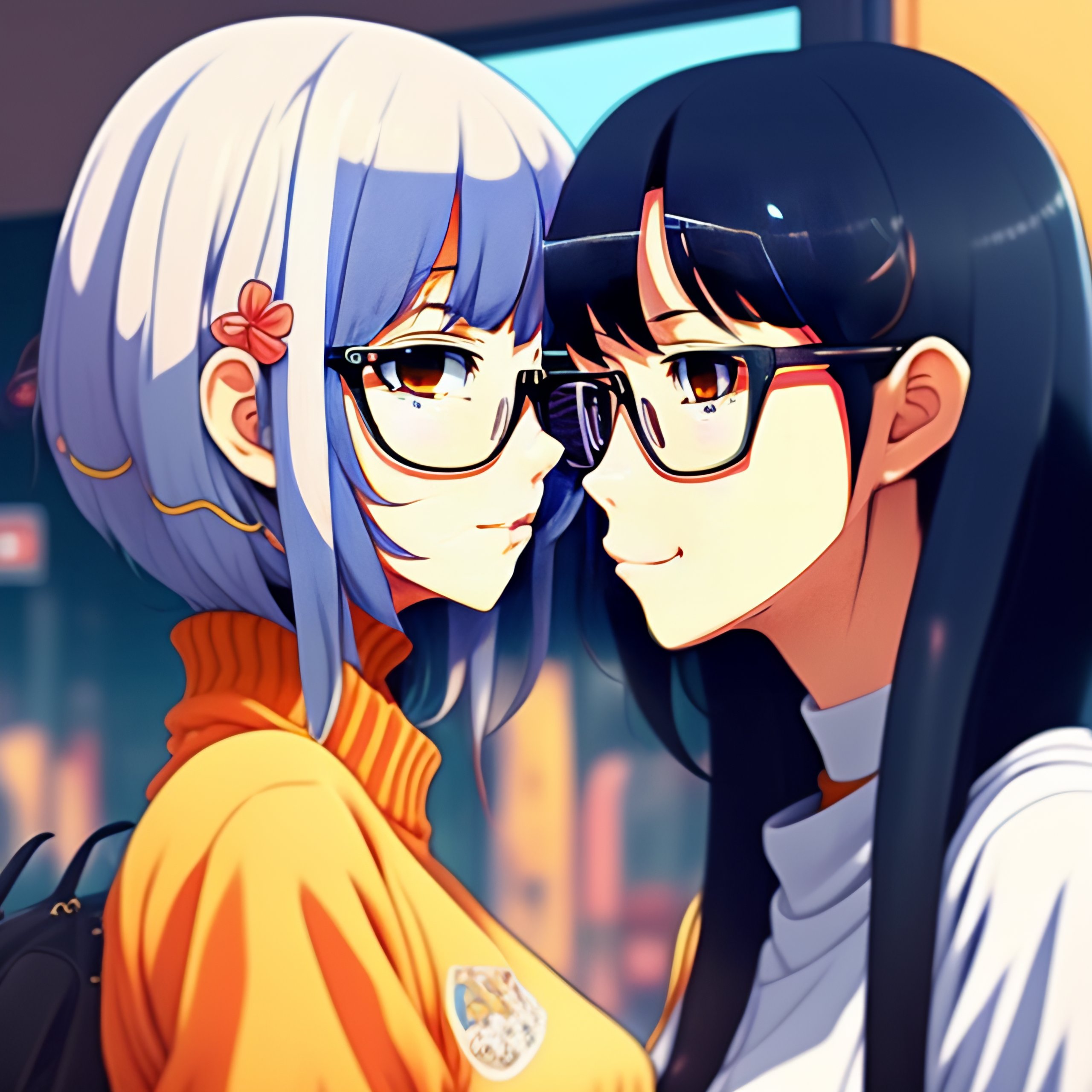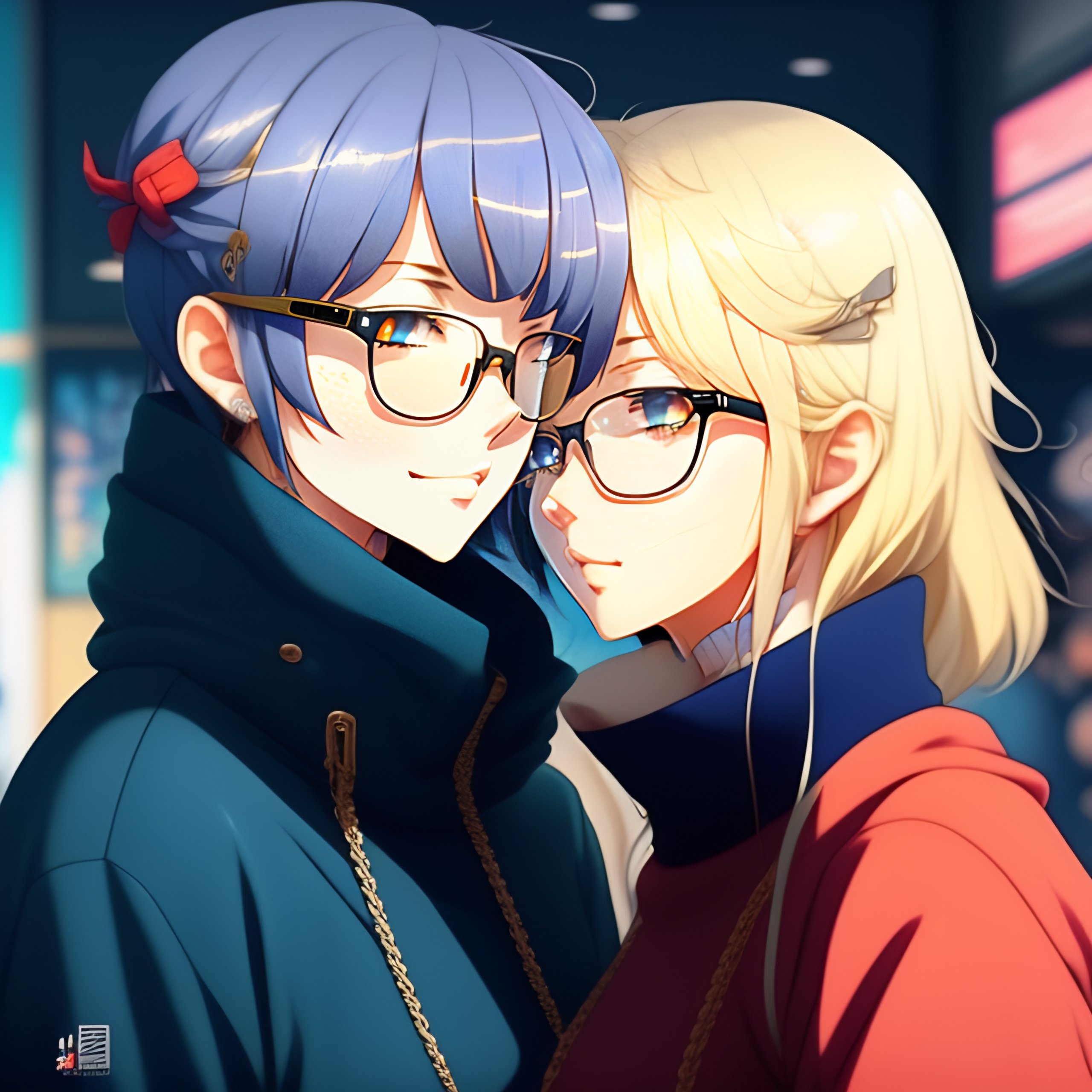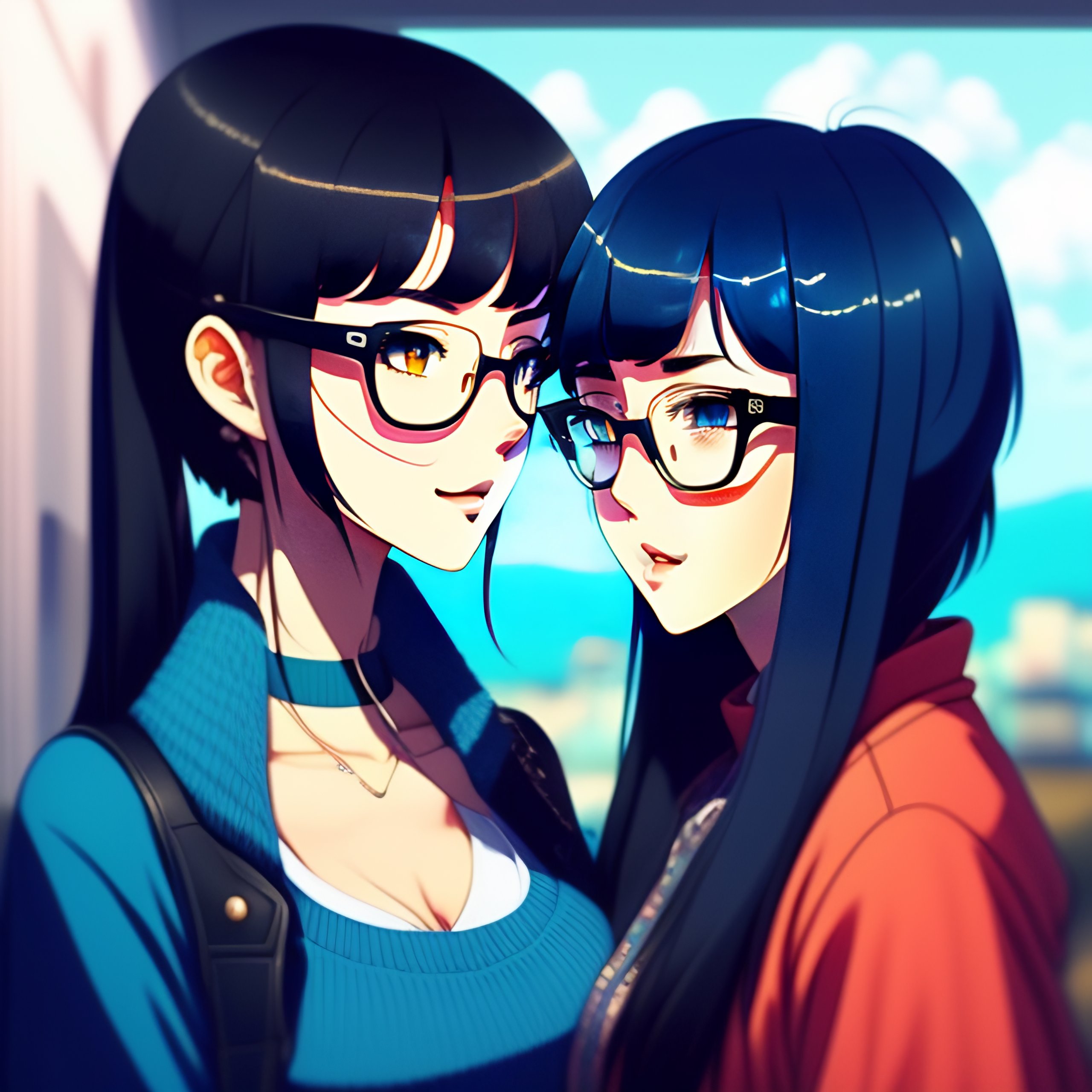 Cute girl in blue sweater black hair black wayfarer glasses sitting inside home kissing her girlfriend who is blonde, anime style, ghibli