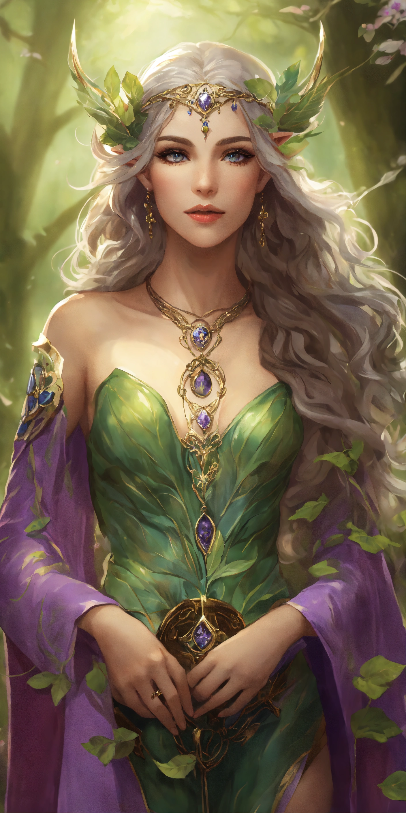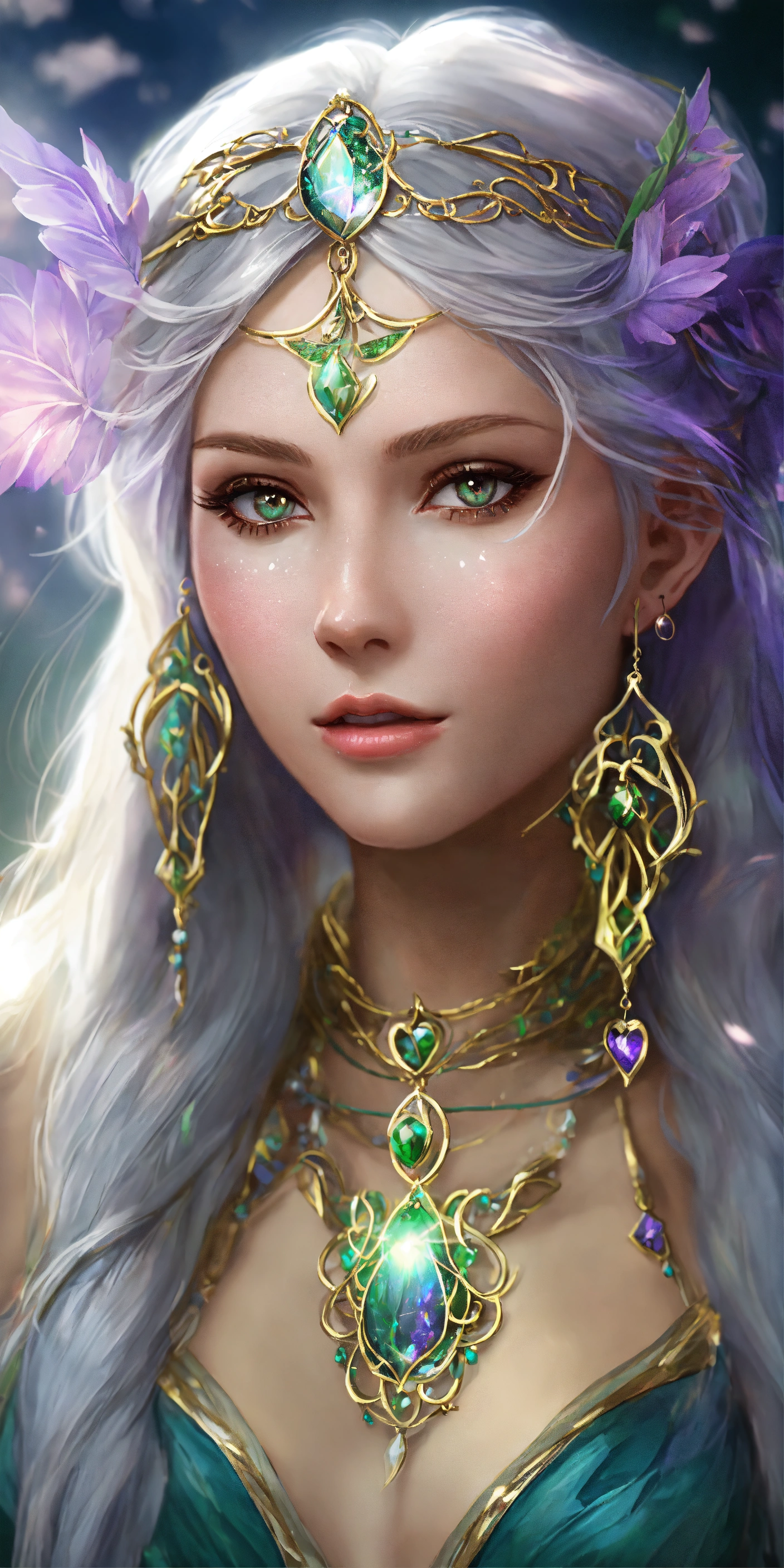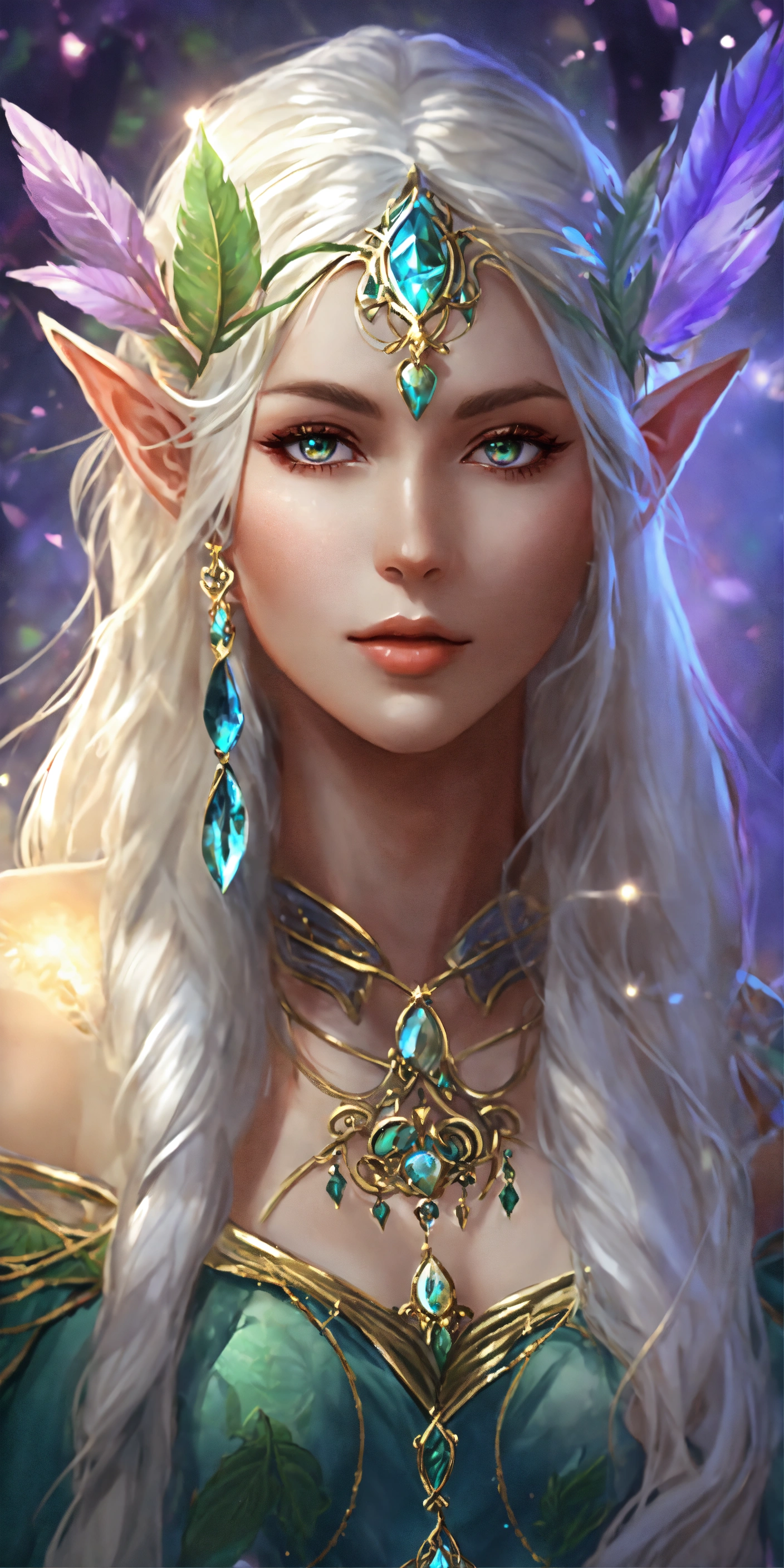 Eladrin elf of the feywild, young adult, slender and lithe bodyframe, aura of wisdom and serenity, pointed ears tapering elegantly to delicate tips, pale white complexion reminiscent of moonlight. her face is heart-shaped, with high prominent cheekbones, sculpted strong jawline, and a pert nose. her eyes are captivating, with violet purple eyes speckled with golden flecks resembling the starlit skies of the feywild, waist-length shimmering pearlescent silver hair. enchanted green jewelry and accessories made from magical plants grace her features. rings made from enchanted leaves encircle her fingers, and a necklace made of vines with a pendant carved from a feywild gemstone hangs around her neck. these accessories shimmer with an inner light, demonstrating her connection with the feywild's mystical energies, dress made of plants and feathers, scandinavian, swirling magic, 8k, full body