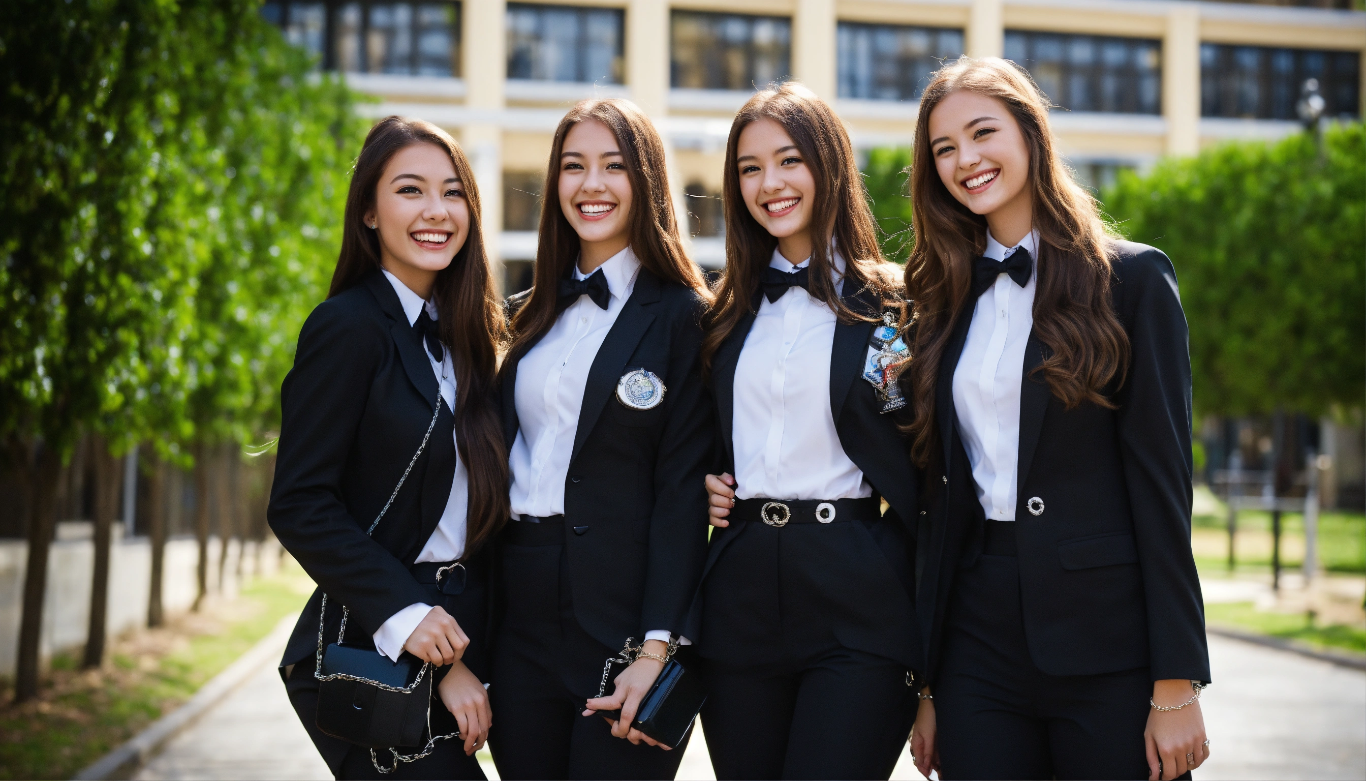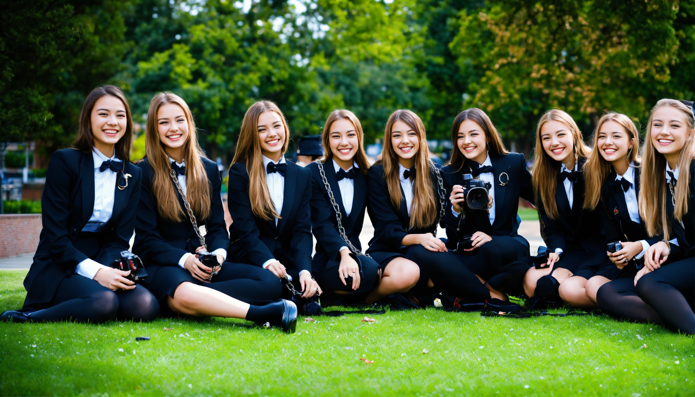 Group beautiful university students, caucasian, female, age 19, college campus, tight shiny black suits, bow ties, smiling, laughing, holding cameras, taking photos, cameras, photo shoot, holding chrome chains