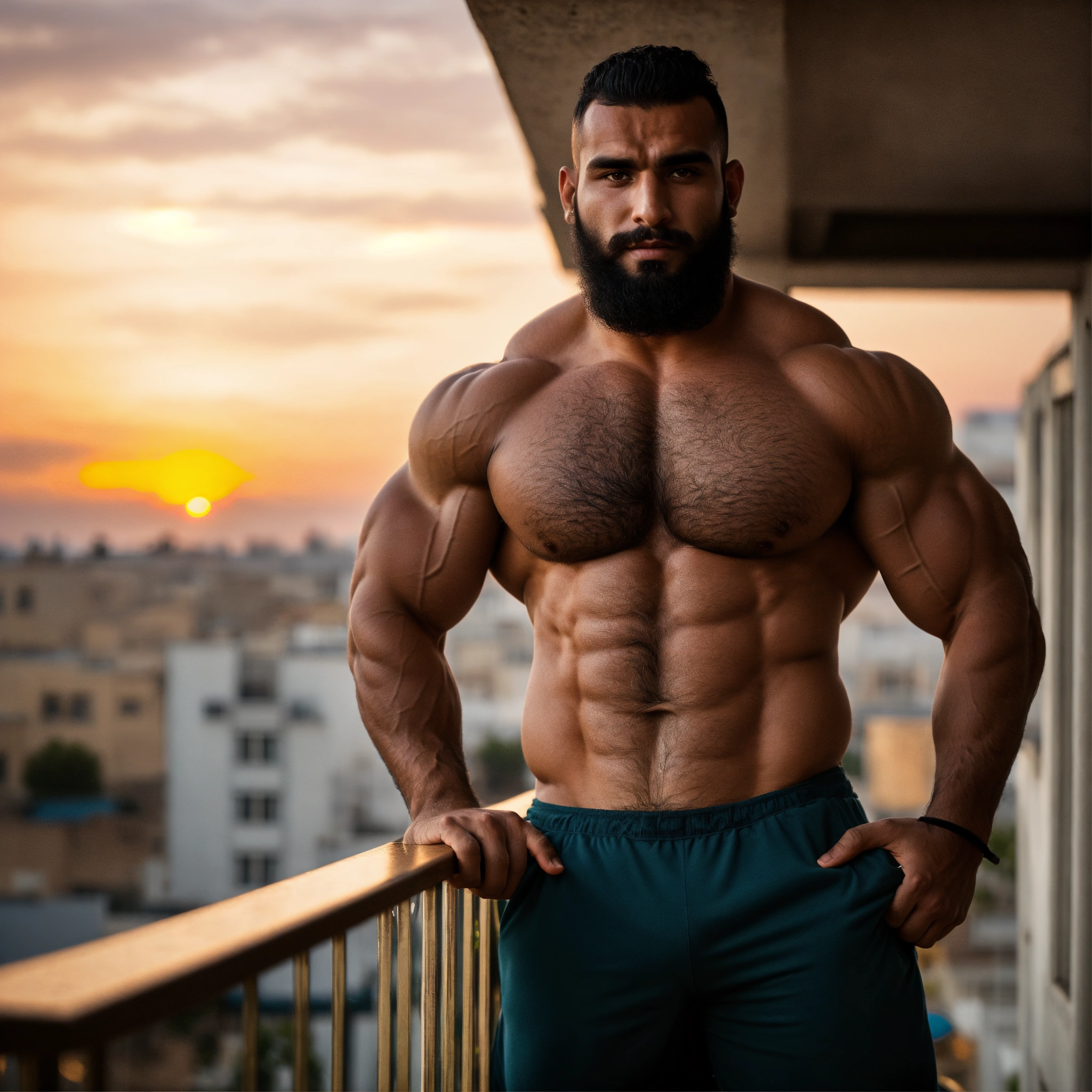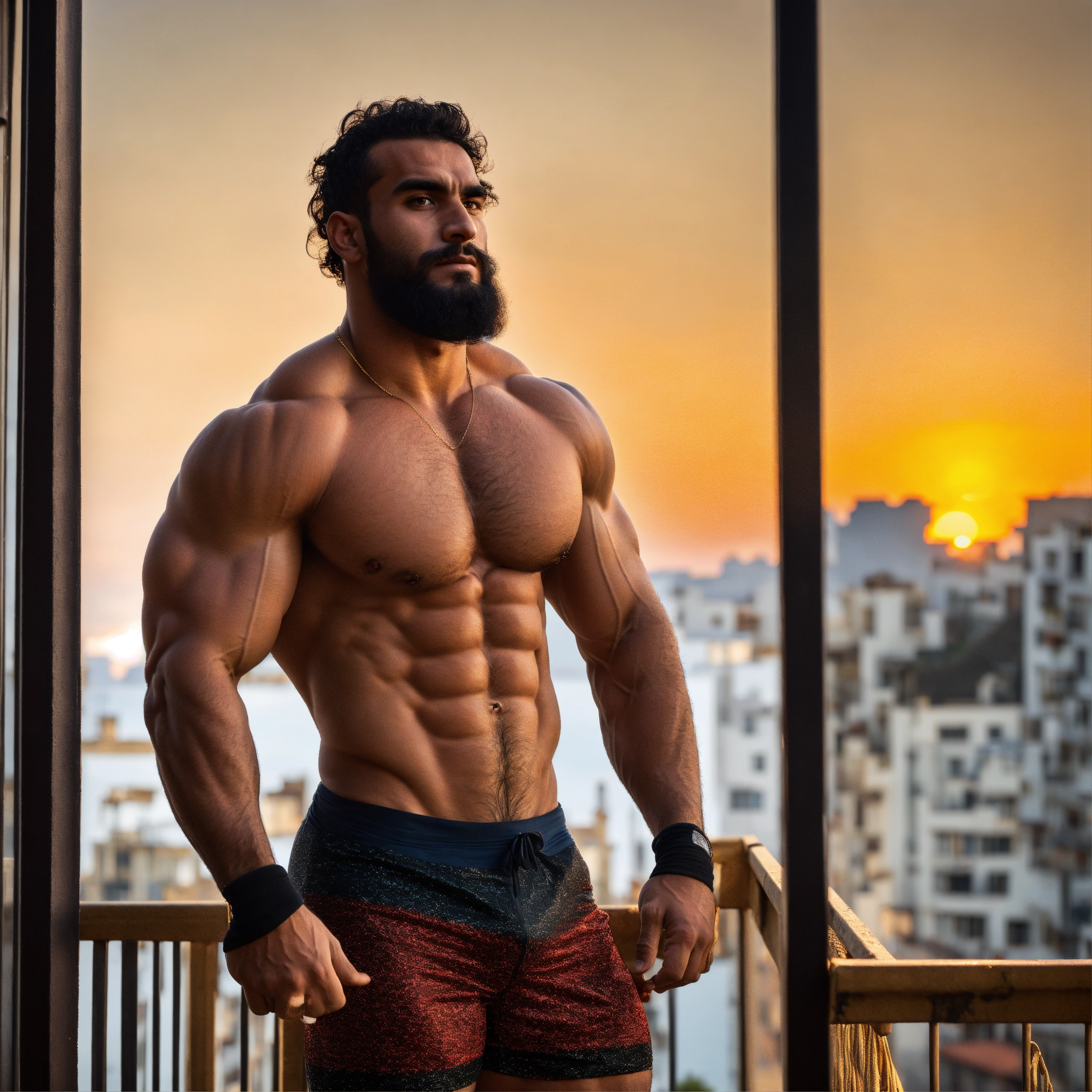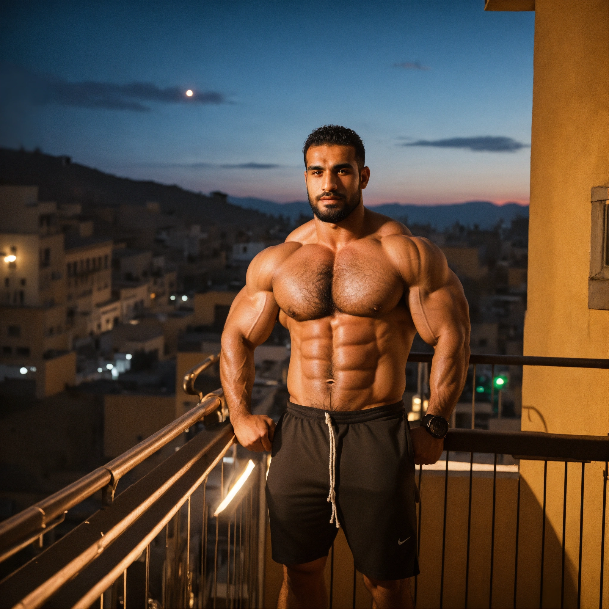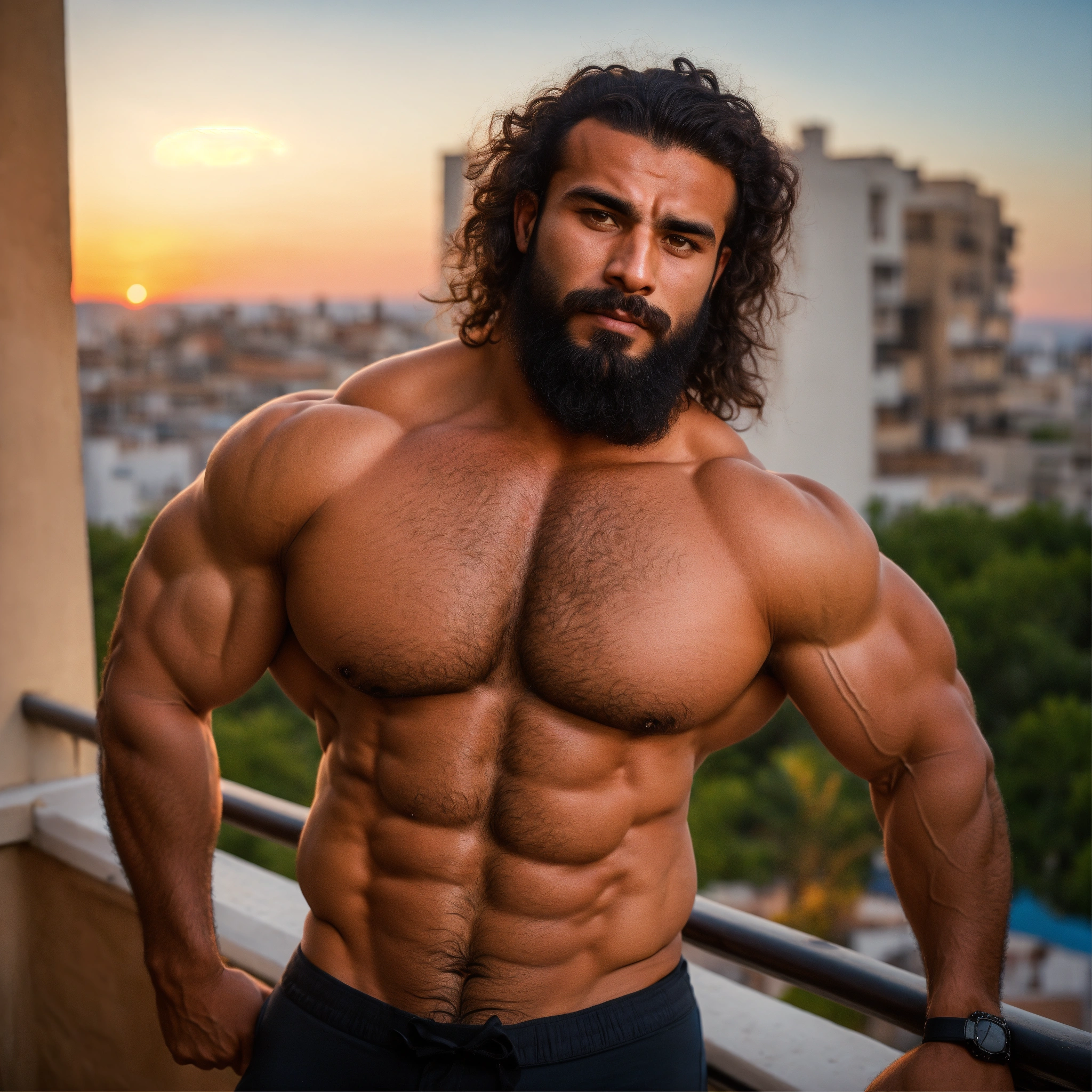 30-year-old hairy algerian man with big muscles, big bodybuilder, body like a wrestler, on a balcony at sunset
