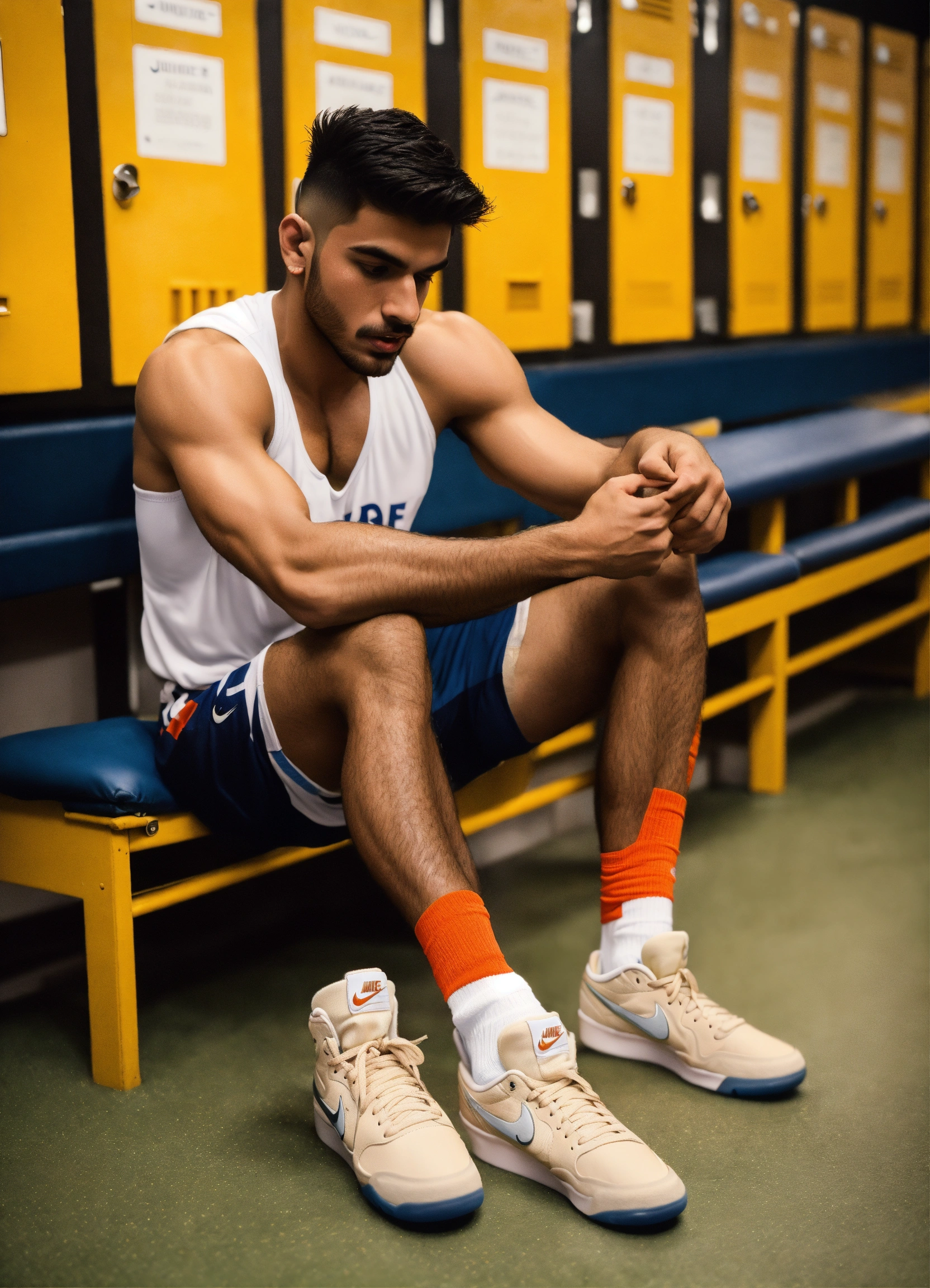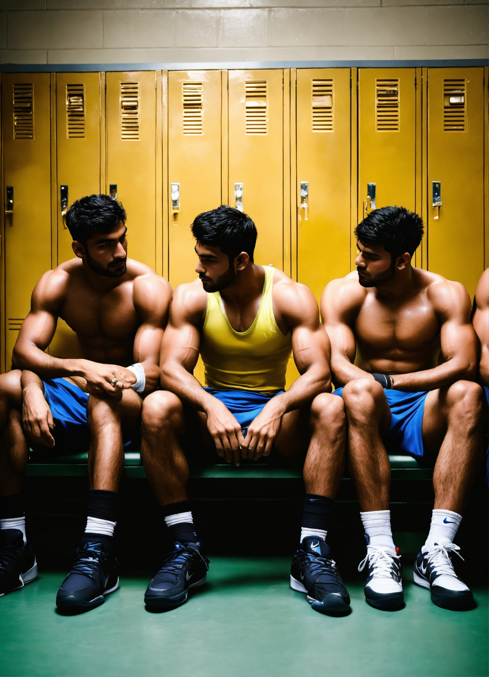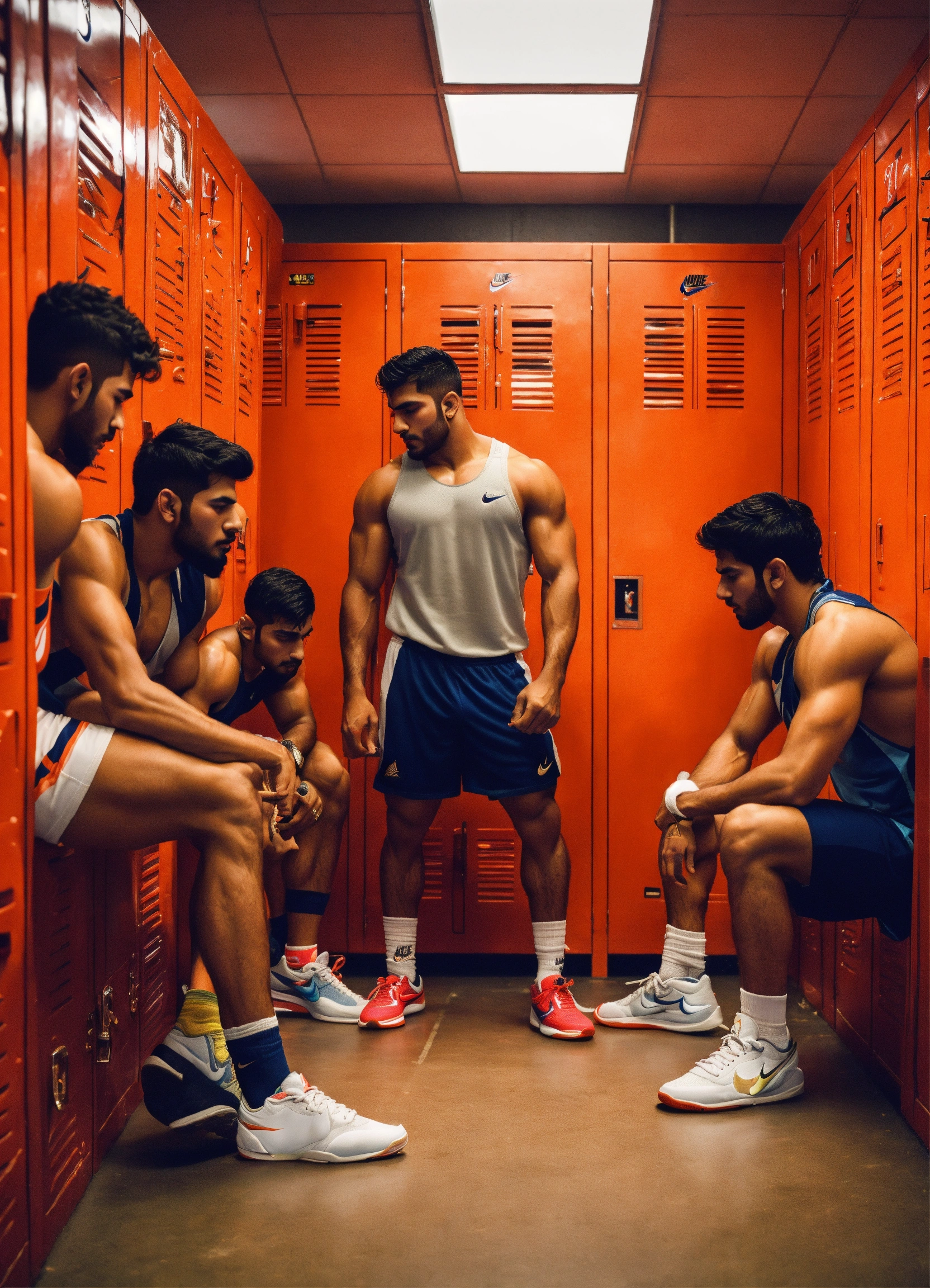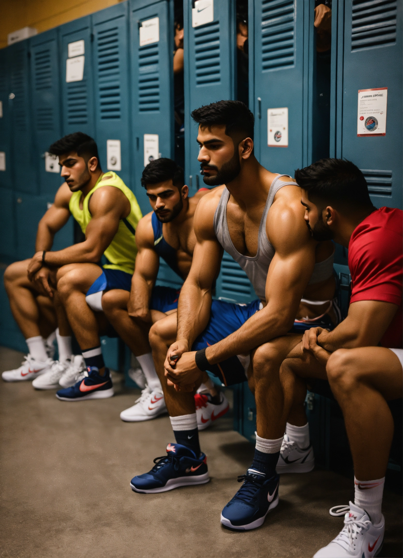 Group of skinny indian handsome boxer wrestlers young cuddling bromance guys tanned sweaty sporty hunks studs in sporty sock and in a locker room lockers with big bulges sniffing sneakers into feet twitter touching cute wearing nike jordans smelling