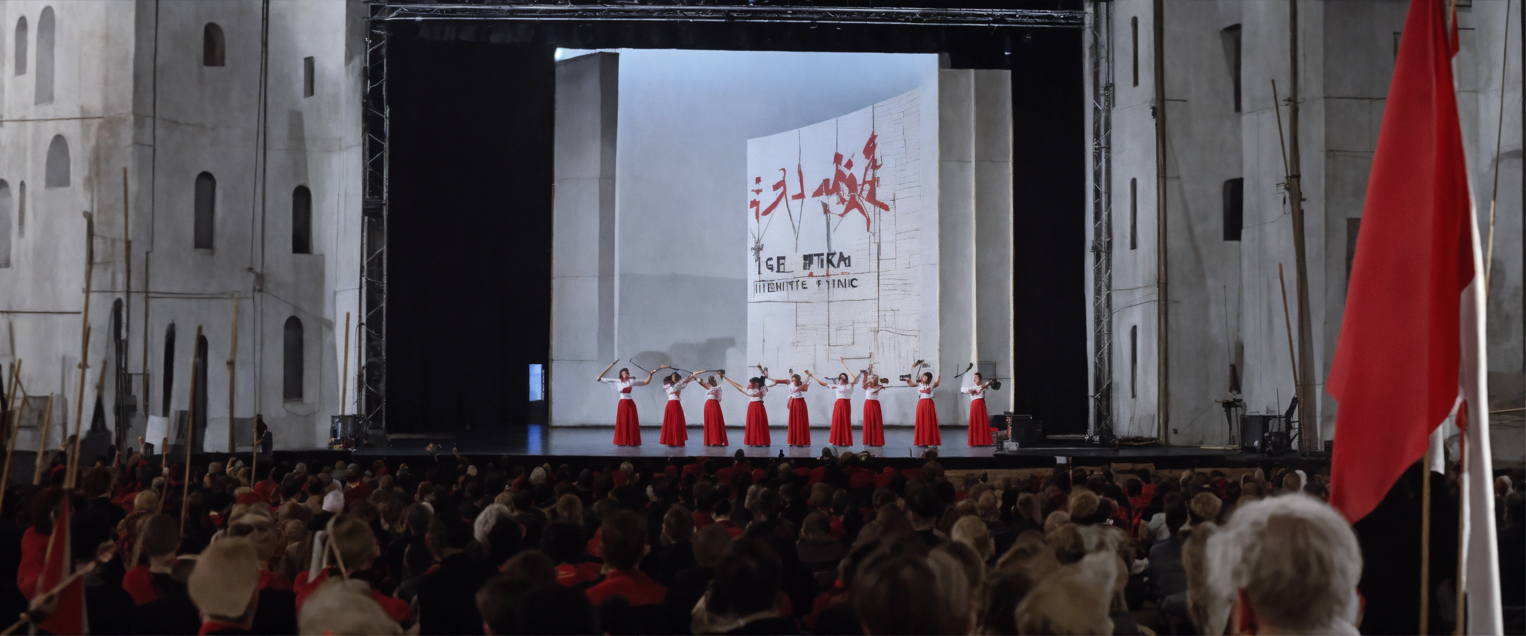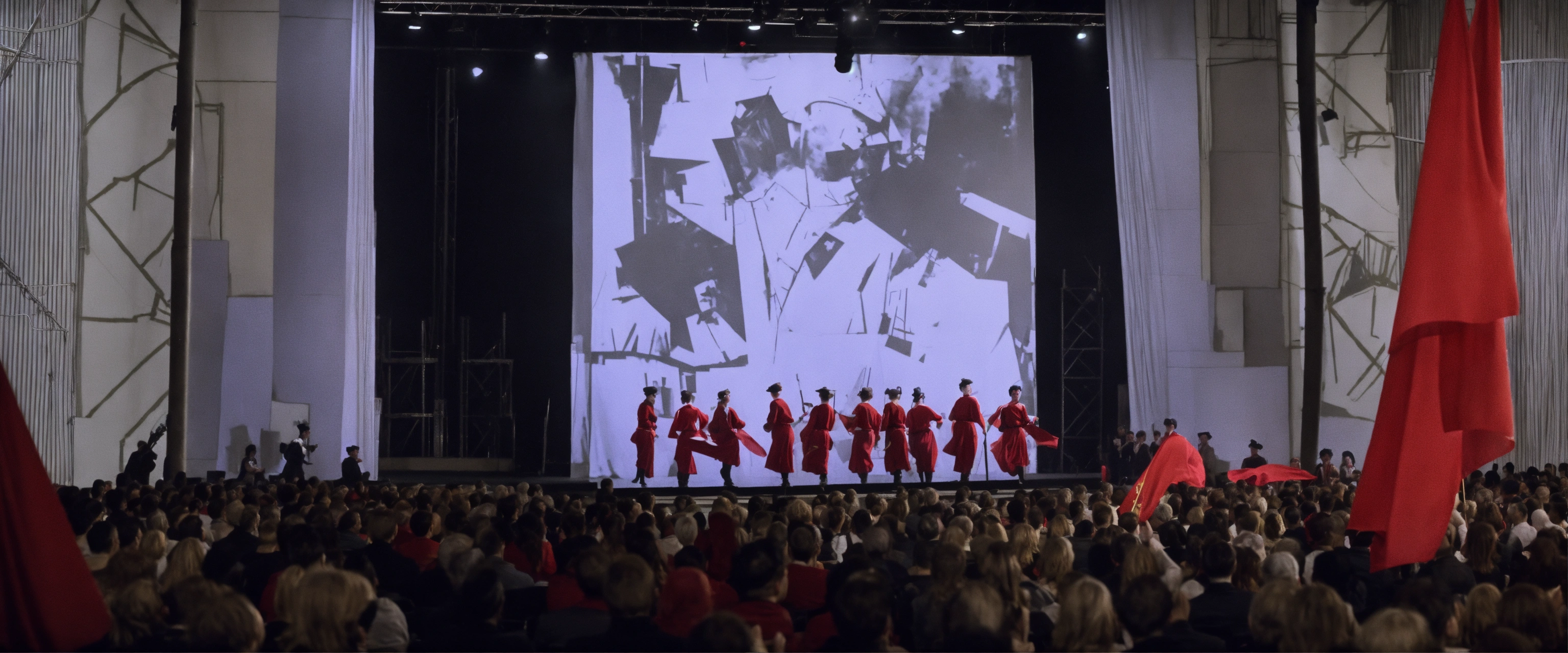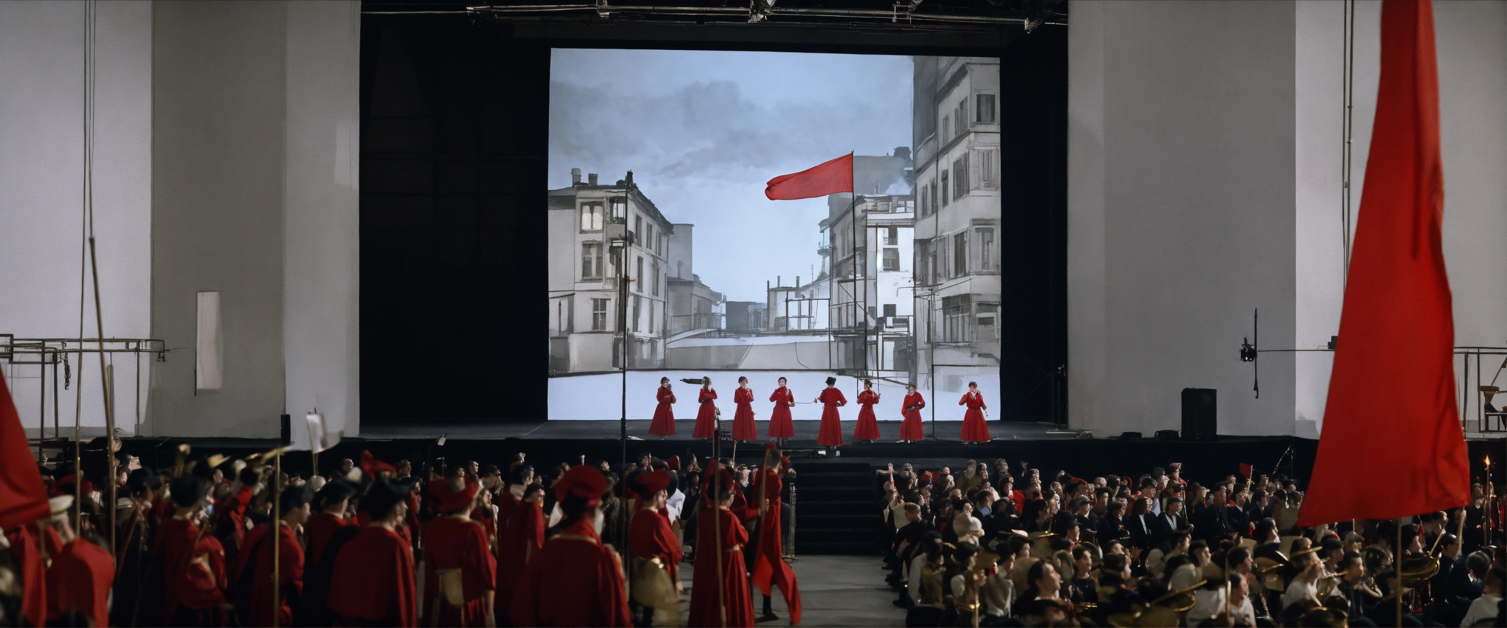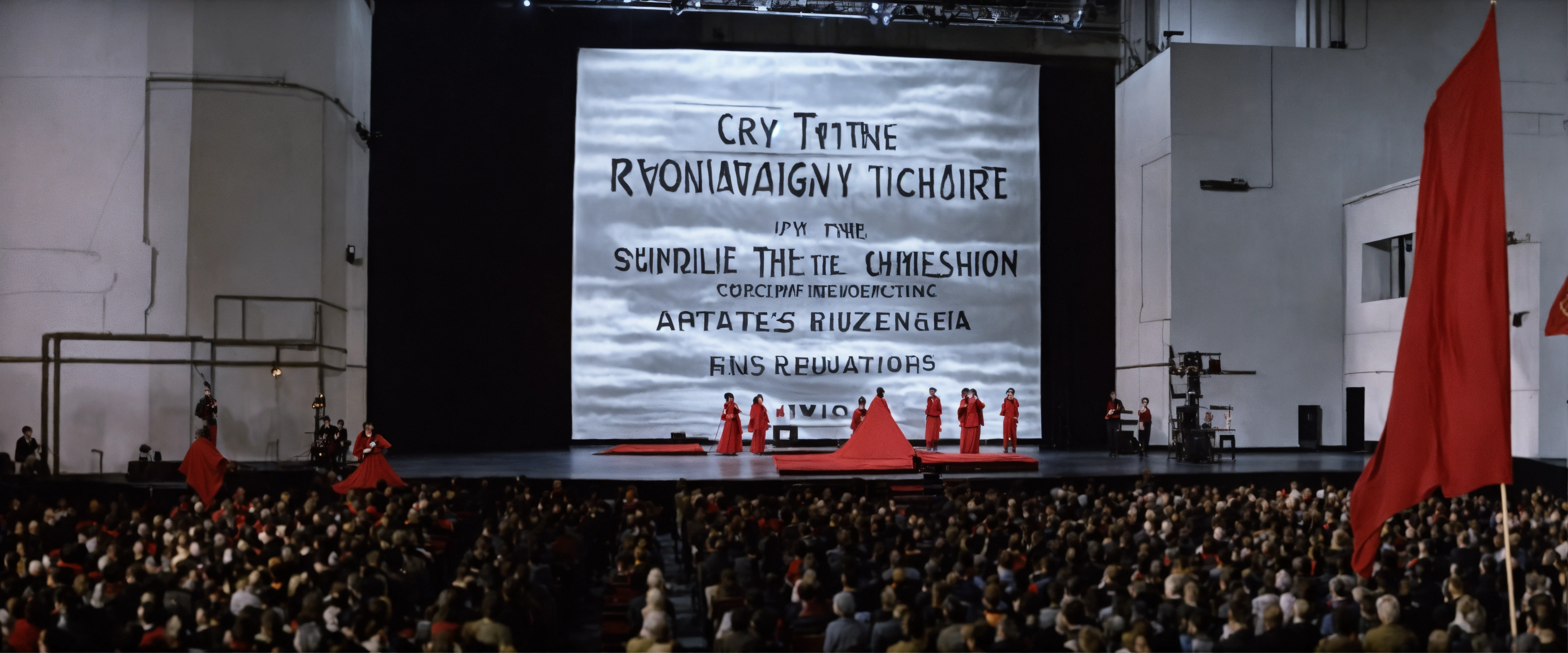 Style- suprematism - meyerhold, tyrov - pantomime improvisation frans mazarel "idea" - super hd quality 8k 20th century russian of the 20th century scenography black and white . in the background - factory buildings with tall chimneys. an ascetic scene with tatlin's tower in the center of the scene a very large red flag carrier emerges from behind the white t-shirted ensemble. large sheets of paper on which the words "ignite the revolution!" are visible in the thoughts of the flag bearer, facing the audience., "ignite the revolution!" actors in half-black clothes and - a revolutionary idea dressed in red clothes act on the stage. at this time, the ensemble band's voice switches to the international caller's theme in battle. in the room, shoulder to shoulder, the cry of the ensemble "working people wake up to fight!" is heard in rhythmic movement.