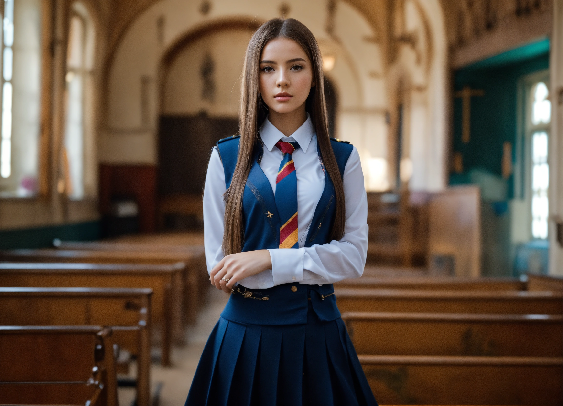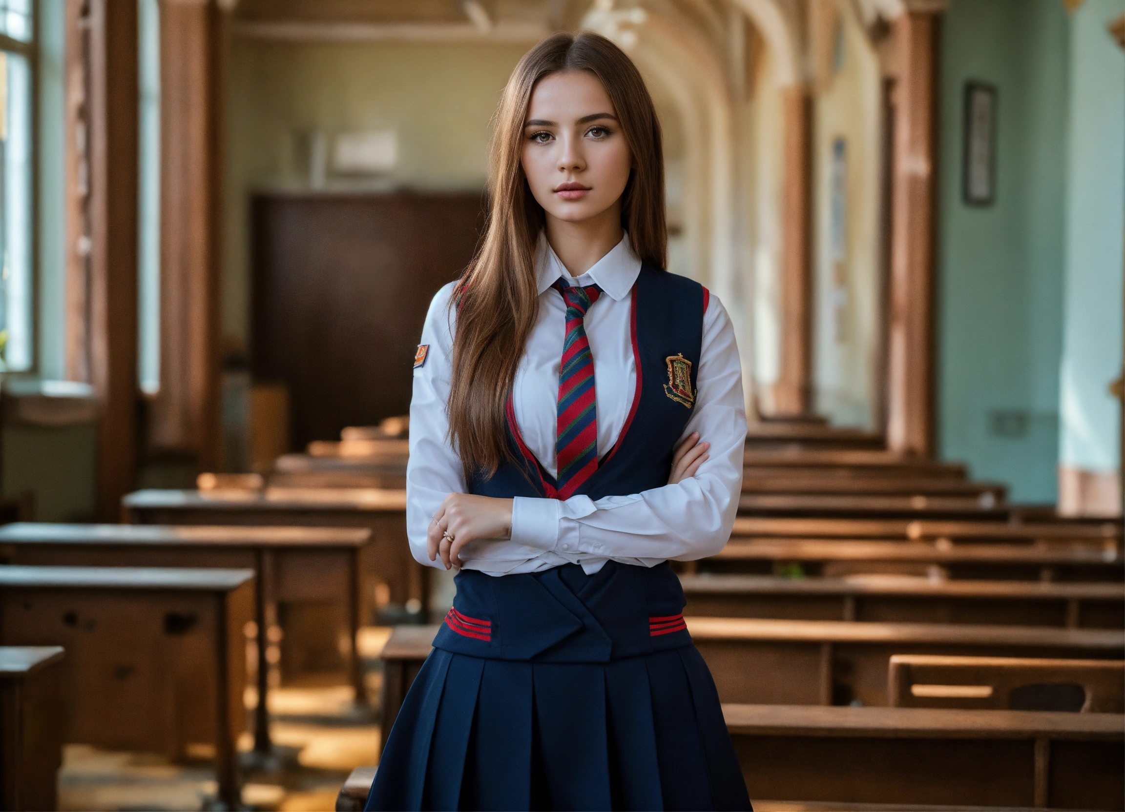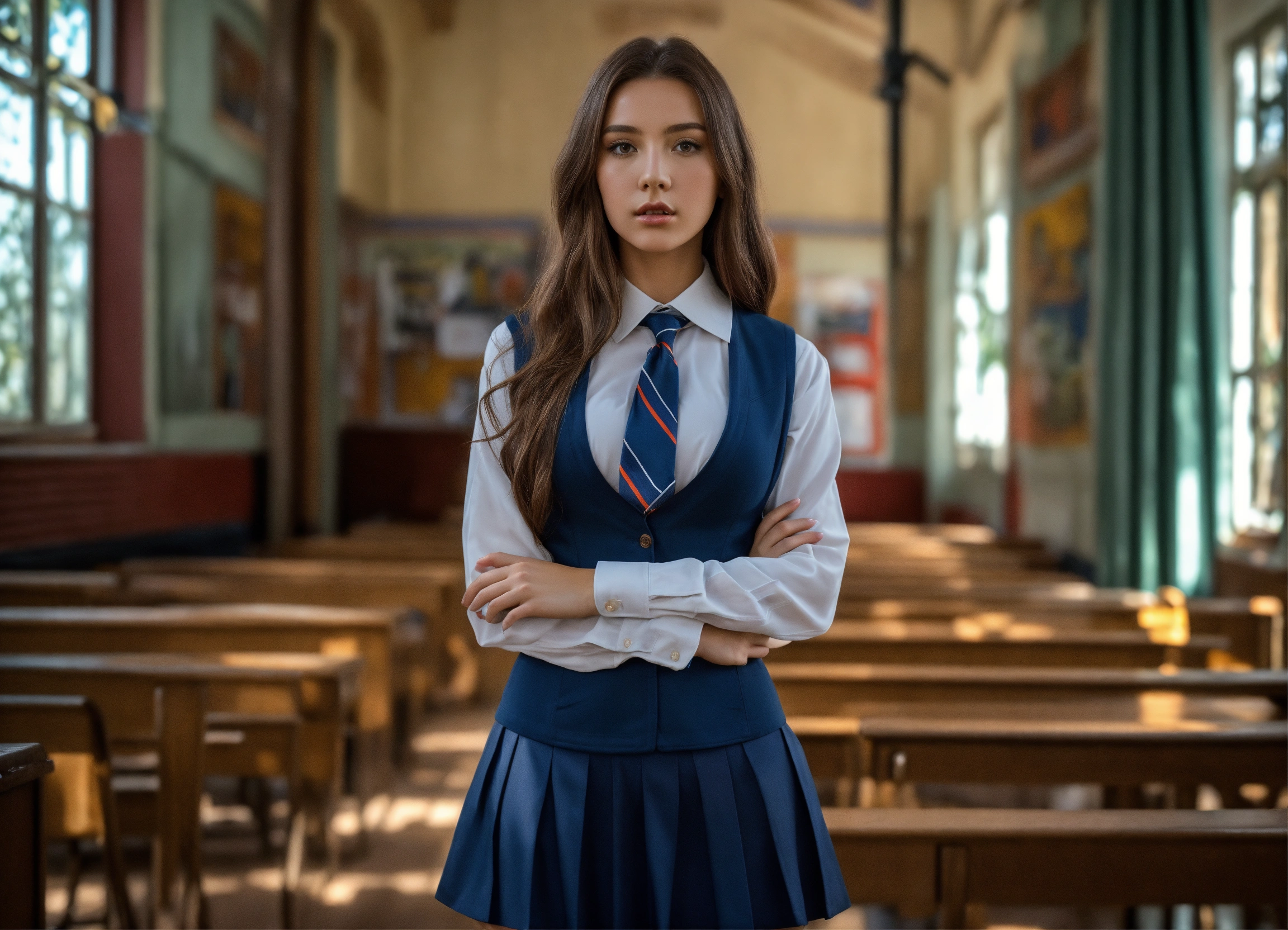 Hot adult woman, spanish girl, spain, schoolgirls in uniform, private school uniform, jacket, tight shirt, skirt, tights, feminine, school scenes, aura of beauty, relaxation, released tie, wide bust, belarussian girl, in belarus, sharp focus, 8k high definition, clothes too small and thin, undersized shirt and prominent body, shot on medium format filmschool], cinematic, 8k, masterpiece, studio photography, xf iq 4, 1 5 0 mp, 5 0 mm, iso 2 0 0, 1 / 1 6 0 s, realistic, natural light, octane render, adobe lightroom, rule of thirds, symmetrical balance, depth layering, polarizing filter, sense of depth, ai enhanced
