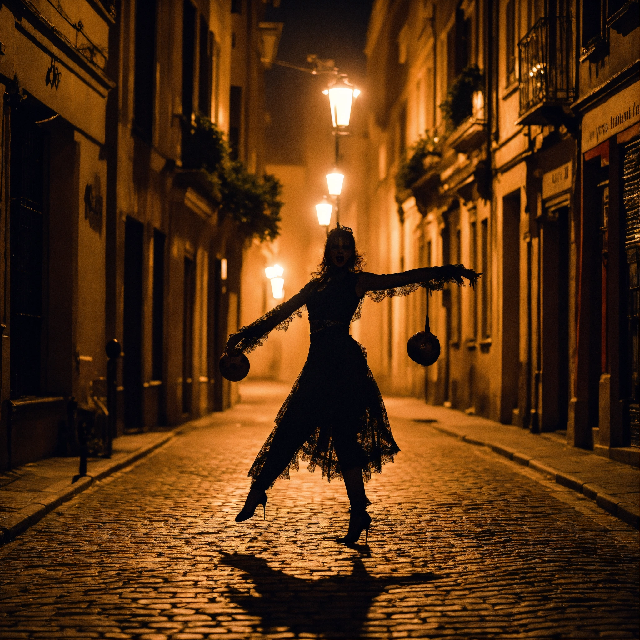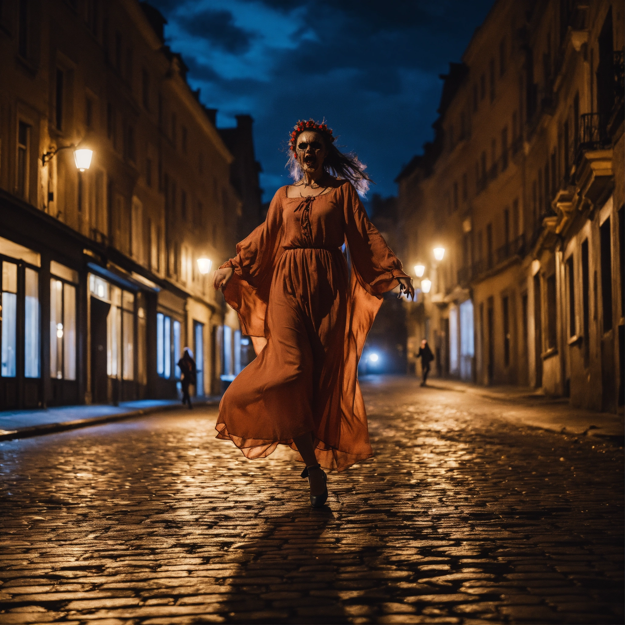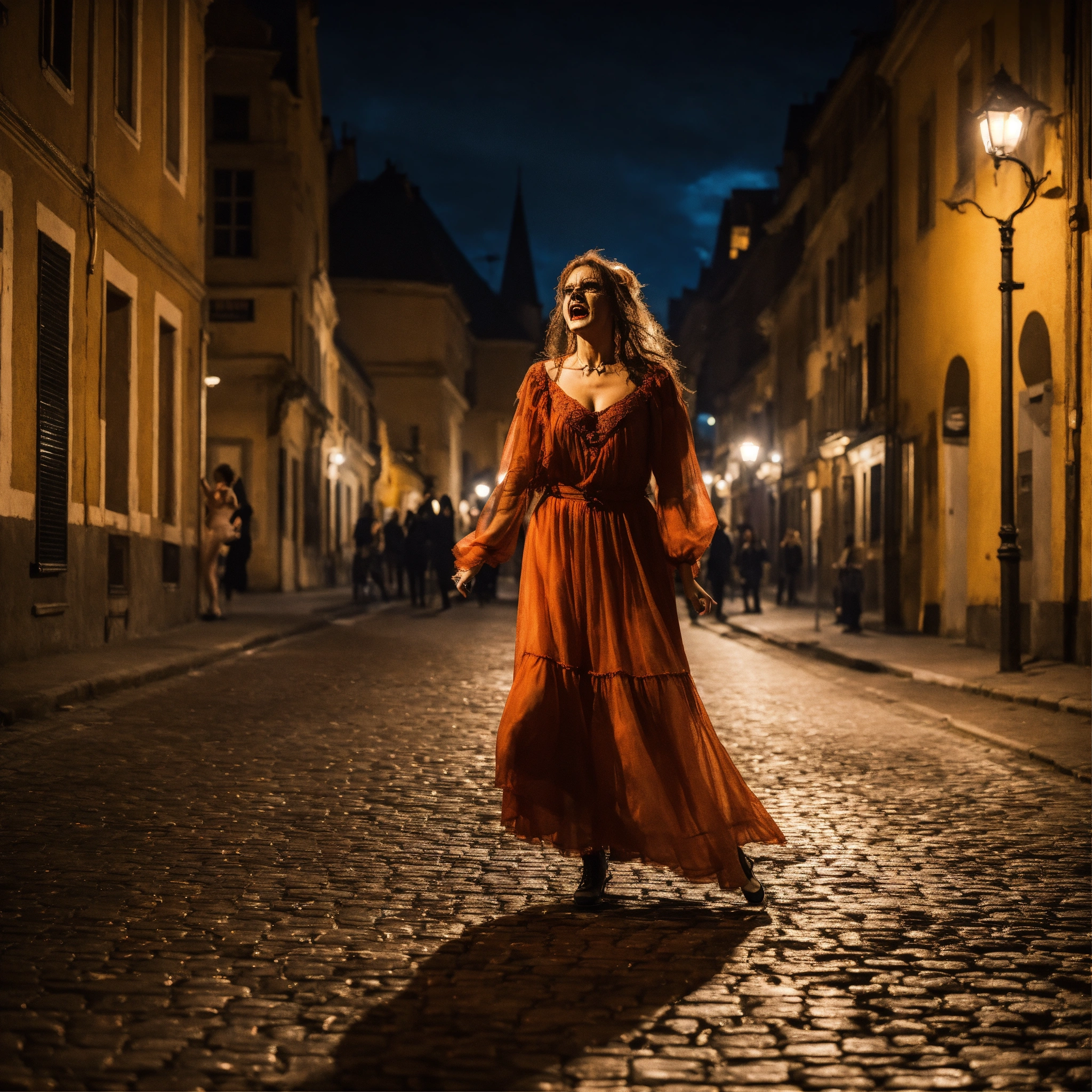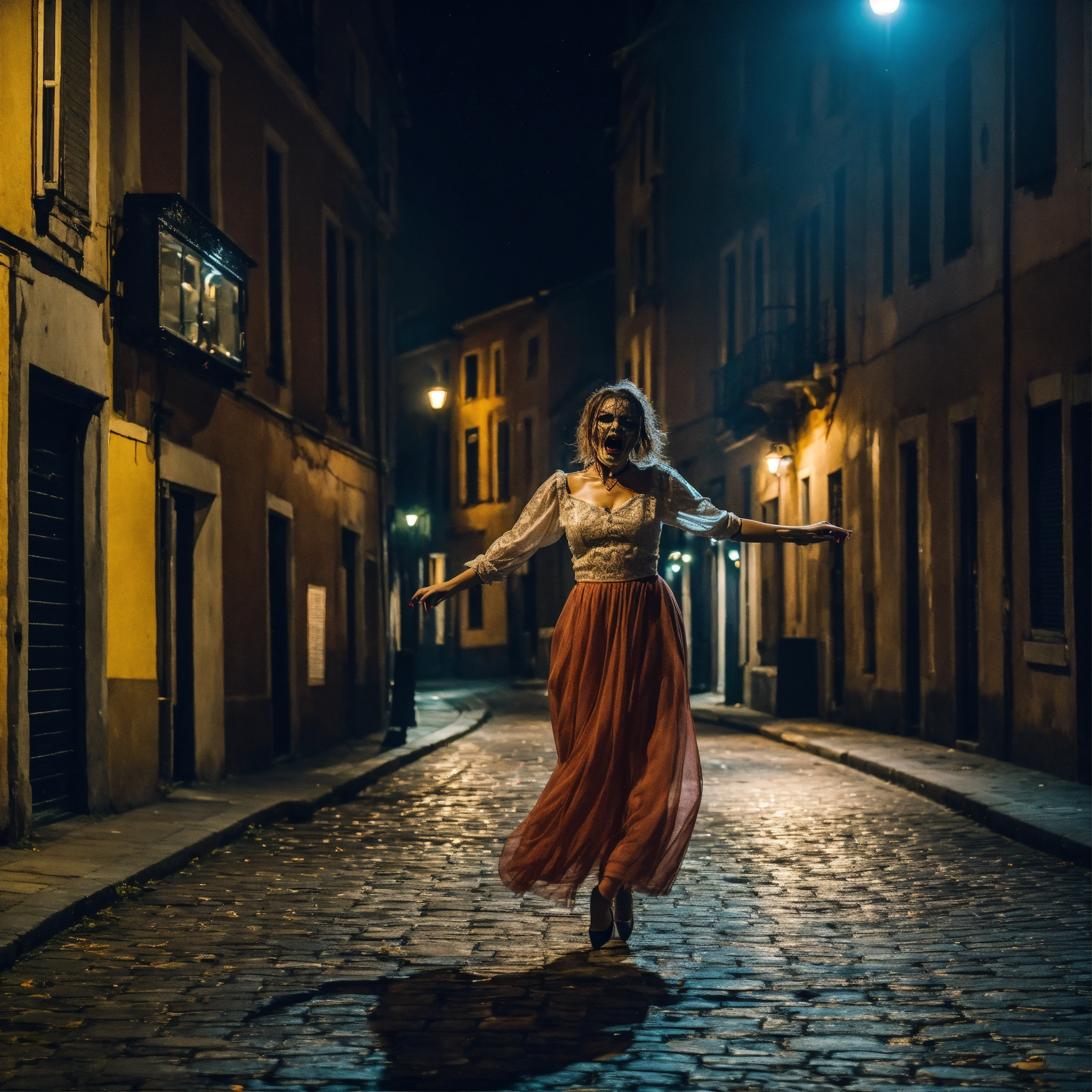 A scary-looking woman dances in the streets of europe in a terrifying and eerie manner at night