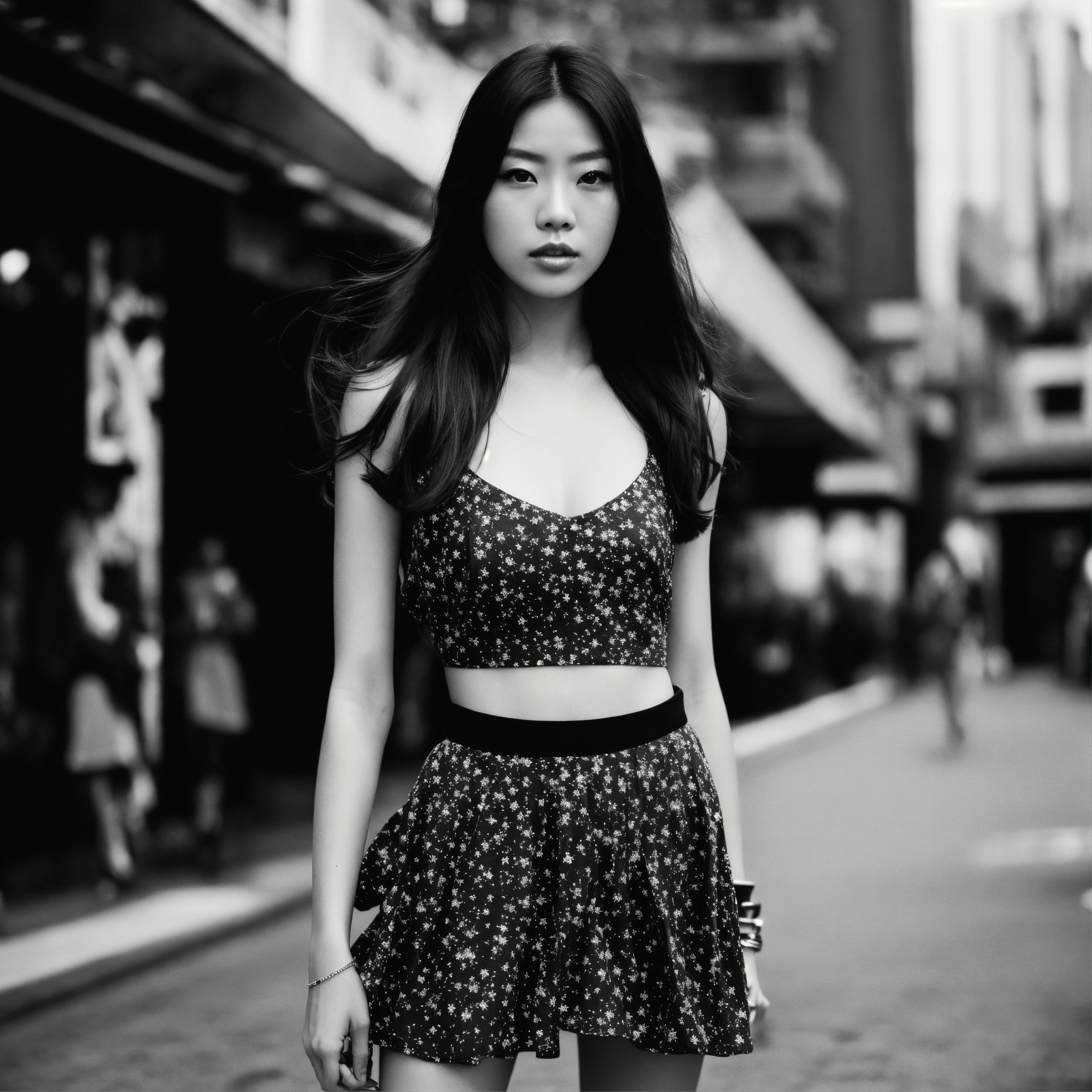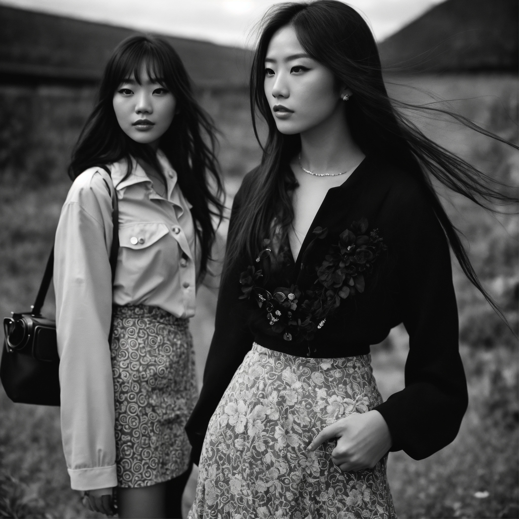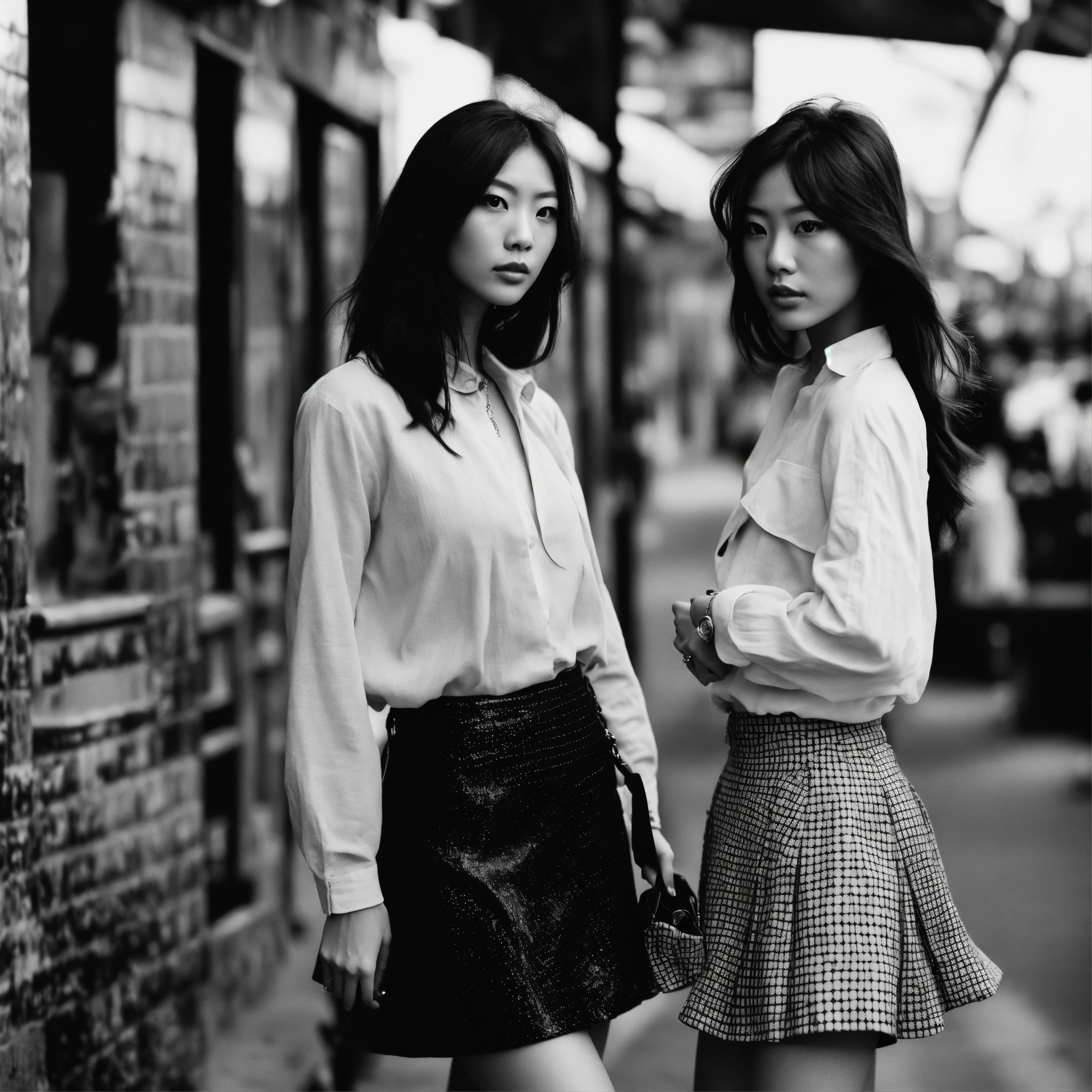 Extremely detailed photographic image, grained image, beautifully composed, monochrome image, 00's fashionable image, fashionable magazine photography, leica summicron 35mm f2.0, kodak 400tx, fashion photography, fashionable model, two beautiful japanese girls wearing a mini skirt, with long hair blowing in the wind, both staring into the camera, with specific posing, with no intimacy to each others