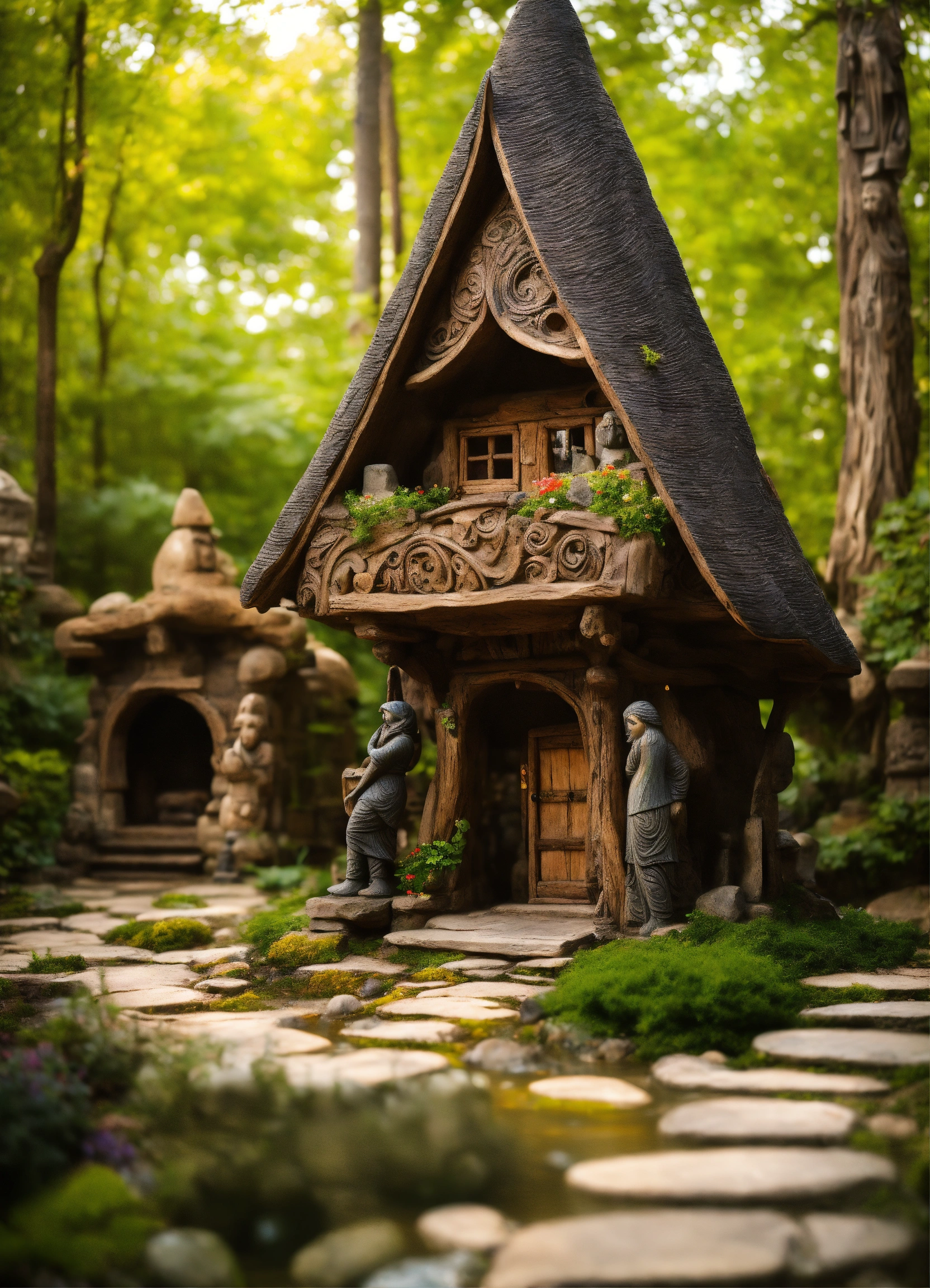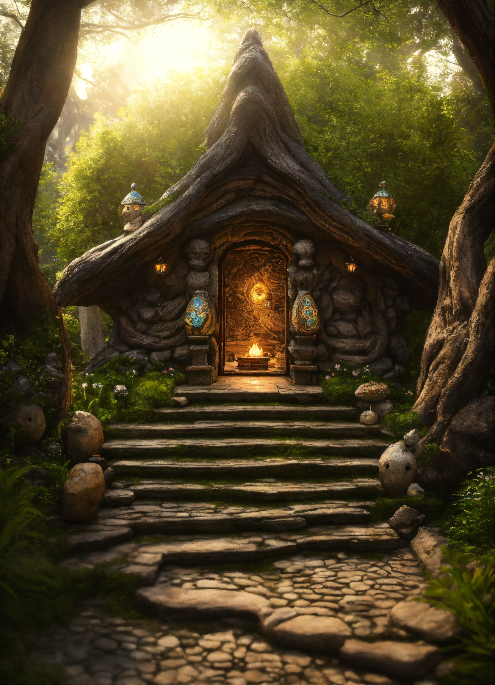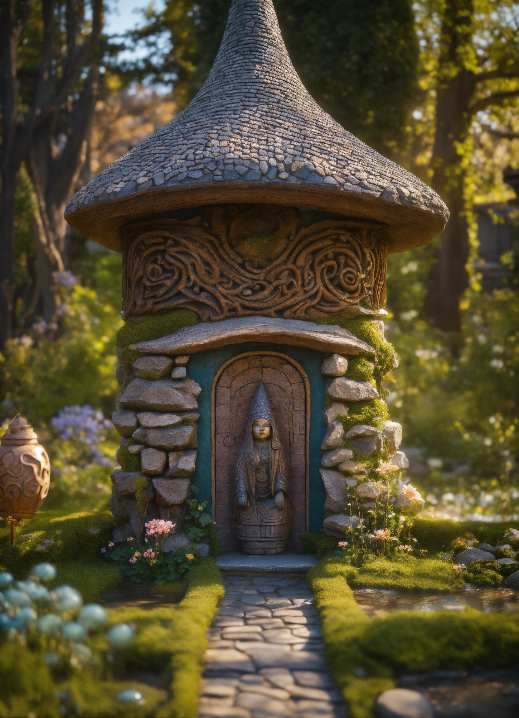 An ancient spiritual stone hooded female gnome, ancient cabin . style of alex grey, giger.unreal engine.totem sculptures.swirling patterned stone pathway courtyard.wood.stone.driftwood.statues. artistic sculpture.air bnb house/backyard.stone lanterns.pond