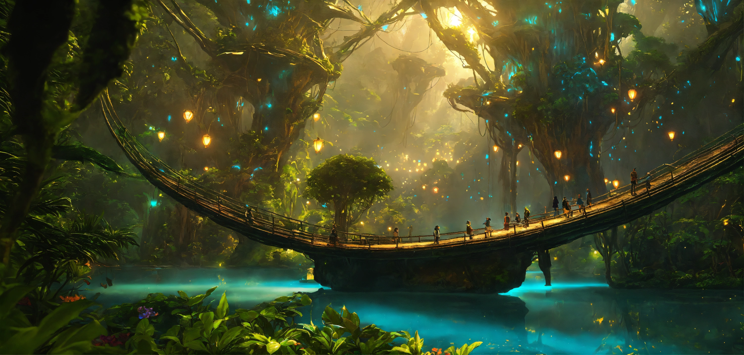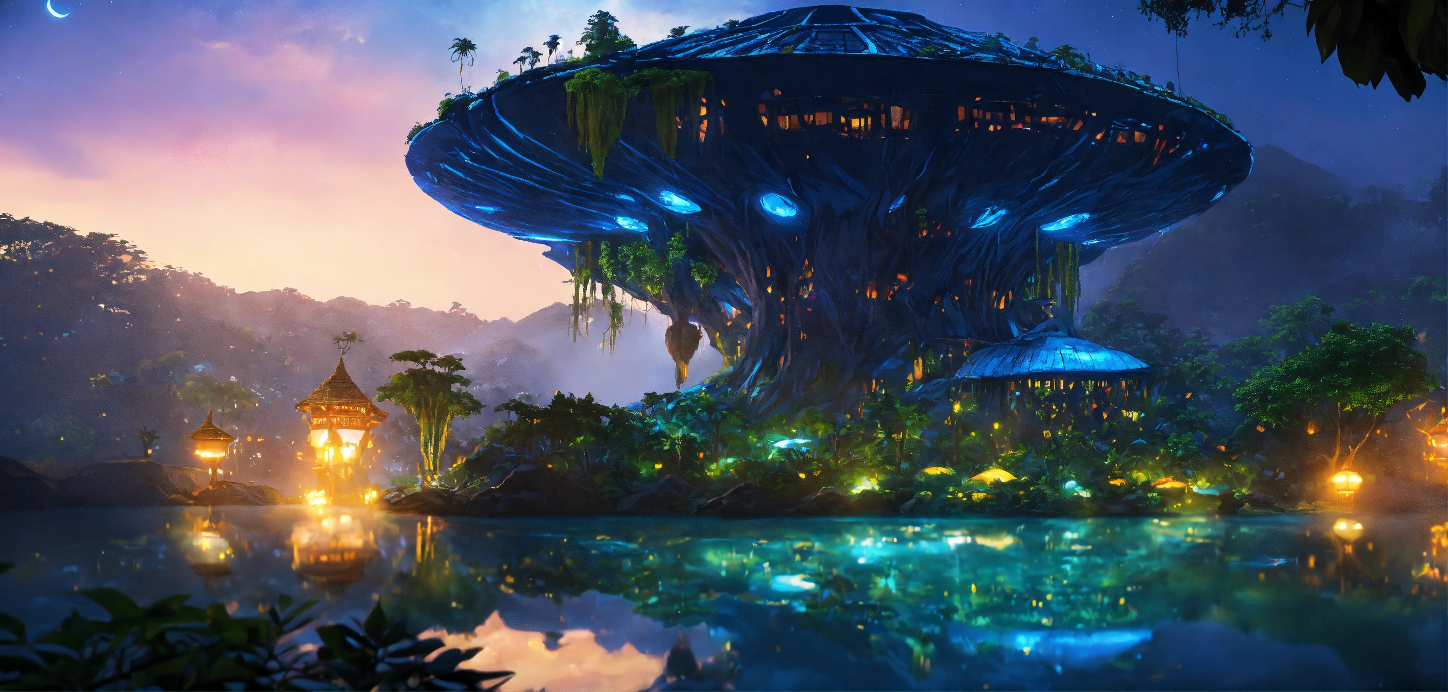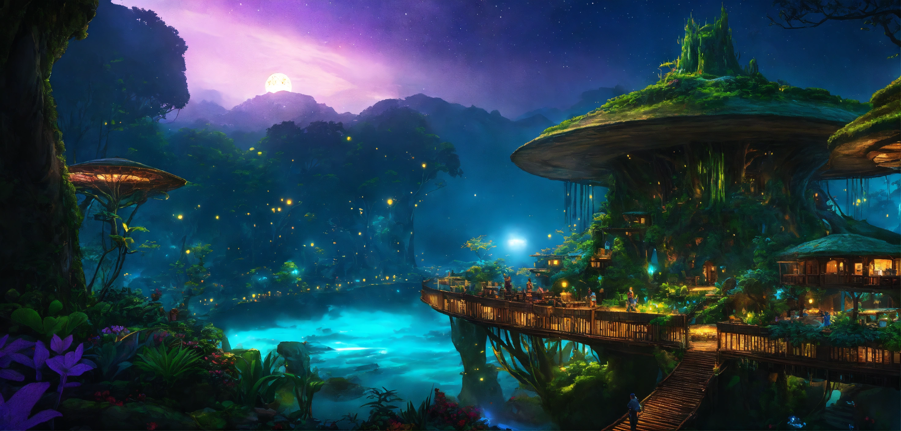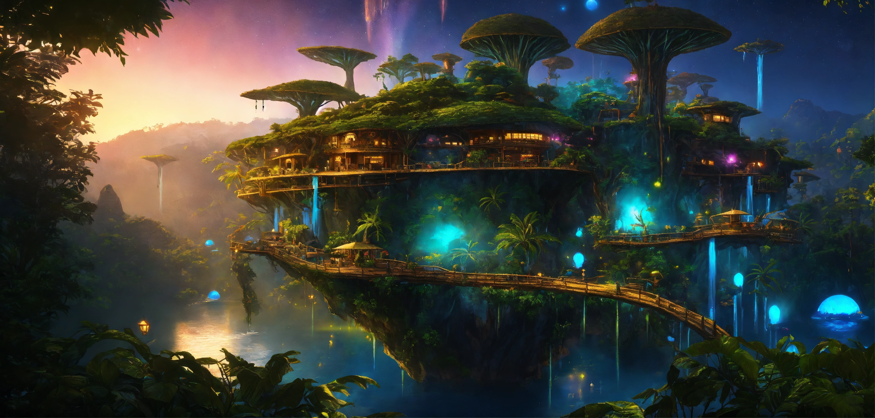 Planet pandora, avatar movie, na'vi planet, alien rainforest, glowing plants, beautiful landscape, detailed huge treehouse sprawling village, night, glow in the dark, jungle, beautiful intricate treehouse city, small beautiful lanterns, cinematic, alien planet, starry sky, hyper realistic, realistic, tribal, carved and small painted designs wood treehouses, homes, restaurants, gathering places, river, blue plants, tropical alien flowers, stars in the sky, dark nighttime, avatar, planet pandora, glowing flowers, glow in the dark, night sky, small blue skinned humanoid aliens walking around, night starry sky, glowing lien blue plants, glowing alien flowers and trees, tropical glowing flowers, blue plants, glowing water, northern lights