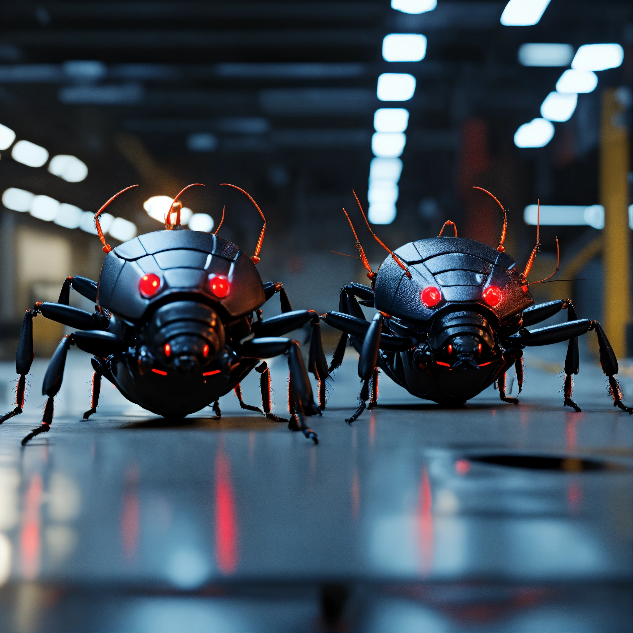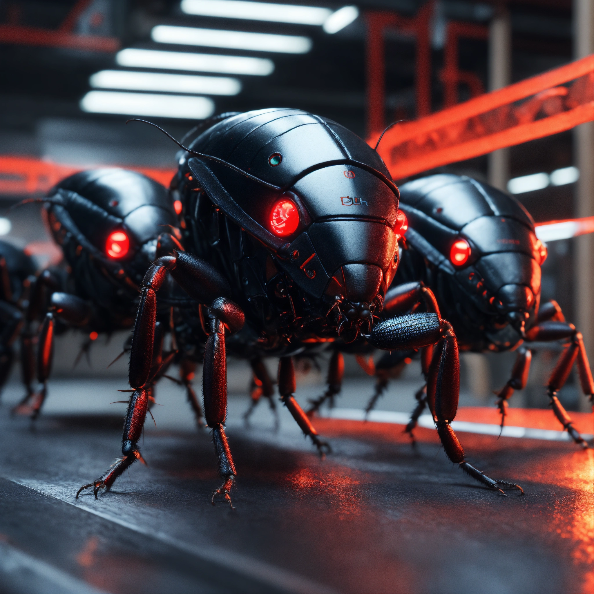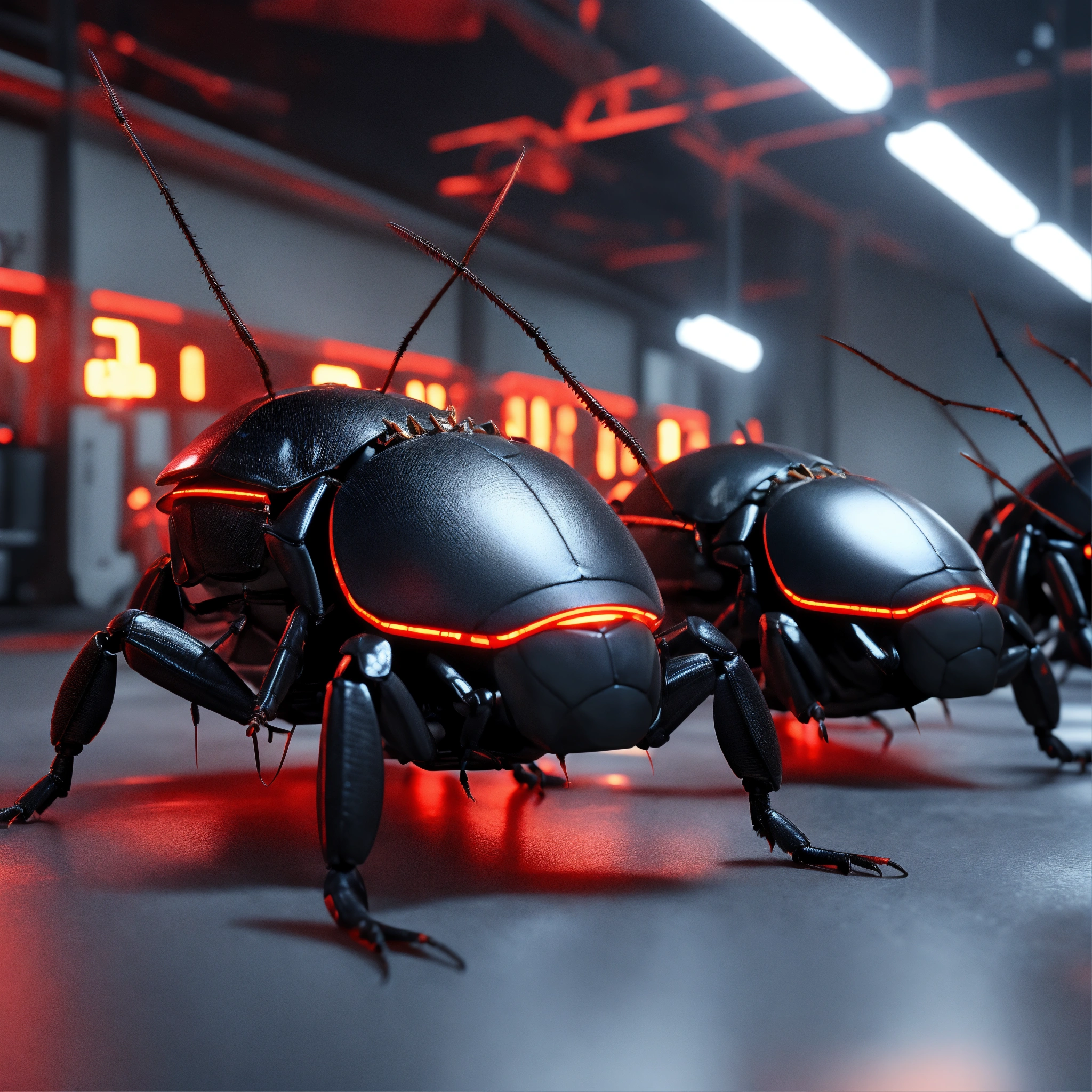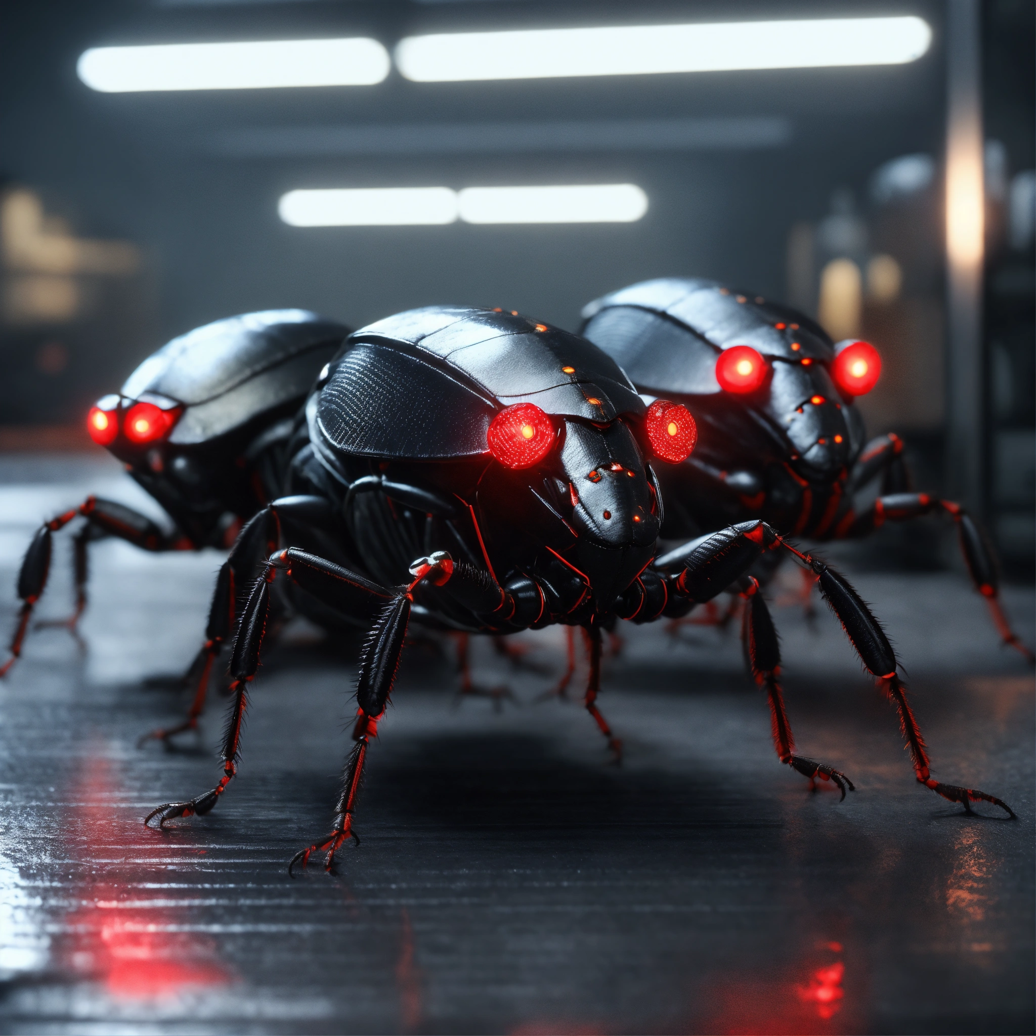 3 black cockroach faced humanoids with red glowing eyes and detailed circuit markings, in a hi tech factory, realistic, 8k, unreal engine, pixar
