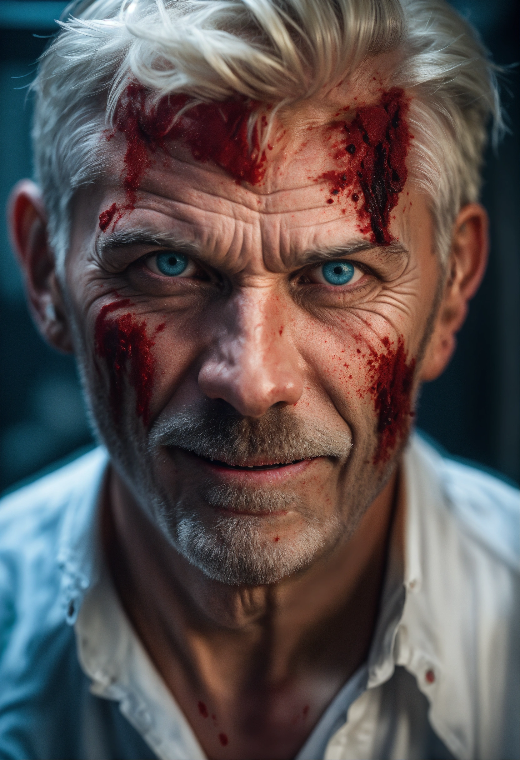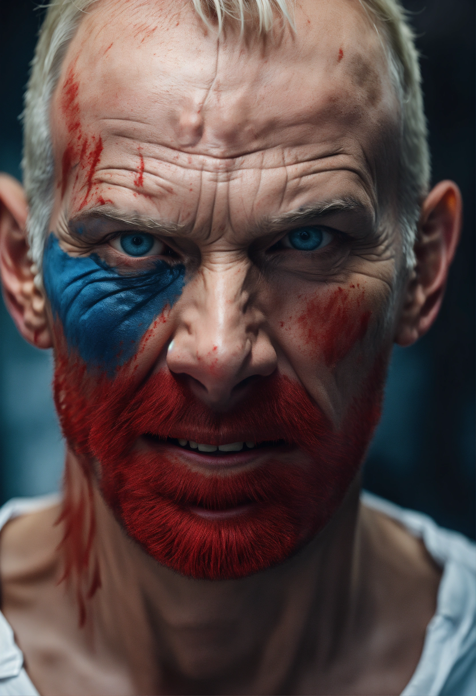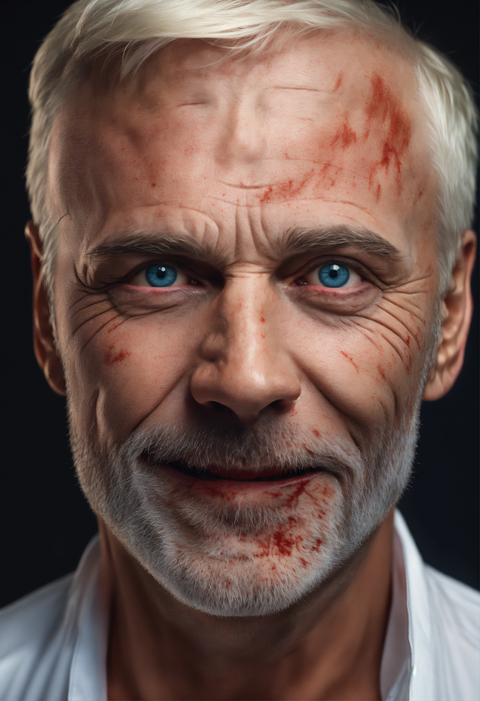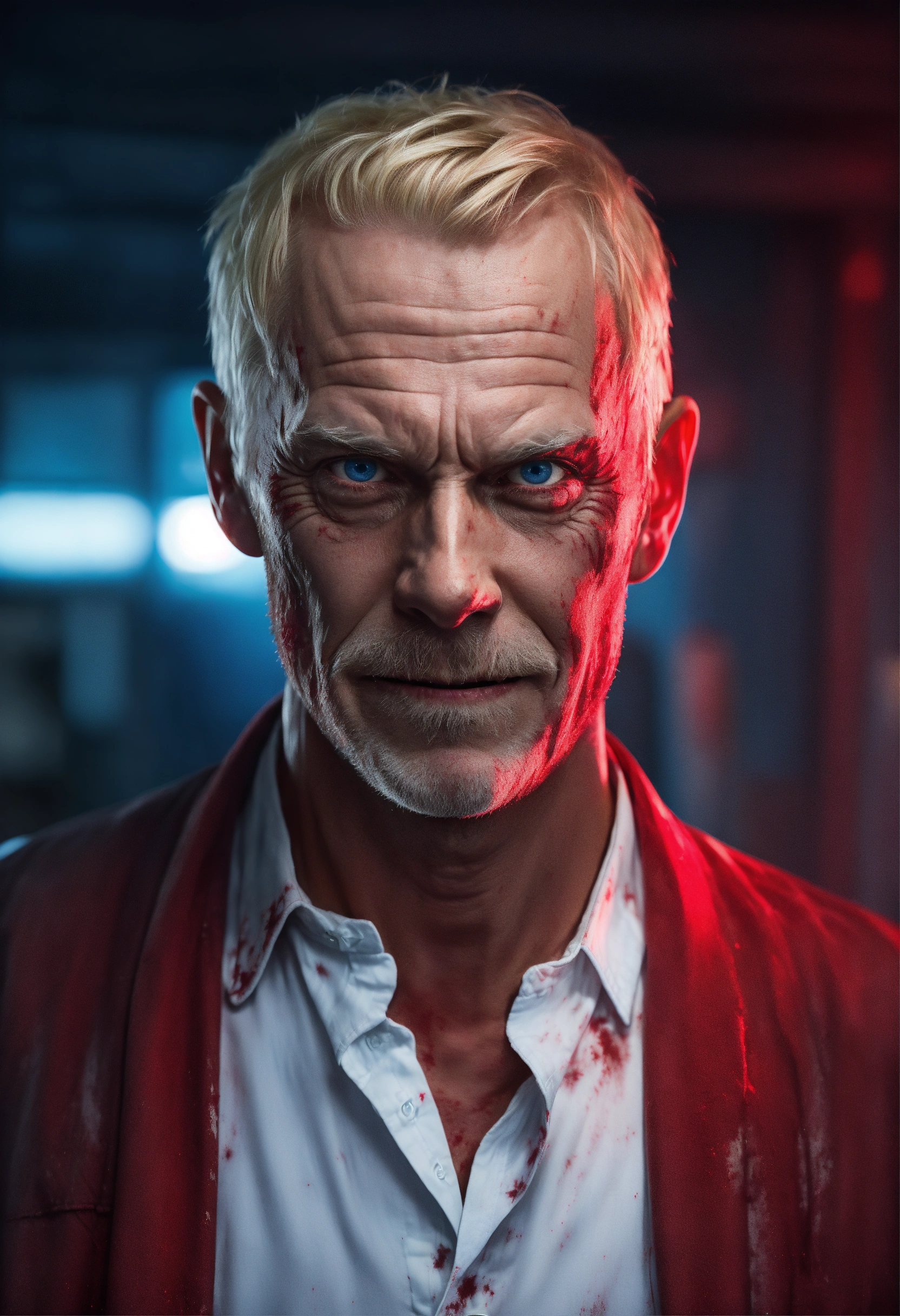 A realistic photo of scary 55 years old scary man with deep blue eyes, intimidating traits, creepy scary smiling face, sharp nose, white blonde well groomed very short hair, angry expression, wearing a wrinkled white shirt, with red dye over his face, hyperrealistic, hyperdetailed, 8 k