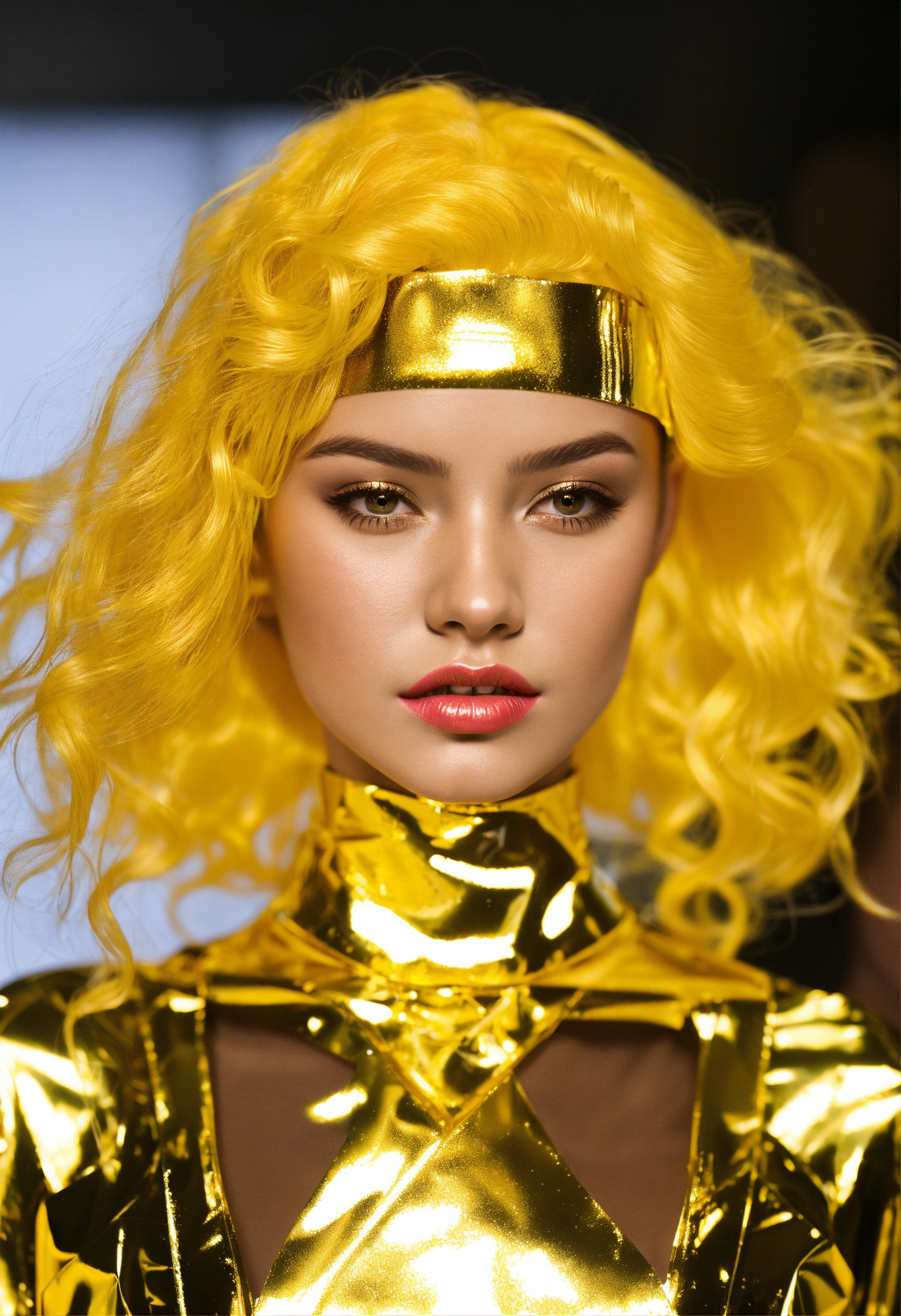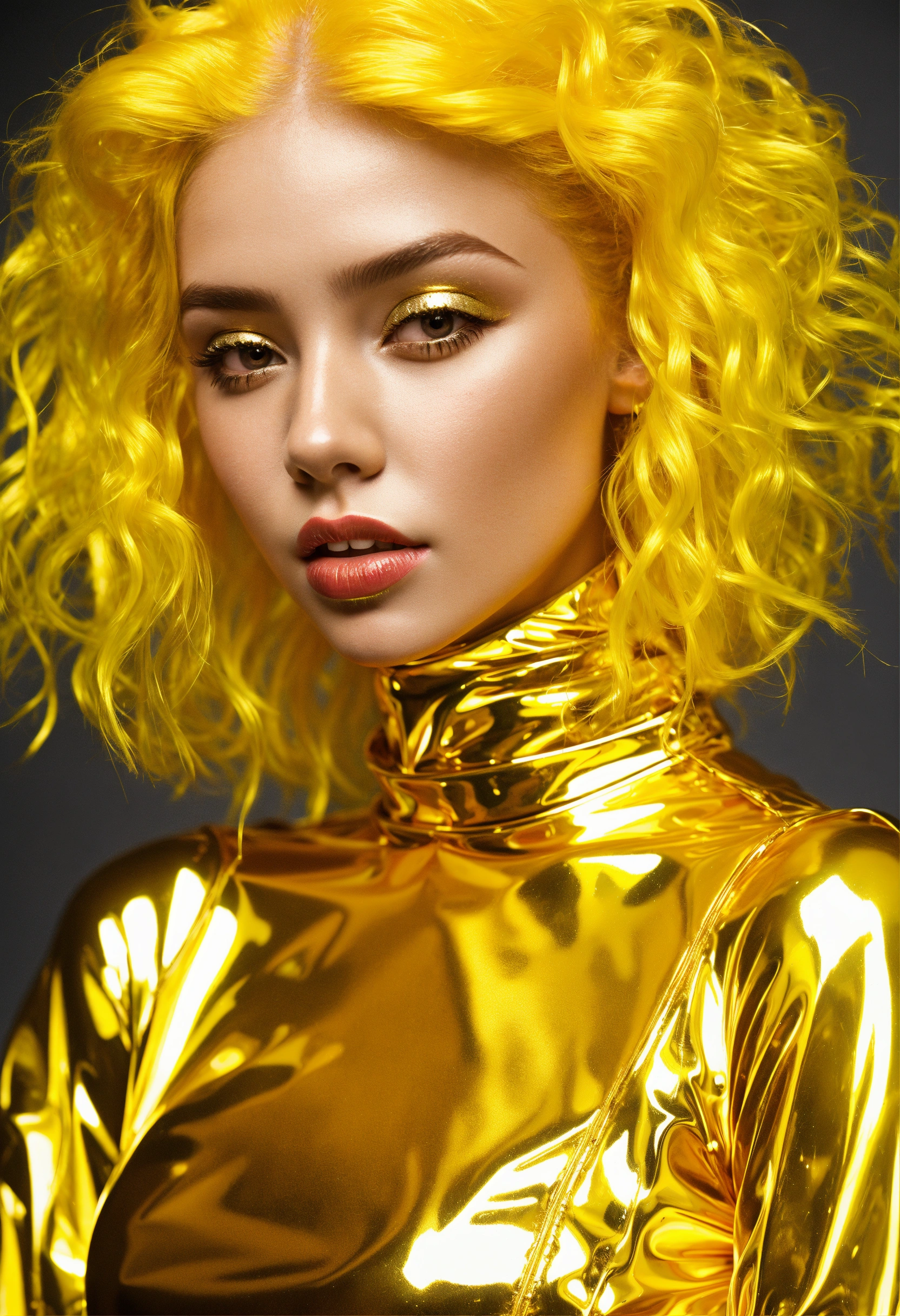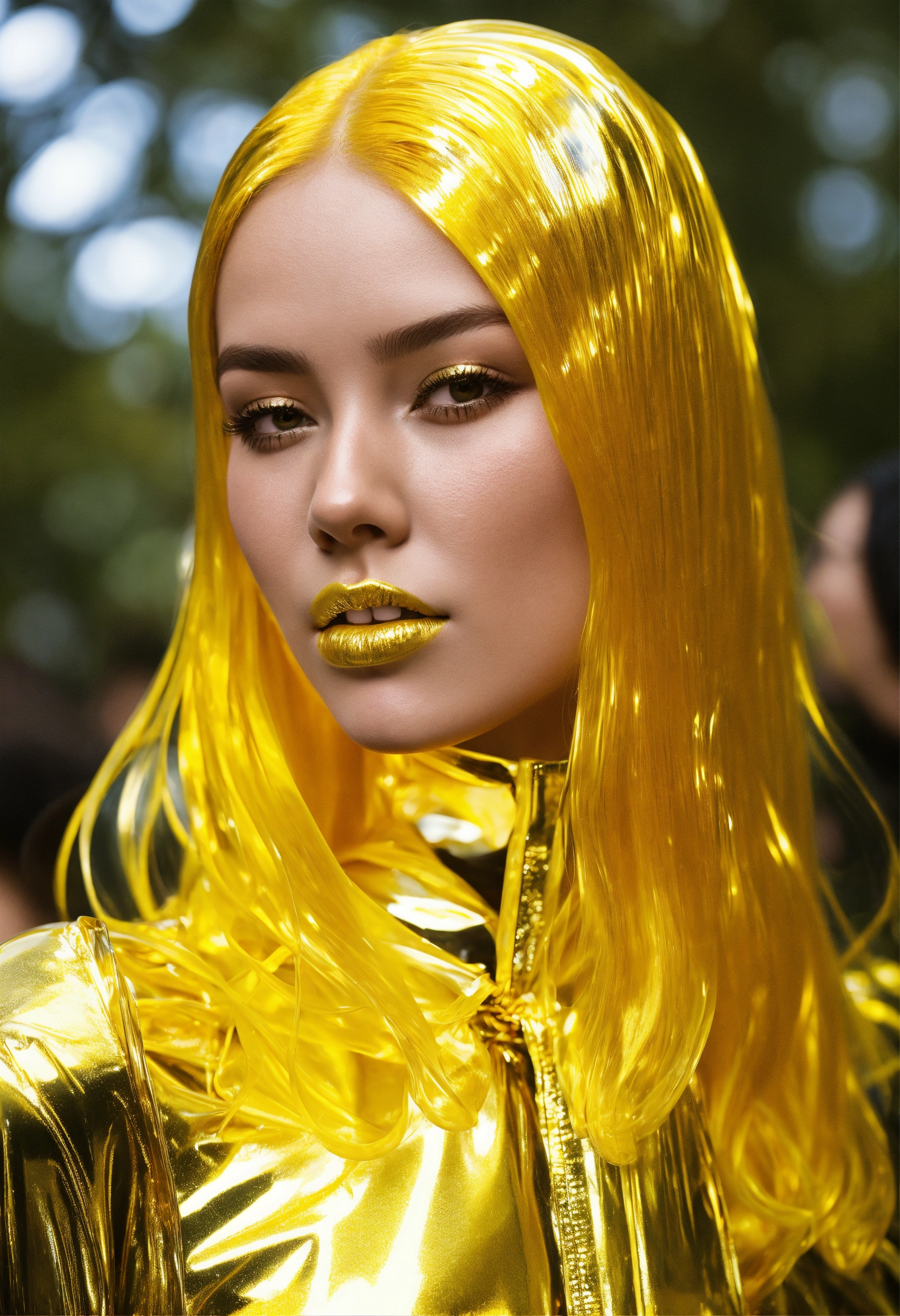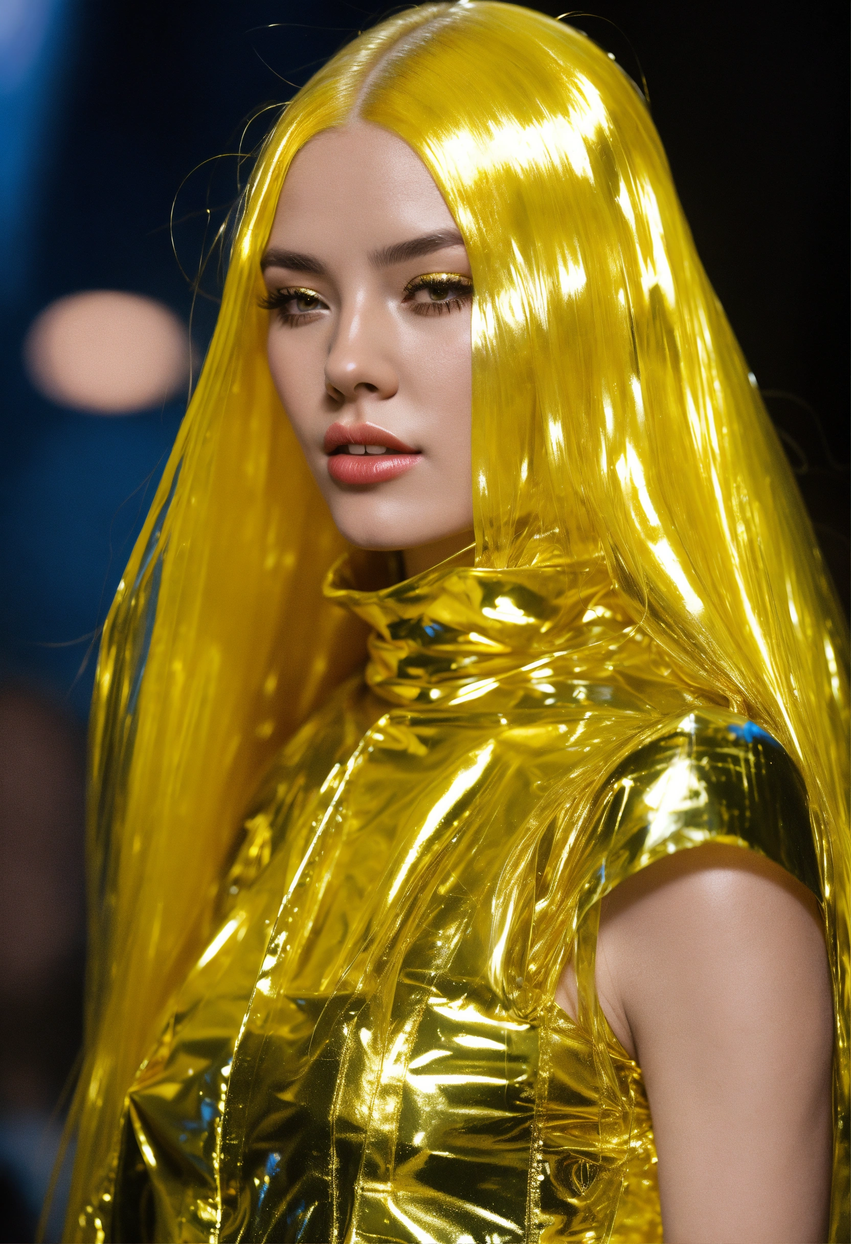 Clear bright shiny clear plastic outfit, bright shiny plastic hair, bright shiny plastic gold hair, bright shiny plastic gold lips