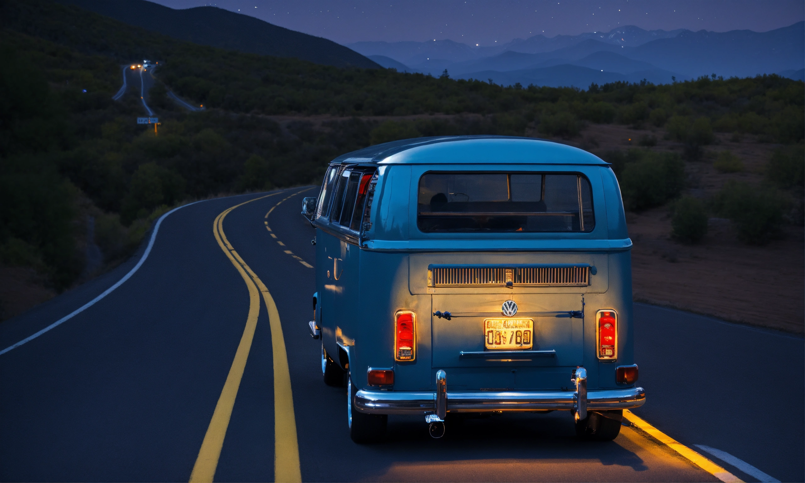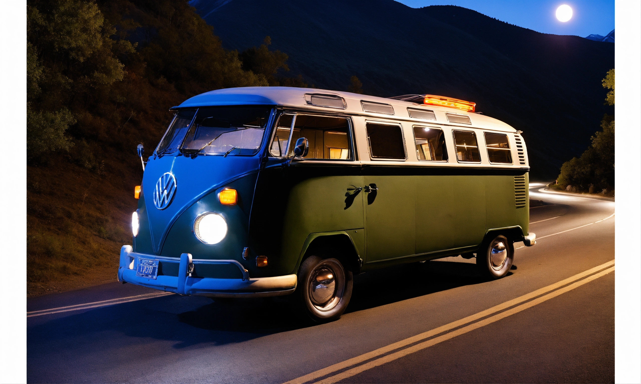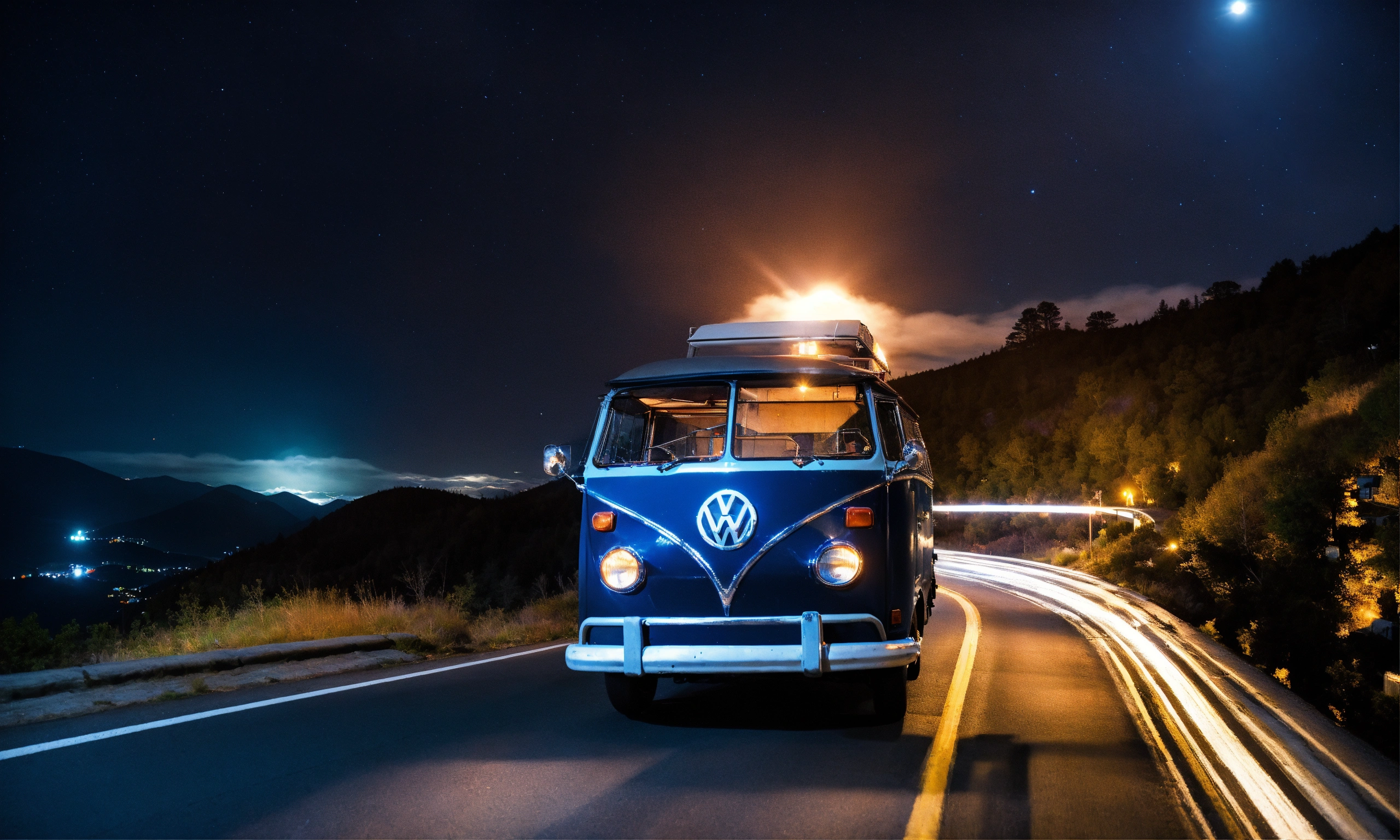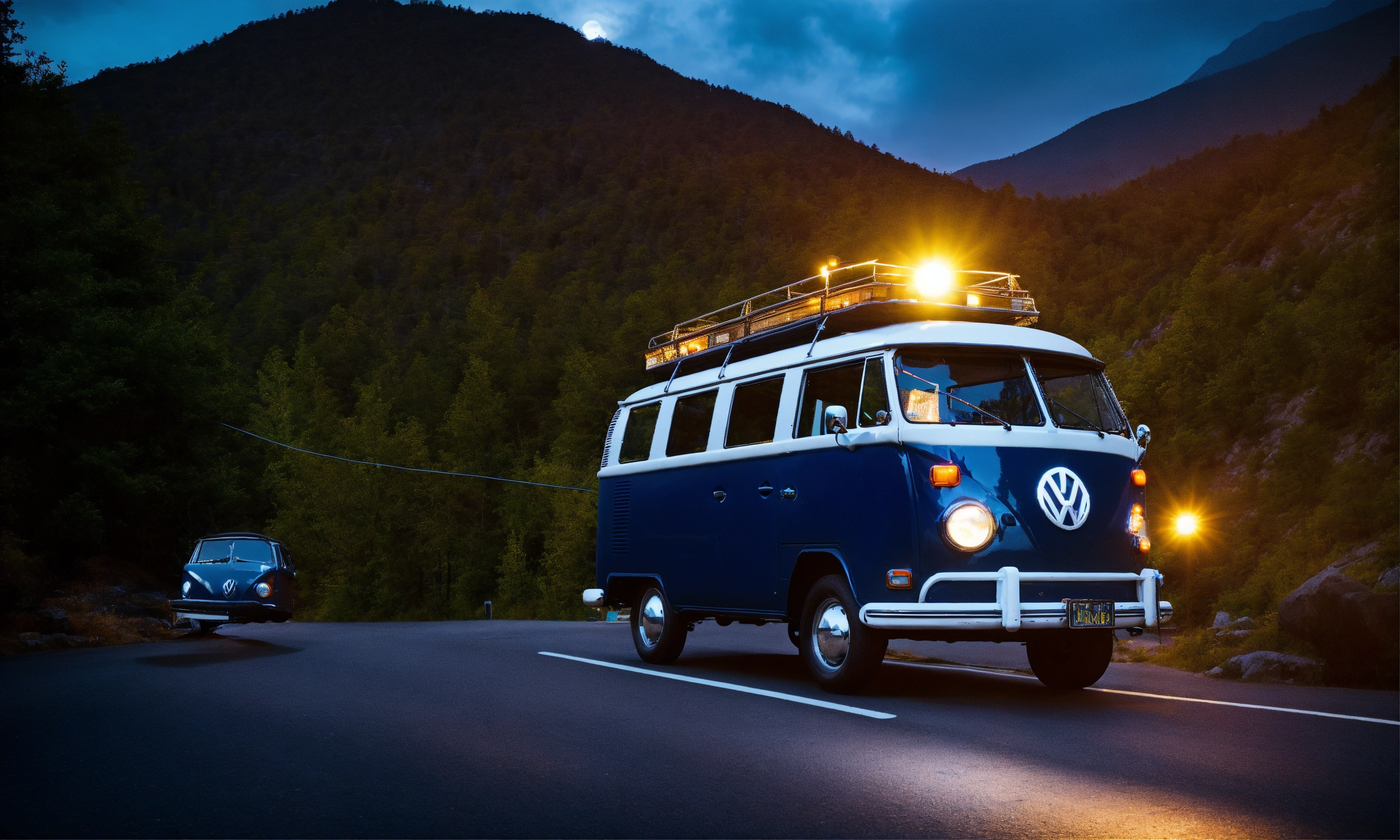 Navy blue 1965 vw bus on winding mountain road at night flashing high beams, driving on the right side of the road
