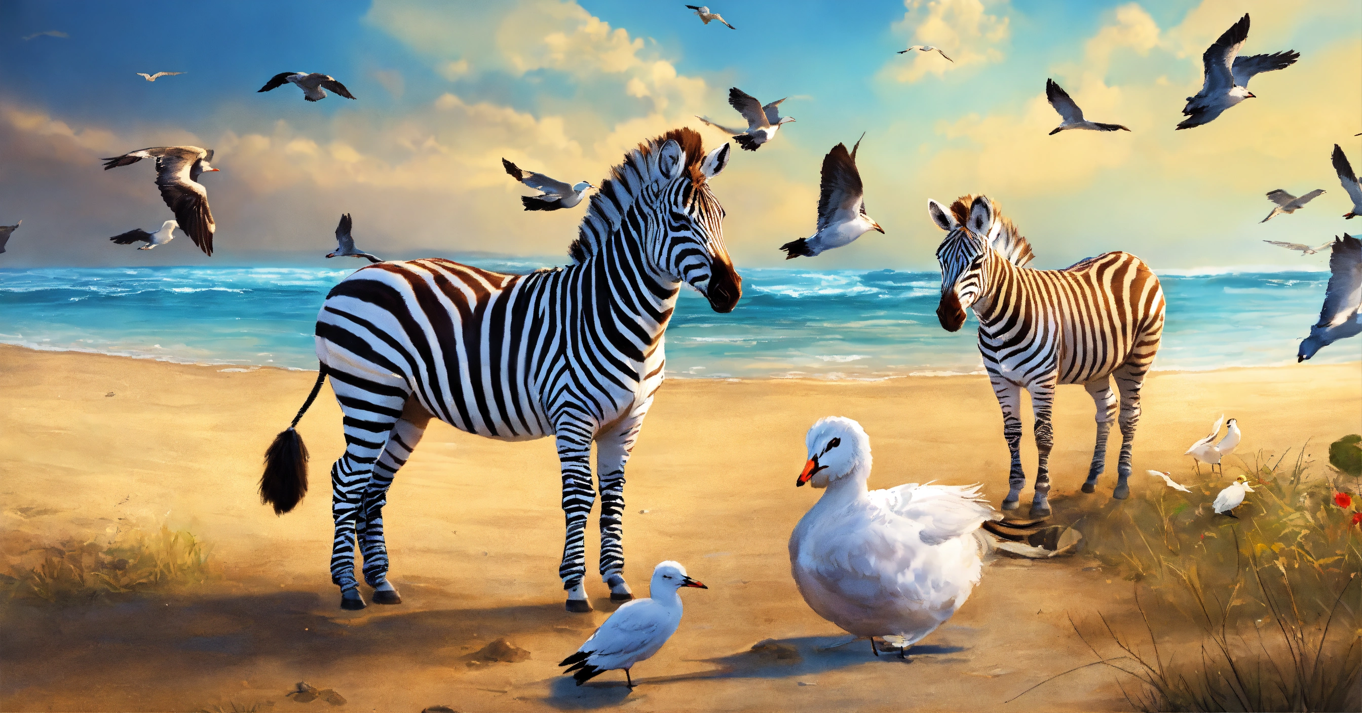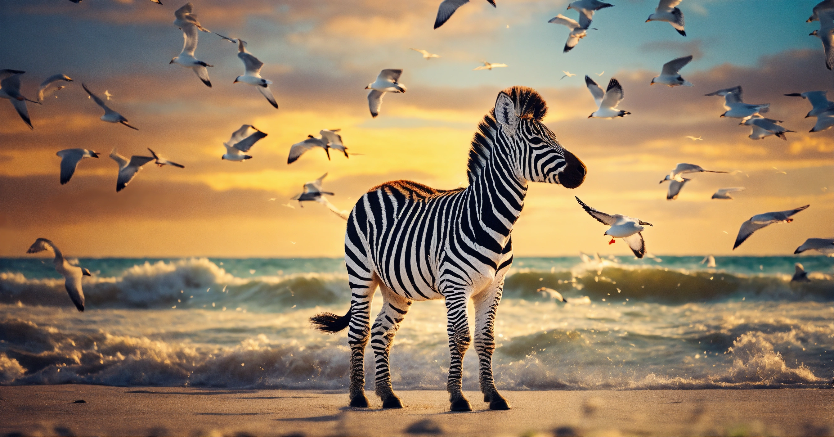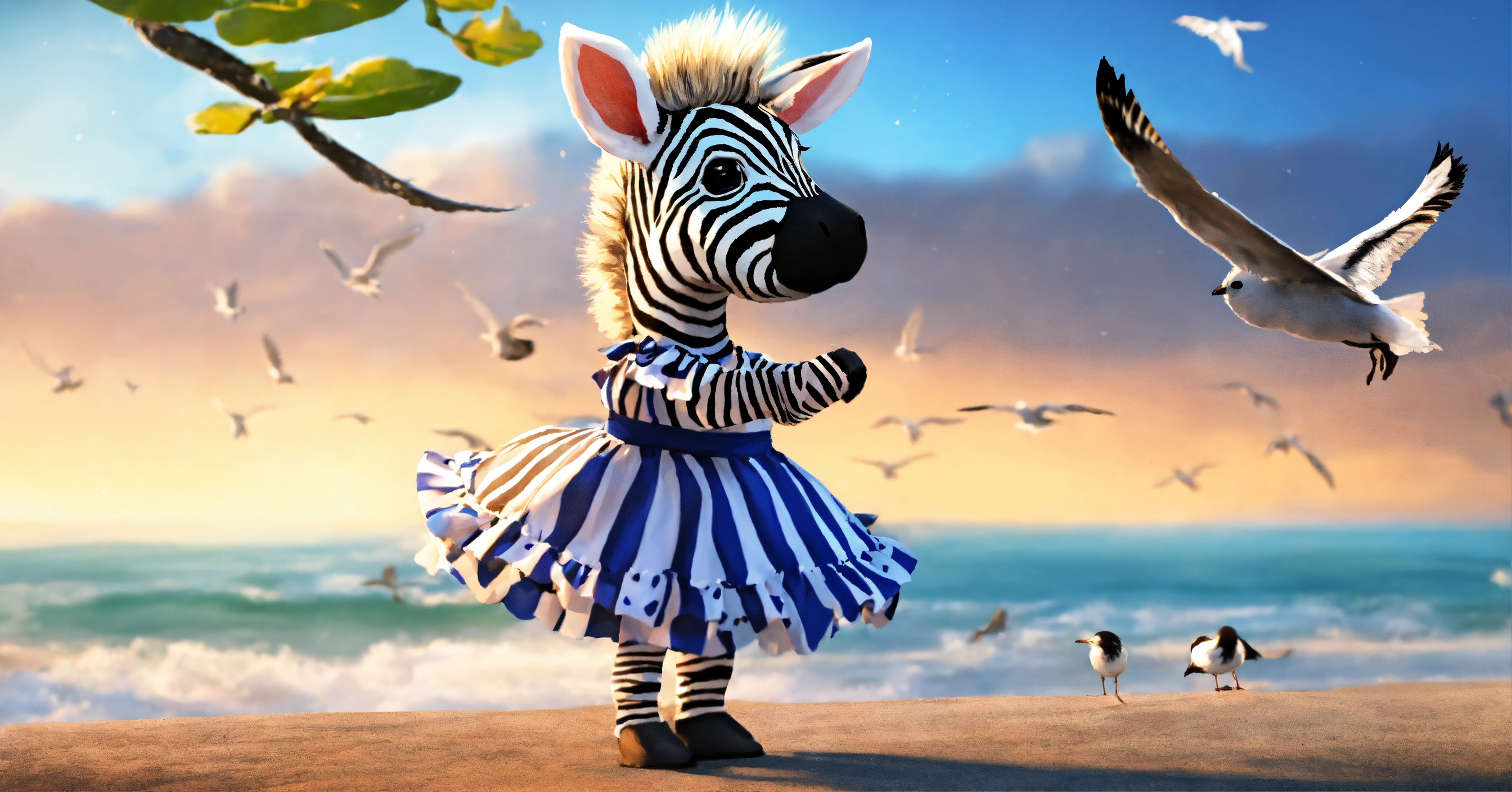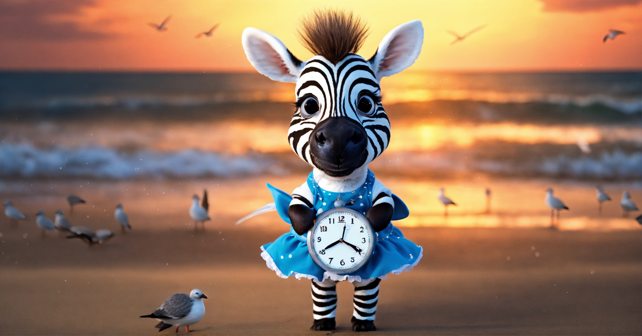Cute baby zebra in a dress, looking at the clock, what time is it, the center of the ocean, silence, seagulls