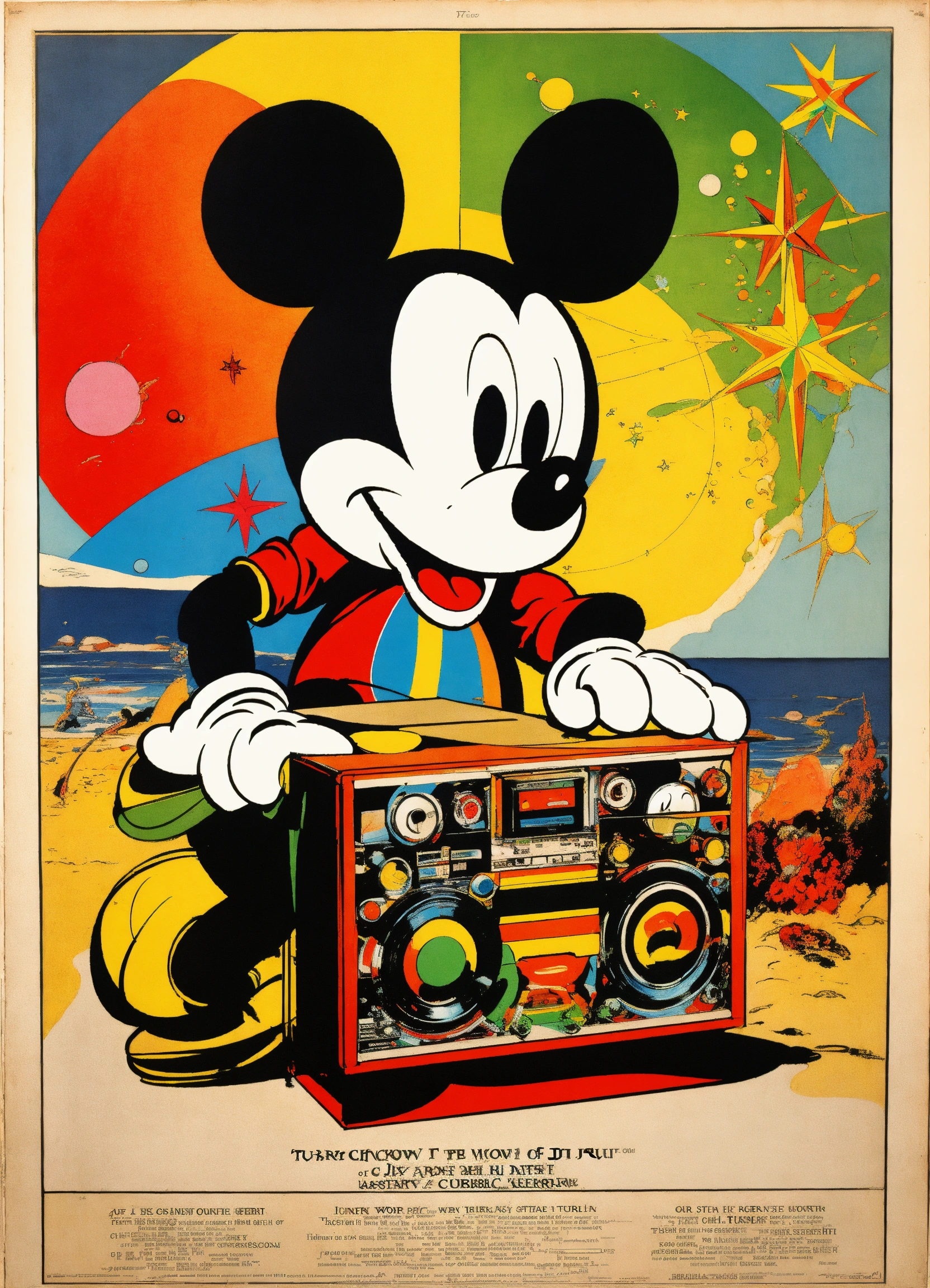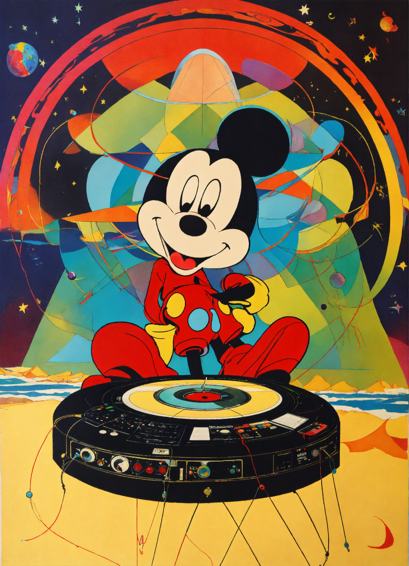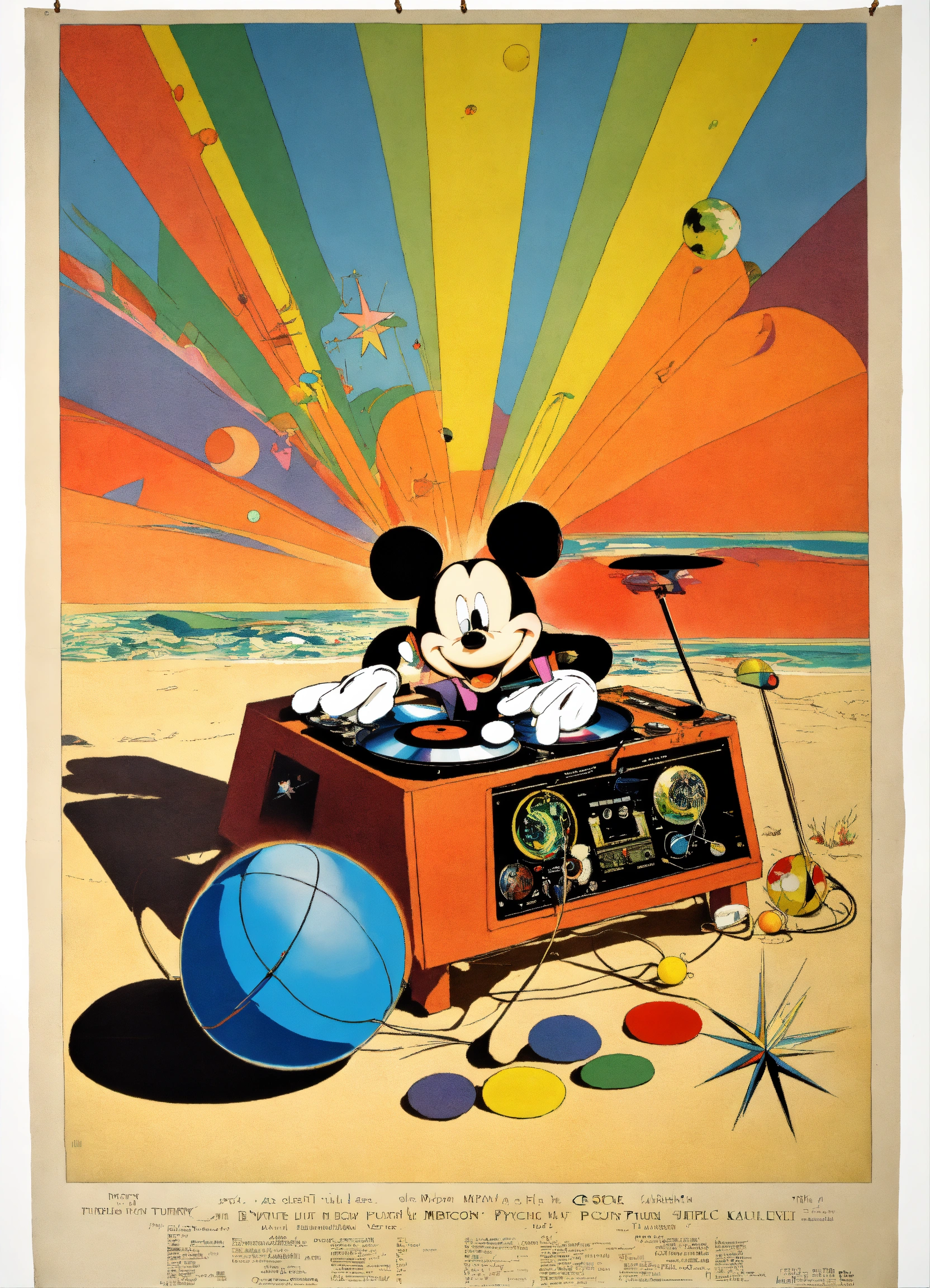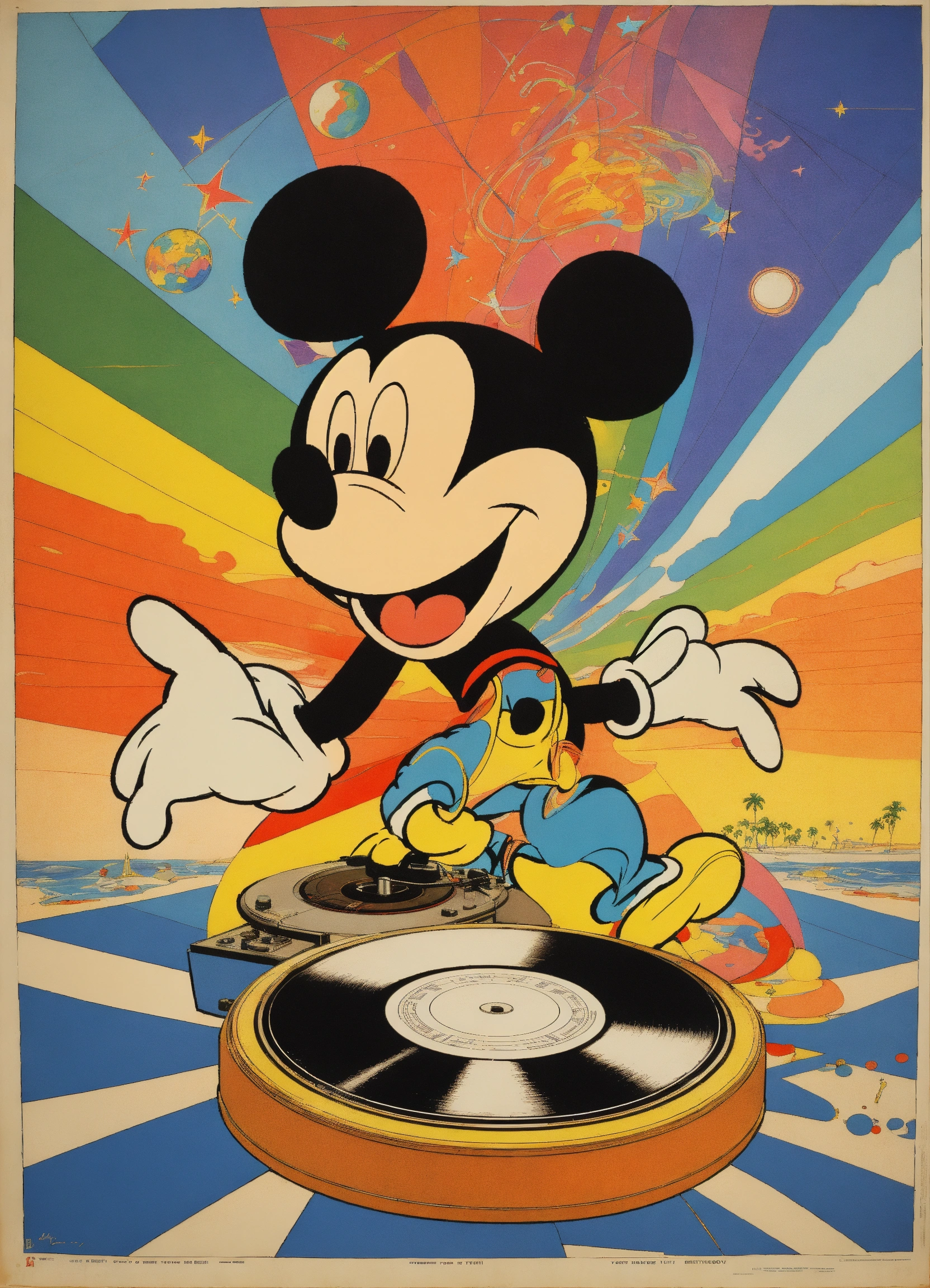 Vintage poster, mickey mouse with dj turn table, turn, abstract, psychedelic, heinrich kley, the four corners of the world, rainbow geometrical, star and planets on a beach