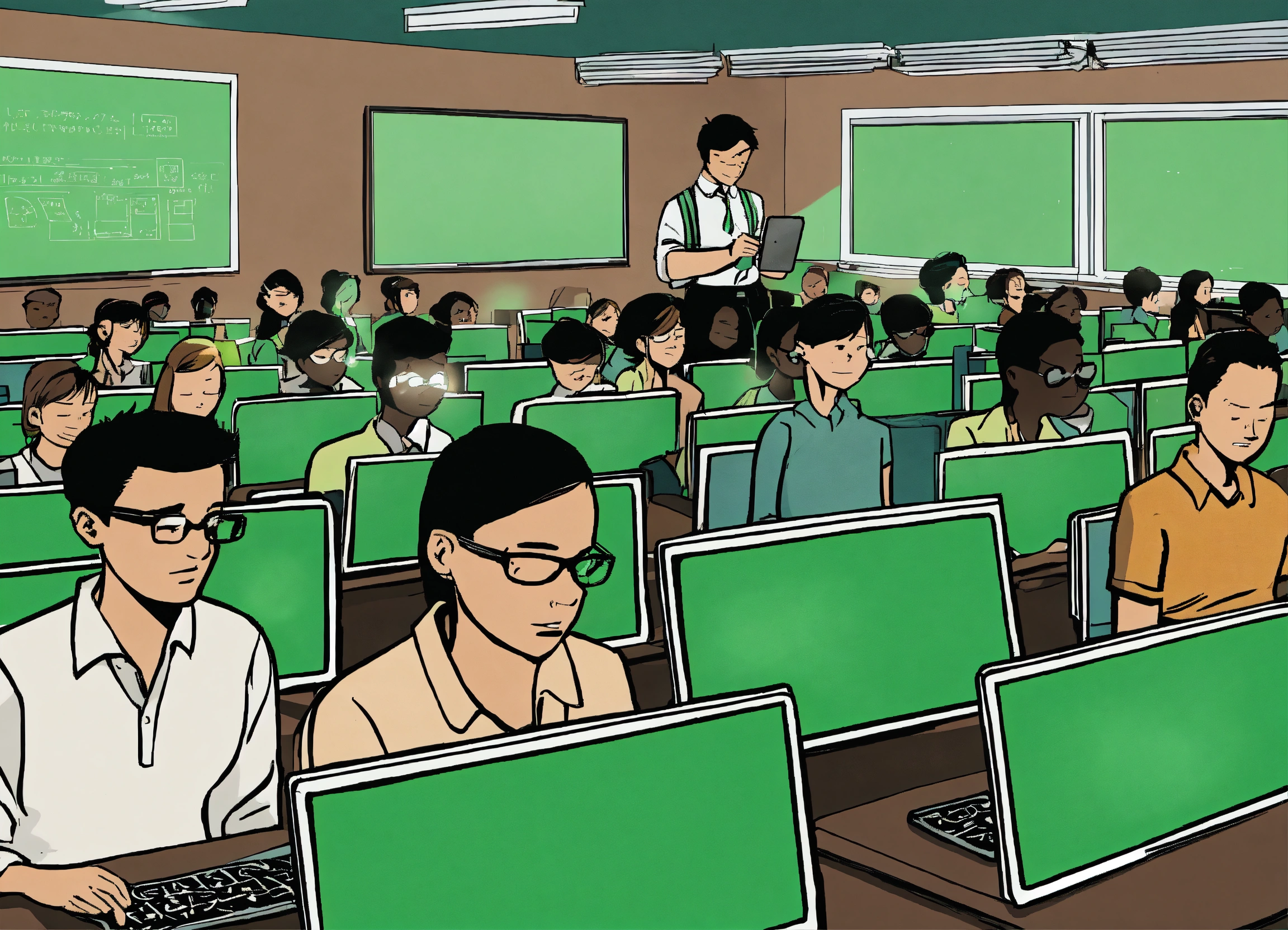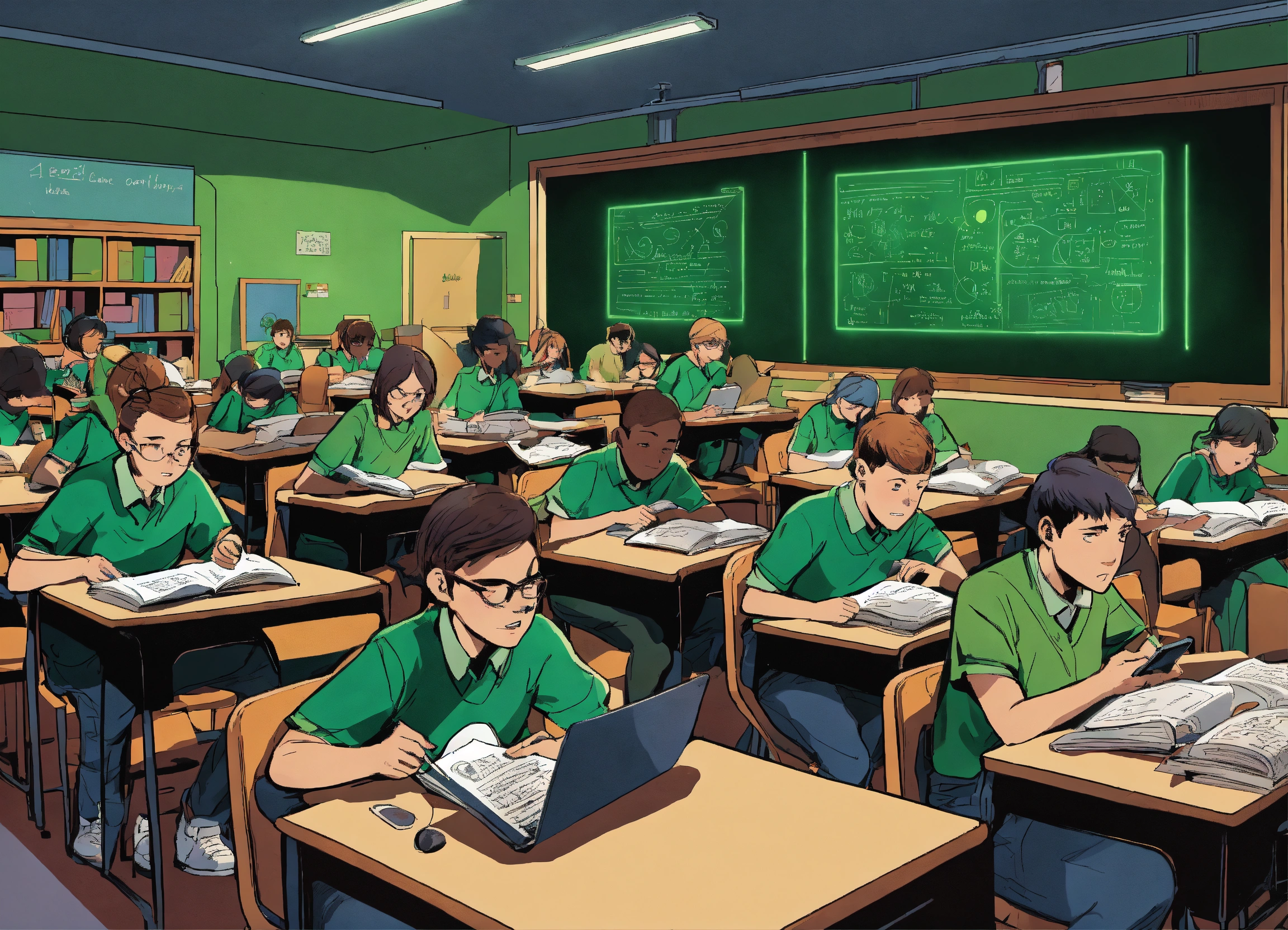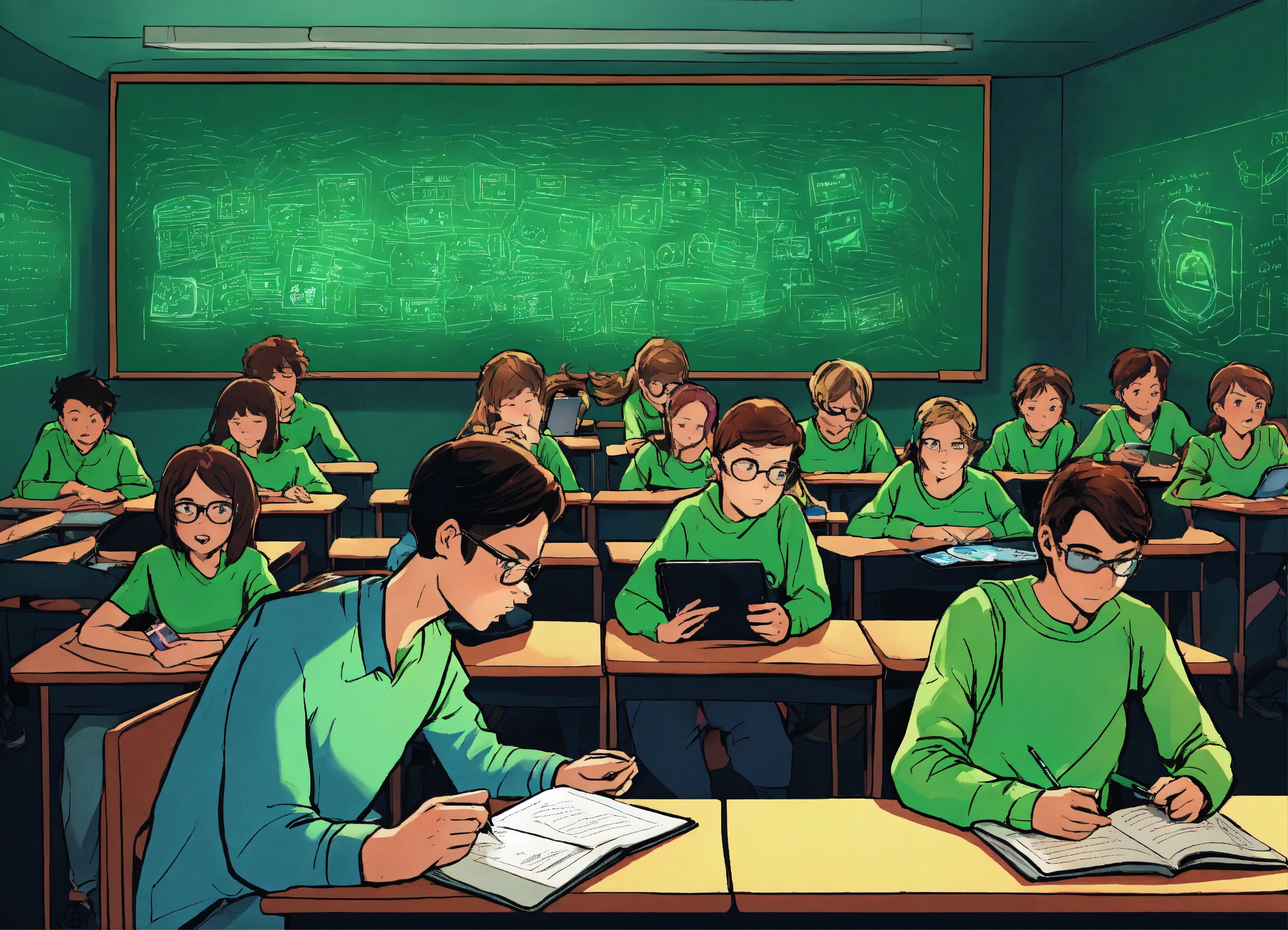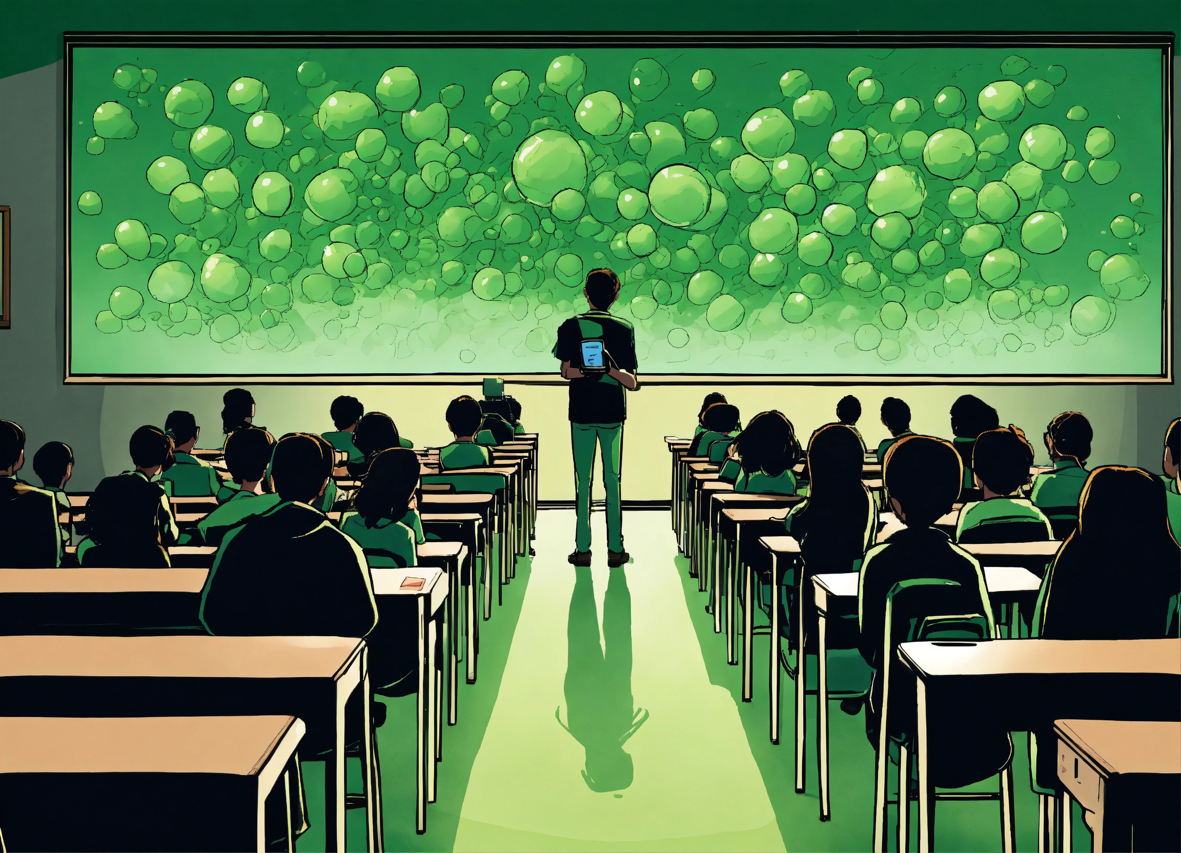 Illustrate a comic cartoon poster where a classroom is lined with rows of students, each encased in a bubble of green light from their personal cell phone screens. the teacher at the front is also engrossed in a phone, with the chalkboard behind them remaining blank and shrouded in darkness