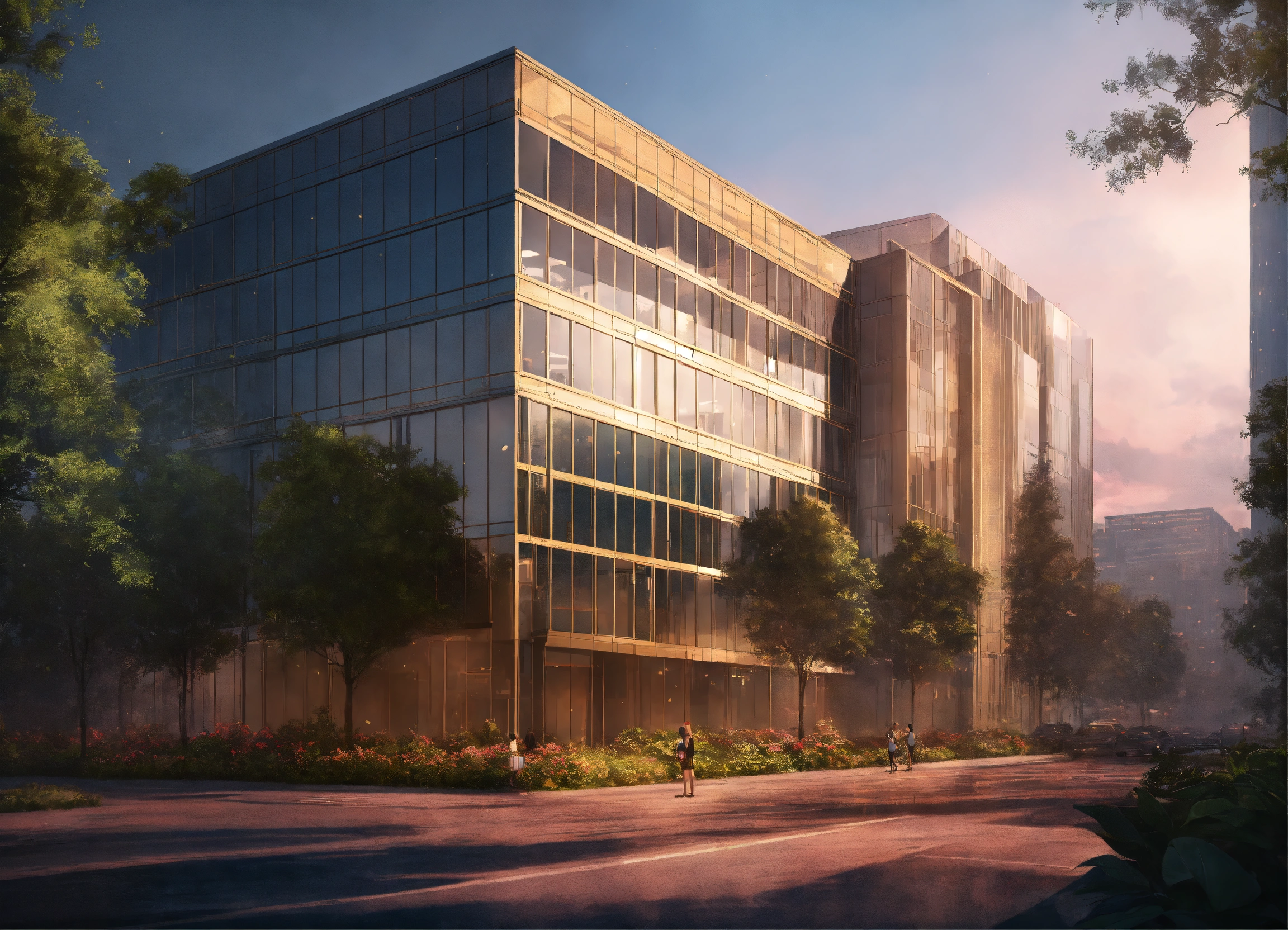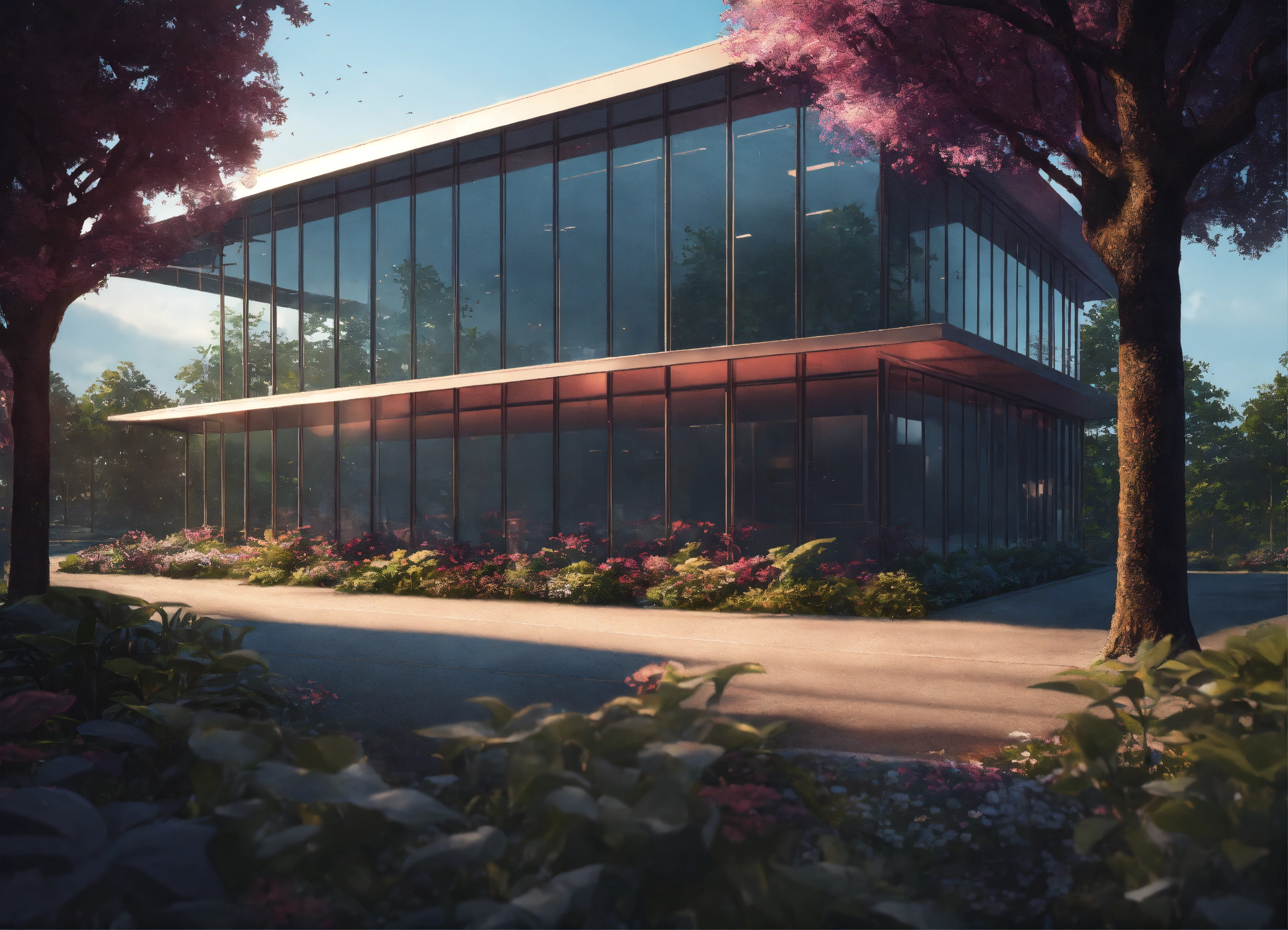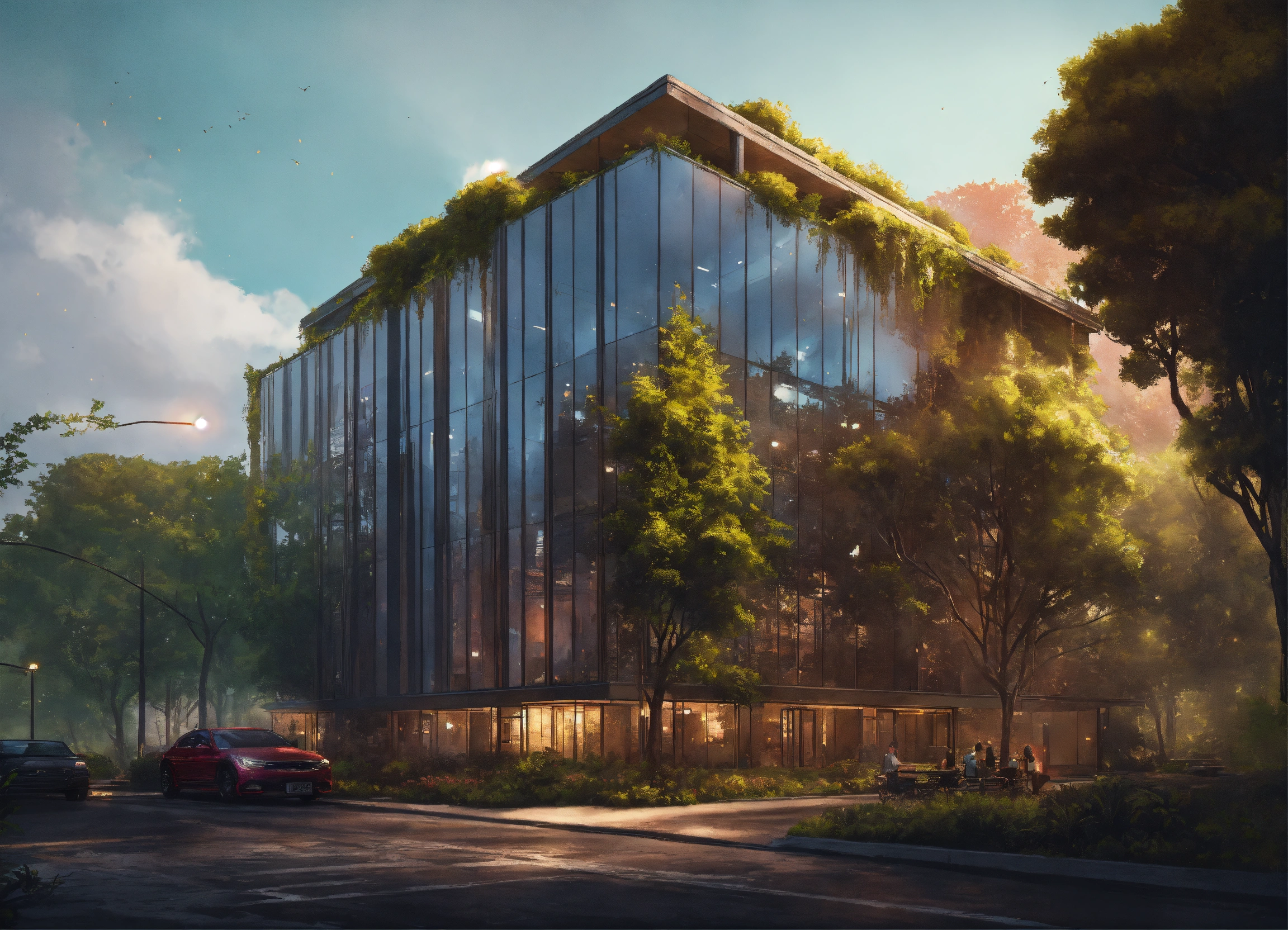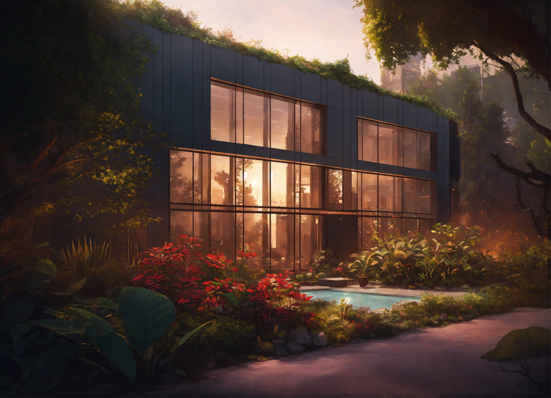 An office building in the middle of plants and trees by charlie bowater
