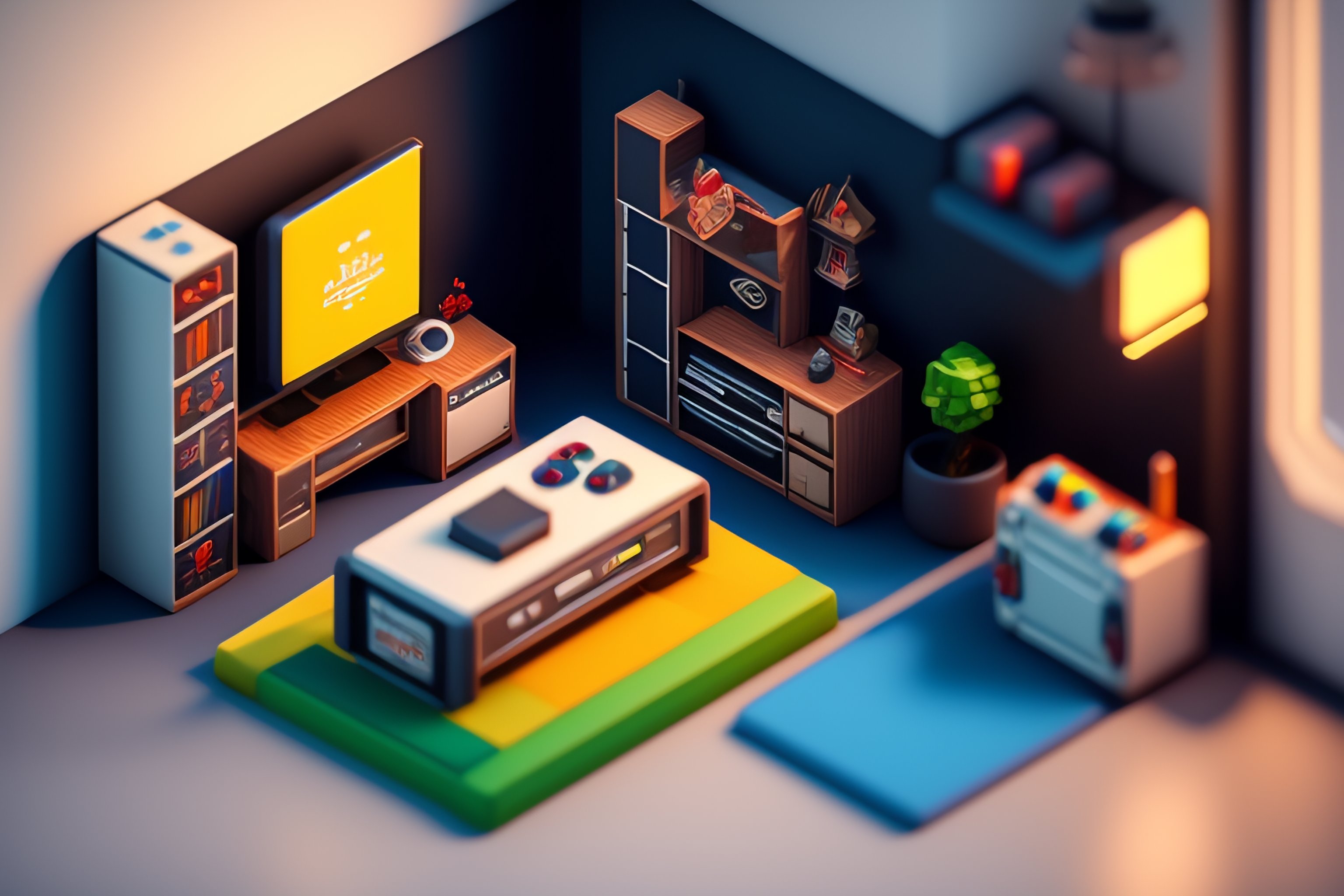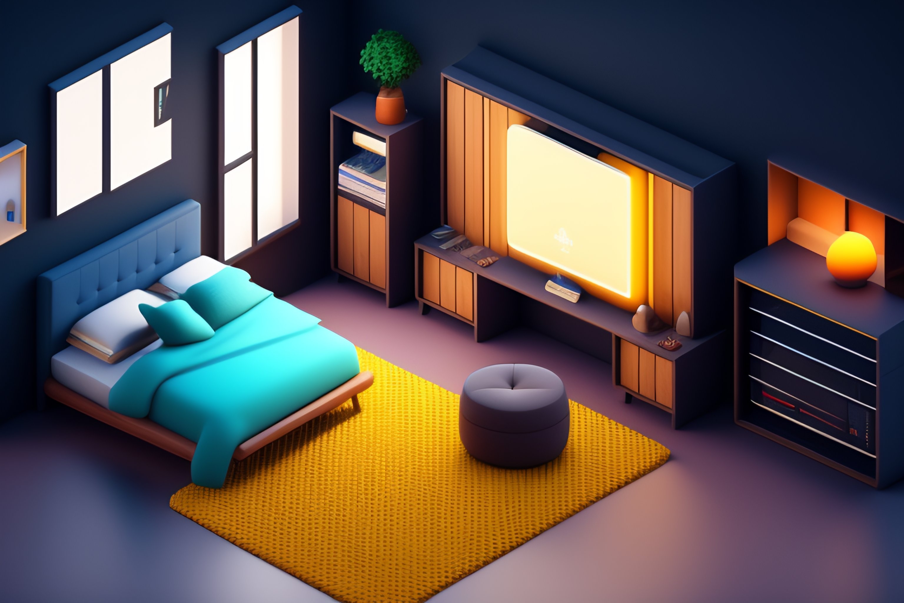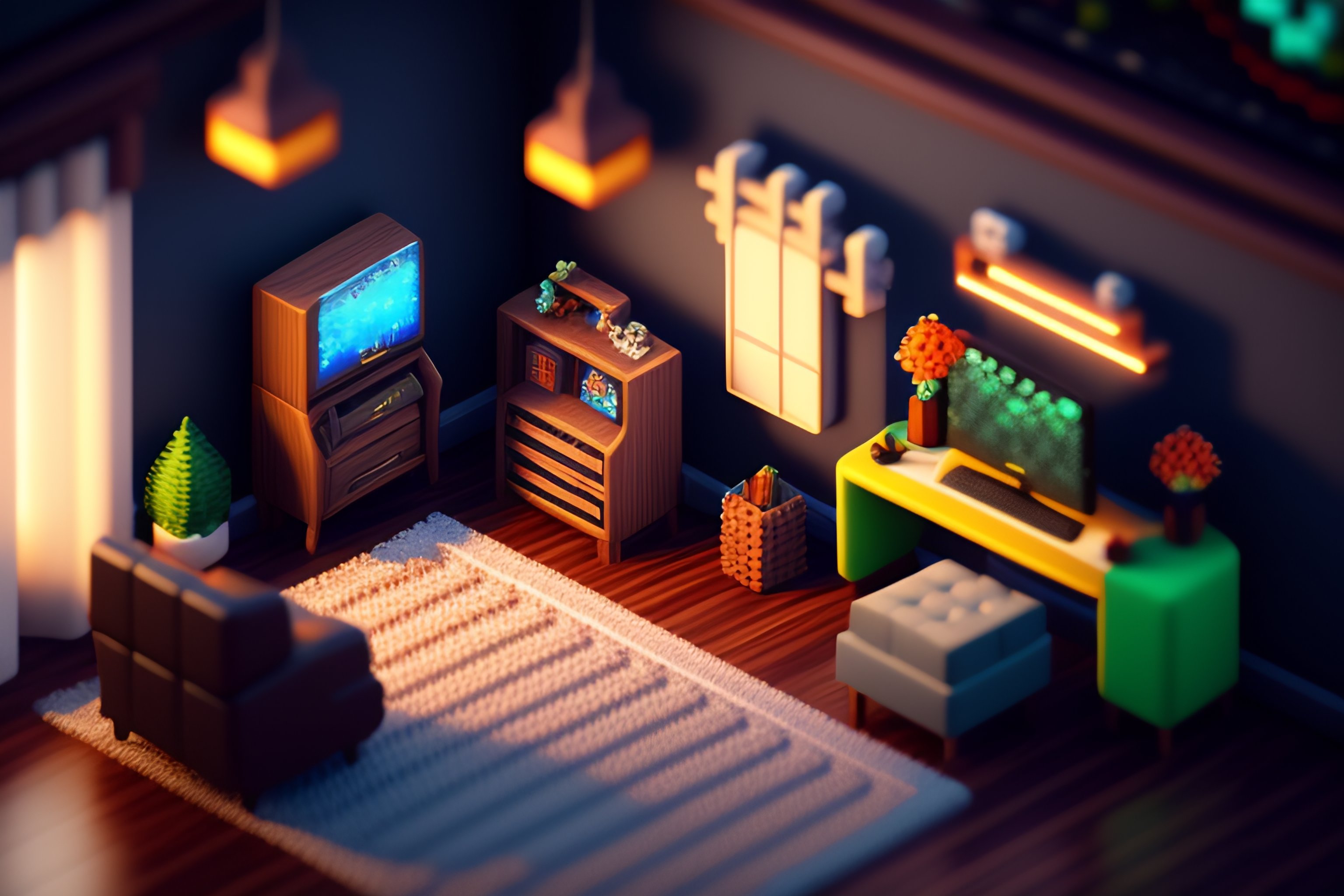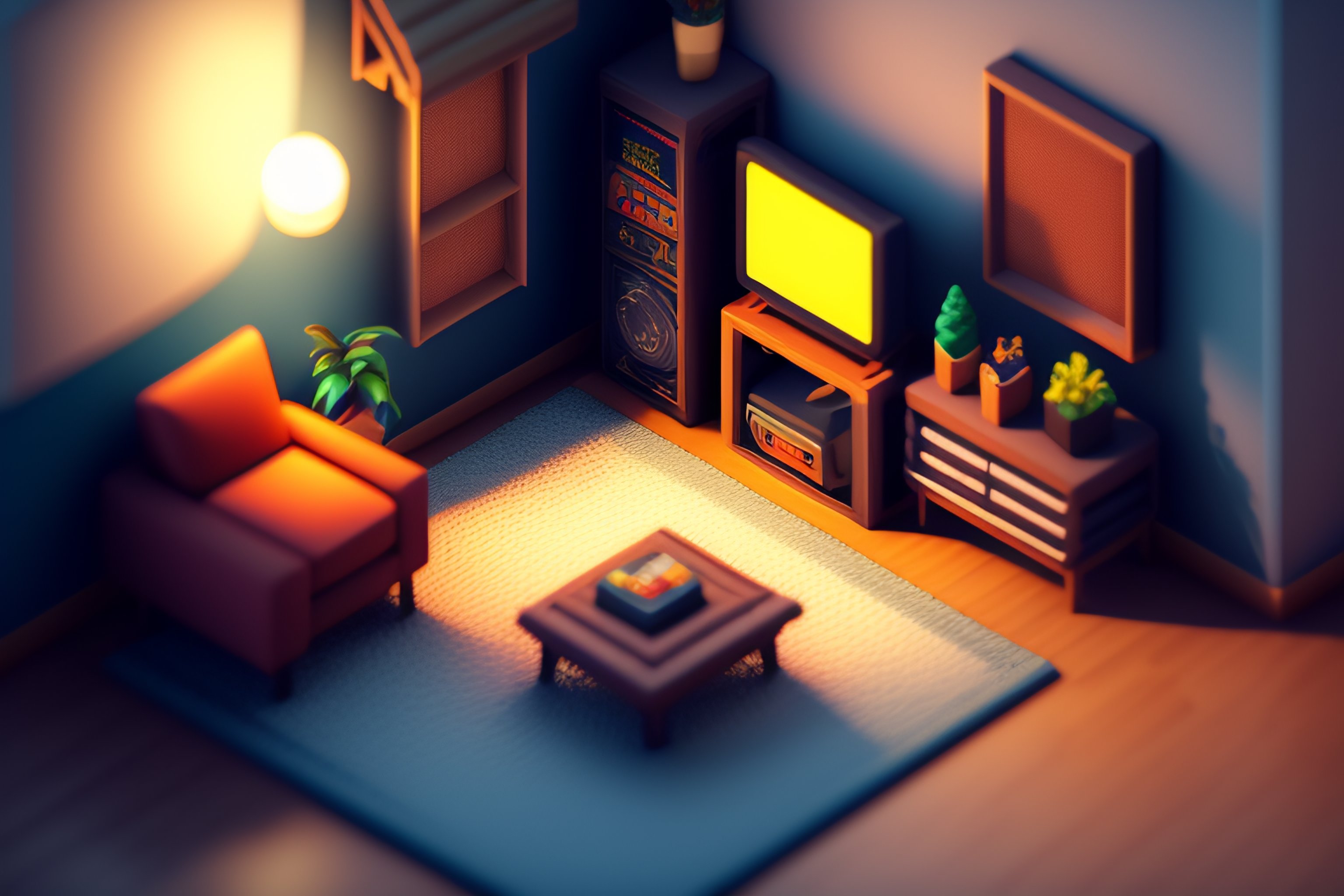 Detailed isometric gamer room, bed, gaming chair, pixel art, unreal engine voxel render, video games, very cozy, nostalgia, boy in room in front of tv, c4d render