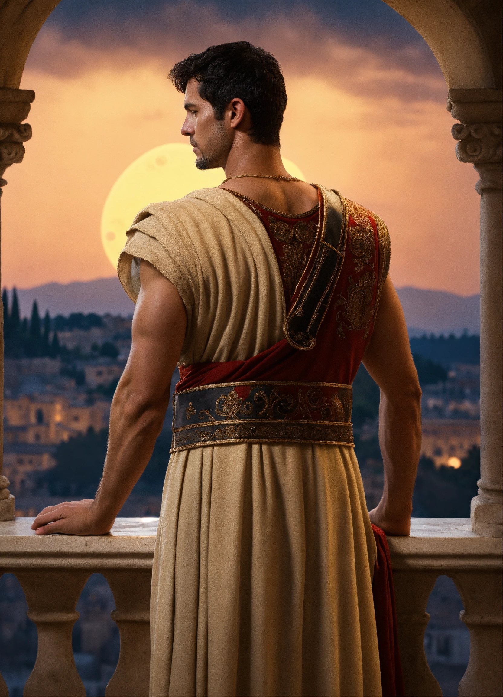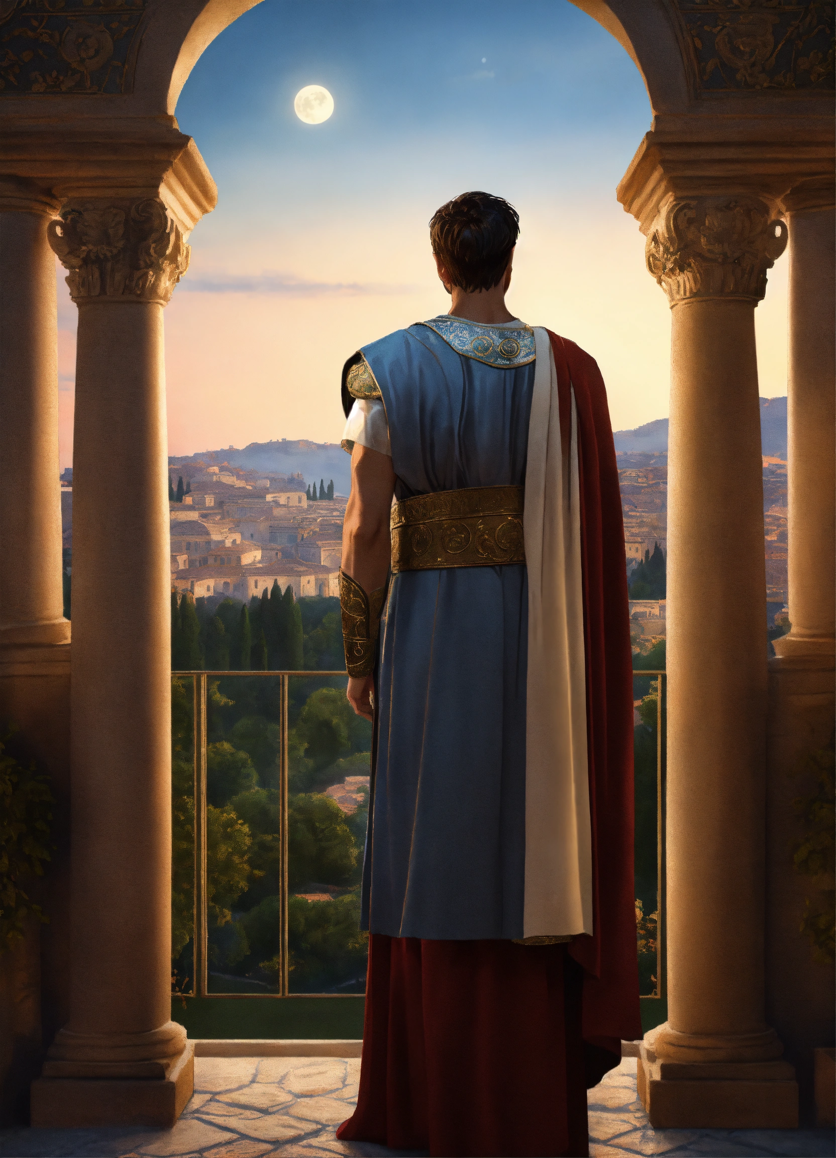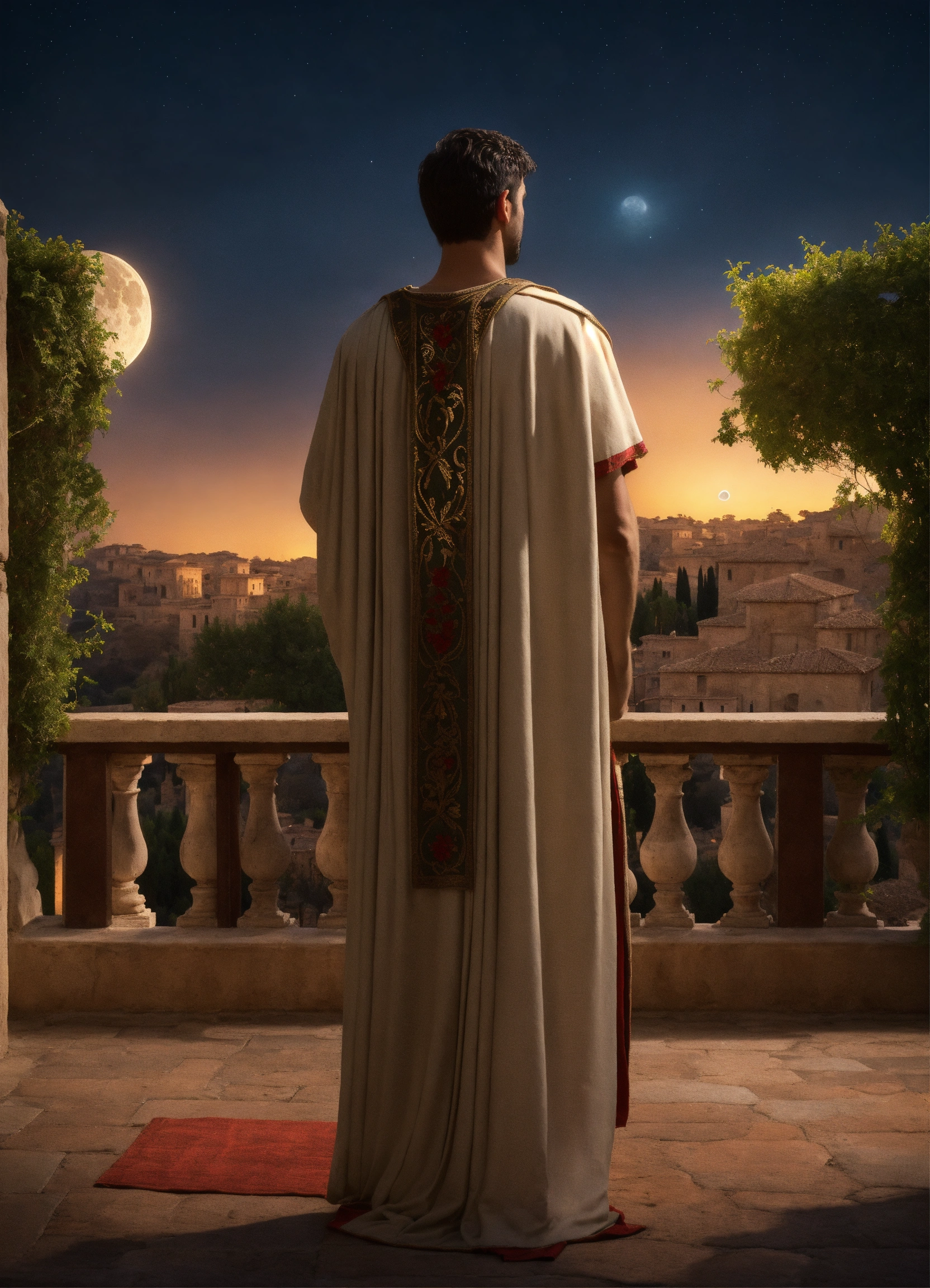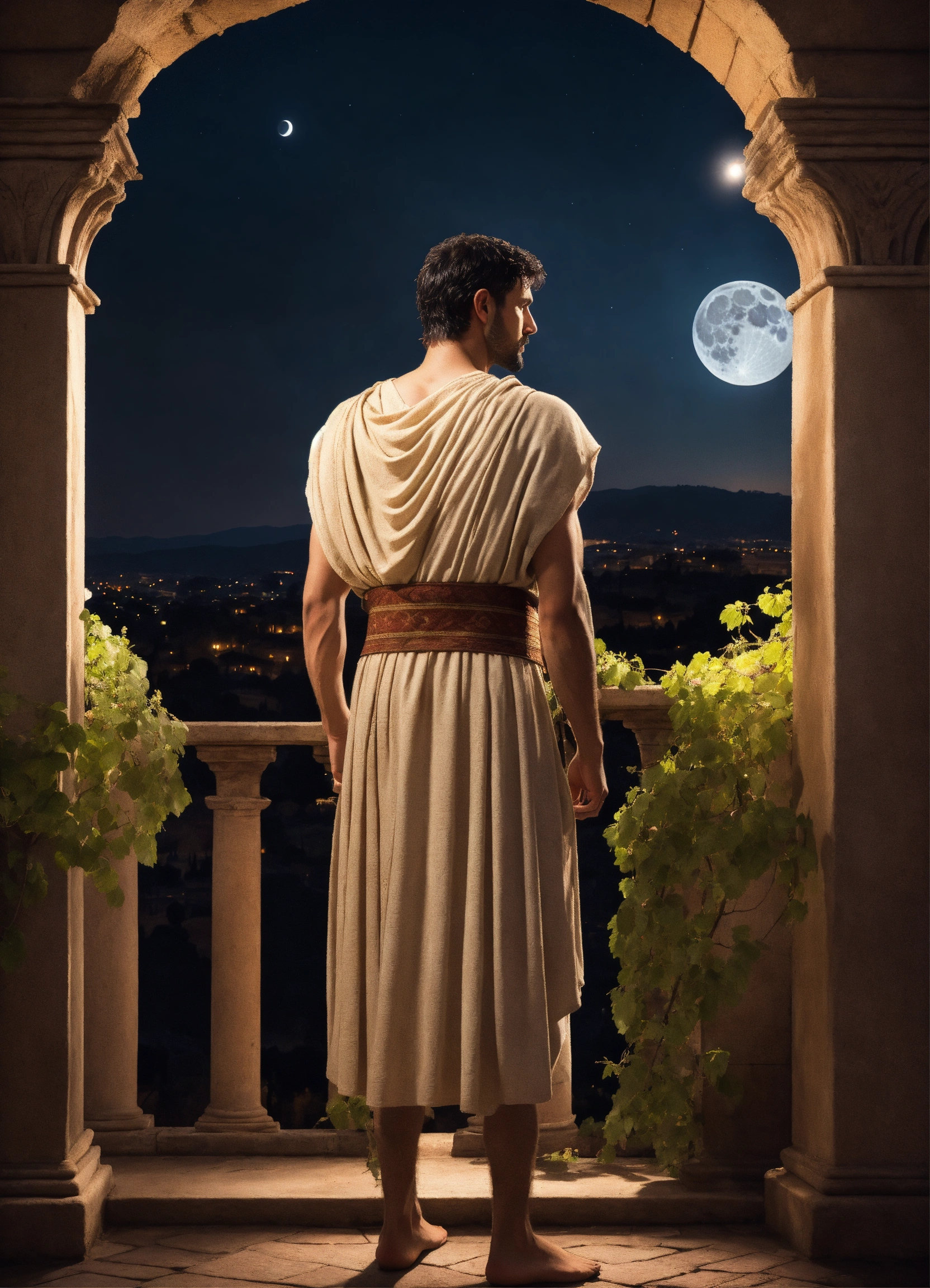 Back view of a young tall noble thin slender athletic handsome roman tribune wearing simple historical roman clothes, light-colored tunic, smart, solemn, 40 years old, historically accurate ancient rome, he is looking to the landscape of vineyards from the balcony of his luxurious roman villa, detailed colored decor, photo realistic, hyper detailed, 8k, at night, moon, dark, vivid light, short hair, dark-haired, close-up