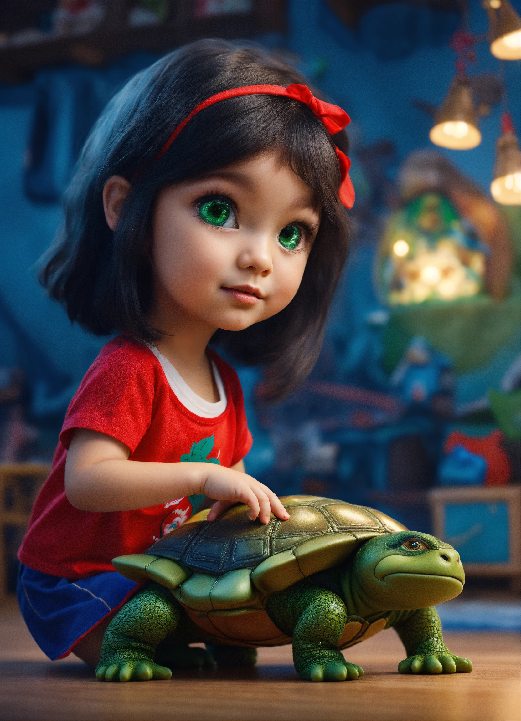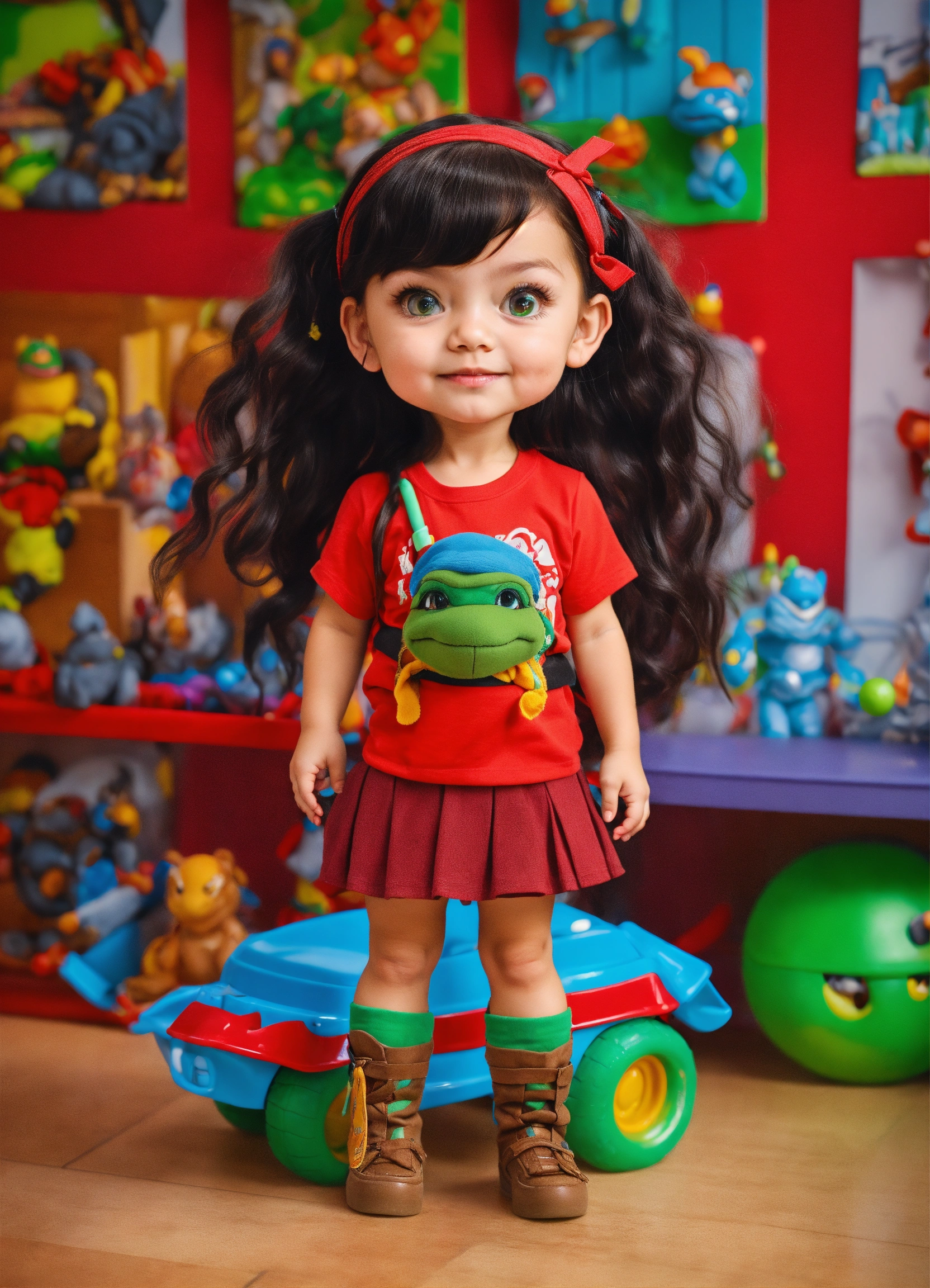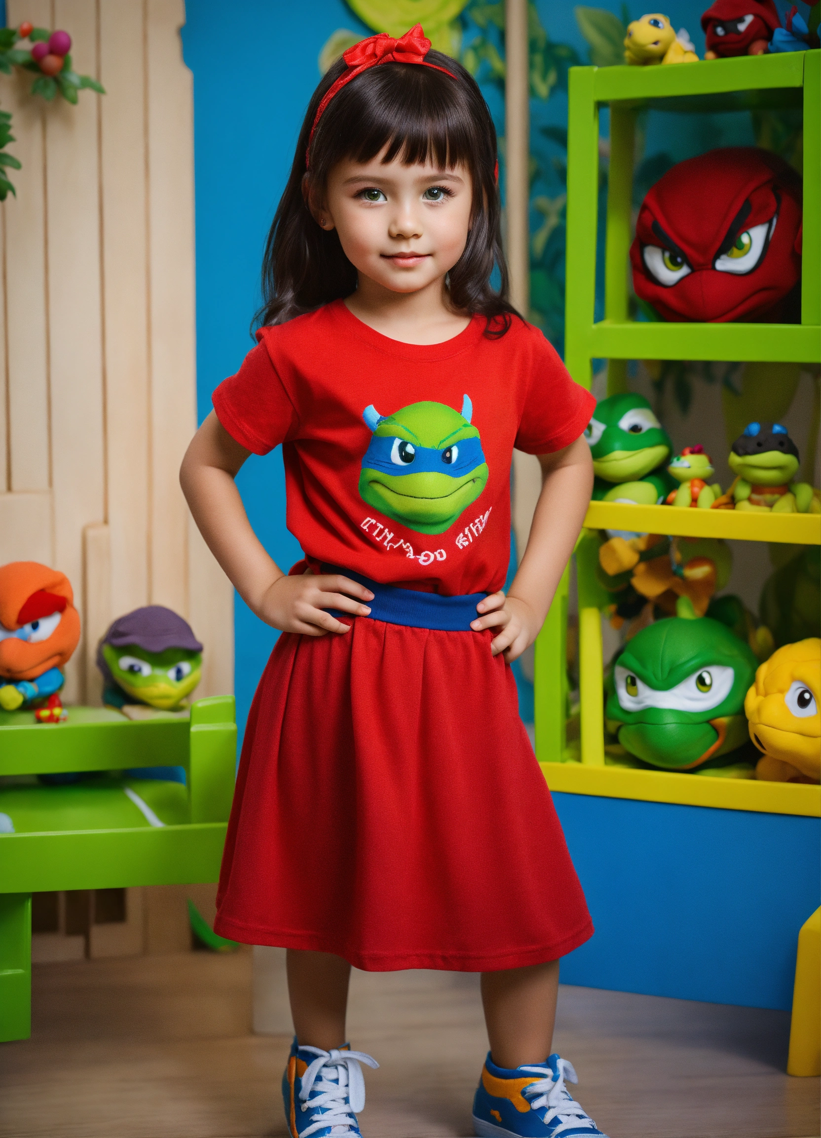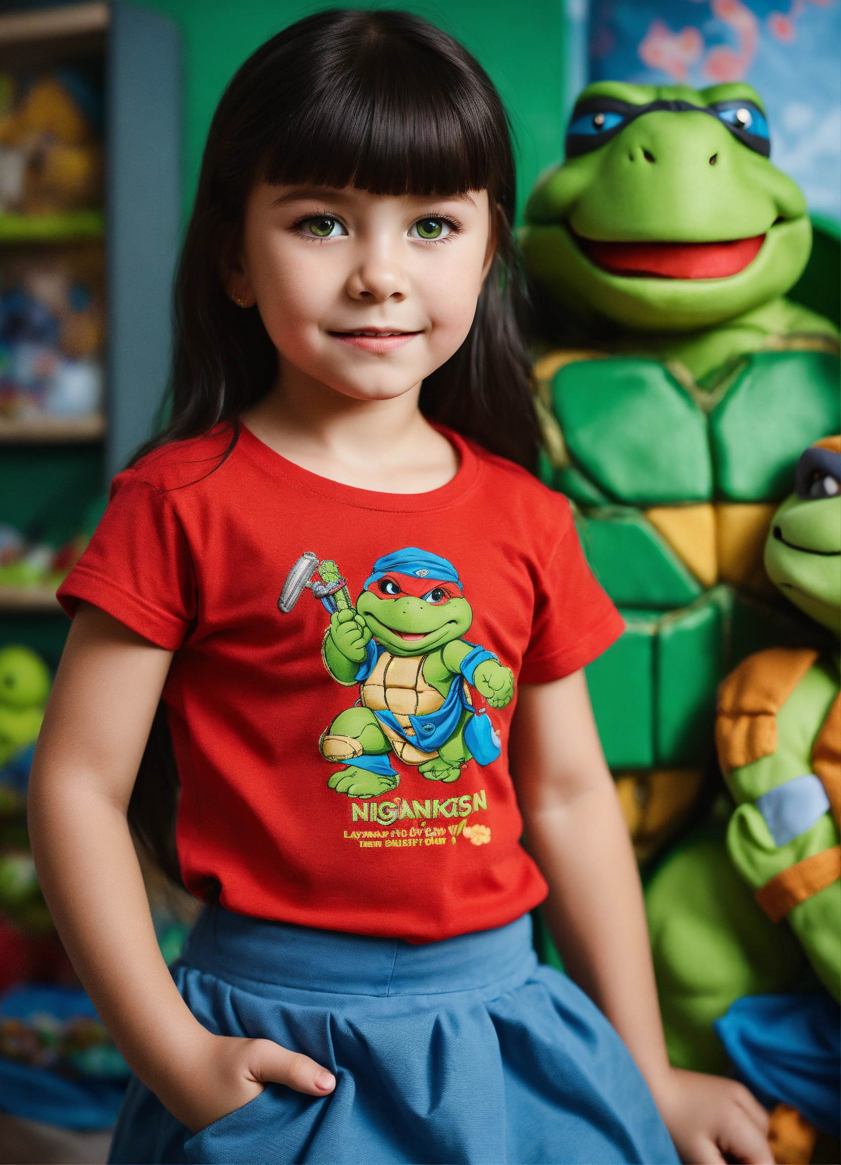 Length studio photos of a ukainian girl next door with black hair and green eyes, looks like olga polyakova, 5 years old, wearing red t-shirt and skirt blue color, beautiful face, photorealistic illustration, high details, 8k, play toys ninja turtles in kidsroom