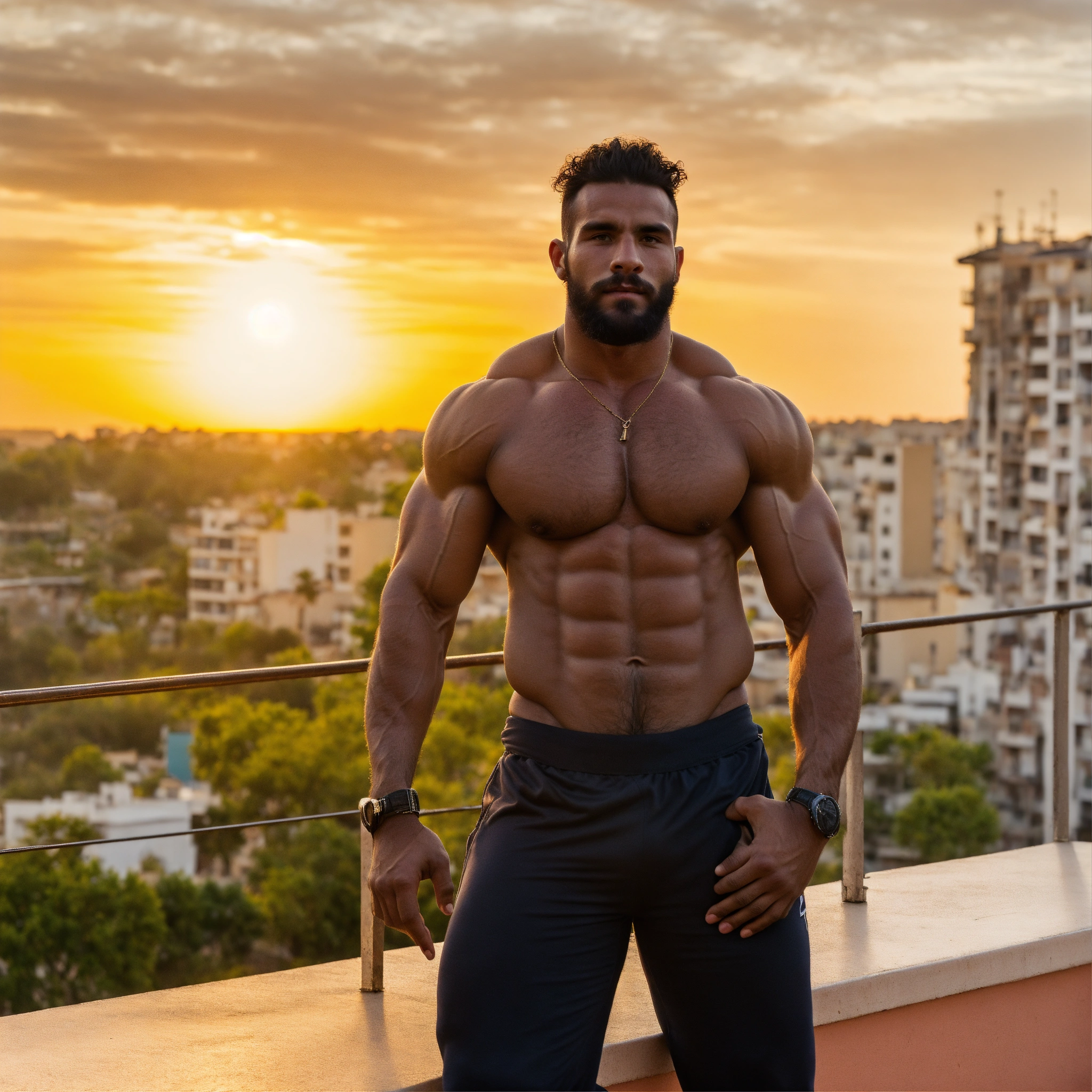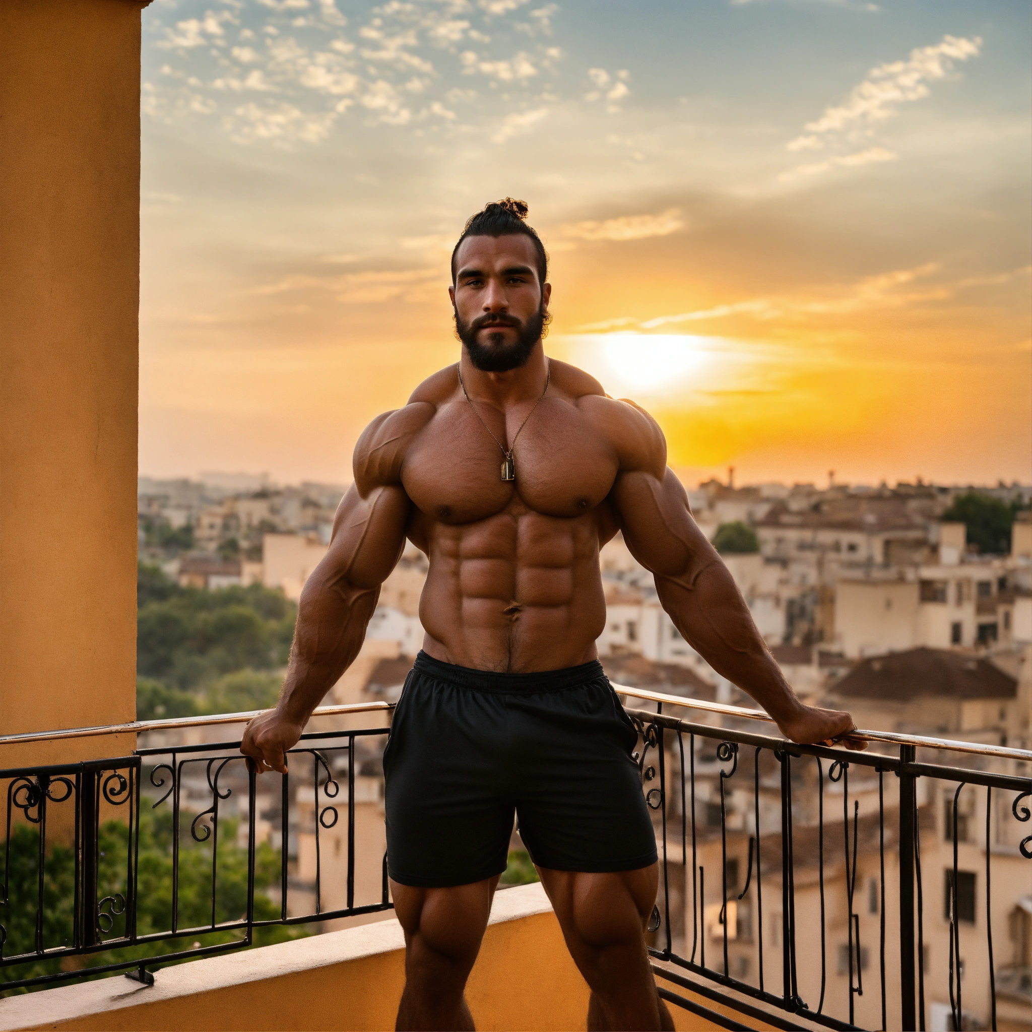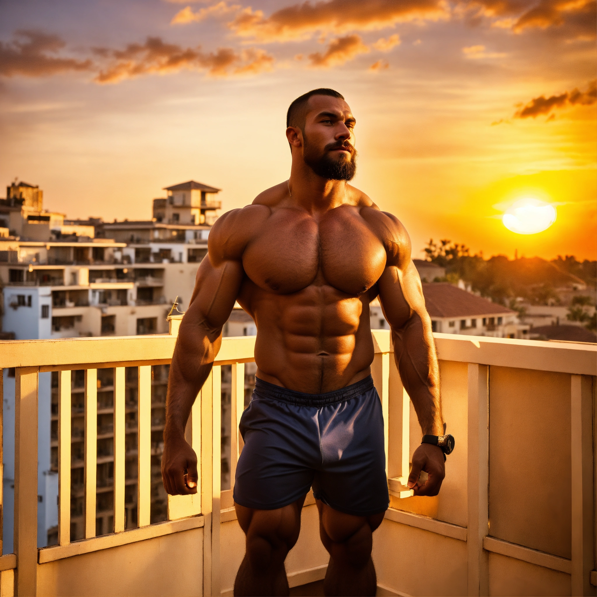 30-year-old hairy chadian man with big muscles, big bodybuilder, body like a wrestler, on a balcony at sunset