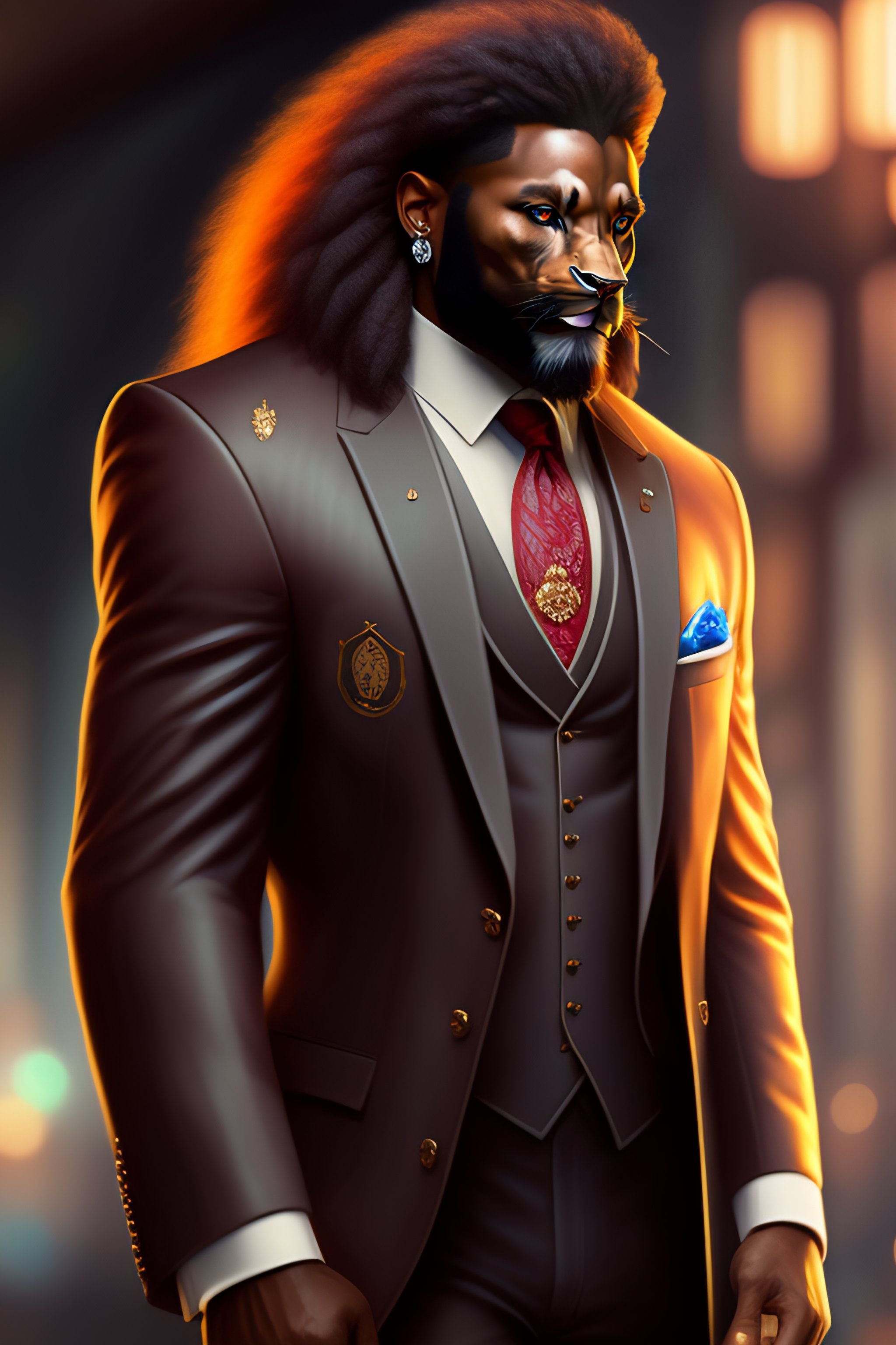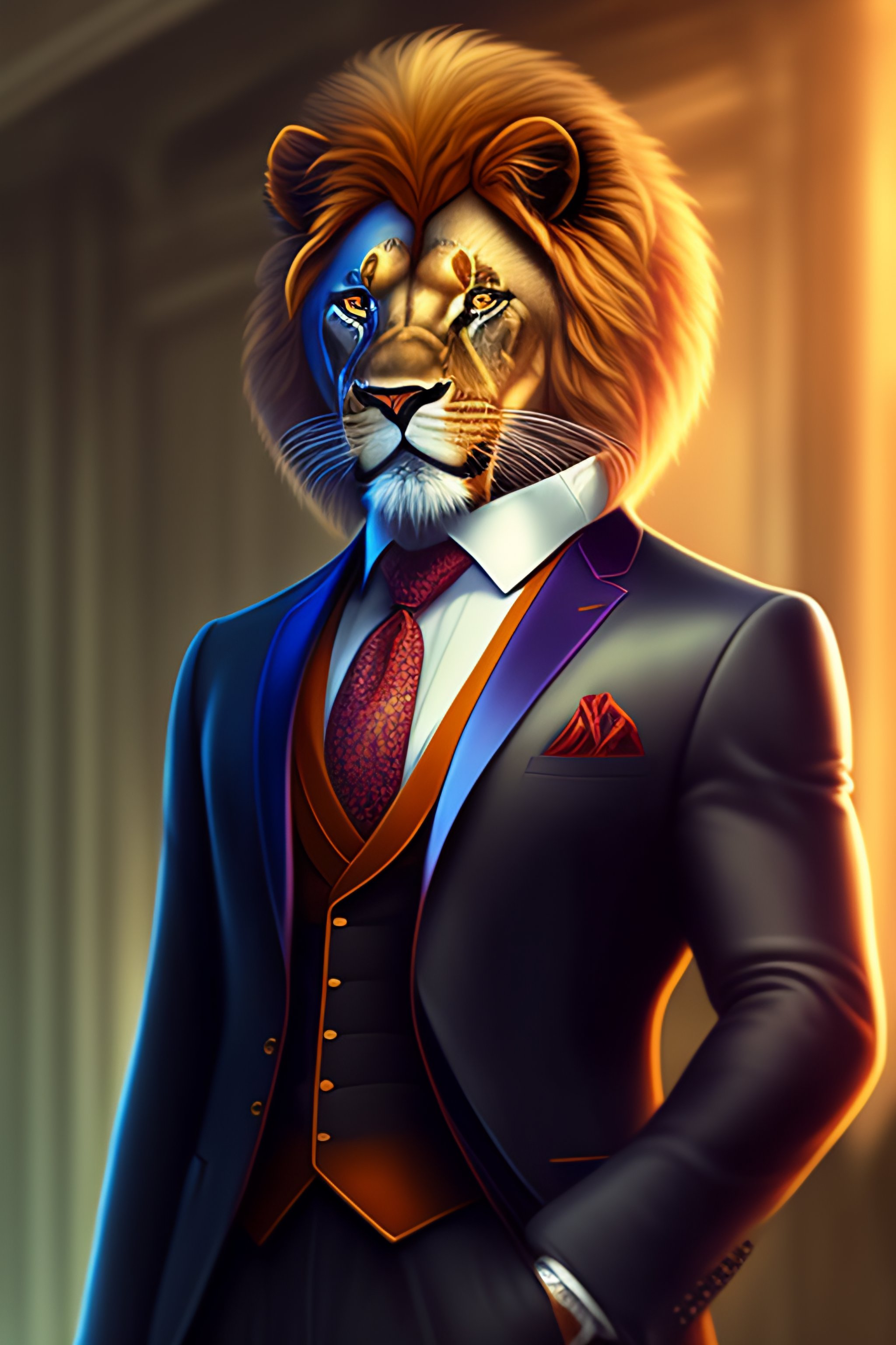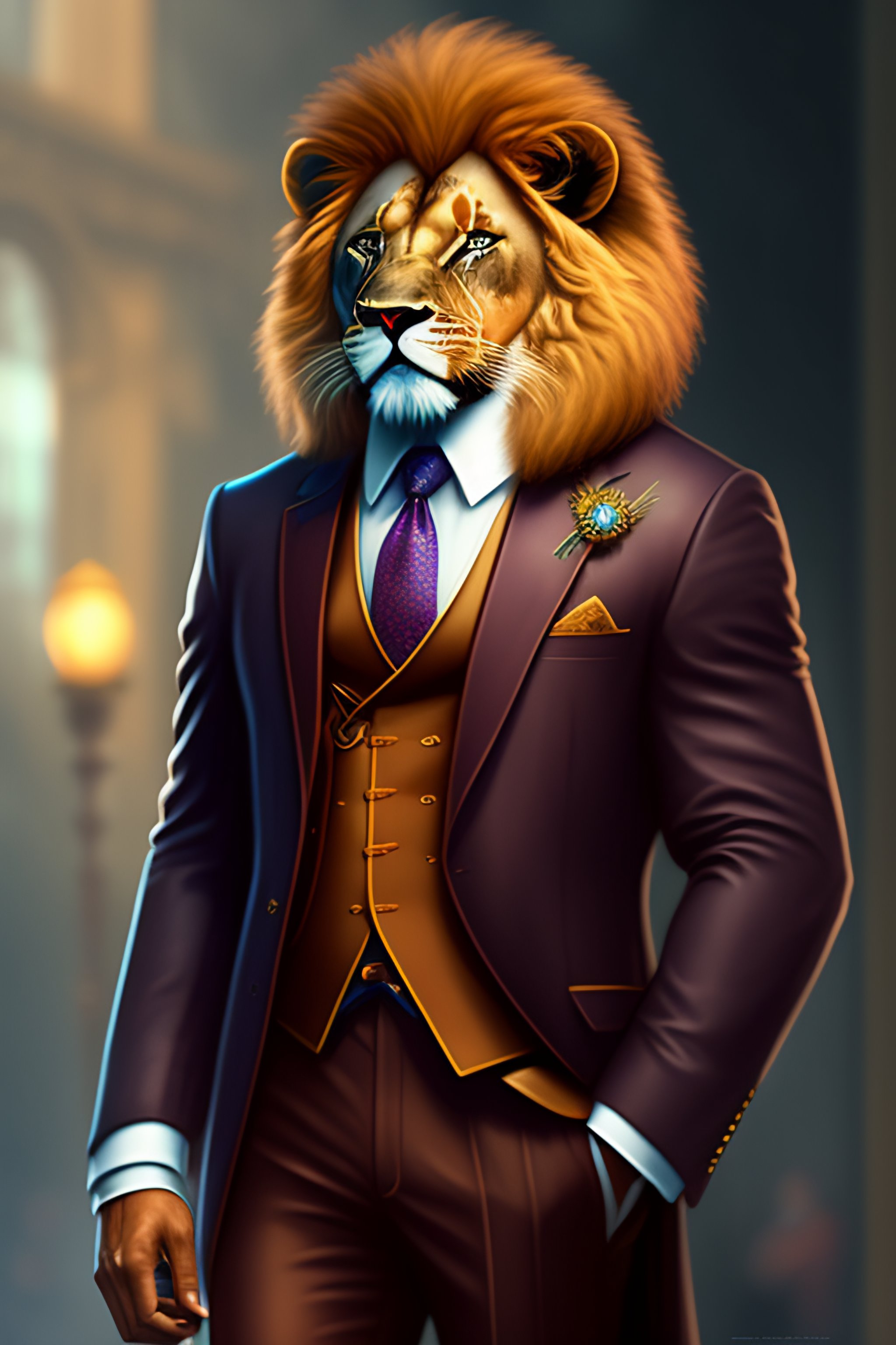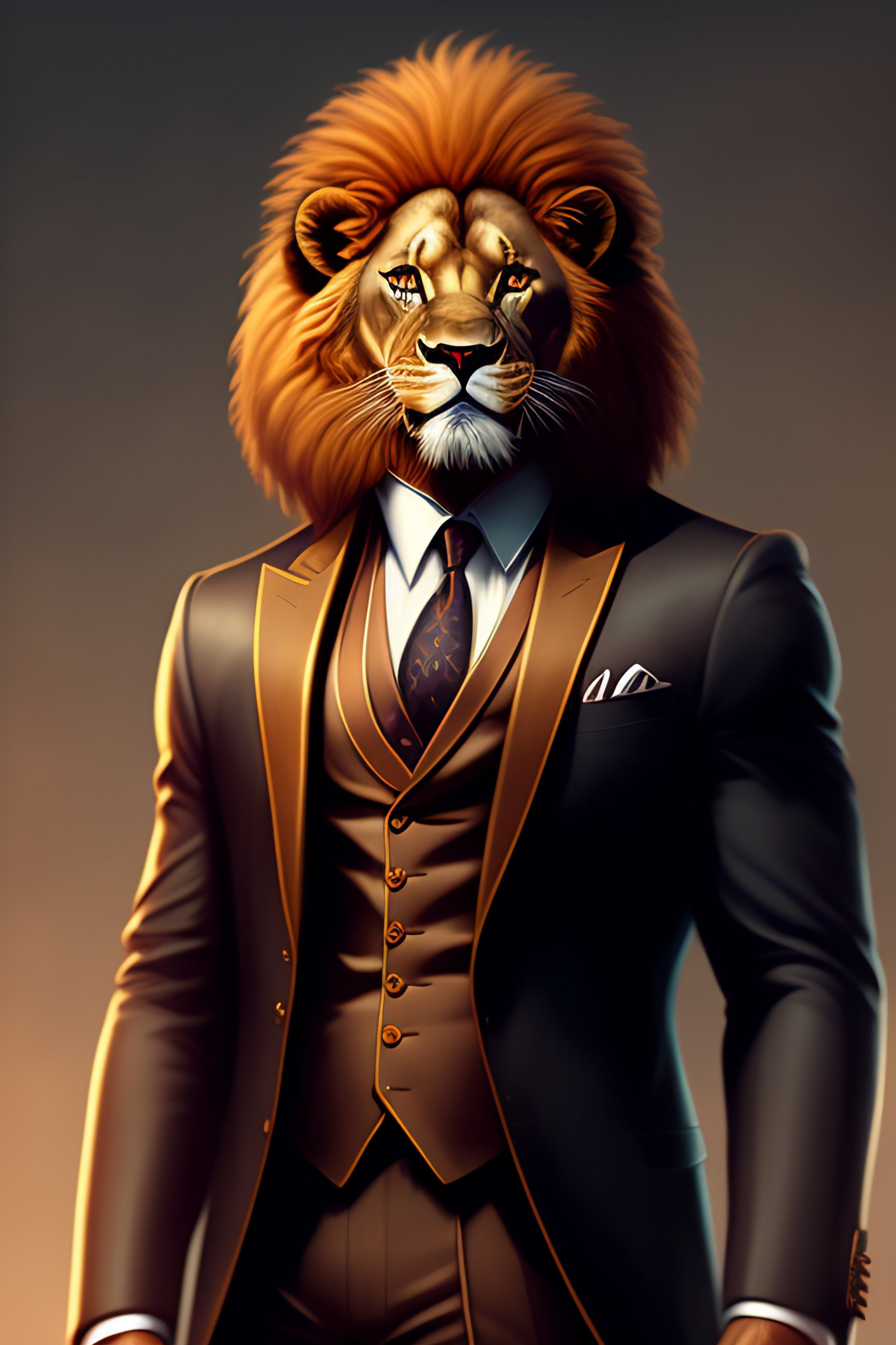 Anthro furry humanoid lion, three piece suit, checking watch, character concept design, painting, detailed, vivid