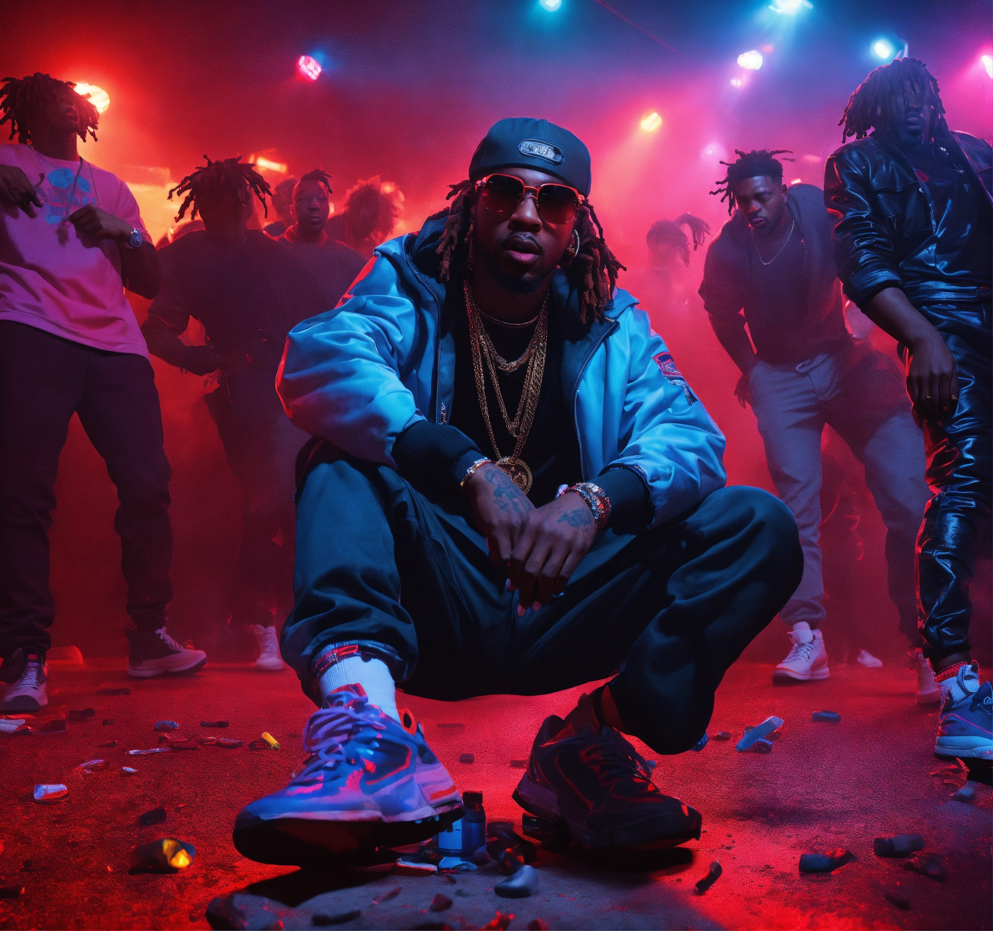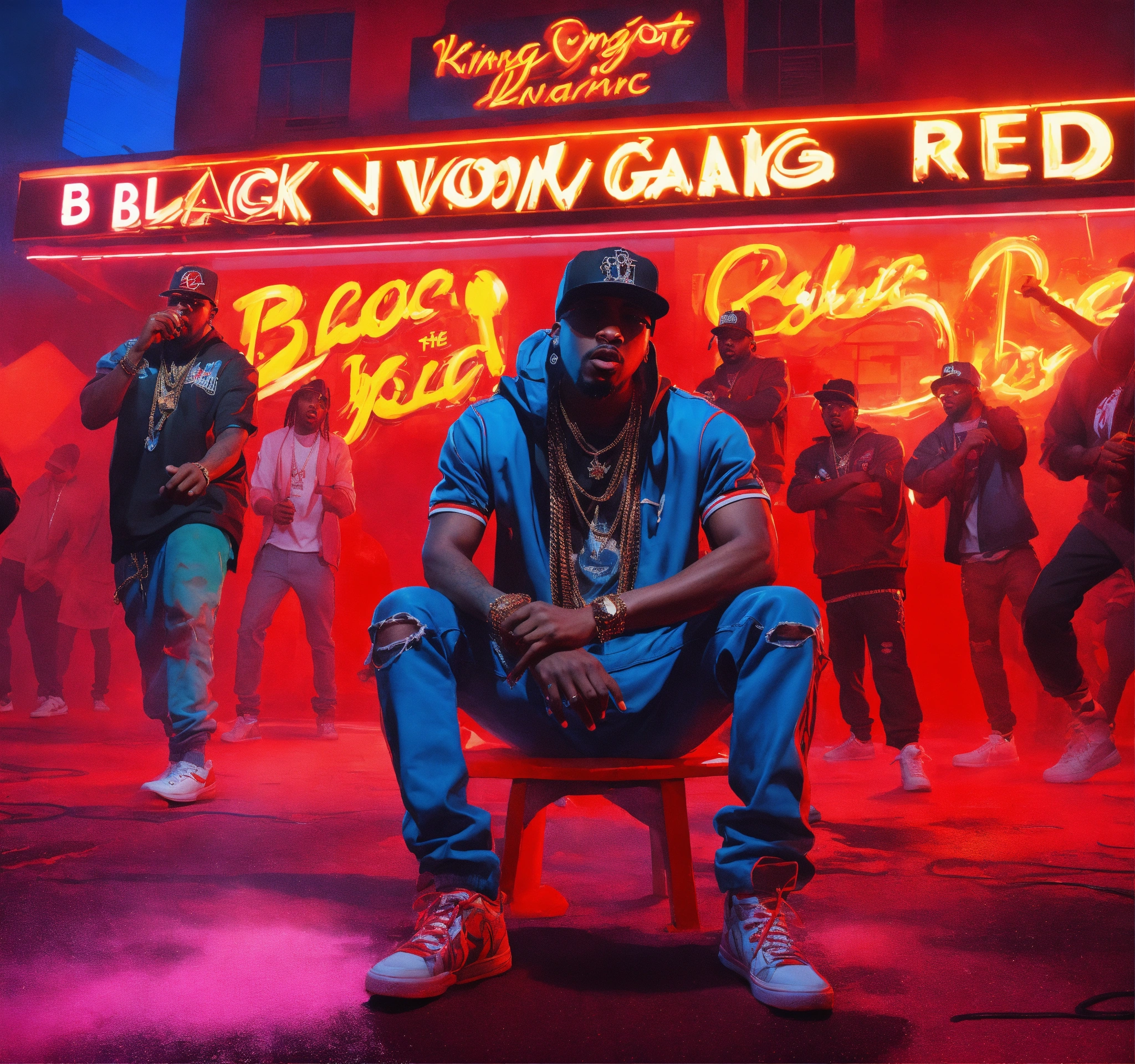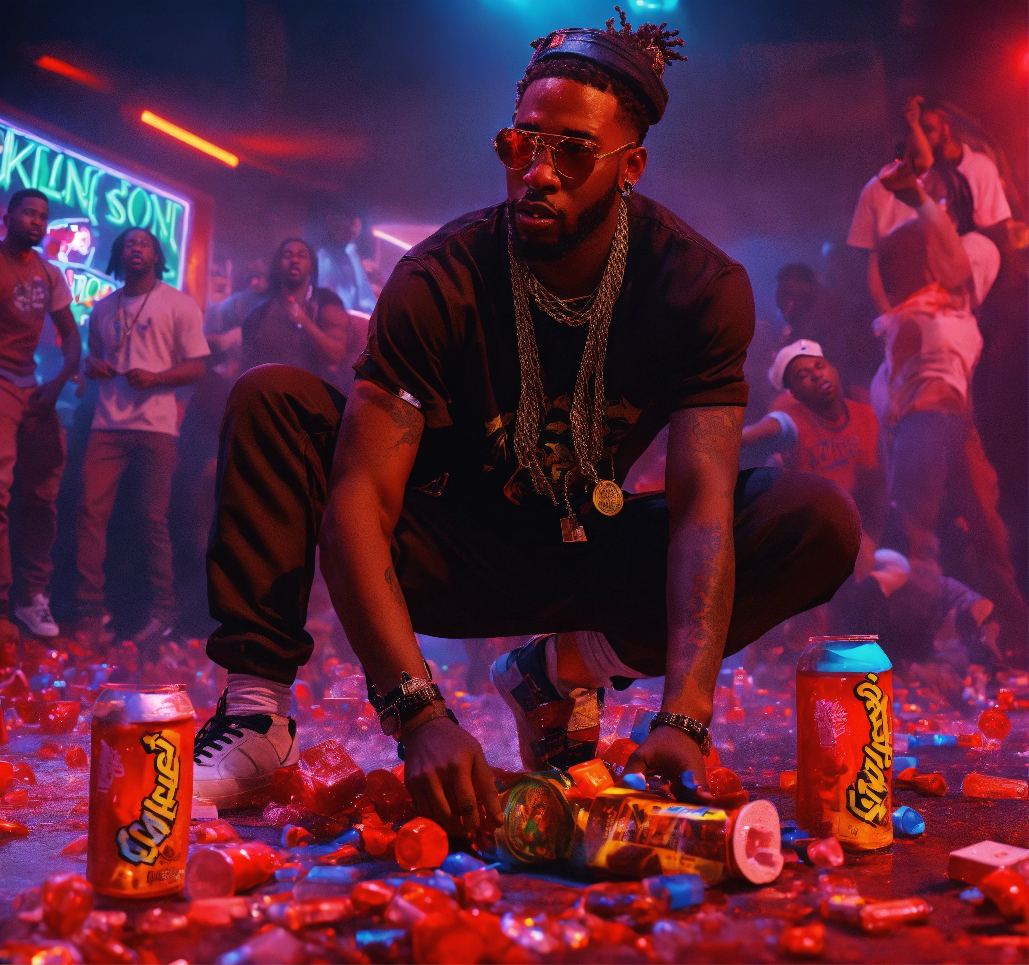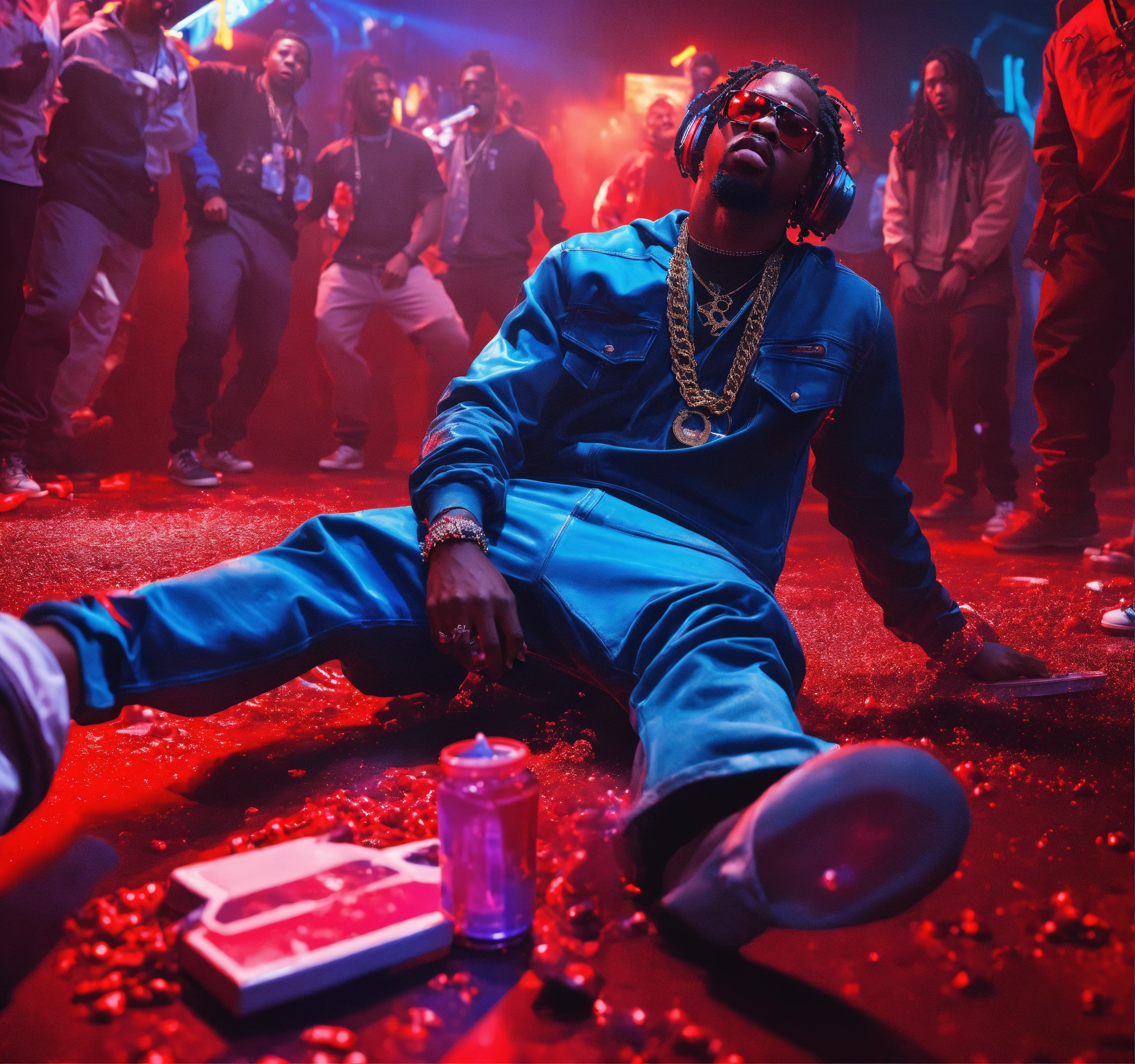 Medium shot, pop art, hyperrealist full body portrait of black rapper "king von " on the ground red kool aid all over him chaotic scene with a gang in front of a night club, fantasy art, photo realistic, dynamic lighting, artstation, poster, volumetric lighting, very detailed faces, 4 k, award winning