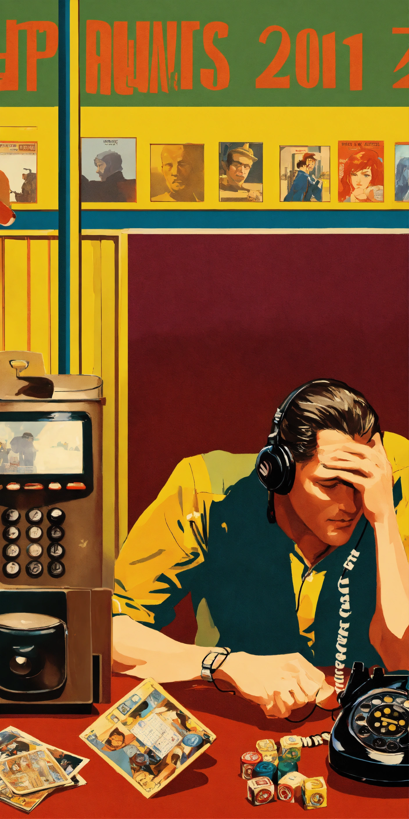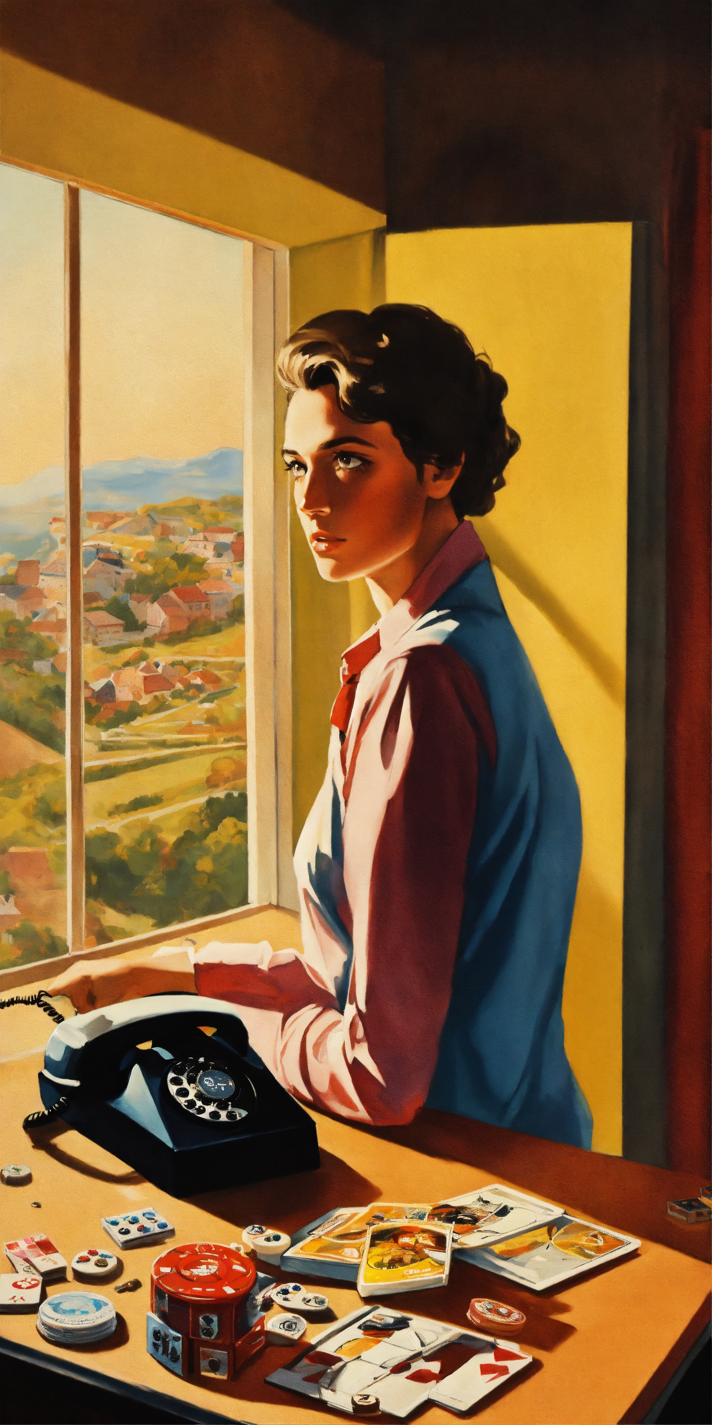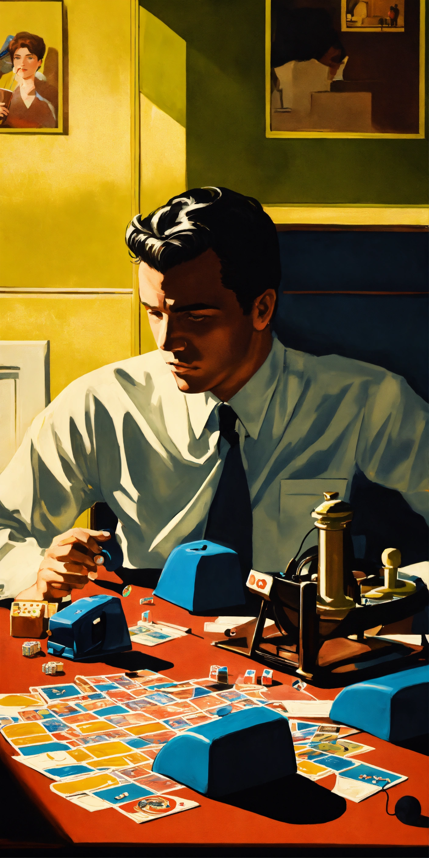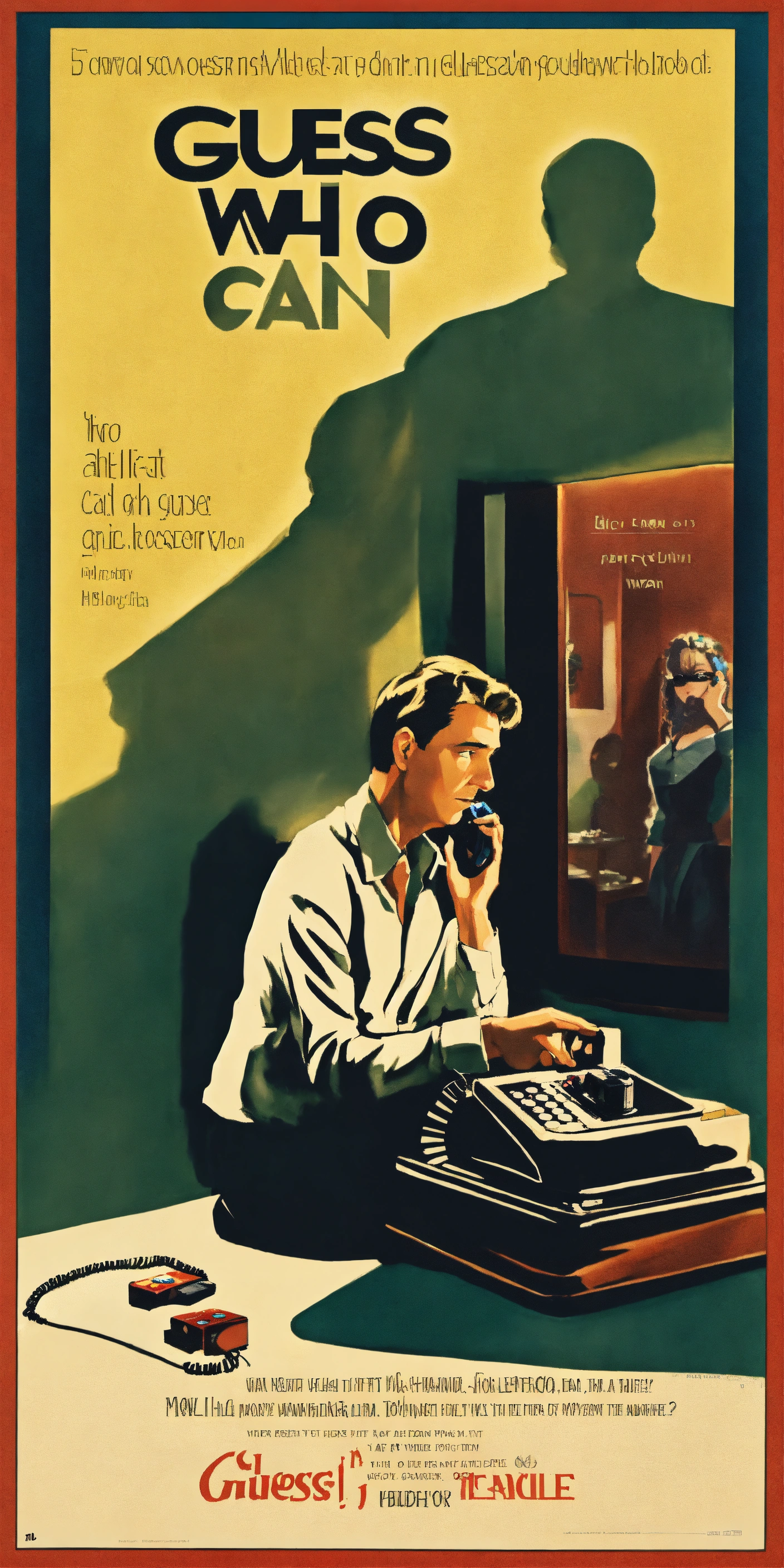 Modern movie poster, montage, shadow of man, playing board game guess who, using a landline telephone