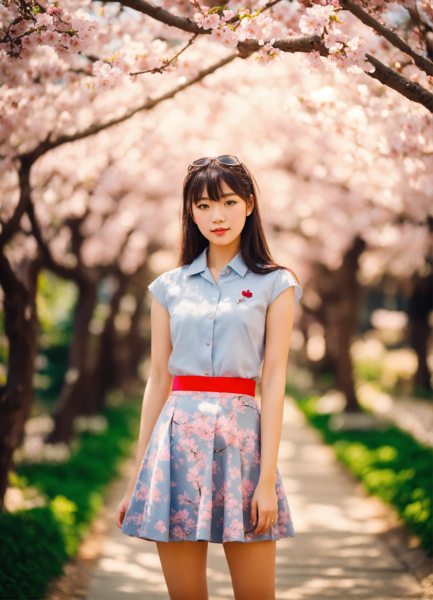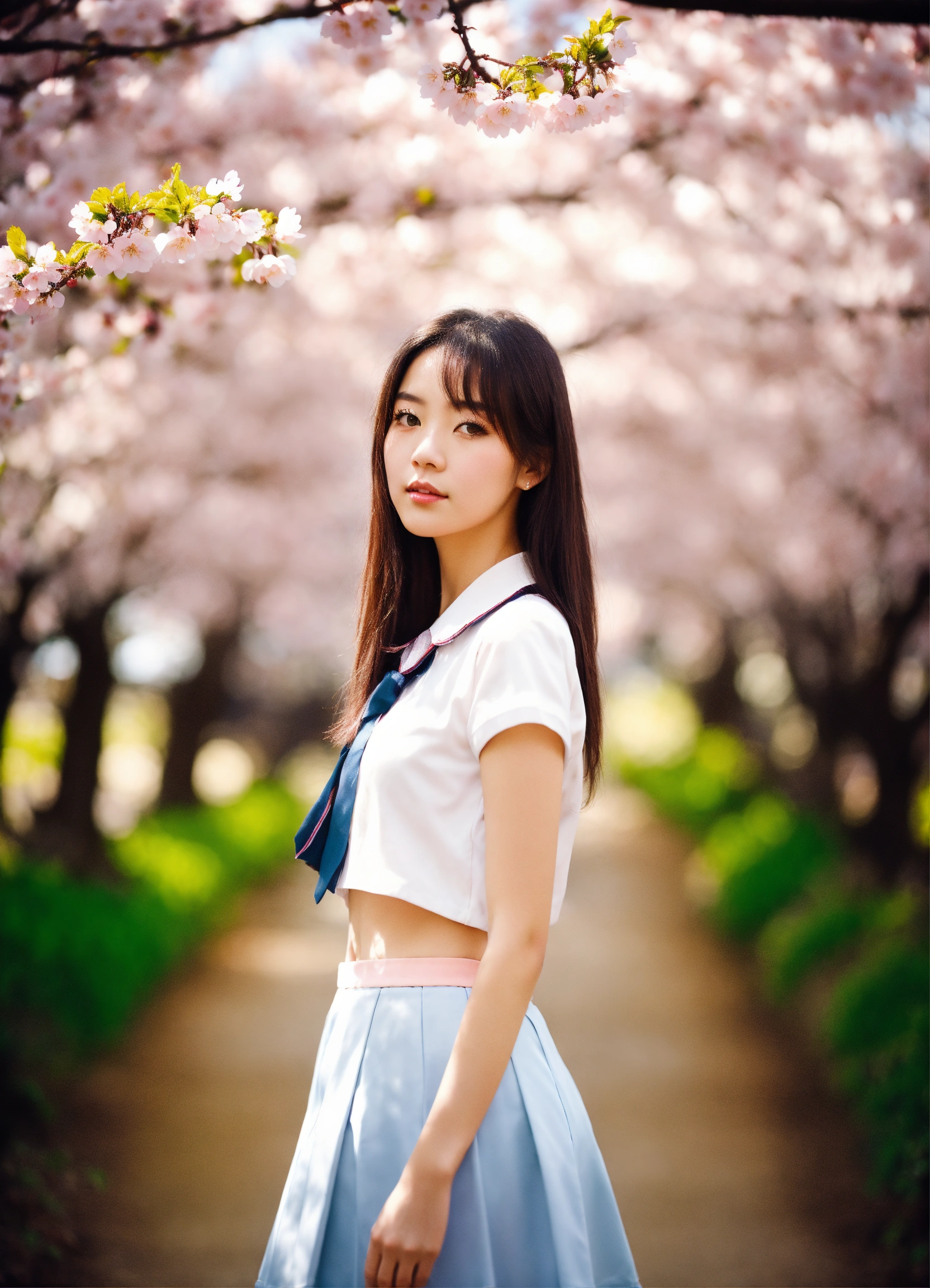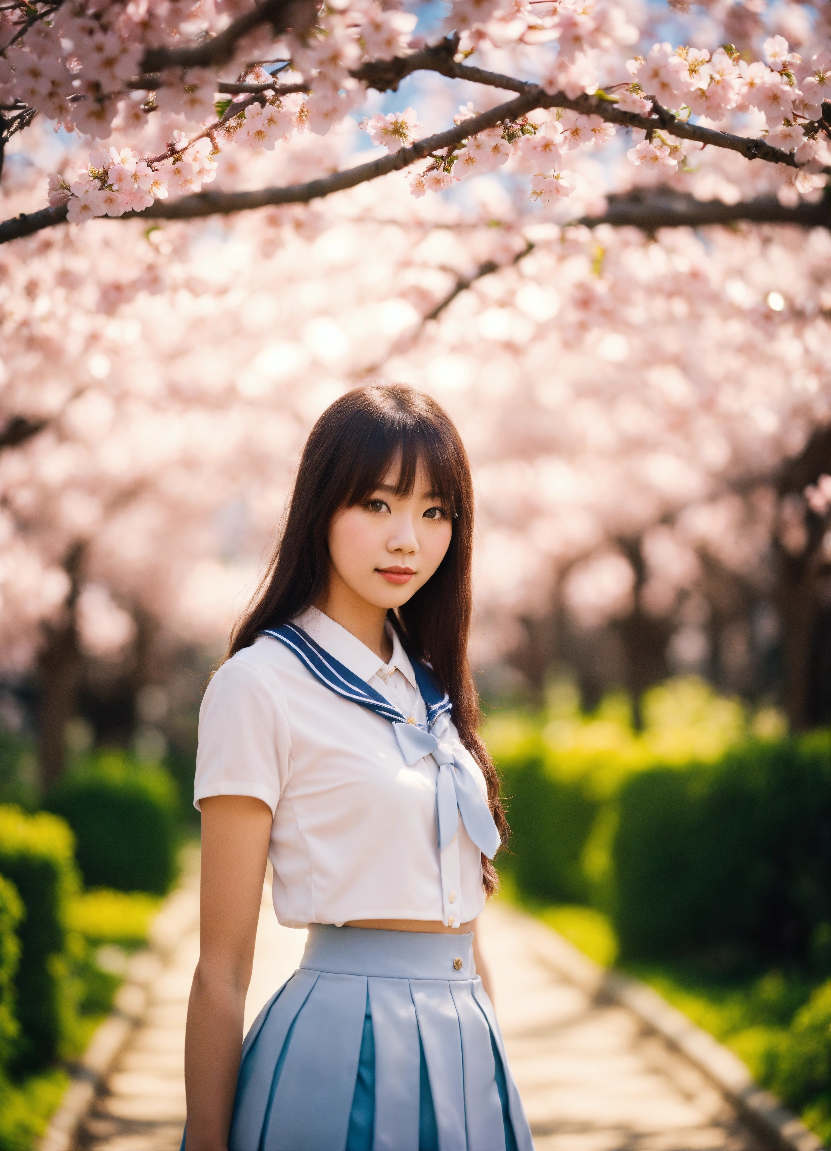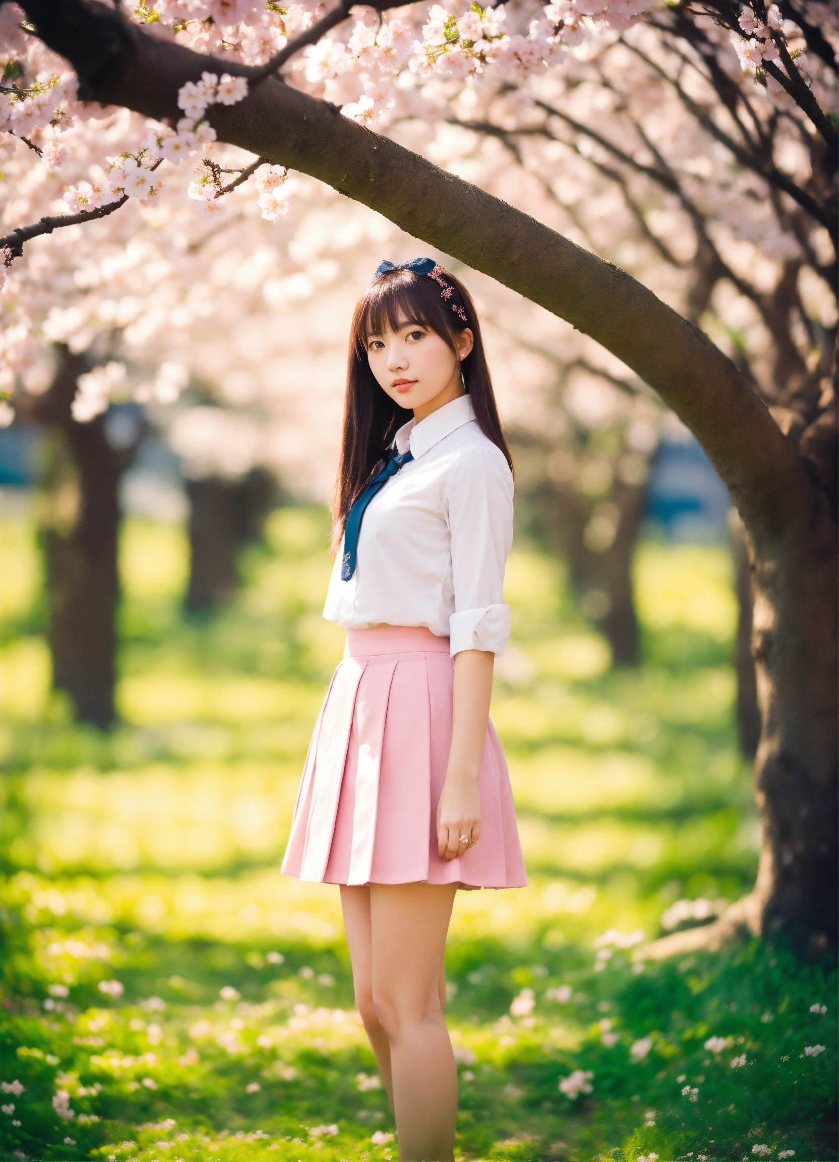 Portrait, elegant lady, sparkling eyes, school uniform, mini skirt, cherry blossom garden, full body, pinhole camera, natural sunlight, subtle pastel hues, camera view from bottom