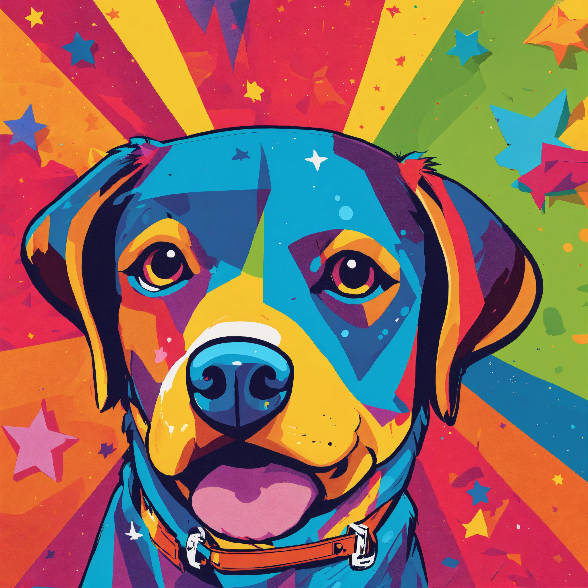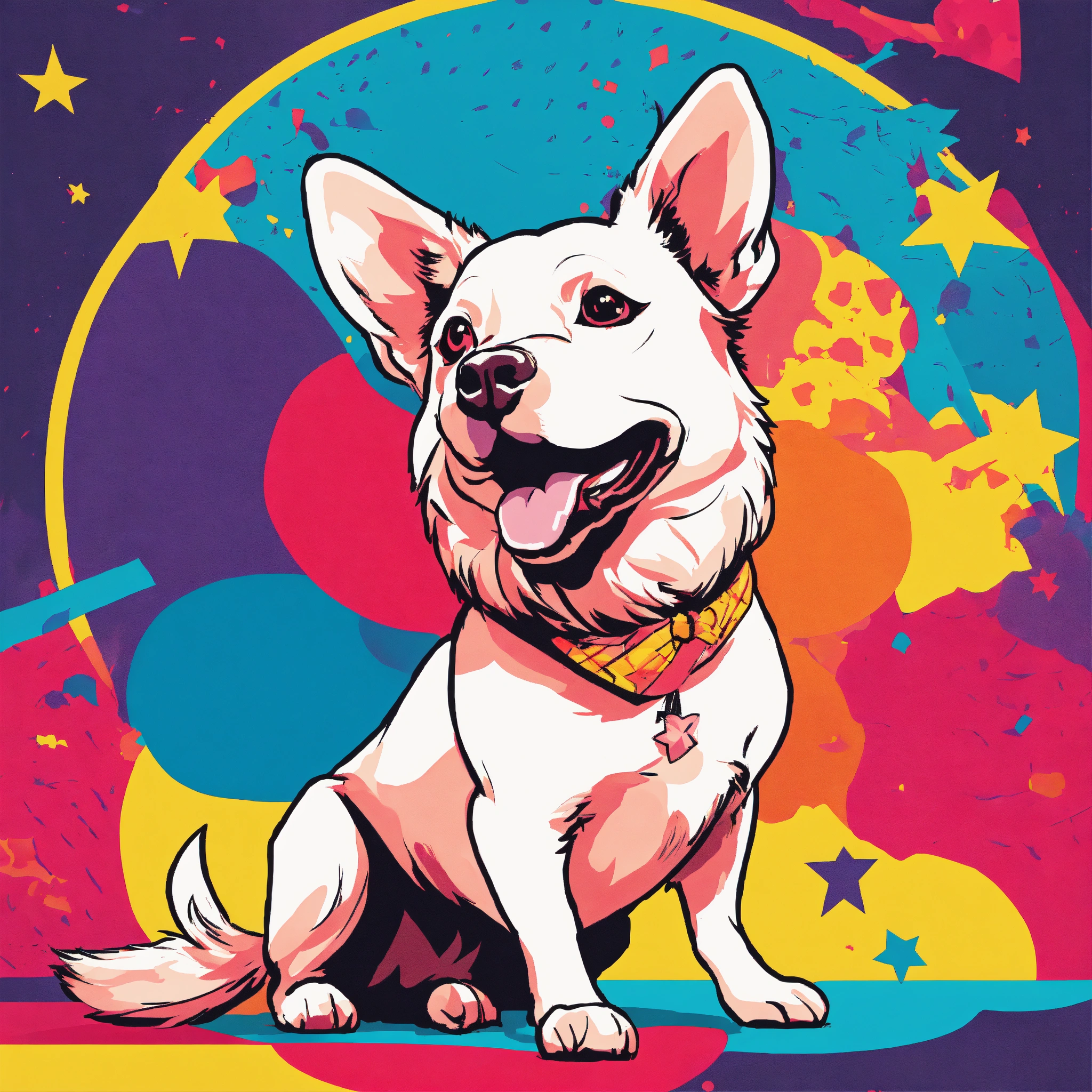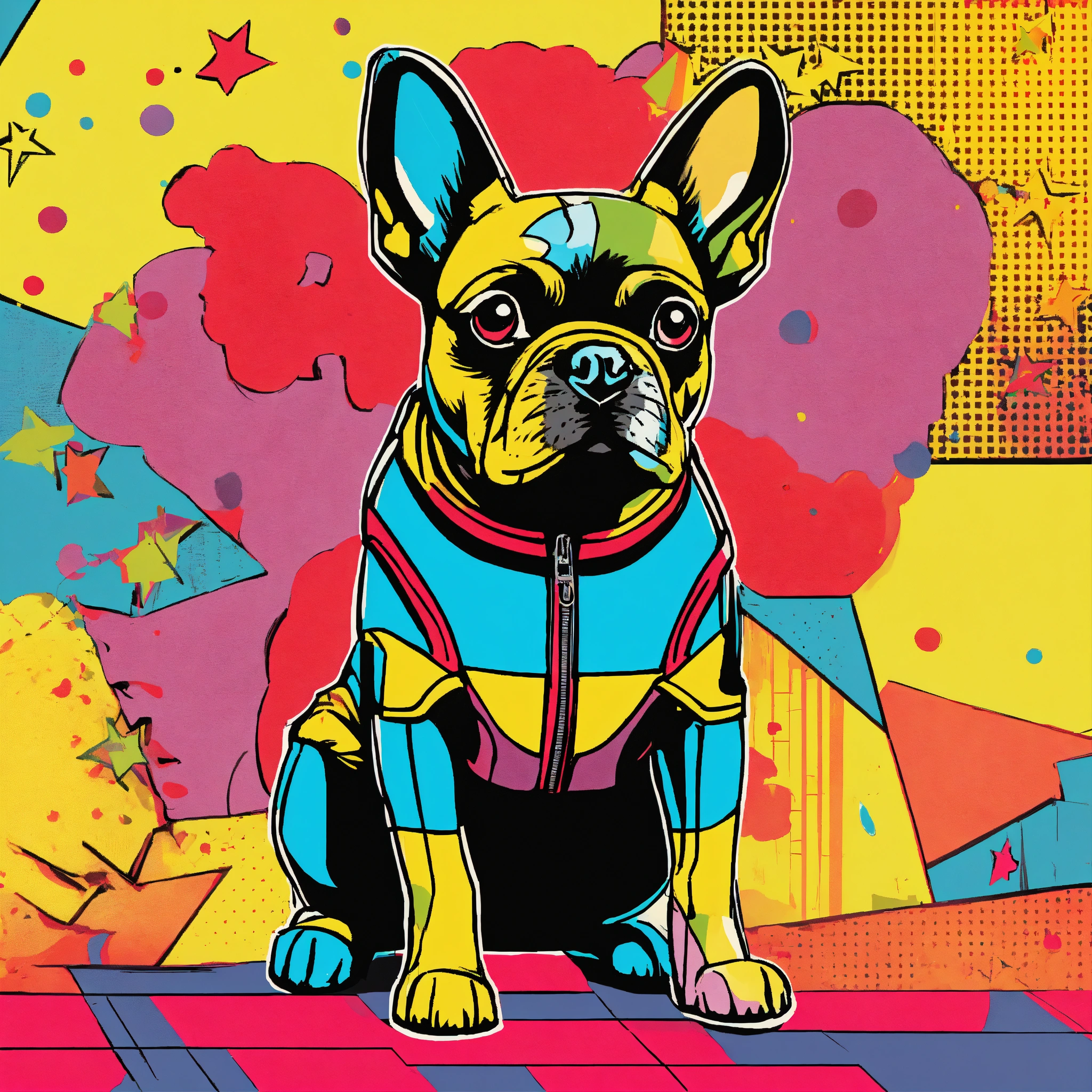 Generate a pop art masterpiece featuring a human-like dog figure as the central character. utilize bold, contrasting colors and geometric shapes to capture the essence of the style. the character should embody a comic book-like, fun persona, striking a dynamic, energetic pose. complement this with a backdrop filled with fun, iconic elements like speech bubbles, stars, and vibrant patterns.