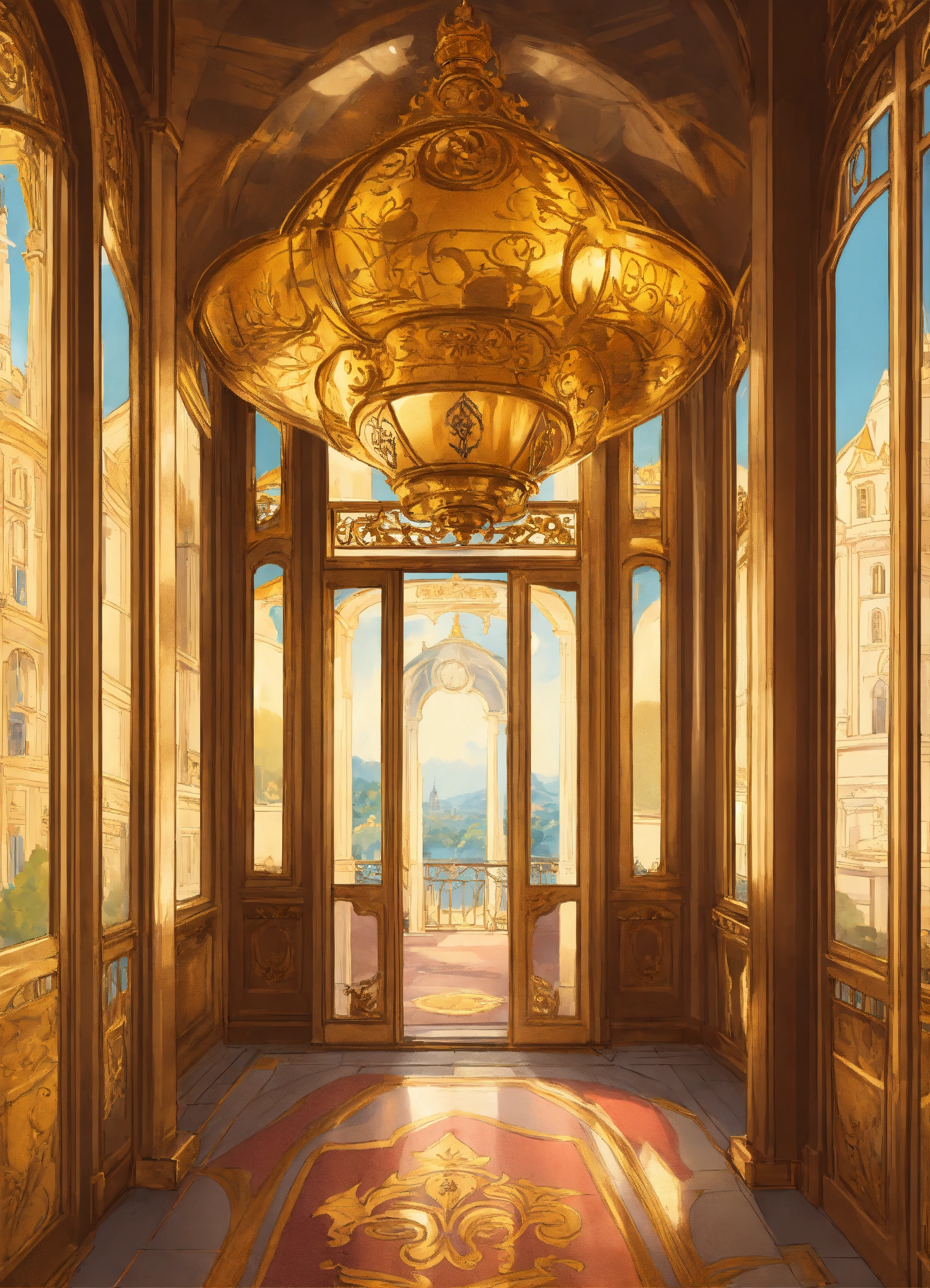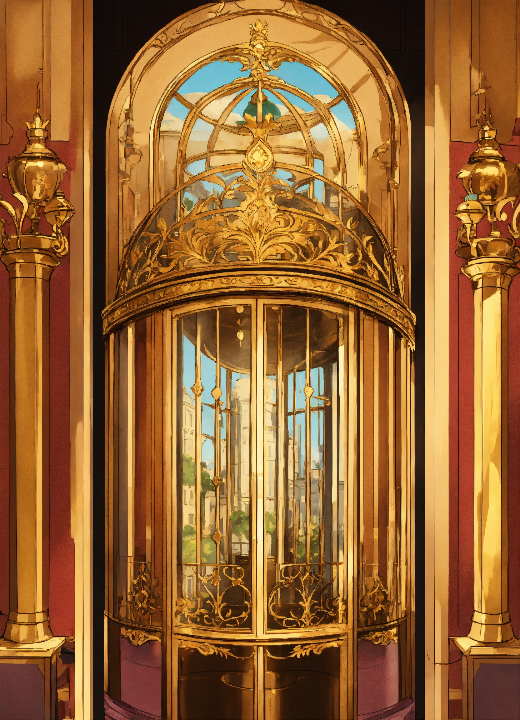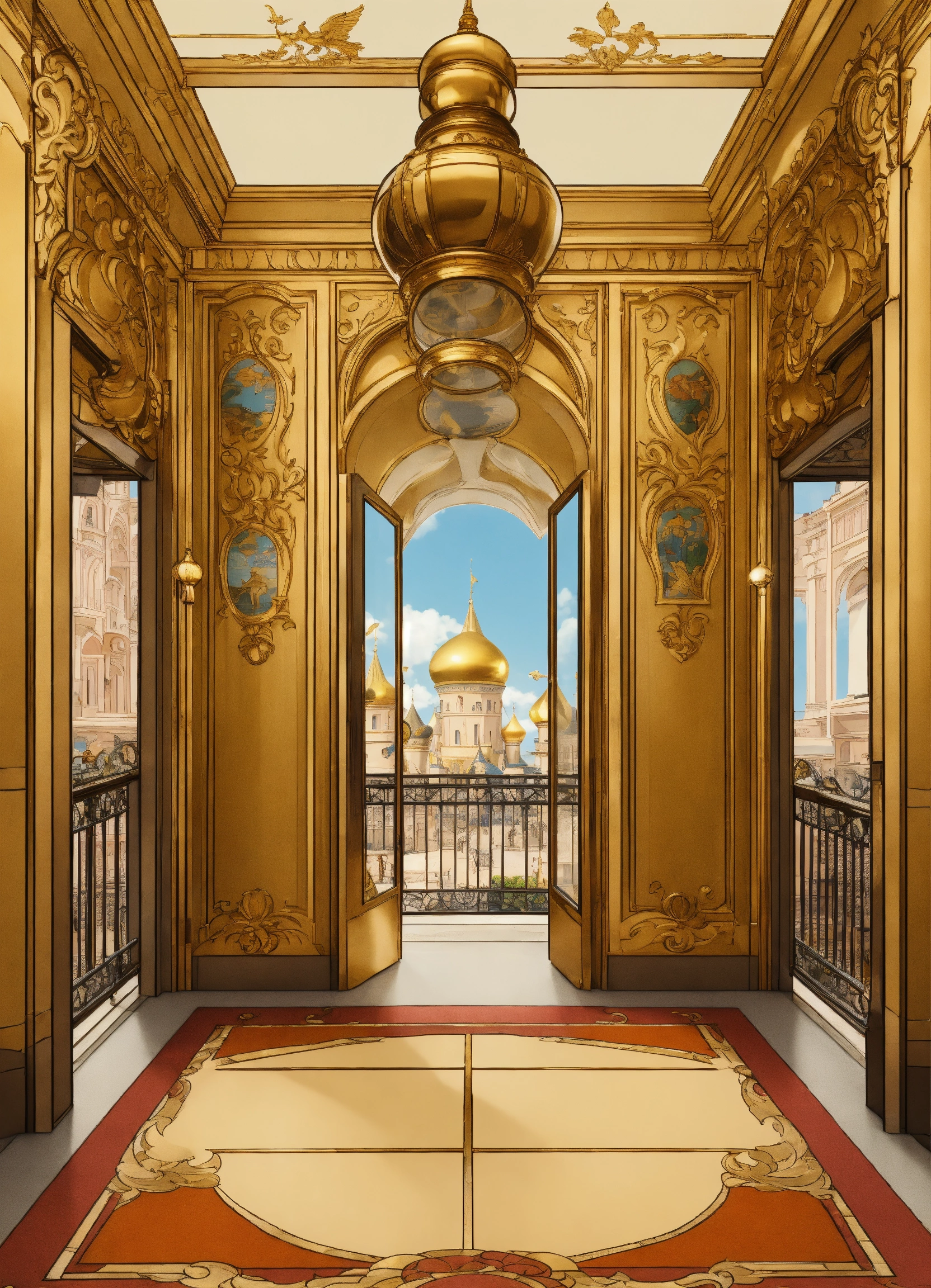 Russian dome elevator arabesque animation king french mocking bird chateau kingdom royal disney vehicle secret apartment le roi et l’oiseau deco illustration arch cartoon king crown art gold window grill arial viewbalcony pole