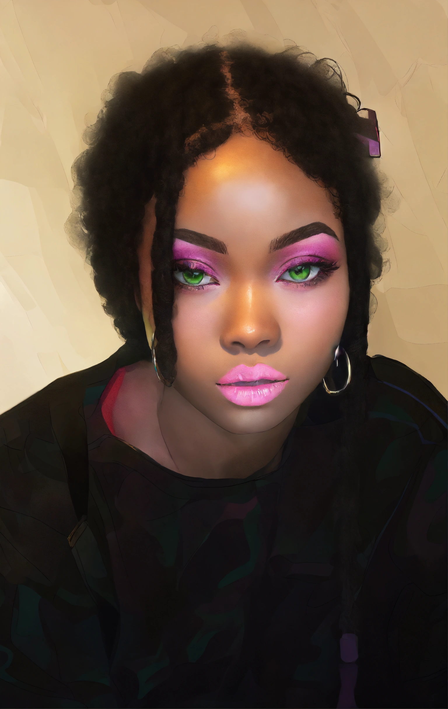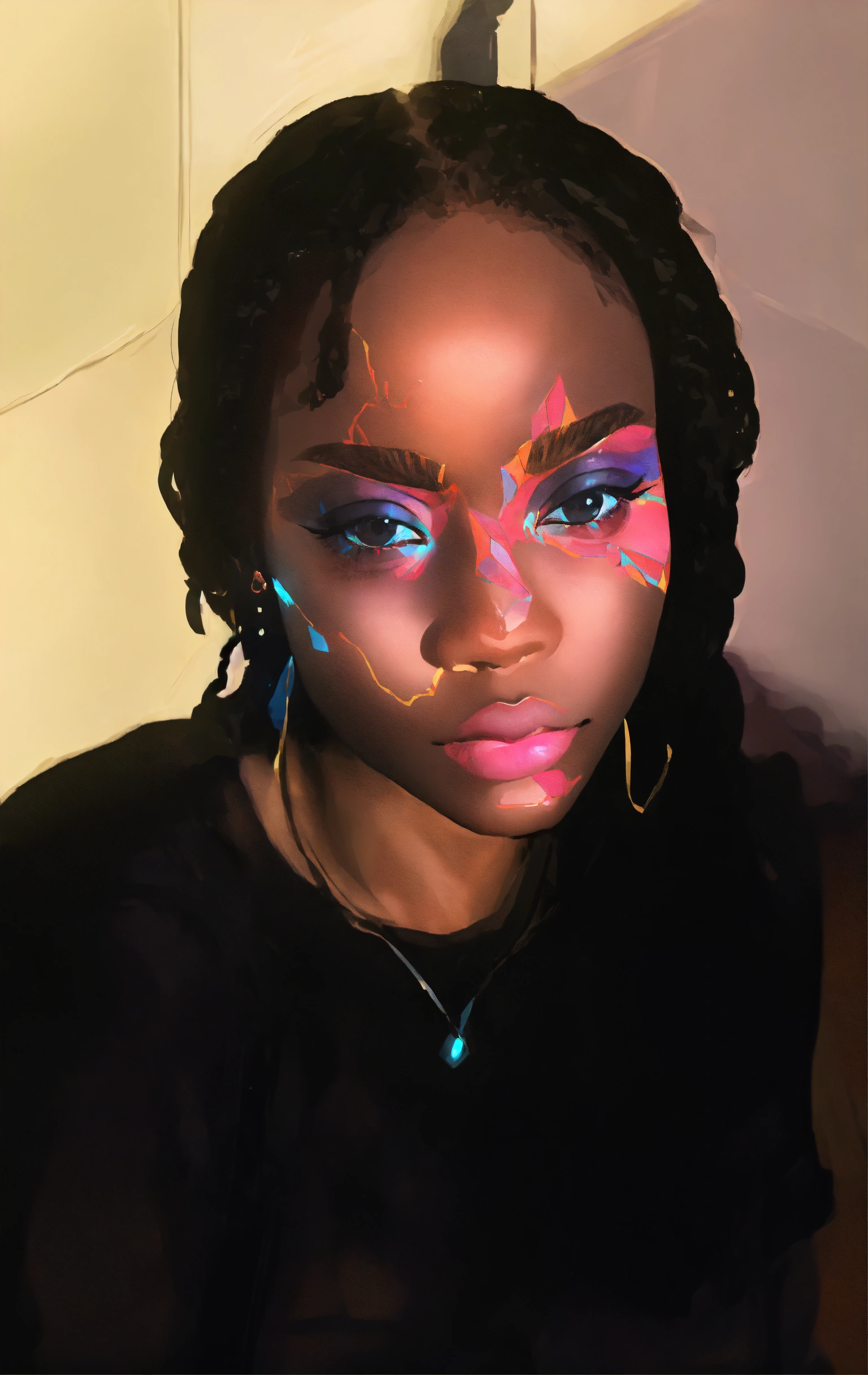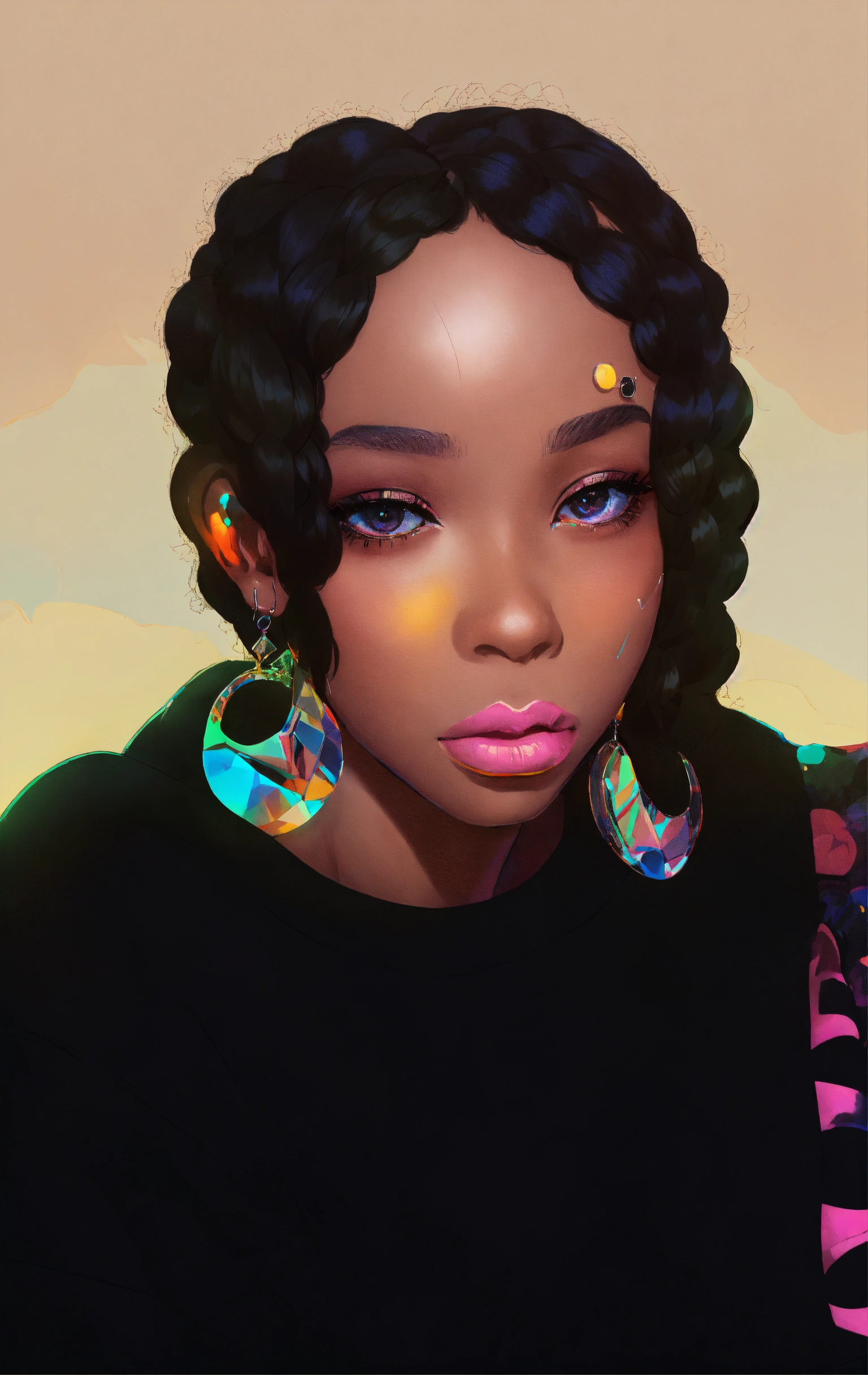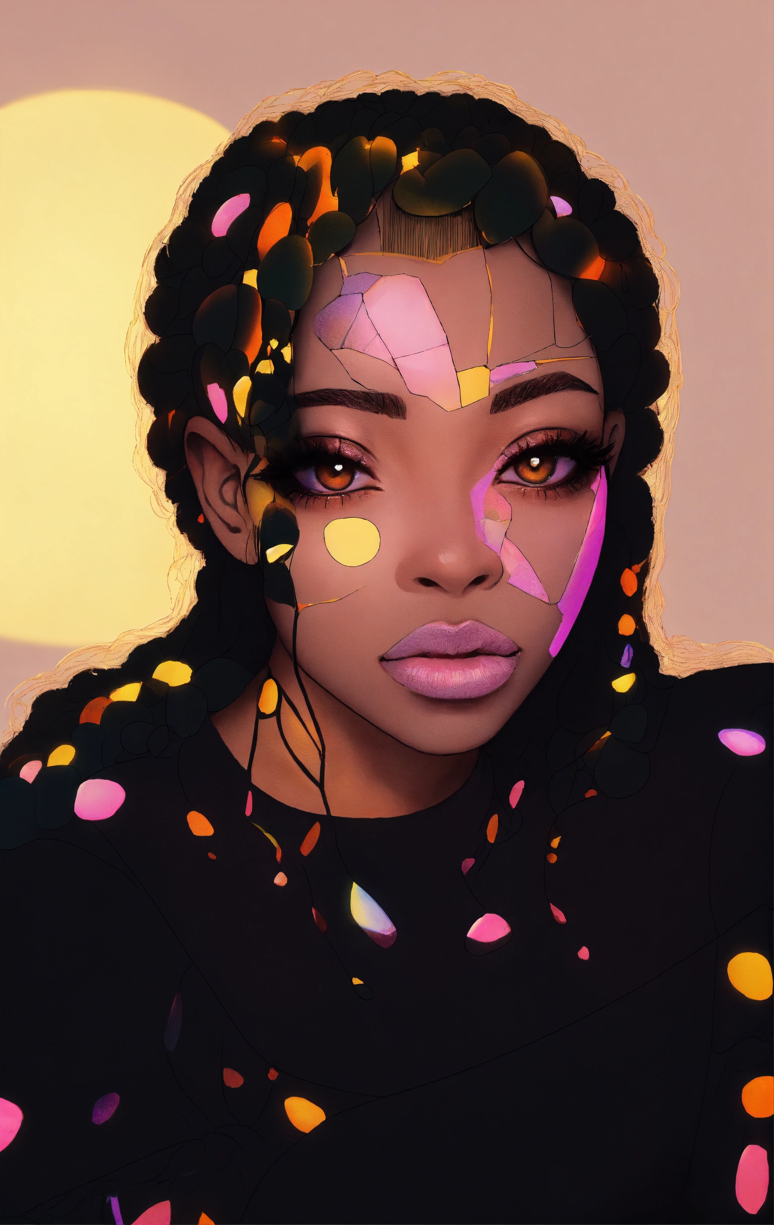 Manga kewpie kawaii afrocentric woman one eye open and one eye closed serene calm facial features colorful pastels. globe reflection in the one open eye. line drawing of a distorted map of the world background. evoked emotions that she sees outside the world without being seen8k full body sculpture of an afrocentric woman intricately carved from clear glass with vibrant neon plasma running through her. set against a wavy background, the glow of neon accentuates her crystalline skeletal structure. gentle lighting, combined with neon, illuminates her, emphasizing the face luminosity, with a brightly lit ambiance. 1/5 ratio subject placement wide angle. show full head and hair. v2