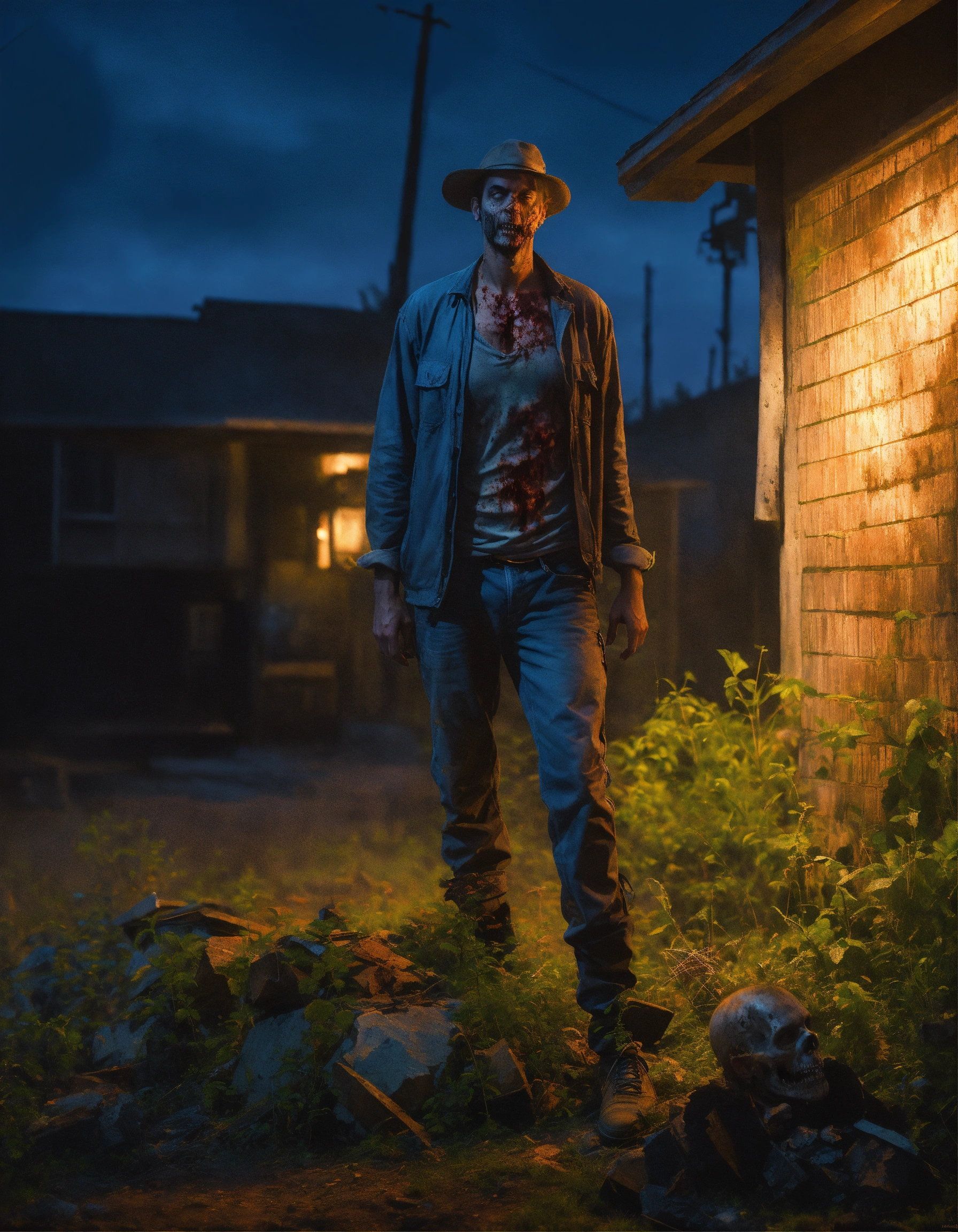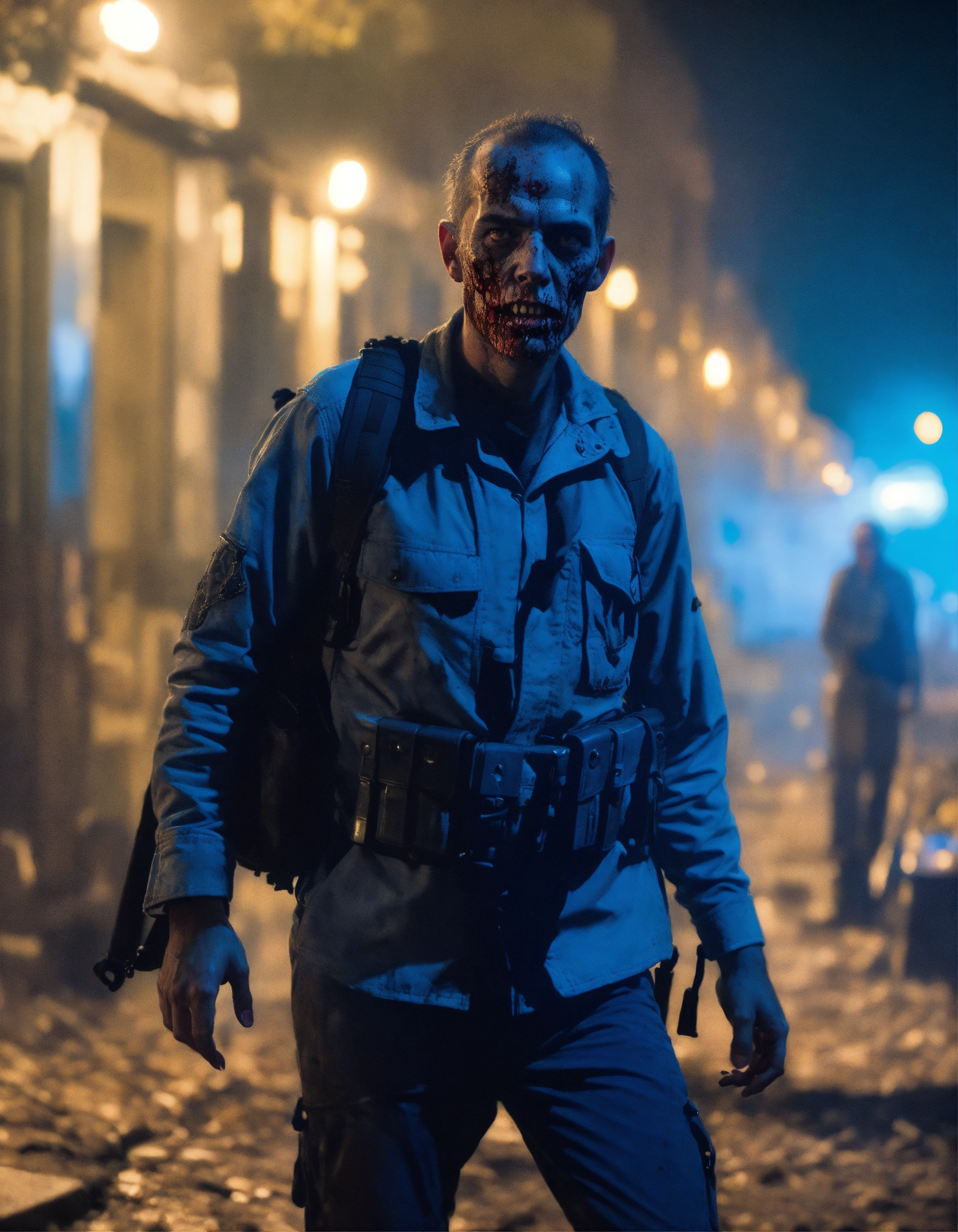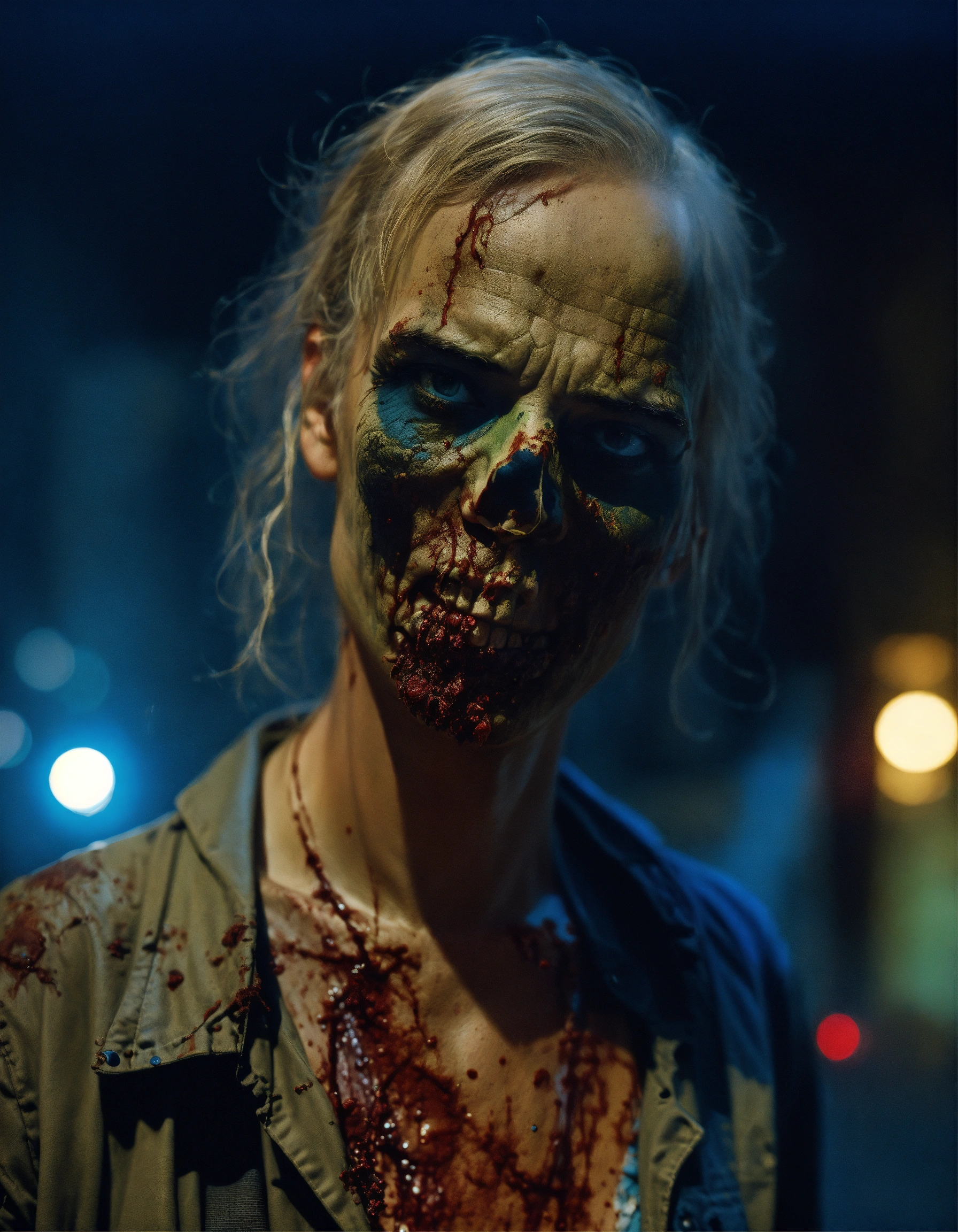 Hyperrealistic photo portrait zombie cinematic, greg rutkowski, james gurney, mignola, craig mullins, brom, shades of blue, outdoor, night