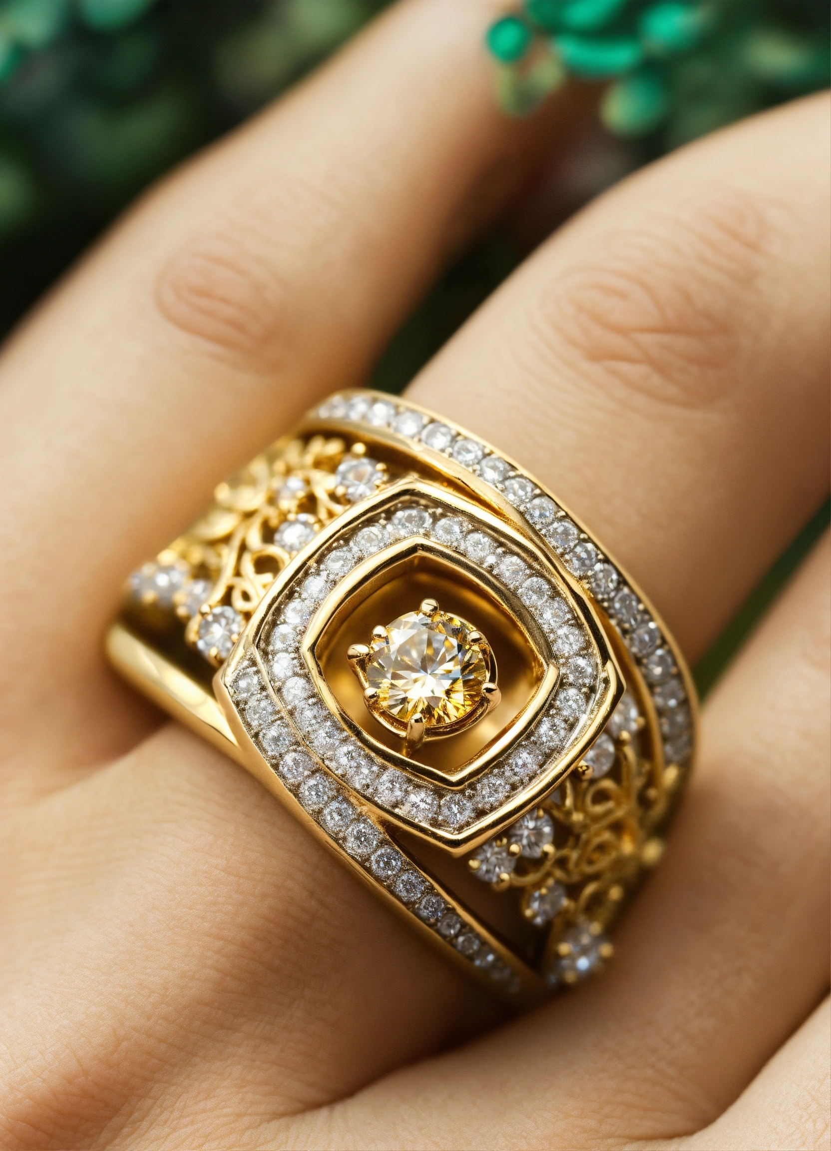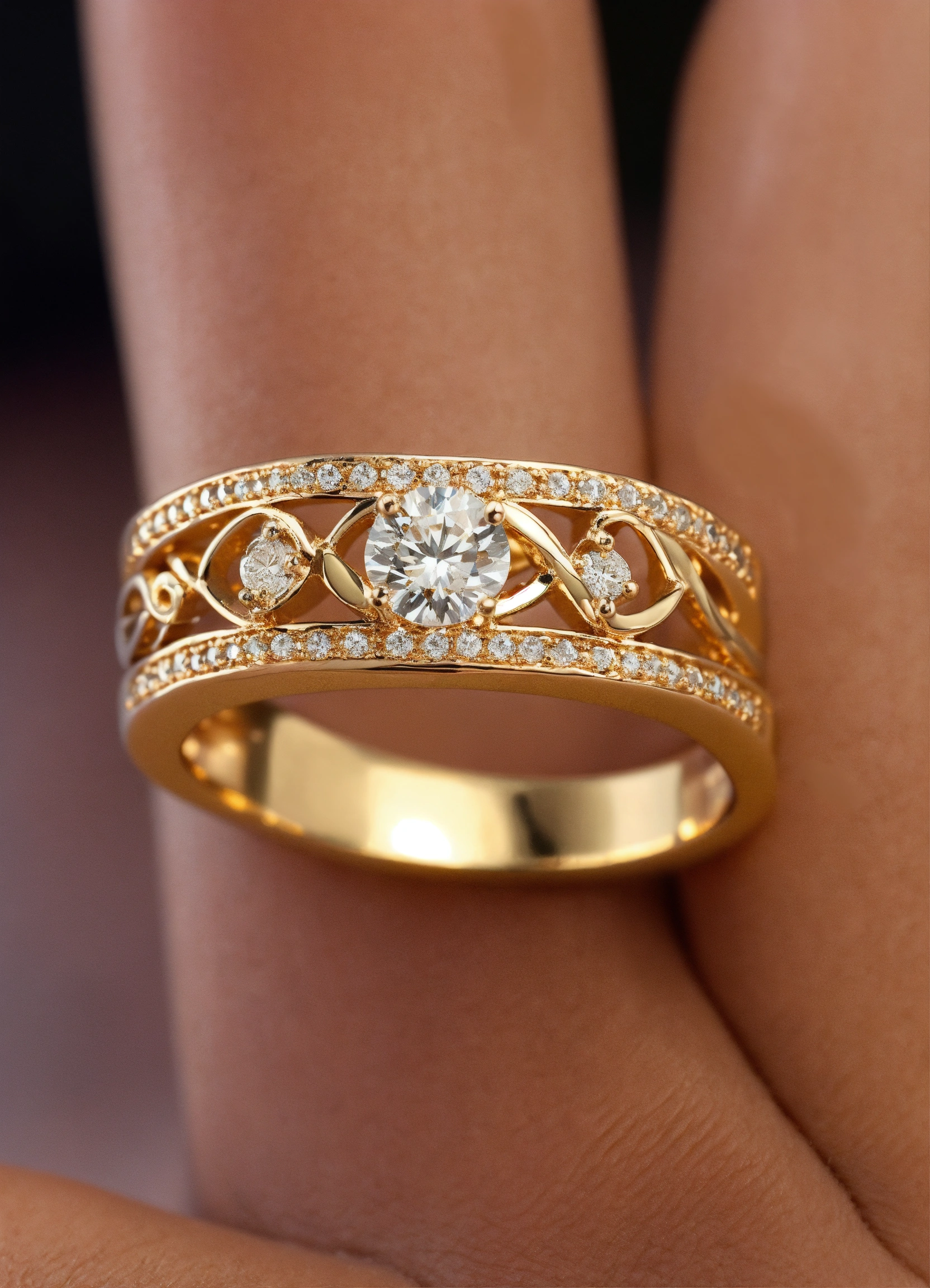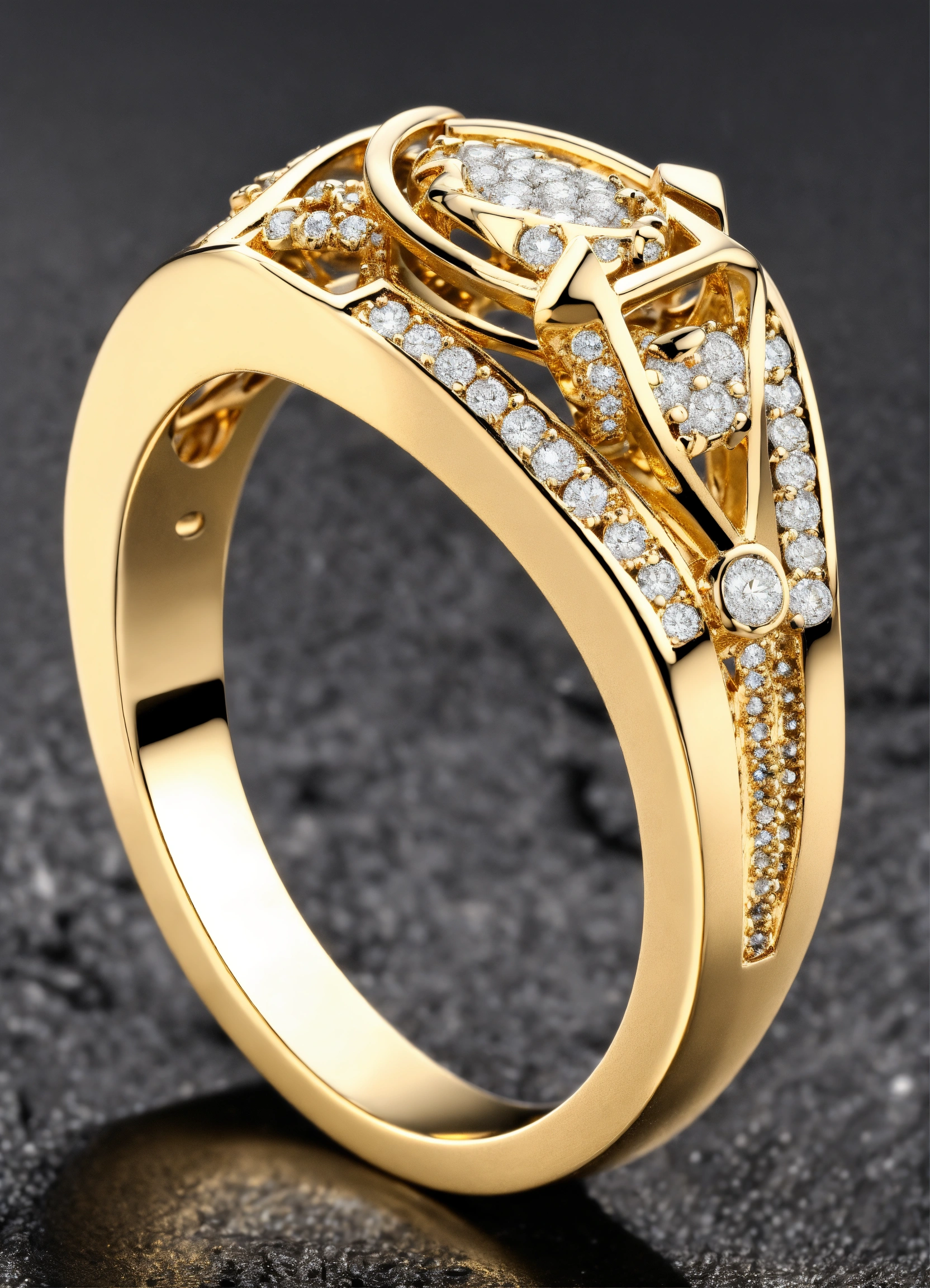 Jewellery design, vintage style, create diamond gold ring with matte finish in pave setting, libra shape design, for 30 year old women, petite and luxurious, default-theme, --product-view --ultra-quality