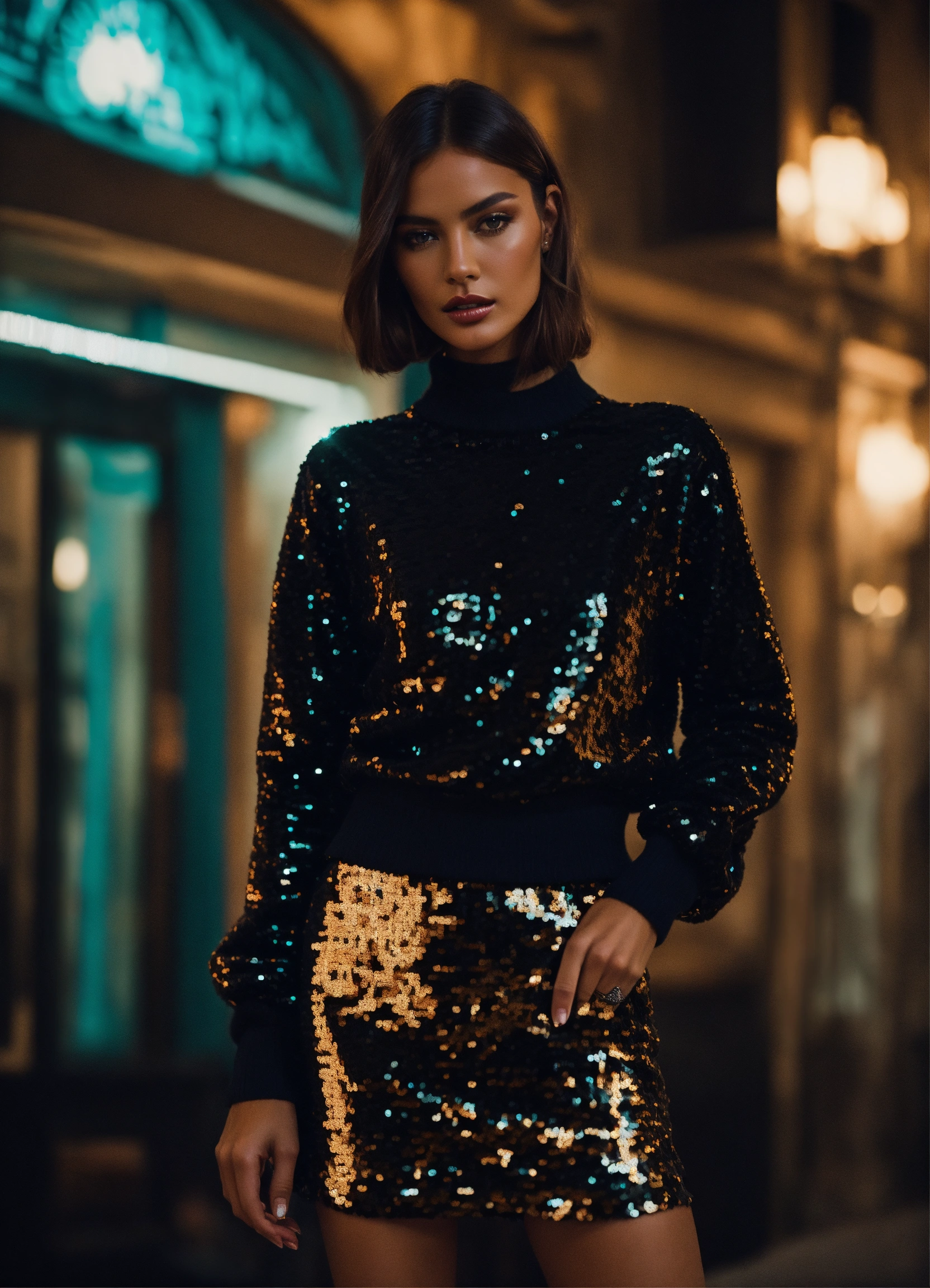 Create a visually stunning gucci inspired photoshoot featuring a tanned supermodel wearing black sequin miniskirt and black sequin jumper, iso 400, surrealistic, 8k, full frame, french fashion house background, high end