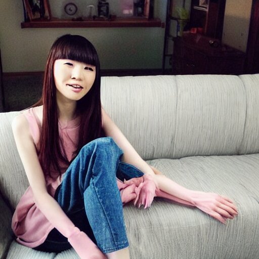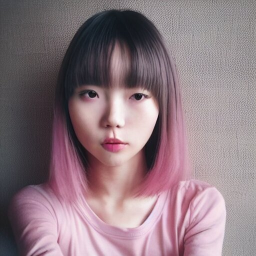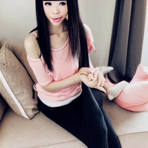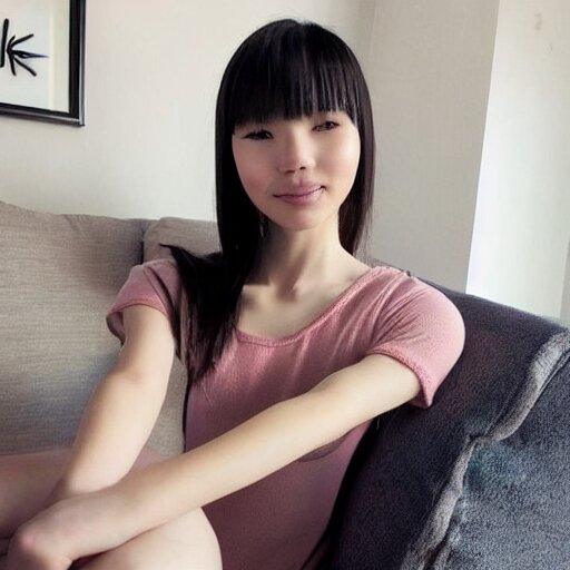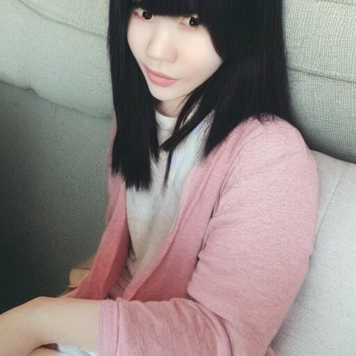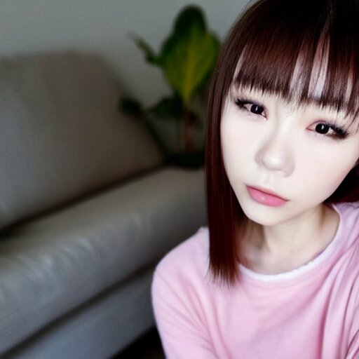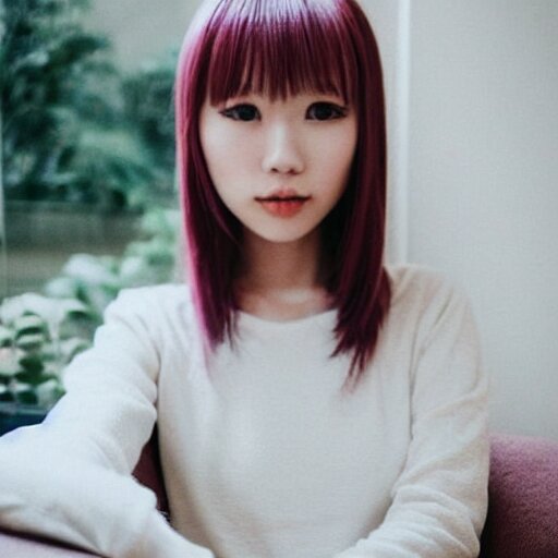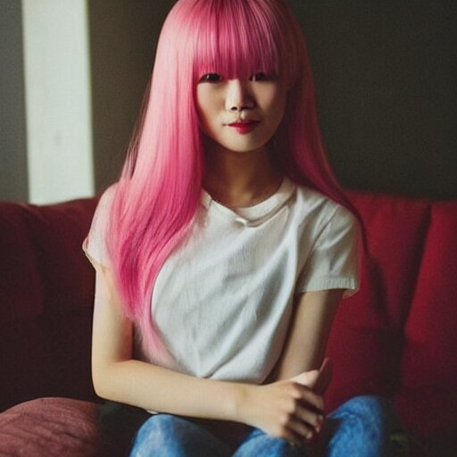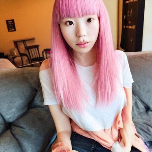 Selfie photograph of a cute thin petite chinese young woman with light pink hair, long hair, with full bangs, small round face, small nose, porcelain skin tone, red blush, wearing casual clothes, small smile, relaxing on a couch, cozy living room, medium shot, 8 k, trending on instagram, trending on pinterest, portra 4 0 0